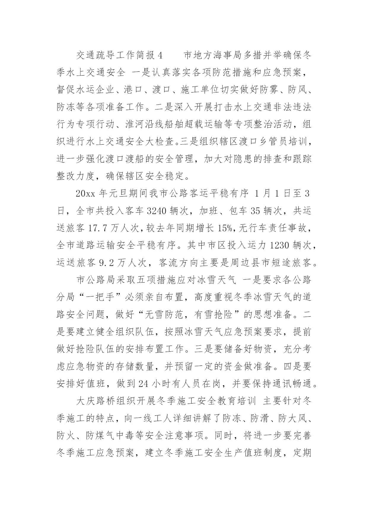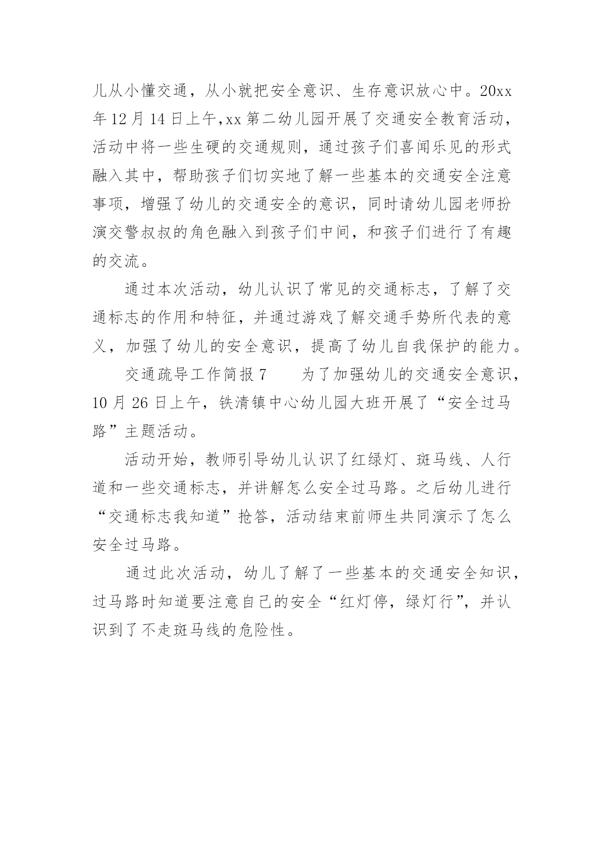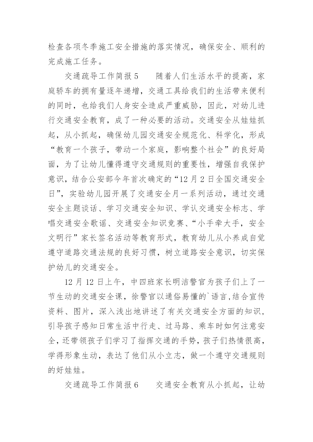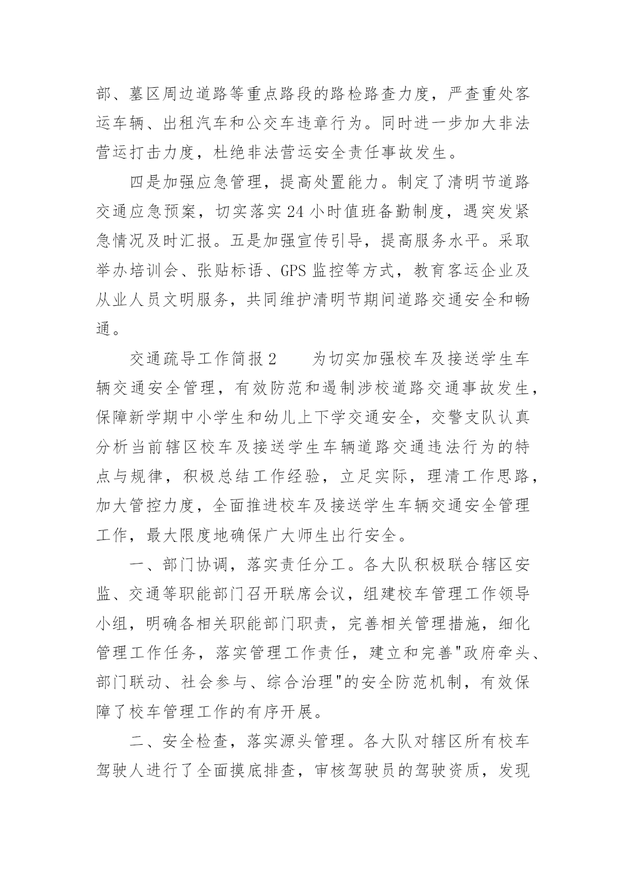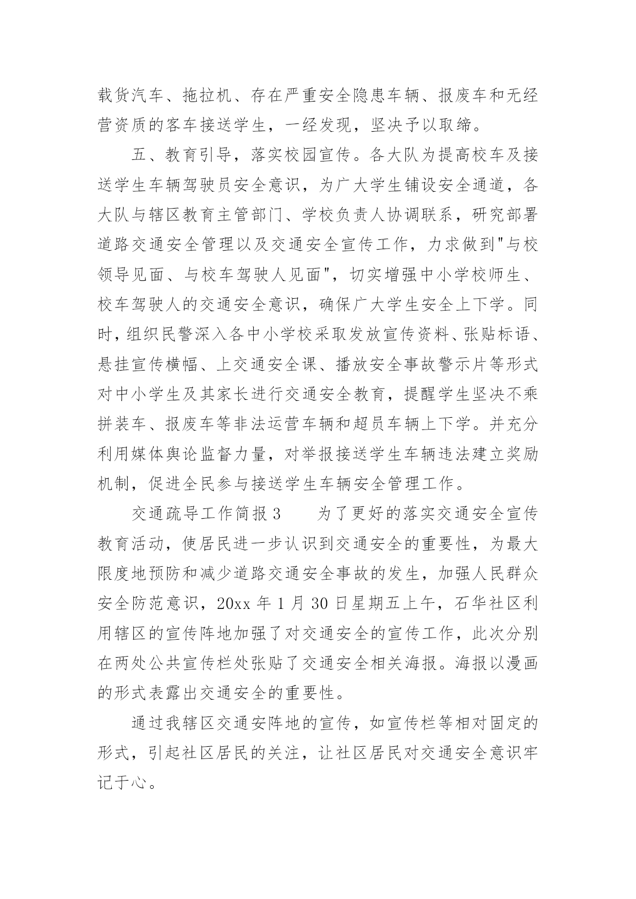 交通疏导工作简报交通疏导工作简报(通用7篇)在社会发展不断提速的今天,简报的使用频率逐渐增多,简报具有一般报纸的新闻特点,特别是要求有很强的时效性。你知道简报怎样才能写的好吗?以下是小编为大家收集的交通疏导工作简报(通用7篇),仅供参考,欢迎大家阅读。交通疏导工作简报1为做好清明节期间道路交通管理工作,严防重特大交通事故发生,织金县交通运输局提前部署清明节期间道路交通安全工作,全力为清明期间群众出行创造安全畅通的交通环境。一是科学分析研判,提早组织部署。针对今年清明假期时间短,群众祭扫、旅游踏青出行集中,特别是4月4日将出现集中出行高峰,县交通运输局科学分析研判,认真总结往年清明期间辖区道路交通流量变化趋势,结合今年可能出现的新情况、新特点,坚决克服麻痹大意思想,提前研判形势,提早组织部署,制定了20xx年清明期间道路交通安全工作方案。二是强化农村公路隐患排查治理,确保农村公路畅通。由农村公路管理所牵头,对全县县乡公路安全隐患进行排查治理,因资金等问题不能及时治理的,设置警示标牌,确保县乡公路安全畅通。三是加强路检路查,突出重点整治。由道路运输局牵头,加大对客运企业和客运场站安全隐患排查治理和城乡结合部、墓区周边道路等重点路段的路检路查力度,严查重处客运车辆、出租汽车和公交车违章行为。同时进一步加大非法营运打击力度,杜绝非法营运安全责任事故发生。四是加强应急管理,提高处置能力。制定了清明节道路交通应急预案,切实落实24小时值班备勤制度,遇突发紧急情况及时汇报。五是加强宣传引导,提高服务水平。采取举办培训会、张贴标语、GPS监控等方式,教育客运企业及从业人员文明服务,共同维护清明节期间道路交通安全和畅通。交通疏导工作简报2为切实加强校车及接送学生车辆交通安全管理,有效防范和遏制涉校道路交通事故发生,保障新学期中小学生和幼儿上下学交通安全,交警支队认真分析当前辖区校车及接送学生车辆道路交通违法行为的特点与规律,积极总结工作经验,立足实际,理清工作思路,加大管控力度,全面推进校车及接送学生车辆交通安全管理工作,最大限度地确保广大师生出行安全。一、部门协调,落实责任分工。各大队积极联合辖区安监、交通等职能部门召开联席会议,组建校车管理工作领导小组,明确各相关职能部门职责,完善相关管理措施,细化管理工作任务,落实管理工作责任,建立和完善"政府牵头、部门联动、社会参与、综合治理"的安全防范机制,有效保障了校车管理工作的有序开展。二、安全检查,落实源头管理。各大队对辖区所有校车驾驶人进行了全面摸底排查,审核驾驶员的驾驶资质,发现有驾驶证未年检、准驾型号与驾驶车辆不符、三年内发生重大交通事故等问题的,一律取消其驾驶校车的资格。路面执勤时,查获到校车驾驶人超员、逆行等严重违法行为,一律扣证扣分;驾驶人未取得机动车驾驶证,驾驶校车的一律拘留,彻底打消校车驾驶人的交通违法侥幸心理,消除交通安全隐患。三、内部管理,落实管理责任。各大队积极与辖区教育行政部门协调,把中小学校、幼儿园校车管理情况纳入全年绩效考核范畴。督促各学校积极配合交警工作,进一步完善内部管理机制,加强校车和驾驶人的教育管理,指派专人对校车每次运载学生情况进行查验,发现超员或其他交通违法行为的,坚决制止,不得放行。坚决杜绝租用拼装车、报废车和个人机动车接送学生,凡违反规定的,一律追究学校负责人和其他直接责任人员责任。同时,对校车驾驶人进行面对面安全教育,签订安全驾驶责任状,切实增强其安全意识、责任意识、守法意识,本着对学生生命高度负责的精神,不开"带病车",不驾超员车,随时对车辆进行安全检查,确保车辆安全运行。四、严查严纠,落实路面管控。各大队采取重点路段线上巡,重点时段点上查,重点车辆面上控的勤务模式,建立点、线、面立体式管控体系。充分依托护校岗,针对学生上、下学高峰时段,组织警力不定期开展校车集中整治行动,严格查处校车超速、超员、不按审核确定的路线行驶、不按规定在校车站点停靠上下学生等交通违法行为,坚决杜绝低速载货汽车、拖拉机、存在严重安全隐患车辆、报废车和无经营资质的客车接送学生,一经发现,坚决予以取缔。五、教育引导,落实校园宣传。各大队为提高校车及接送学生车辆驾驶员安全意识,为广大学生铺设安全通道,各大队与辖区教育主管部门、学校负责人协调联系,研究部署道路交通安全管理以及交通安全宣传工作,力求做到"与校领导见面、与校车驾驶人见面",切实增强中小学校师生、校车驾驶人的交通安全意识,确保广大学生安全上下学。同时,组织民警深入各中小学校采取发放宣传资料、张贴标语、悬挂宣传横幅、上交通安全课、播放安全事故警示片等形式对中小学生及其家长进行交通安全教育,提醒学生坚决不乘拼装车、报废车等非法运营车辆和超员车辆上下学。并充分利用媒体舆论监督力量,对举报接送学生车辆违法建立奖励机制,促进全