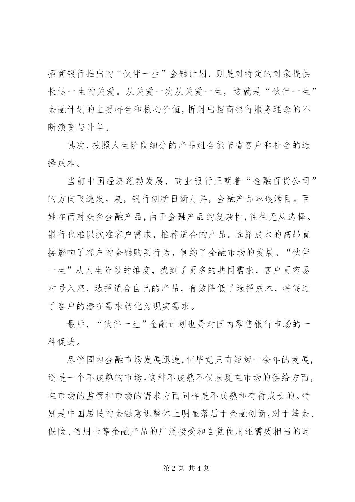第PAGE\*Arabic\*MERGEFORMAT4页共NUMPAGES\*MERGEFORMAT4页银行金融计划新闻发布会致辞女士们、先生们、各位来宾、各位新闻界的朋友们。大家好。今天,招商银行在这里举办“伙伴一生”金融计划新闻发布会。在此,我谨代表招商银行向一贯关心、支持招商银行发展的合作单位和各界朋友们致以诚挚的感谢。“伙伴一生”金融计划,根据对客户人生成长不同阶段的理财趋向和行为特征,细分为五类群体,具体设计出“炫彩人生”、“浪漫人生”、“和美人生”、“丰硕人生”和“悠然人生”五大主题理财套餐,并将现有产品整合打包为“核心产品”、“附属产品”、“主推功能及服务”和“主要服务渠道”,形成一系列变革服务和一整套完善的金融解决方案,分别提供给不同的客户群体和服务对象。招商银行此次在国内首家推出以人生阶段细分客户和产品的“伙伴一生”金融计划,具有十分重要的意义。。首先,“伙伴一生”金融计划是以客户为中心的服务理念的表现“伙伴一生”金融计划可谓是一种为服务对象度身订造,从而贯穿于服务对象一生的财务规划。这一计划的产品组合囊括了银行、保险、基金等金融产品和其他增值服务的,充分体现出招商银行对客户的长期关爱和以客户需求为核心的客户细分策略,如果说昔日的银行服务,立足于对每一个人的每一次关爱,此次招商银行推出的“伙伴一生”金融计划,则是对特定的对象提供长达一生的关爱。从关爱一次从关爱一生,这就是“伙伴一生”金融计划的主要特色和核心价值,折射出招商银行服务理念的不断演变与升华。其次,按照人生阶段细分的产品组合能节省客户和社会的选择成本。当前中国经济蓬勃发展,商业银行正朝着“金融百货公司”的方向飞速发。展,银行创新日新月异,金融产品琳琅满目。百姓在面对众多金融产品,由于金融产品的复杂性,往往无从选择。银行也难以找准客户需求,推荐适合的产品。选择成本的高昂直接影响了客户的金融购买行为,制约了金融市场的发展。“伙伴一生”从人生阶段的维度,找到了更多的共同需求,客户更容易对号入座,选择适合自己的产品,有效降低了选择成本,特促进了客户的潜在需求转化为现实需求。最后,“伙伴一生”金融计划也是对国内零售银行市场的一种促进。尽管国内金融市场发展迅速,但毕竟只有短短十余年的发展,还是一个不成熟的市场。这种不成熟不仅表现在市场的供给方面,在市场的监管和市场的需求方面同样是不成熟和有待成长的。特别是中国居民的金融意识整体上明显落后于金融创新,对于基金、保险、信用卡等金融产品的广泛接受和自觉使用还需要相当的时间,直接制约了金融需求的增长。我们认为,国内金融市场成熟的进程,不仅有赖于监管机构做出努力,作为市场供给者的商业银行和其他金融机构也必须同时扮演市场培育者的角色。“伙伴一生”金融计划,根据客户的不同人生阶段,寻找出金融需求的共性,有针对性地提供银行产品,有利于培养客户金融理财意识,提高客户实用金融产品的积极性。从这个意义上讲,对中国金融市场的发展和成熟是一个有效促进。各位来宾,各位朋友们,中国经济正处于高速发展时期,居民的金融需求持续扩大,同时,随着中国金融与国际接轨的加快,人们对金融产品和服务也提出了更高的要求。招商银行将以提升中国银行业的金融服务水平为己任,不断创新,锐意进取,为中国的老百姓提供更多、更好、更贴心的产品和服务。人的一生中,总需要朋友和伙伴,他们给人关怀、鼓励和悉心照顾,与您共同成长,让人难于忘怀。人生路上,招商银行愿与您结伴同行。从初涉社会的炫彩青春,到成家立业的浪漫生活;从养儿育女的和美家庭,到事业有成的收获季节,直至安享晚年的悠然岁月,不管人生的哪个阶段,招商银行都愿意成为最可信赖,相伴一生的金融伙伴,为您的生活添姿加彩。最后,我想用《诗经》中的一句话结束我的发言。“死生契阔,与子相悦,执子之手,与子携老”。谢谢大家。
