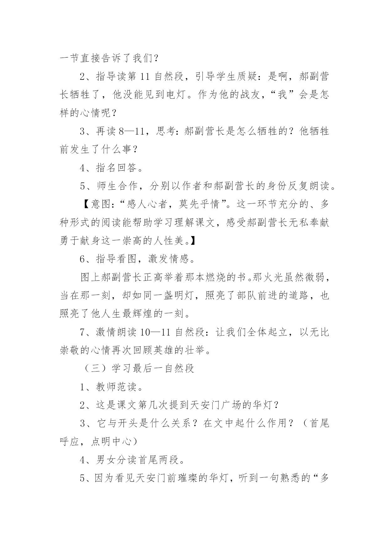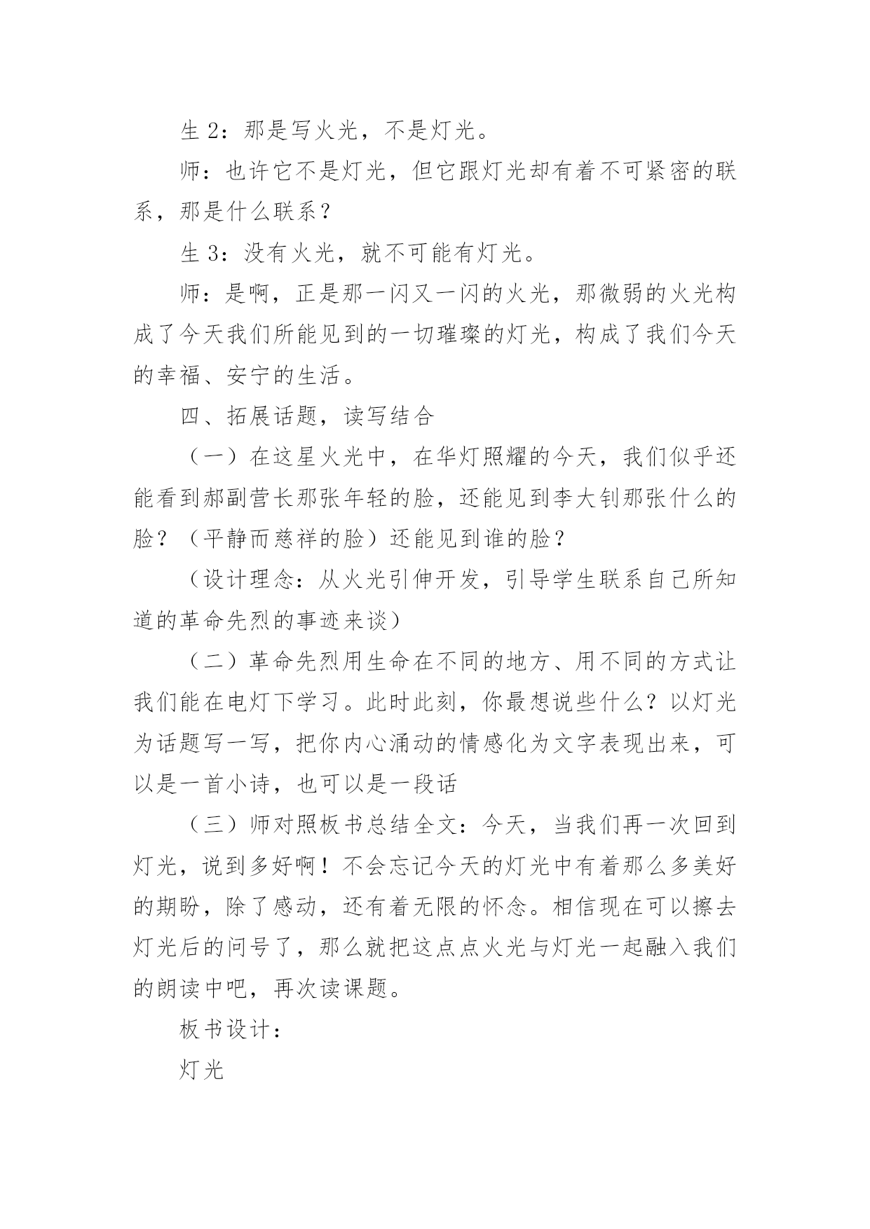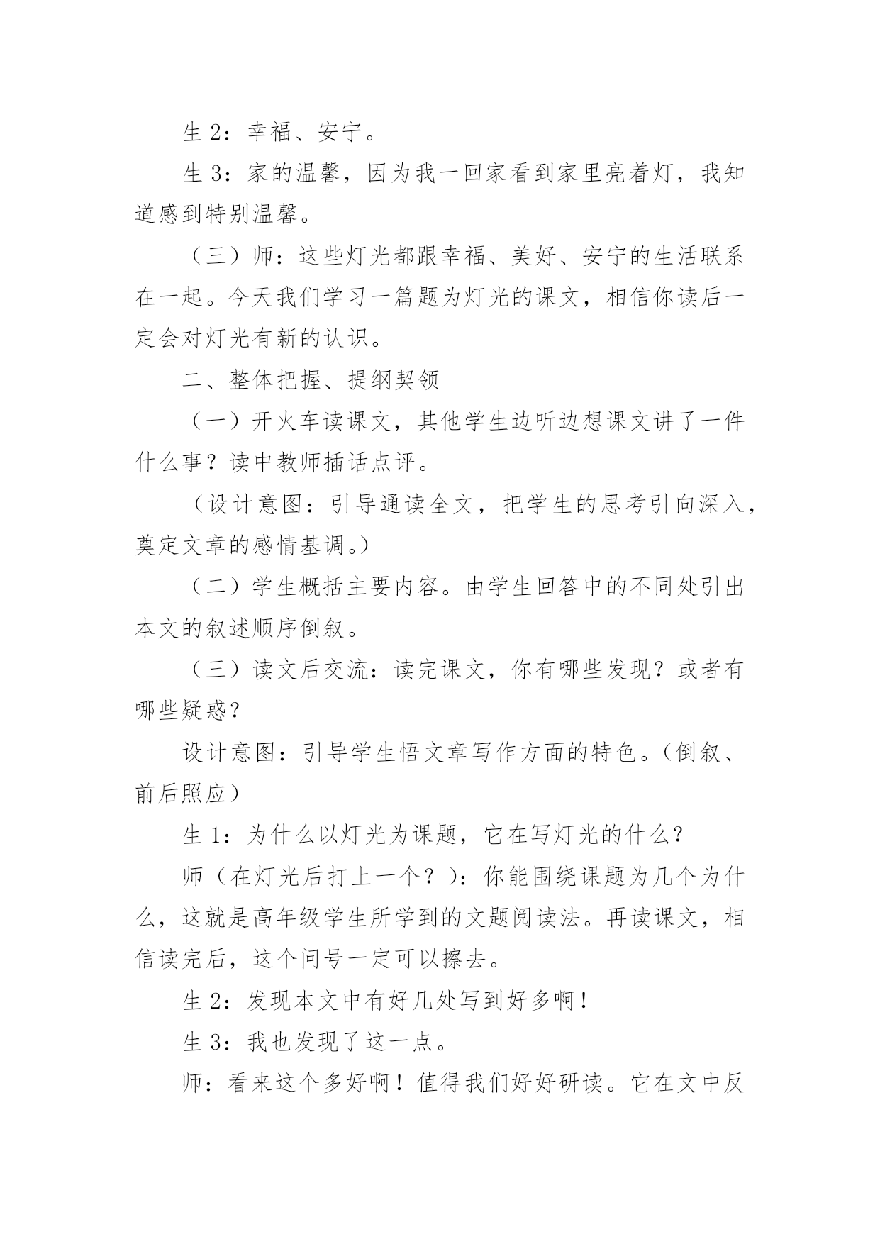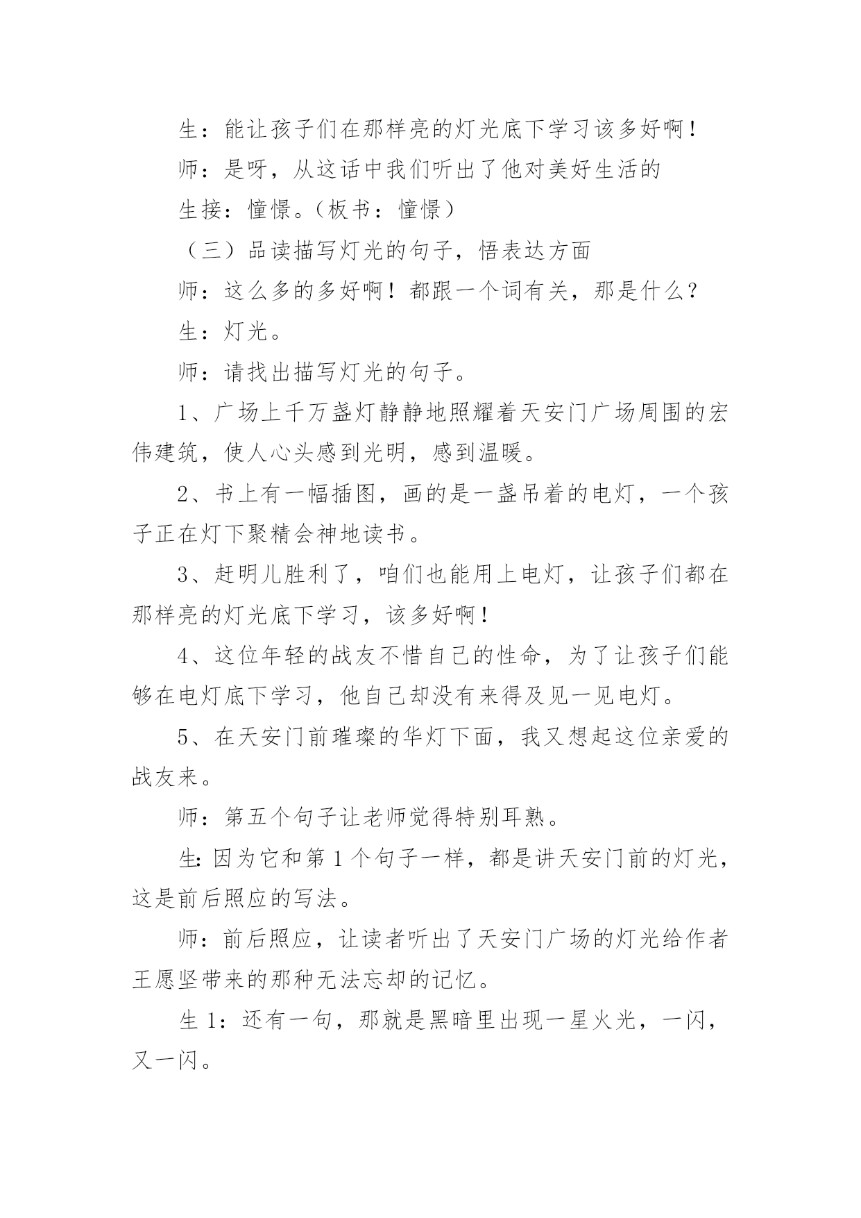 《灯光》教学设计关于《灯光》教学设计在教学工作者开展教学活动前,时常需要编写教学设计,借助教学设计可以促进我们快速成长,使教学工作更加科学化。我们应该怎么写教学设计呢?下面是小编为大家整理的关于《灯光》教学设计,供大家参考借鉴,希望可以帮助到有需要的朋友。《灯光》教学设计1教学目标:一、通读全文,读中引出课文的重点词语憧憬、千钧一发、点燃、性命、没来得及等词语,引导学生认识今天的幸福生活来之不易。二、以多好啊!让学生懂得为理想而献身的美好;读写结合,提升学生对灯光的认识。教学时数:一课时教学过程:一、板书课题,感受灯光的含义(一)请同学们跟着老师一起写课题。当写到灯光二字,你会想到哪些?(二)生1:我会想到光明、温暖。生2:幸福、安宁。生3:家的温馨,因为我一回家看到家里亮着灯,我知道感到特别温馨。(三)师:这些灯光都跟幸福、美好、安宁的生活联系在一起。今天我们学习一篇题为灯光的课文,相信你读后一定会对灯光有新的认识。二、整体把握、提纲契领(一)开火车读课文,其他学生边听边想课文讲了一件什么事?读中教师插话点评。(设计意图:引导通读全文,把学生的思考引向深入,奠定文章的感情基调。)(二)学生概括主要内容。由学生回答中的不同处引出本文的叙述顺序倒叙。(三)读文后交流:读完课文,你有哪些发现?或者有哪些疑惑?设计意图:引导学生悟文章写作方面的特色。(倒叙、前后照应)生1:为什么以灯光为课题,它在写灯光的什么?师(在灯光后打上一个?):你能围绕课题为几个为什么,这就是高年级学生所学到的文题阅读法。再读课文,相信读完后,这个问号一定可以擦去。生2:发现本文中有好几处写到好多啊!生3:我也发现了这一点。师:看来这个多好啊!值得我们好好研读。它在文中反复出现,它就像是乐曲中的主旋律一样,它也是文章的什么?生:文眼。老师以前说过的。三、精读往事部分内容(一)抓住了文眼阅读,也就抓住了文章的灵魂。就让我们一起循着多好啊!走进那战火纷飞的岁月。快速默读课文,找出描写多好啊的句子,用笔勾画下来。(板书:多好啊)(二)生汇报,围线多好啊!品读句子。第一处:清明节前的一个晚上,我又漫步在广场上,忽然背后传来一声赞叹:多好啊!师点拨:什么多好啊?(板书:多好啊!)生:天安门广场的灯多好啊!师:他赞美的是天安门广场的灯多么好啊!,其实他也在赞美什么多好啊?生:今天的幸福生活多好啊!(板书:赞叹)第二处:多好啊!他在自言自语。师;郝副营长是说什么多好啊!生:能在电灯下看书多好啊!师:请观察郝副营长看插图时的神情,可以用什么词来形容?(专注、聚精会神、羡慕)师:同学们,那是郝副营长对那个孩子的羡慕呀。第三处:赶明儿胜利了,咱们也能用上电灯,让孩子们都在那样亮的灯光底下看书,该多好啊!师:此时,郝副营长又是说什么多好啊!生:能让孩子们在那样亮的灯光底下学习该多好啊!师:是呀,从这话中我们听出了他对美好生活的生接:憧憬。(板书:憧憬)(三)品读描写灯光的句子,悟表达方面师:这么多的多好啊!都跟一个词有关,那是什么?生:灯光。师:请找出描写灯光的句子。1、广场上千万盏灯静静地照耀着天安门广场周围的宏伟建筑,使人心头感到光明,感到温暖。2、书上有一幅插图,画的是一盏吊着的电灯,一个孩子正在灯下聚精会神地读书。3、赶明儿胜利了,咱们也能用上电灯,让孩子们都在那样亮的灯光底下学习,该多好啊!4、这位年轻的战友不惜自己的性命,为了让孩子们能够在电灯底下学习,他自己却没有来得及见一见电灯。5、在天安门前璀璨的华灯下面,我又想起这位亲爱的战友来。师:第五个句子让老师觉得特别耳熟。生:因为它和第1个句子一样,都是讲天安门前的灯光,这是前后照应的写法。师:前后照应,让读者听出了天安门广场的灯光给作者王愿坚带来的那种无法忘却的记忆。生1:还有一句,那就是黑暗里出现一星火光,一闪,又一闪。生2:那是写火光,不是灯光。师:也许它不是灯光,但它跟灯光却有着不可紧密的联系,那是什么联系?生3:没有火光,就不可能有灯光。师:是啊,正是那一闪又一闪的火光,那微弱的火光构成了今天我们所能见到的一切璀璨的灯光,构成了我们今天的幸福、安宁的生活。四、拓展话题,读写结合(一)在这星火光中,在华灯照耀的今天,我们似乎还能看到郝副营长那张年轻的脸,还能见到李大钊那张什么的脸?(平静而慈祥的脸)还能见到谁的脸?(设计理念:从火光引伸开发,引导学生联系自己所知道的革命先烈的事迹来谈)(二)革命先烈用生命在不同的地方、用不同的方式让我们能在电灯下学习。此时此刻,你最想说些什么?以灯光为话题写一写,把你内心涌动的情感化为文字表现出来,可以是一首小诗,也可以是一段话(三)师对照板书总结全文:今天,当我们再一次回到灯光,说到多好啊!不会忘记今天的灯光中有着那么多美好的期盼,除了感动,还有着无限的怀念。相信现在可以