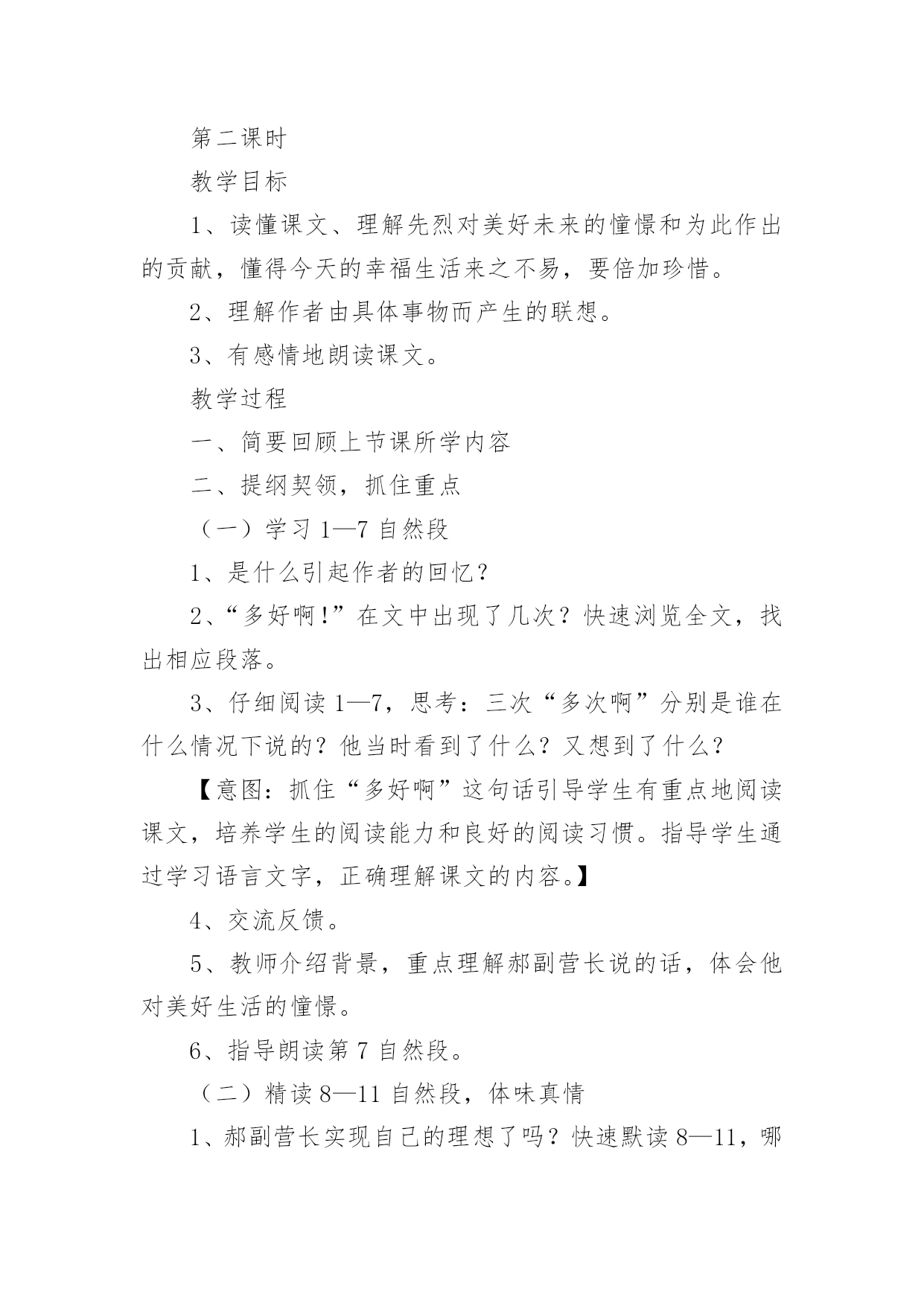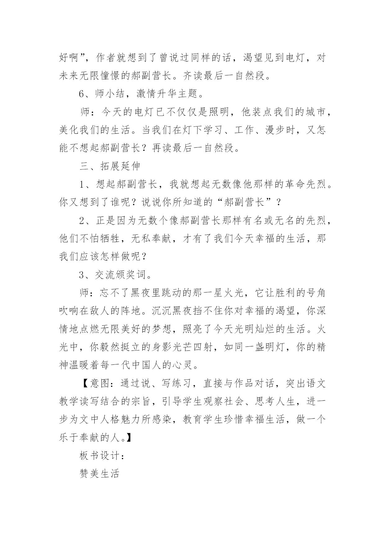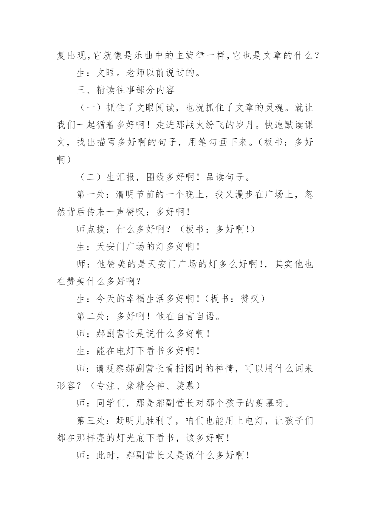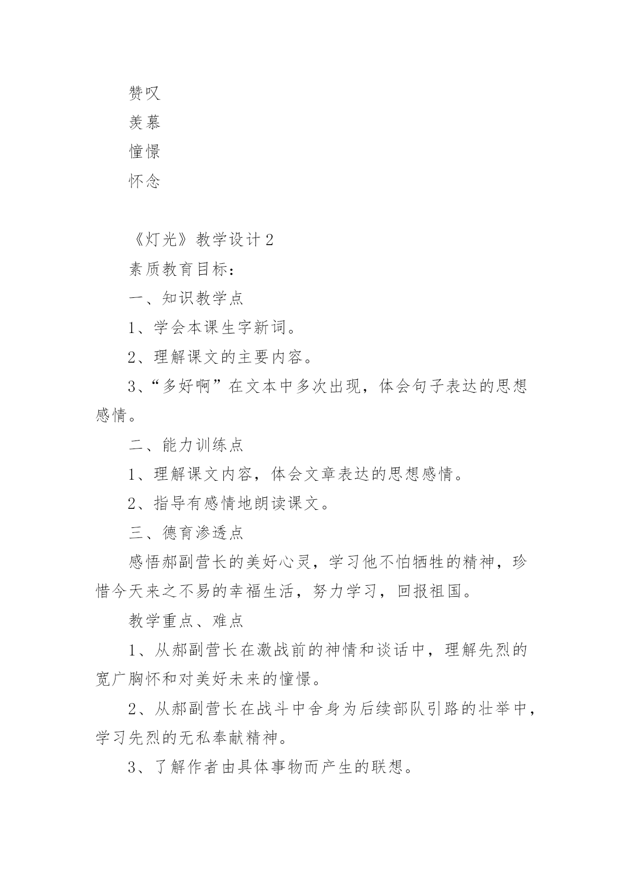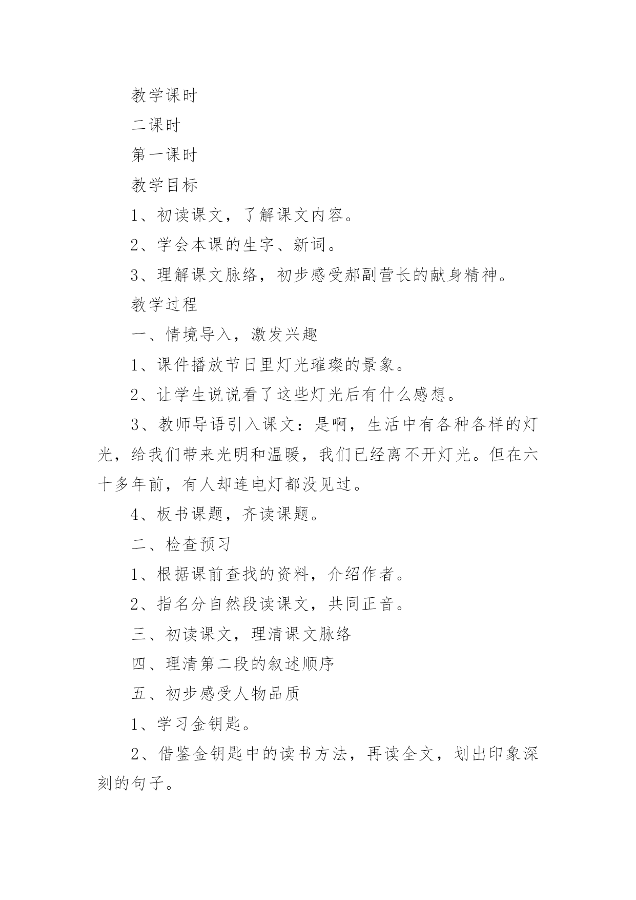 《灯光》教学设计关于《灯光》教学设计在教学工作者开展教学活动前,时常需要编写教学设计,借助教学设计可以促进我们快速成长,使教学工作更加科学化。我们应该怎么写教学设计呢?下面是小编为大家整理的关于《灯光》教学设计,供大家参考借鉴,希望可以帮助到有需要的朋友。《灯光》教学设计1教学目标:一、通读全文,读中引出课文的重点词语憧憬、千钧一发、点燃、性命、没来得及等词语,引导学生认识今天的幸福生活来之不易。二、以多好啊!让学生懂得为理想而献身的美好;读写结合,提升学生对灯光的认识。教学时数:一课时教学过程:一、板书课题,感受灯光的含义(一)请同学们跟着老师一起写课题。当写到灯光二字,你会想到哪些?(二)生1:我会想到光明、温暖。生2:幸福、安宁。生3:家的温馨,因为我一回家看到家里亮着灯,我知道感到特别温馨。(三)师:这些灯光都跟幸福、美好、安宁的生活联系在一起。今天我们学习一篇题为灯光的课文,相信你读后一定会对灯光有新的认识。二、整体把握、提纲契领(一)开火车读课文,其他学生边听边想课文讲了一件什么事?读中教师插话点评。(设计意图:引导通读全文,把学生的思考引向深入,奠定文章的感情基调。)(二)学生概括主要内容。由学生回答中的不同处引出本文的叙述顺序倒叙。(三)读文后交流:读完课文,你有哪些发现?或者有哪些疑惑?设计意图:引导学生悟文章写作方面的特色。(倒叙、前后照应)生1:为什么以灯光为课题,它在写灯光的什么?师(在灯光后打上一个?):你能围绕课题为几个为什么,这就是高年级学生所学到的文题阅读法。再读课文,相信读完后,这个问号一定可以擦去。生2:发现本文中有好几处写到好多啊!生3:我也发现了这一点。师:看来这个多好啊!值得我们好好研读。它在文中反复出现,它就像是乐曲中的主旋律一样,它也是文章的什么?生:文眼。老师以前说过的。三、精读往事部分内容(一)抓住了文眼阅读,也就抓住了文章的灵魂。就让我们一起循着多好啊!走进那战火纷飞的岁月。快速默读课文,找出描写多好啊的句子,用笔勾画下来。(板书:多好啊)(二)生汇报,围线多好啊!品读句子。第一处:清明节前的一个晚上,我又漫步在广场上,忽然背后传来一声赞叹:多好啊!师点拨:什么多好啊?(板书:多好啊!)生:天安门广场的灯多好啊!师:他赞美的是天安门广场的灯多么好啊!,其实他也在赞美什么多好啊?生:今天的幸福生活多好啊!(板书:赞叹)第二处:多好啊!他在自言自语。师;郝副营长是说什么多好啊!生:能在电灯下看书多好啊!师:请观察郝副营长看插图时的神情,可以用什么词来形容?(专注、聚精会神、羡慕)师:同学们,那是郝副营长对那个孩子的羡慕呀。第三处:赶明儿胜利了,咱们也能用上电灯,让孩子们都在那样亮的灯光底下看书,该多好啊!师:此时,郝副营长又是说什么多好啊!生:能让孩子们在那样亮的灯光底下学习该多好啊!师:是呀,从这话中我们听出了他对美好生活的生接:憧憬。(板书:憧憬)(三)品读描写灯光的句子,悟表达方面师:这么多的多好啊!都跟一个词有关,那是什么?生:灯光。师:请找出描写灯光的句子。1、广场上千万盏灯静静地照耀着天安门广场周围的宏伟建筑,使人心头感到光明,感到温暖。2、书上有一幅插图,画的是一盏吊着的电灯,一个孩子正在灯下聚精会神地读书。3、赶明儿胜利了,咱们也能用上电灯,让孩子们都在那样亮的灯光底下学习,该多好啊!4、这位年轻的战友不惜自己的性命,为了让孩子们能够在电灯底下学习,他自己却没有来得及见一见电灯。5、在天安门前璀璨的华灯下面,我又想起这位亲爱的战友来。师:第五个句子让老师觉得特别耳熟。生:因为它和第1个句子一样,都是讲天安门前的灯光,这是前后照应的写法。师:前后照应,让读者听出了天安门广场的灯光给作者王愿坚带来的那种无法忘却的记忆。生1:还有一句,那就是黑暗里出现一星火光,一闪,又一闪。生2:那是写火光,不是灯光。师:也许它不是灯光,但它跟灯光却有着不可紧密的联系,那是什么联系?生3:没有火光,就不可能有灯光。师:是啊,正是那一闪又一闪的火光,那微弱的火光构成了今天我们所能见到的一切璀璨的灯光,构成了我们今天的幸福、安宁的生活。四、拓展话题,读写结合(一)在这星火光中,在华灯照耀的今天,我们似乎还能看到郝副营长那张年轻的脸,还能见到李大钊那张什么的脸?(平静而慈祥的脸)还能见到谁的脸?(设计理念:从火光引伸开发,引导学生联系自己所知道的革命先烈的事迹来谈)(二)革命先烈用生命在不同的地方、用不同的方式让我们能在电灯下学习。此时此刻,你最想说些什么?以灯光为话题写一写,把你内心涌动的情感化为文字表现出来,可以是一首小诗,也可以是一段话(三)师对照板书总结全文:今天,当我们再一次回到灯光,说到多好啊!不会忘记今天的灯光中有着那么多美好的期盼,除了感动,还有着无限的怀念。相信现在可以