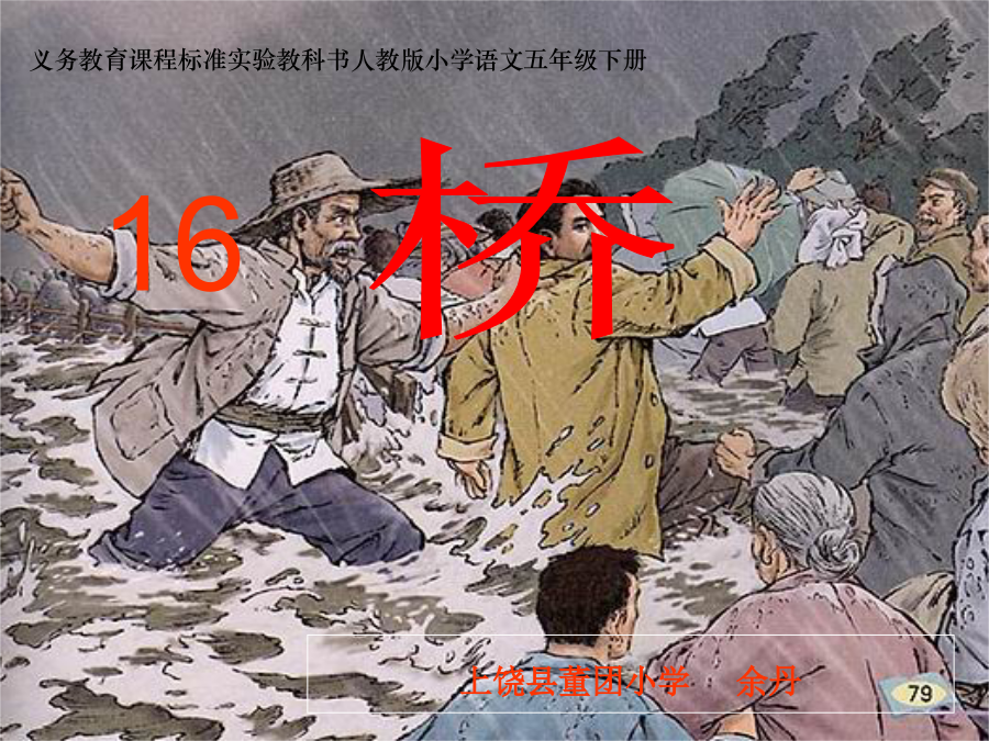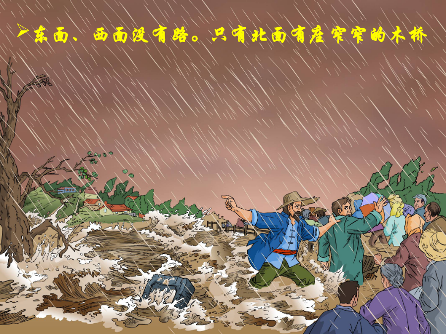 桥咆哮狞笑肆虐势不可当你拥我挤跌跌撞撞自由大声的朗读课文1—6自然段,文本中哪些方面让我们感到情况十分危急?(找出关键词记录在微卡上)黎明的时候,雨突然大了。像泼像倒。山洪咆哮着,像一群受惊的野马,从山谷里狂奔而来,势不可当。是谁惊慌地喊了一嗓子,一百多号人你拥我挤地往南跑。人们又疯了似的折回来,跌跌撞撞地向那木桥拥去。东面、西面没有路。只有北面有座窄窄的木桥找一找,读一读。沉下心来让我们再次走进文本,默读课文7—20自然段,看看老汉是怎样指挥着惊慌的人群?找出描写老汉的句子读一读.他不说话,盯着乱哄哄的人们。他像一座山。老汉沙哑地喊话:“桥窄!排成一队,不要挤!党员排在后边!”老汉冷冷地说:“可以退党,到我这儿报名。”老汉突然上前,从队伍里出一个小伙子,道:“你还算是个党员吗?排到后面去!”老汉凶得像只豹子。老汉吼道:“少废话,快走。”他用力把小伙子推上木桥。老汉似乎要喊什么,猛然间,一个浪头也吞没了他。五天以后,洪水退了。一个老太太,被人搀扶着,来这里祭奠。她来祭奠两个人。她丈夫和她儿子。五个月之后,一座新桥横跨在小河两岸,宽阔、平坦,人们聚集在桥头,商量着桥的名字……老汉走了,但是老汉的精神却永存我们心中,让我们为老汉写一句话吧,讴歌这位平民英雄吧!