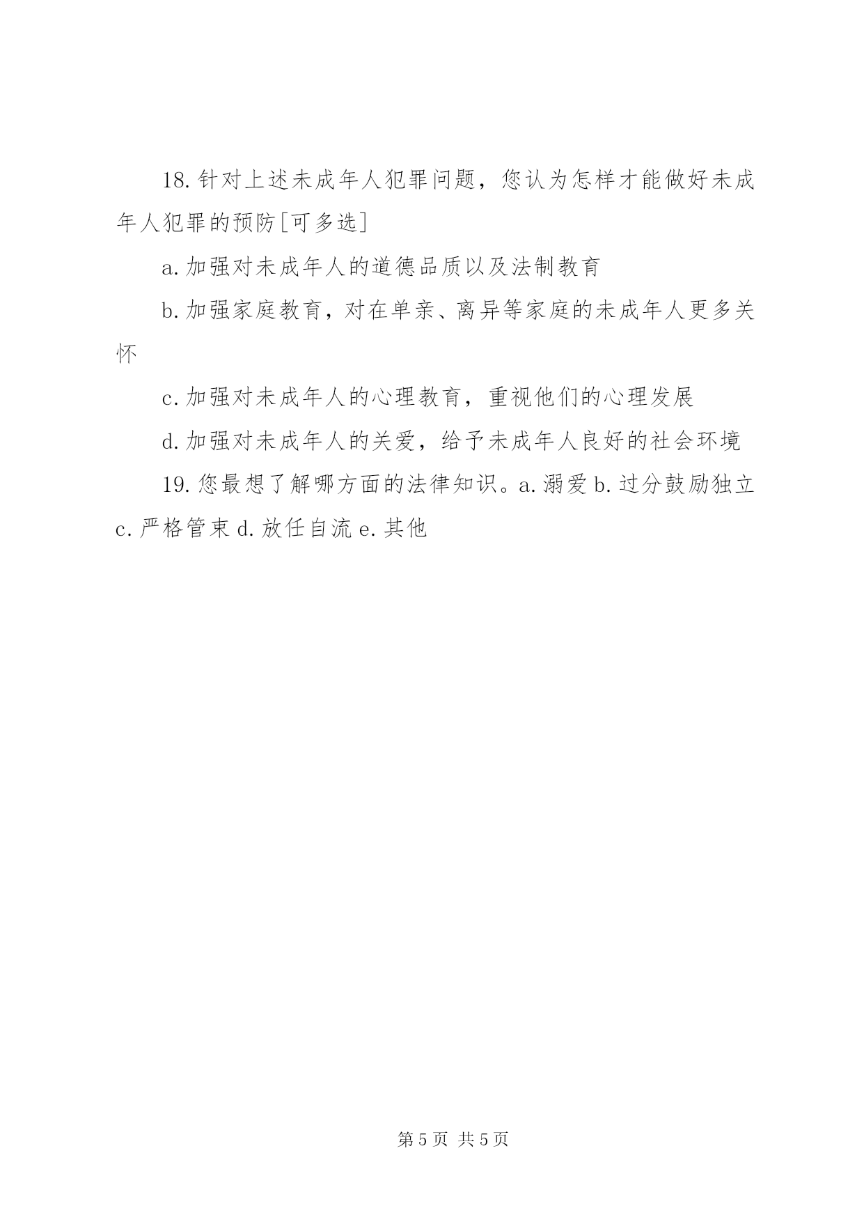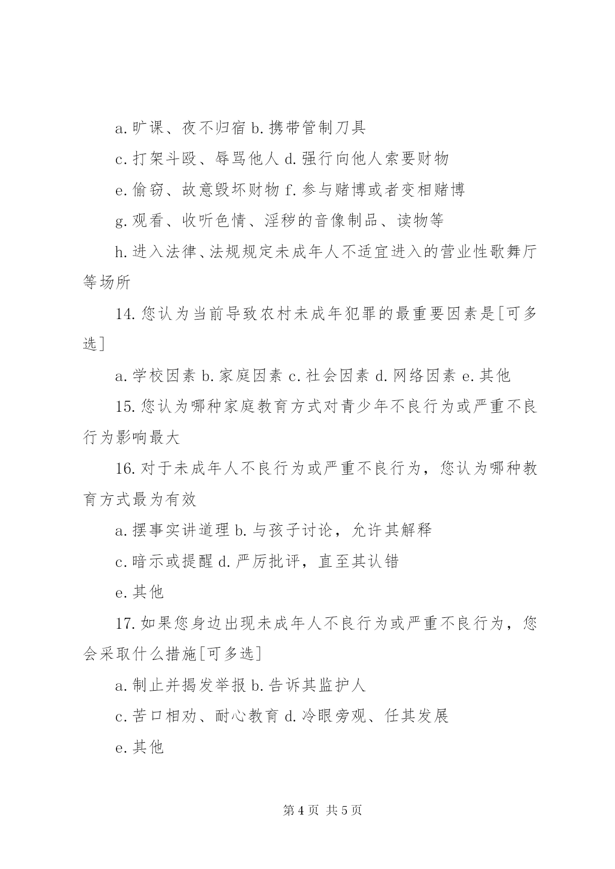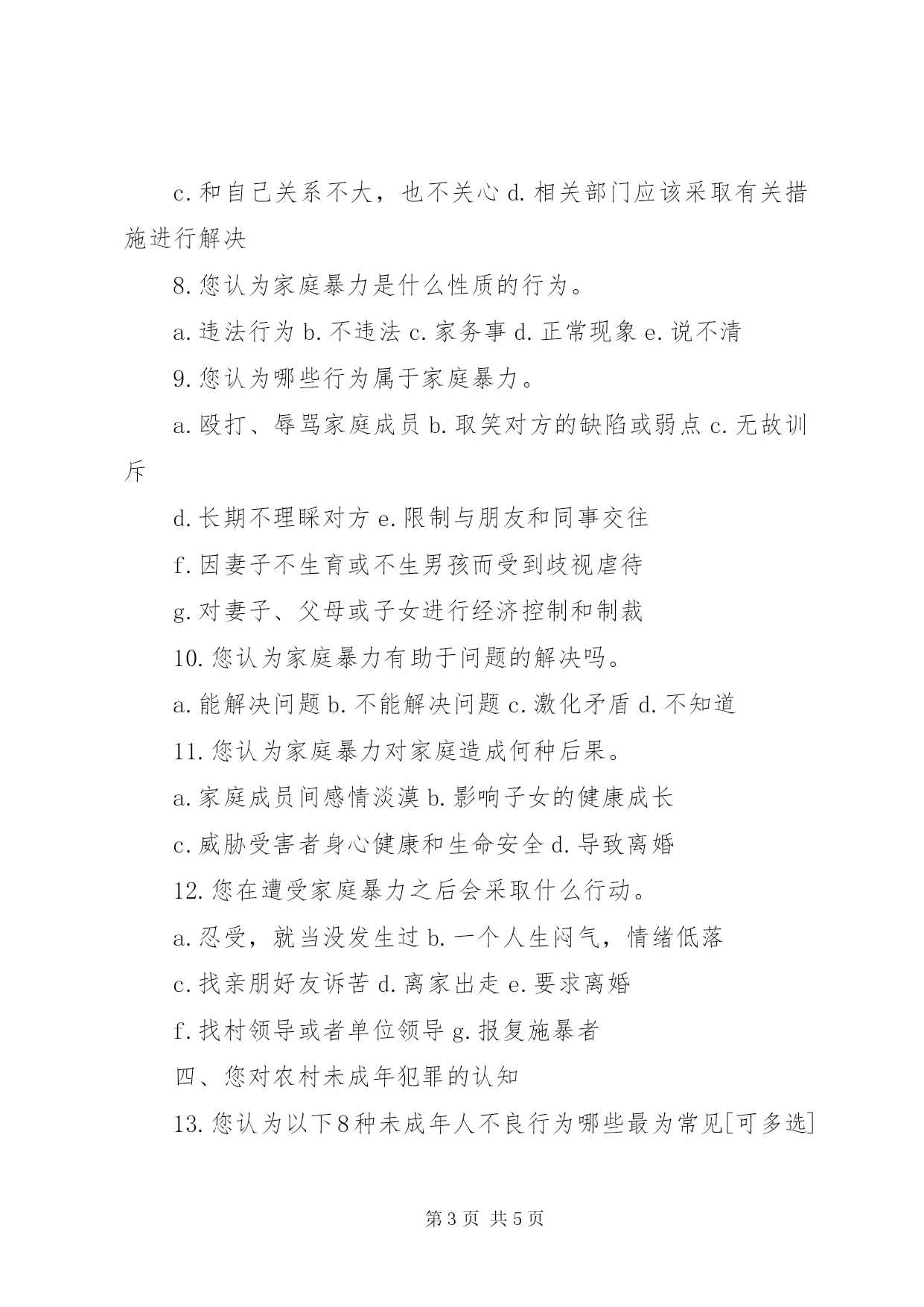 第PAGE\*Arabic\*MERGEFORMAT5页共NUMPAGES\*MERGEFORMAT5页关于道德与法律意识调查问卷表关于农村法律意识的调查问卷调查地区。您好。我们是西安医学院、西安工业大学、陕西科技大学法律社团的学生,为了获取真实的社会信息,了解当下农村法律意识的整体情况,开展相应的调查研究,我们将对您进行社会调研,请根据您的实际情况,在横线上填写答案。我们保证为您保守秘密,调研的信息只用于调查,不做其他任何用处。谢谢您的支持。一、个人基本情况性别:□男□女年龄:□18岁以下□18-25□26-35□36-45□46-55□56岁及以上受教育程度:□高中及以下□大中专□本科以上职业:(1)农民(2)农民工(3)企业职工(4)企业主(5)商人(6)教师(7)农村干部(8)其他二、您对法律常识的认知1.您认为目前学习法律知识的主要问题是a.没有问题,能够熟练地运用法律手段解决问题b.有一定的法律知识,但不会运用到实际生活之中c.缺乏法律知识2.您最希望得到的是什么样的法律援助形式a.广场法律宣传咨询活动b.法律知识讲座c.浏览普法网站d.观看普法电视节目e.法制文艺演出f.其他3.当您与他人发生矛盾时,您首先选择哪种方式解决a.运用法律武器保护自己b.找村干部解决c.用武力解决d.通过私人关系解决e.找村里有威望的老人解决f.忍忍就过去了4.当您自己或他人的权益受到侵害时,您想过打官司吗。a.想过,并能通过正确途径解决b.想过,但是不知道具体怎样解决c.没想过d.通过其他方式解决5.您认为是什么样的原因导致农村中的纠纷经常通过“私了”解决a.对个人声誉影响较小b.较为方便快捷c.乡情影响d.大事化小,小事化了的心态6.假如您抓住了偷自己东西的小偷,您将会如何处臵a.送到派出所b.交给村干部c.痛打解恨d.赔钱了事三、您对婚姻及家庭的认知7.对于农村常见的早婚现象,您个人怎样看待。a.正常,当地都是这样的情况b.不符合法律的相关规定c.和自己关系不大,也不关心d.相关部门应该采取有关措施进行解决8.您认为家庭暴力是什么性质的行为。a.违法行为b.不违法c.家务事d.正常现象e.说不清9.您认为哪些行为属于家庭暴力。a.殴打、辱骂家庭成员b.取笑对方的缺陷或弱点c.无故训斥d.长期不理睬对方e.限制与朋友和同事交往f.因妻子不生育或不生男孩而受到歧视虐待g.对妻子、父母或子女进行经济控制和制裁10.您认为家庭暴力有助于问题的解决吗。a.能解决问题b.不能解决问题c.激化矛盾d.不知道11.您认为家庭暴力对家庭造成何种后果。a.家庭成员间感情淡漠b.影响子女的健康成长c.威胁受害者身心健康和生命安全d.导致离婚12.您在遭受家庭暴力之后会采取什么行动。a.忍受,就当没发生过b.一个人生闷气,情绪低落c.找亲朋好友诉苦d.离家出走e.要求离婚f.找村领导或者单位领导g.报复施暴者四、您对农村未成年犯罪的认知13.您认为以下8种未成年人不良行为哪些最为常见[可多选]a.旷课、夜不归宿b.携带管制刀具c.打架斗殴、辱骂他人d.强行向他人索要财物e.偷窃、故意毁坏财物f.参与赌博或者变相赌博g.观看、收听色情、淫秽的音像制品、读物等h.进入法律、法规规定未成年人不适宜进入的营业性歌舞厅等场所14.您认为当前导致农村未成年犯罪的最重要因素是[可多选]a.学校因素b.家庭因素c.社会因素d.网络因素e.其他15.您认为哪种家庭教育方式对青少年不良行为或严重不良行为影响最大16.对于未成年人不良行为或严重不良行为,您认为哪种教育方式最为有效a.摆事实讲道理b.与孩子讨论,允许其解释c.暗示或提醒d.严厉批评,直至其认错e.其他17.如果您身边出现未成年人不良行为或严重不良行为,您会采取什么措施[可多选]a.制止并揭发举报b.告诉其监护人c.苦口相劝、耐心教育d.冷眼旁观、任其发展e.其他18.针对上述未成年人犯罪问题,您认为怎样才能做好未成年人犯罪的预防[可多选]a.加强对未成年人的道德品质以及法制教育b.加强家庭教育,对在单亲、离异等家庭的未成年人更多关怀c.加强对未成年人的心理教育,重视他们的心理发展d.加强对未成年人的关爱,给予未成年人良好的社会环境19.您最想了解哪方面的法律知识。a.溺爱b.过分鼓励独立c.严格管束d.放任自流e.其他