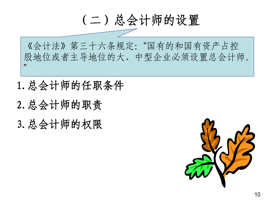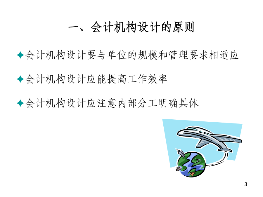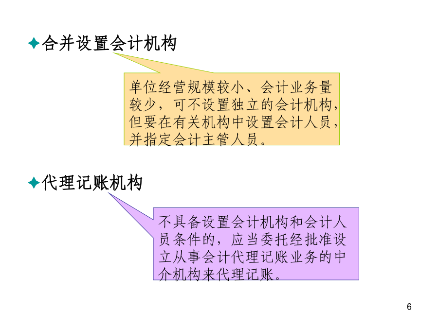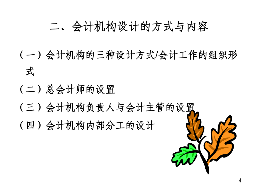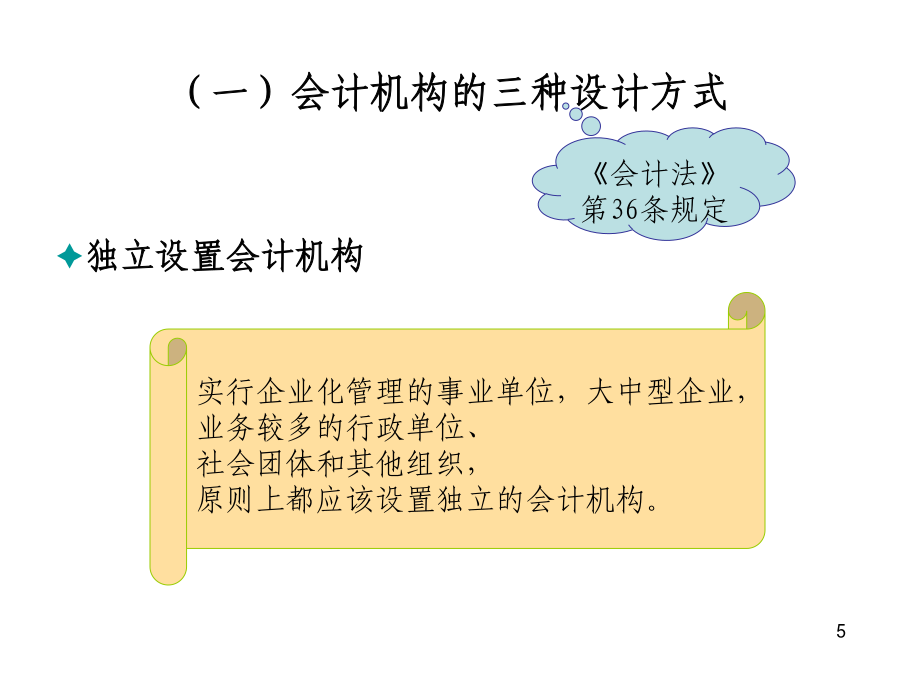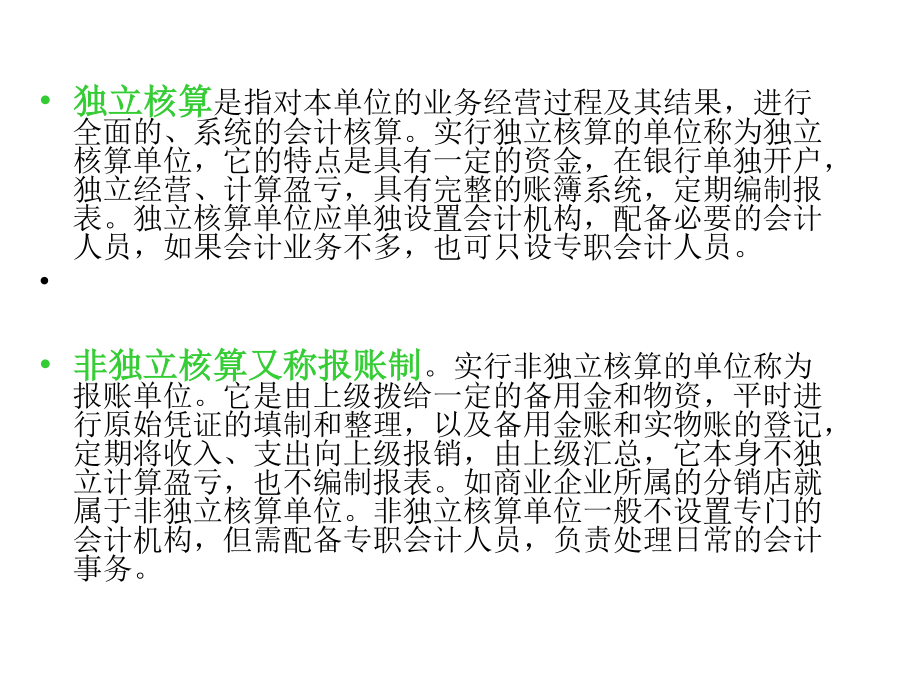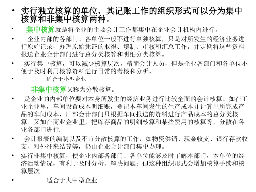 123456会计工作的组织形式独立核算是指对本单位的业务经营过程及其结果,进行全面的、系统的会计核算。实行独立核算的单位称为独立核算单位,它的特点是具有一定的资金,在银行单独开户,独立经营、计算盈亏,具有完整的账簿系统,定期编制报表。独立核算单位应单独设置会计机构,配备必要的会计人员,如果会计业务不多,也可只设专职会计人员。非独立核算又称报账制。实行非独立核算的单位称为报账单位。它是由上级拨给一定的备用金和物资,平时进行原始凭证的填制和整理,以及备用金账和实物账的登记,定期将收入、支出向上级报销,由上级汇总,它本身不独立计算盈亏,也不编制报表。如商业企业所属的分销店就属于非独立核算单位。非独立核算单位一般不设置专门的会计机构,但需配备专职会计人员,负责处理日常的会计事务。实行独立核算的单位,其记账工作的组织形式可以分为集中核算和非集中核算两种。集中核算就是将企业的主要会计工作都集中在企业会计机构内进行。企业内部的各部门、各单位一般不进行单独核算,只是对所发生的经济业务进行原始记录,办理原始凭证的取得、填制、审核和汇总工作,并定期将这些资料报送企业会计部门进行总分类核算和明细分类核算。实行集中核算,可以减少核算层次,精简会计人员,但是企业各部门和各单位不便于及时利用核算资料进行日常的考核和分析。适合于小型企业非集中核算又称为分散核算。是企业的内部单位要对本身所发生的经济业务进行比较全面的会计核算。如在工业企业里,车间设置成本明细账,登记本车间发生的生产成本并计算出所完成产品的车间成本,厂部会计部门只根据车间报送的资料进行产品成本的总分类核算。又如在商业企业里,把库存商品的明细核算和某些费用的核算等,分散在各业务部门进行.会计报表的编制以及不宜分散核算的工作,如物资供销、现金收支、银行存款收支、对外往来结算等,仍由企业会计部门集中办理。实行非集中核算,使企业内部各部门、各单位能够及时了解本部门,本单位的经济活动情况,有利于及时分析、解决问题;但这种组织形式会增加核算手续和核算层次。适合于大中型企业10111213141516大中型企业运作的会计机构图大中型企业商业零售企业会计机构图1920212223注意在岗位设置上可一人一岗、一人多岗、一岗多人。出纳人员不得兼任稽核、会计档案保管、收入、费用债权债务账目的登记工作。实行岗位轮换制度25262728293031323334案例分析(第六章讲完后)方达公司有盛立、王璐、向华三名会计人员,他们所承担的工作有8项1、记录并保管总帐2、计录并保管应付帐款明细账3、计录并保管应收帐款明细账4、记录现金和银行存款日记账5、填写保管支票6、保管并送存现金7、调节银行日记账和银行对帐单8、办理进货退出证明以上三名会计人员能力相当,且能承担任何工作。要求:应用内部控制制度原理对上述工作划分,使三人工作量相当且能够起到会计工作内部控制的作用,并简要说明划分原因。36373839