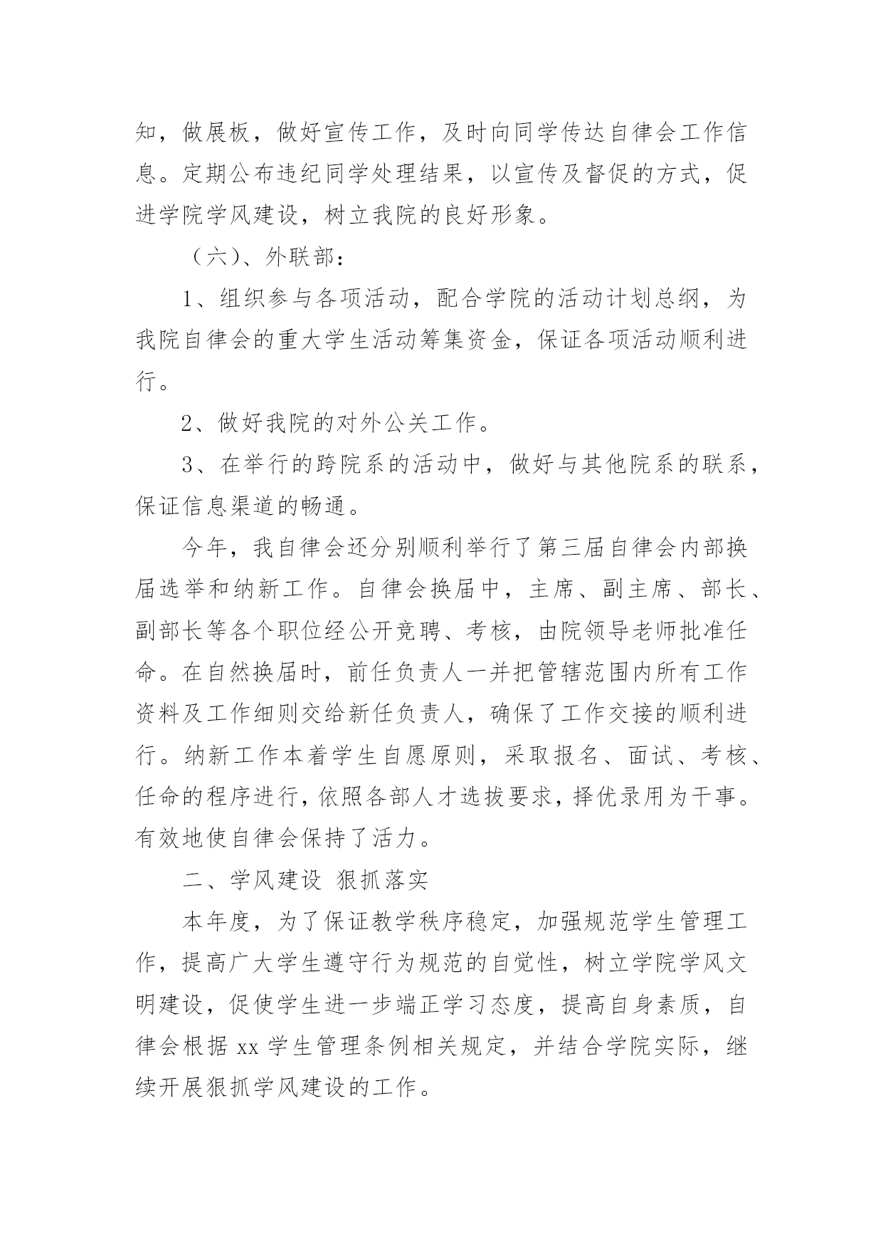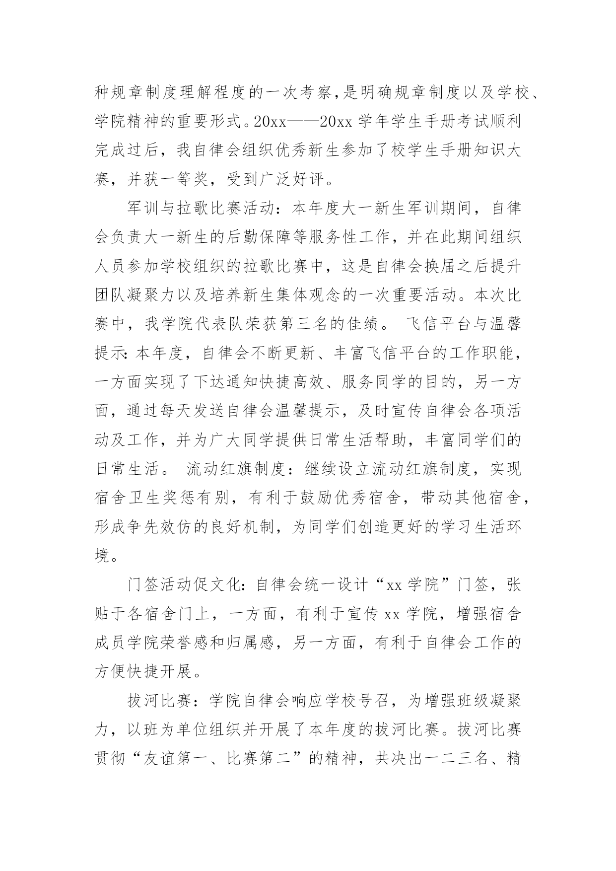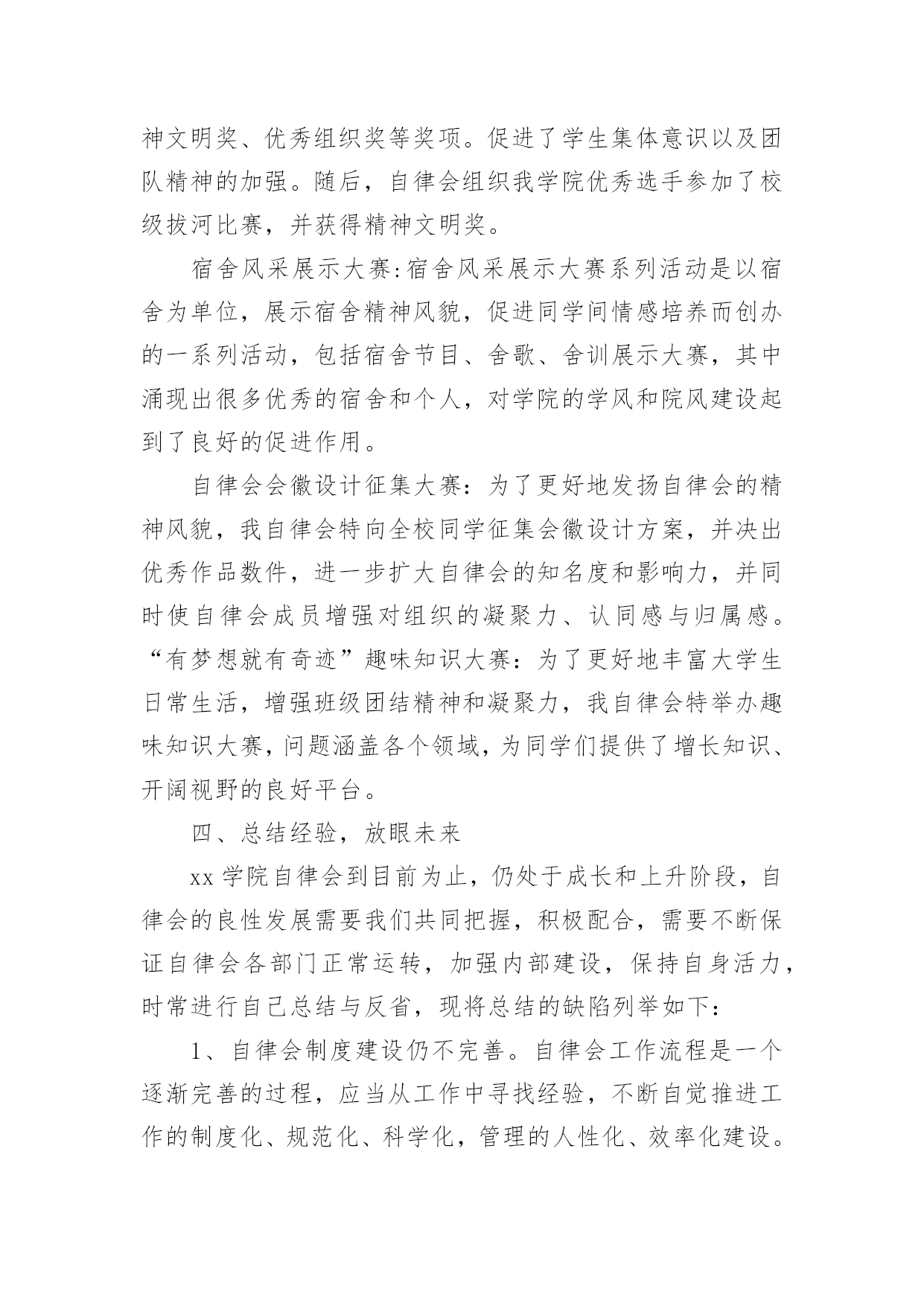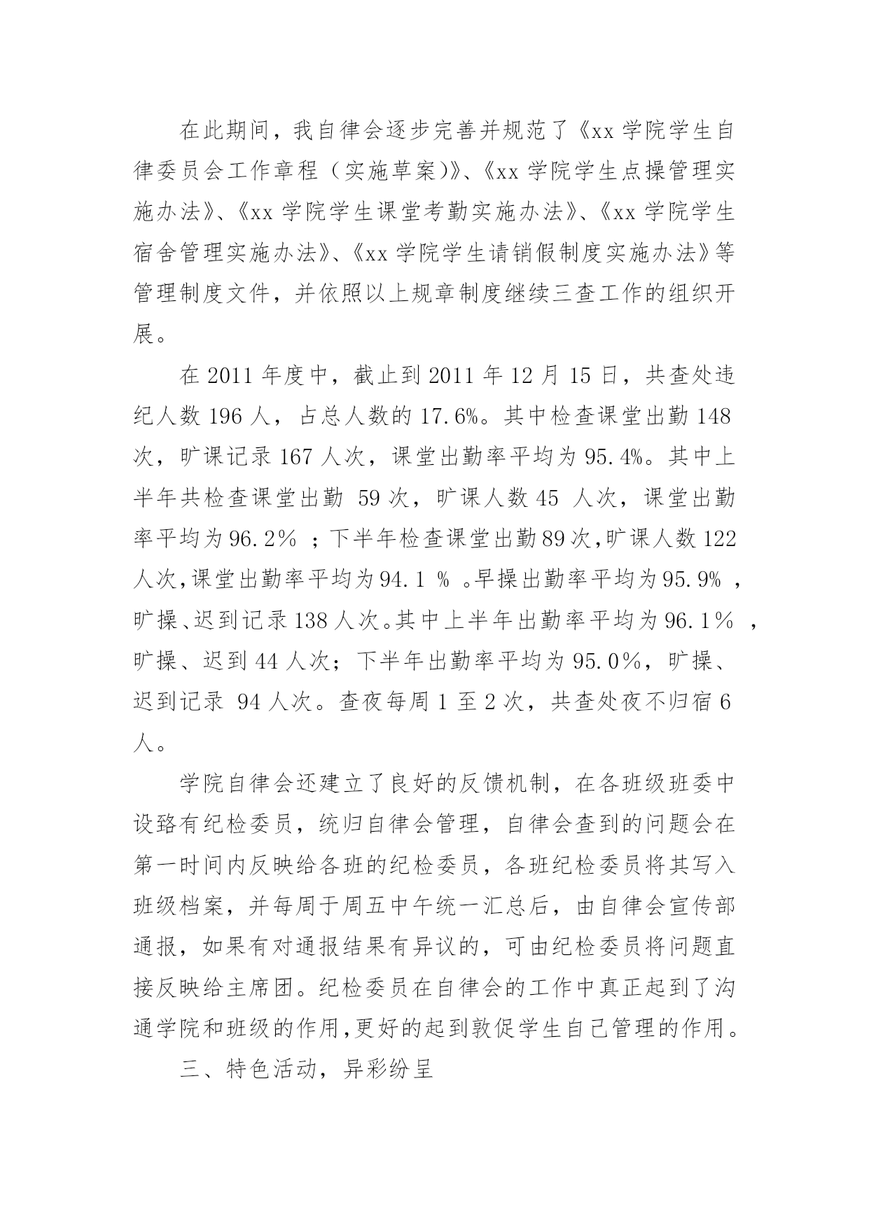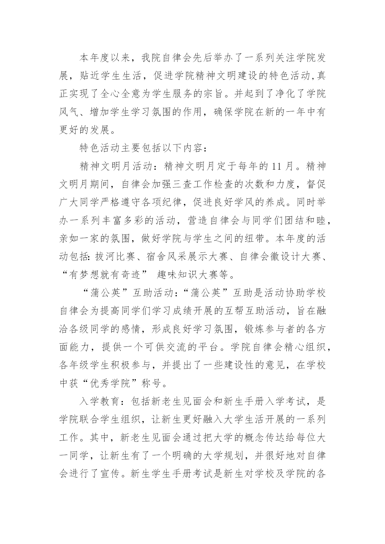 大学生自律委员会工作总结大学生自律委员会工作总结(精选16篇)忙碌而又充实的工作已经告一段落了,回顾这段时间以来的工作成果,你有什么感悟呢?制定一份工作总结吧。相信很多朋友都不知道工作总结该怎么写吧,下面是小编精心整理的大学生自律委员会工作总结(精选16篇),欢迎阅读,希望大家能够喜欢。大学生自律委员会工作总结篇1光阴荏苒,时光易逝,转眼间一个学年又要过去了,作为大学生自律委员会里的一个特殊部门----生活部各项工作也经接近尾声。在这一年当中,我们生活部在院里老师的带领下,在各位成员的紧密配合下,圆满地完成了本学年我们部门应尽的职责,并且积极地配合学生会其他部门的各项活动,获得了老师和同学们的好评。现将本期工作总结如下:一、日常工作的开展生活部每周二例会,于每周二下午五点于3C103召开。例会主要总结上周的工作以及出现的问题。同时安排下周要进行的工作。每周的例会使得生活部的各项工作有序进行。二、宿舍卫生检查生活部每周都会对九大院系的寝室卫生进行检查,我们有完善的学生宿舍卫生检查参考评分标准和宿舍卫生评分评比规定,每周也会对宿舍检查结果进行汇总,同时也会把每个学宿检查结果反馈到各个学宿,每月也会把检查的单子反馈给老师,也要进行每月的数据汇总。这在一定程度上极大地调动了我们大学生讲究卫生,争做文明大学生的积极性。每周定期的宿舍卫生检查,不仅加强了寝室卫生管理力度,更好的督促了同学打扫好自己的宿舍,使他们养成良好的生活习惯,为学习提供了良好的环境。同时保证了同学和大学生自律委员会之间的交流,及时发现问题并解决问题。这样的信息交流与工作流程确保了同学们生活环境的安全、舒适,也很好的完成了生活部应尽的使命。三、夜不归宿检查生活部每周不定期的进行夜不归宿检查。检查结果进行汇总并反馈给老师,通过这样的抽查,寝室的夜不归宿现象有了明显的好转。同学们的自律意识也有了很大的提升。更重要的是保证了同学们的安全。四、教室卫生检查为了保证每个学生都能够在一个干净卫生的环境中生活学习,生活部每天都会对教室卫生进行检查,检查单子回反馈到教管,统计结果我们会通过出白板的形式反馈给全校的每个同学,让他们及时准确的了解各自院系及各班级的卫生情况,为学生创造好的学习环境。五、座谈会因九大系科的卫生标准不同,为了我们的工作能够顺利进行,我们召开了关于宿舍和教室卫生的座谈会,我们简单介绍了我们检查的标准,并对他们的疑问进行解答,此次座谈会加强了我们跟九大系科的交流。总之,我们这一学年我们生活部尽心尽力的完成院校给我们规定的工作和任务,并且取得了一定的成就,虽然工作过程中还有很多失误和不足,但是针对以往的缺陷我们会努力改正,争取以后作到更好,而且我们也坚信自己明天会做的更好!生活部将在今后的工作中尽职尽责,谋求新思路,完善本部门,更好做出自己的贡献服务好全院师生。大学生自律委员会工作总结篇220xx年是xxxx学院学生自律委员会正式成立的第二年。在这一年当中,自律会在上级领导老师和学院各组织的关心帮助下,在总体有效的领导机制和新鲜血液的共同努力下,全体成员秉持自立、自强、自律的精神,维护公平、公正、公开、严格、严肃、严谨的原则立场,努力开展大学生日常行为规范的监督和检查工作。其中,各部门各施其责,相互配合,力求积极进取、开拓创新;工作人员坚持以身作则、尽职尽责、接受监督,共同致力于本院学生工作,引导同学们的自己教育、自己管理、自己服务。自律会团队以实现为广大同学服务的最终目标,在宣传先进思想理论、弘扬精神道德文明、促进优秀学风养成及建设、维护生活学习秩序和纪律、培养健康向上的生活方式、引导营造文明舒适的生活环境、丰富大学生活及社会生活等方面坚持努力开展工作,做出突出贡献。一、基础工作紧张有序xx学院自律会设主席一名,副主席三名,共设七大部门:主席团、办公室、学习部、纪检部、宿管部、宣传部、外联部。每部设部长一名,副部长两名,干事若干。自律会实行集体领导下的分工负责制,实行决策民主、工作自主的组织原则。各部门分工不同,通力合作,积极开展工作。以下是自律会各部门本年度日常工作:(一)、办公室:1、做到自律会内部、各班、各宿舍通知的及时、准确发放。2、及时、有效、准确地做好档案、课表、通讯录的核查与发放,并建立个人档案;做好销假工作及“三查”活动的统计和存档,做好自律会举办、协办、参与的各项活动的活动记录及会议记录,并认真完成所有资料的保存和整理工作,实现自律会组织化,系统化,档案化。3、对各项规章制度进行制定和整理,完善制度建设;认真做好工作做情况的统计和评议,保证自律会各部门工作的正常进行。(二)、学习部:1、为保证自律会其他部门能够高效高质的完成本部门任务,也为了更好的协助其他部门完成活动前期的策划组织工作、承办有水平的校级活动,负责自律会各项活动项目的定位与策划报