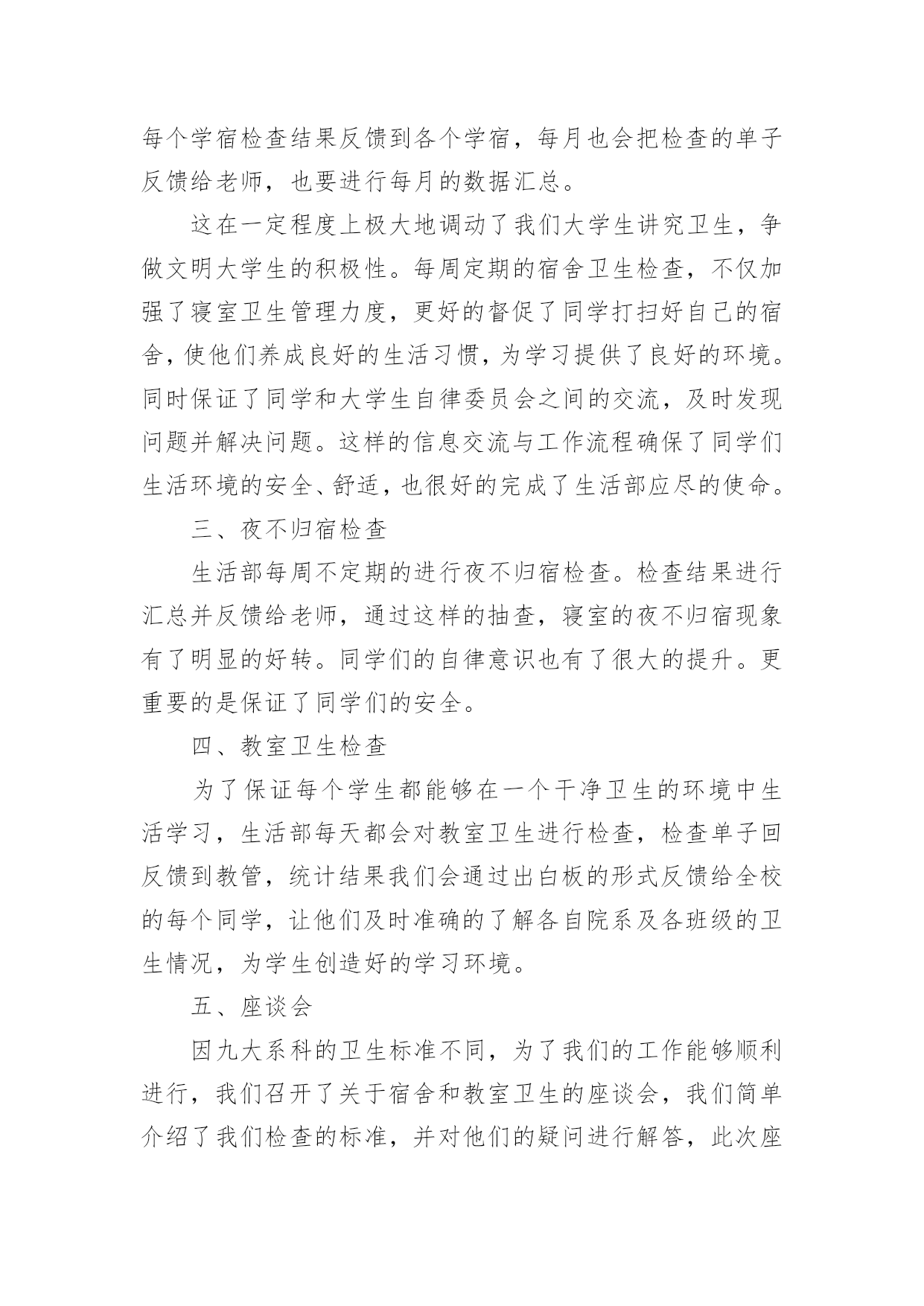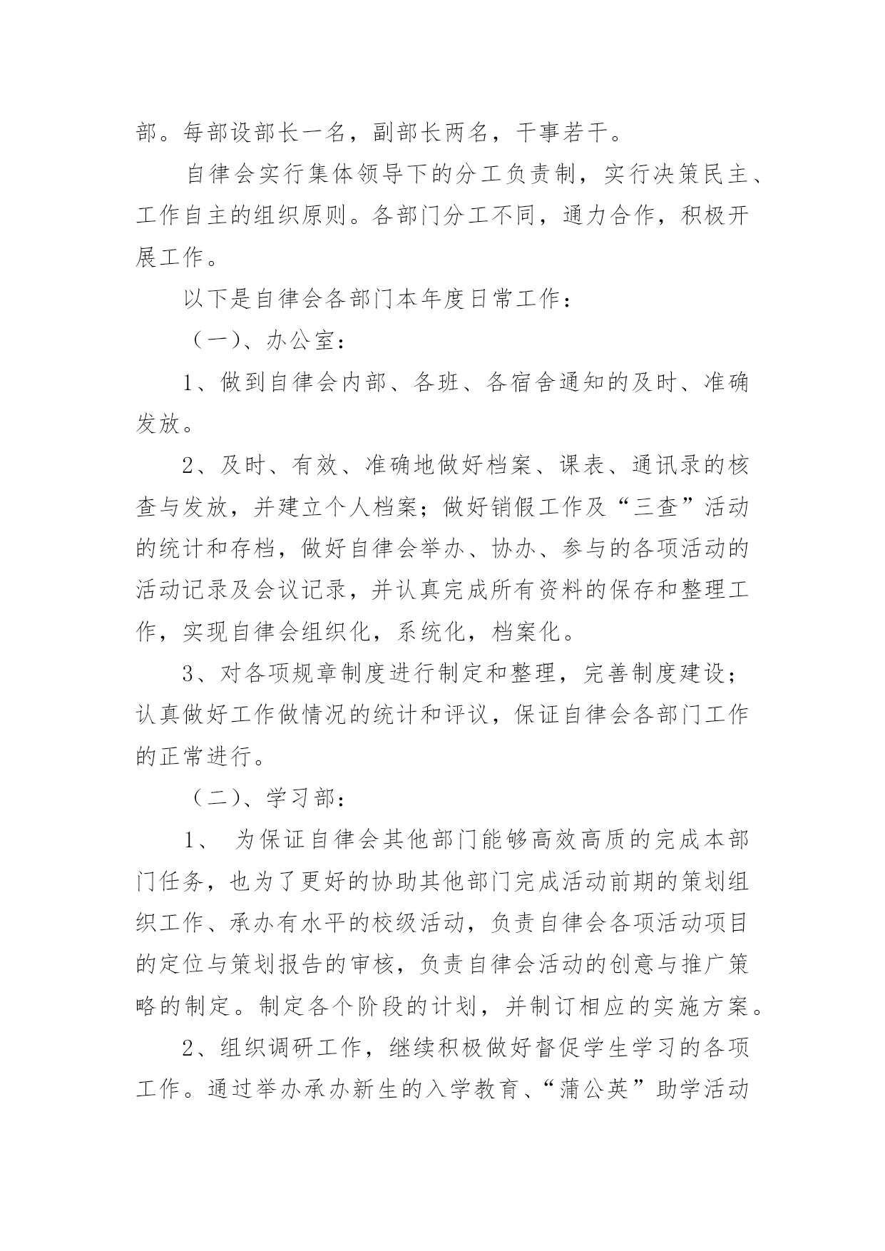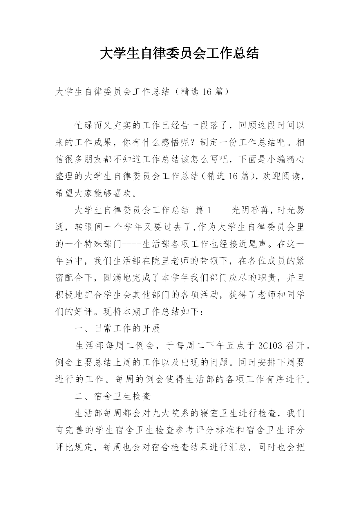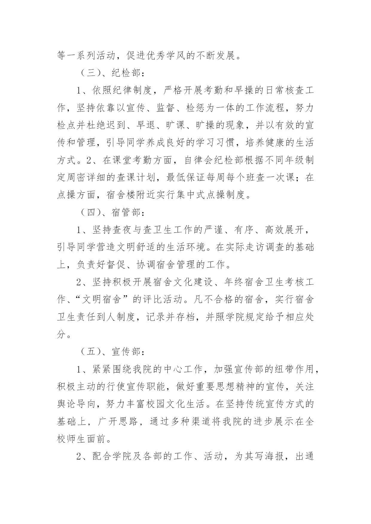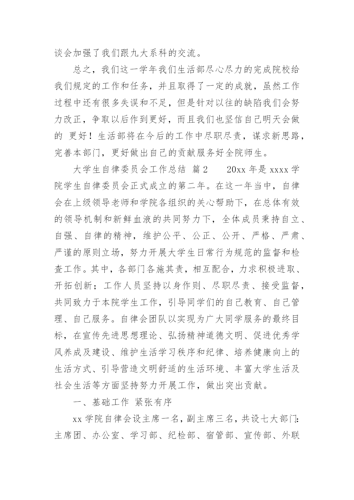 大学生自律委员会工作总结大学生自律委员会工作总结(精选16篇)忙碌而又充实的工作已经告一段落了,回顾这段时间以来的工作成果,你有什么感悟呢?制定一份工作总结吧。相信很多朋友都不知道工作总结该怎么写吧,下面是小编精心整理的大学生自律委员会工作总结(精选16篇),欢迎阅读,希望大家能够喜欢。大学生自律委员会工作总结篇1光阴荏苒,时光易逝,转眼间一个学年又要过去了,作为大学生自律委员会里的一个特殊部门----生活部各项工作也经接近尾声。在这一年当中,我们生活部在院里老师的带领下,在各位成员的紧密配合下,圆满地完成了本学年我们部门应尽的职责,并且积极地配合学生会其他部门的各项活动,获得了老师和同学们的好评。现将本期工作总结如下:一、日常工作的开展生活部每周二例会,于每周二下午五点于3C103召开。例会主要总结上周的工作以及出现的问题。同时安排下周要进行的工作。每周的例会使得生活部的各项工作有序进行。二、宿舍卫生检查生活部每周都会对九大院系的寝室卫生进行检查,我们有完善的学生宿舍卫生检查参考评分标准和宿舍卫生评分评比规定,每周也会对宿舍检查结果进行汇总,同时也会把每个学宿检查结果反馈到各个学宿,每月也会把检查的单子反馈给老师,也要进行每月的数据汇总。这在一定程度上极大地调动了我们大学生讲究卫生,争做文明大学生的积极性。每周定期的宿舍卫生检查,不仅加强了寝室卫生管理力度,更好的督促了同学打扫好自己的宿舍,使他们养成良好的生活习惯,为学习提供了良好的环境。同时保证了同学和大学生自律委员会之间的交流,及时发现问题并解决问题。这样的信息交流与工作流程确保了同学们生活环境的安全、舒适,也很好的完成了生活部应尽的使命。三、夜不归宿检查生活部每周不定期的进行夜不归宿检查。检查结果进行汇总并反馈给老师,通过这样的抽查,寝室的夜不归宿现象有了明显的好转。同学们的自律意识也有了很大的提升。更重要的是保证了同学们的安全。四、教室卫生检查为了保证每个学生都能够在一个干净卫生的环境中生活学习,生活部每天都会对教室卫生进行检查,检查单子回反馈到教管,统计结果我们会通过出白板的形式反馈给全校的每个同学,让他们及时准确的了解各自院系及各班级的卫生情况,为学生创造好的学习环境。五、座谈会因九大系科的卫生标准不同,为了我们的工作能够顺利进行,我们召开了关于宿舍和教室卫生的座谈会,我们简单介绍了我们检查的标准,并对他们的疑问进行解答,此次座谈会加强了我们跟九大系科的交流。总之,我们这一学年我们生活部尽心尽力的完成院校给我们规定的工作和任务,并且取得了一定的成就,虽然工作过程中还有很多失误和不足,但是针对以往的缺陷我们会努力改正,争取以后作到更好,而且我们也坚信自己明天会做的更好!生活部将在今后的工作中尽职尽责,谋求新思路,完善本部门,更好做出自己的贡献服务好全院师生。大学生自律委员会工作总结篇220xx年是xxxx学院学生自律委员会正式成立的第二年。在这一年当中,自律会在上级领导老师和学院各组织的关心帮助下,在总体有效的领导机制和新鲜血液的共同努力下,全体成员秉持自立、自强、自律的精神,维护公平、公正、公开、严格、严肃、严谨的原则立场,努力开展大学生日常行为规范的监督和检查工作。其中,各部门各施其责,相互配合,力求积极进取、开拓创新;工作人员坚持以身作则、尽职尽责、接受监督,共同致力于本院学生工作,引导同学们的自己教育、自己管理、自己服务。自律会团队以实现为广大同学服务的最终目标,在宣传先进思想理论、弘扬精神道德文明、促进优秀学风养成及建设、维护生活学习秩序和纪律、培养健康向上的生活方式、引导营造文明舒适的生活环境、丰富大学生活及社会生活等方面坚持努力开展工作,做出突出贡献。一、基础工作紧张有序xx学院自律会设主席一名,副主席三名,共设七大部门:主席团、办公室、学习部、纪检部、宿管部、宣传部、外联部。每部设部长一名,副部长两名,干事若干。自律会实行集体领导下的分工负责制,实行决策民主、工作自主的组织原则。各部门分工不同,通力合作,积极开展工作。以下是自律会各部门本年度日常工作:(一)、办公室:1、做到自律会内部、各班、各宿舍通知的及时、准确发放。2、及时、有效、准确地做好档案、课表、通讯录的核查与发放,并建立个人档案;做好销假工作及“三查”活动的统计和存档,做好自律会举办、协办、参与的各项活动的活动记录及会议记录,并认真完成所有资料的保存和整理工作,实现自律会组织化,系统化,档案化。3、对各项规章制度进行制定和整理,完善制度建设;认真做好工作做情况的统计和评议,保证自律会各部门工作的正常进行。(二)、学习部:1、为保证自律会其他部门能够高效高质的完成本部门任务,也为了更好的协助其他部门完成活动前期的策划组织工作、承办有水平的校级活动,负责自律会各项活动项目的定位与策划报