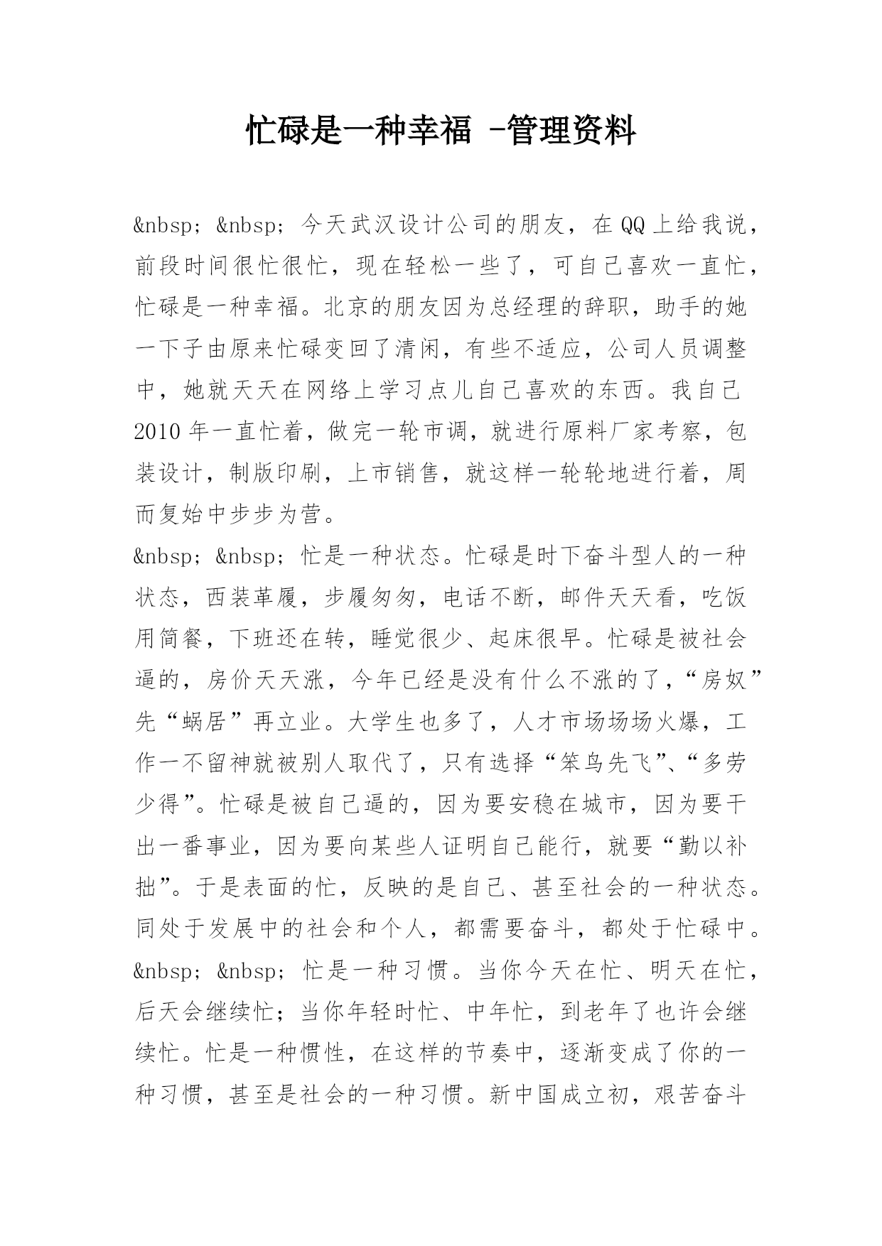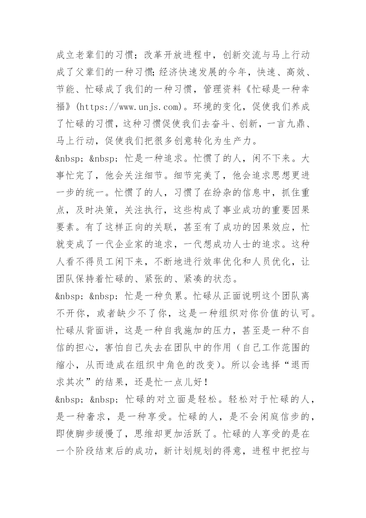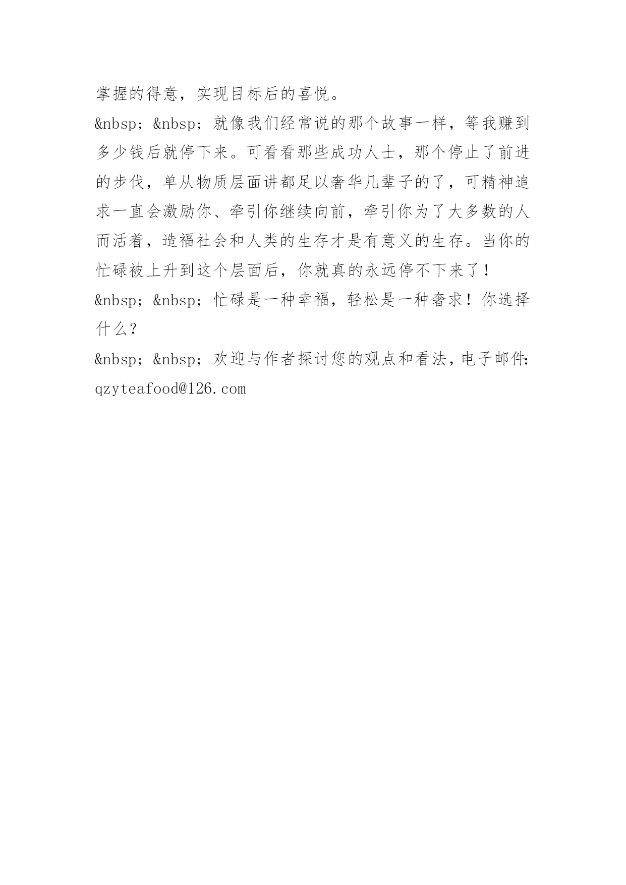忙碌是一种幸福-管理资料 今天武汉设计公司的朋友,在QQ上给我说,前段时间很忙很忙,现在轻松一些了,可自己喜欢一直忙,忙碌是一种幸福。北京的朋友因为总经理的辞职,助手的她一下子由原来忙碌变回了清闲,有些不适应,公司人员调整中,她就天天在网络上学习点儿自己喜欢的东西。我自己2010年一直忙着,做完一轮市调,就进行原料厂家考察,包装设计,制版印刷,上市销售,就这样一轮轮地进行着,周而复始中步步为营。 忙是一种状态。忙碌是时下奋斗型人的一种状态,西装革履,步履匆匆,电话不断,邮件天天看,吃饭用简餐,下班还在转,睡觉很少、起床很早。忙碌是被社会逼的,房价天天涨,今年已经是没有什么不涨的了,“房奴”先“蜗居”再立业。大学生也多了,人才市场场场火爆,工作一不留神就被别人取代了,只有选择“笨鸟先飞”、“多劳少得”。忙碌是被自己逼的,因为要安稳在城市,因为要干出一番事业,因为要向某些人证明自己能行,就要“勤以补拙”。于是表面的忙,反映的是自己、甚至社会的一种状态。同处于发展中的社会和个人,都需要奋斗,都处于忙碌中。 忙是一种习惯。当你今天在忙、明天在忙,后天会继续忙;当你年轻时忙、中年忙,到老年了也许会继续忙。忙是一种惯性,在这样的节奏中,逐渐变成了你的一种习惯,甚至是社会的一种习惯。新中国成立初,艰苦奋斗成立老辈们的习惯;改革开放进程中,创新交流与马上行动成了父辈们的一种习惯;经济快速发展的今年,快速、高效、节能、忙碌成了我们的一种习惯,管理资料《忙碌是一种幸福》(https://www.unjs.com)。环境的变化,促使我们养成了忙碌的习惯,这种习惯促使我们去奋斗、创新,一言九鼎、马上行动,促使我们把很多创意转化为生产力。 忙是一种追求。忙惯了的人,闲不下来。大事忙完了,他会关注细节。细节完美了,他会追求思想更进一步的统一。忙惯了的人,习惯了在纷杂的信息中,抓住重点,及时决策,关注执行,这些构成了事业成功的重要因果要素。有了这样正向的关联,甚至有了成功的因果效应,忙就变成了一代企业家的追求,一代想成功人士的追求。这种人看不得员工闲下来,不断地进行效率优化和人员优化,让团队保持着忙碌的、紧张的、紧凑的状态。 忙是一种负累。忙碌从正面说明这个团队离不开你,或者缺少不了你,这是一种组织对你价值的认可。忙碌从背面讲,这是一种自我施加的压力,甚至是一种不自信的担心,害怕自己失去在团队中的作用(自己工作范围的缩小,从而造成在组织中角色的改变)。所以会选择“退而求其次”的结果,还是忙一点儿好! 忙碌的对立面是轻松。轻松对于忙碌的人,是一种奢求,是一种享受。忙碌的人,是不会闲庭信步的,即使脚步缓慢了,思维却更加活跃了。忙碌的人享受的是在一个阶段结束后的成功,新计划规划的得意,进程中把控与掌握的得意,实现目标后的喜悦。 就像我们经常说的那个故事一样,等我赚到多少钱后就停下来。可看看那些成功人士,那个停止了前进的步伐,单从物质层面讲都足以奢华几辈子的了,可精神追求一直会激励你、牵引你继续向前,牵引你为了大多数的人而活着,造福社会和人类的生存才是有意义的生存。当你的忙碌被上升到这个层面后,你就真的永远停不下来了! 忙碌是一种幸福,轻松是一种奢求!你选择什么? 欢迎与作者探讨您的观点和看法,电子邮件:qzyteafood@126.com