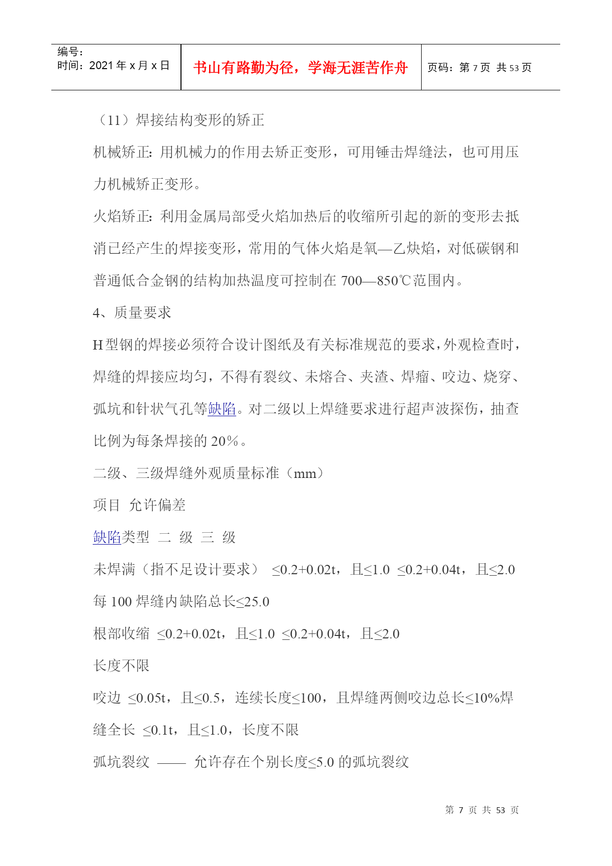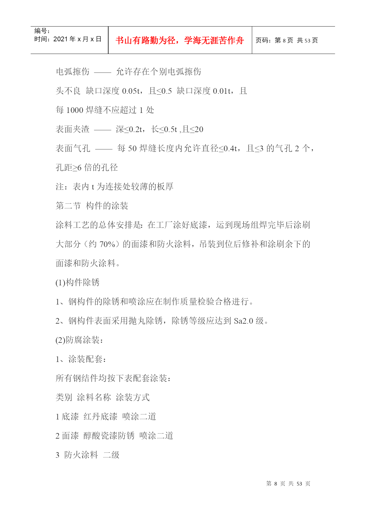 编号:时间:2021年x月x日书山有路勤为径,学海无涯苦作舟页码:第PAGE53页共NUMPAGES53页第PAGE\*MERGEFORMAT53页共NUMPAGES\*MERGEFORMAT53页哦·第一章工程概况第一节建筑、结构概况XXXX飞行学院图书馆钢结构屋盖工程,包括1、2钢结构屋盖,1屋盖为钢框架结构,2屋盖为HYPERLINK"http://wiki.zhulong.com/baike/detail.asp?t=桁架"\t"_blank"桁架结构。钢框架结构系统为H型钢梁等组成(Q235B)。HYPERLINK"http://wiki.zhulong.com/baike/detail.asp?t=桁架"\t"_blank"桁架结构为碳素钢组成(Q235-Z-B)第二节工程重点、难点一、高标准的质量要求该工程的特殊性和业主的期望,决定了该工程严格的质量标准。如何通过严格的过程控制、程序控制和环节控制,把该工程建成为一流的产品,实现优良工程的质量目标,是本工程的核心任务。二、高标准的安装要求本工程总体是1号、2号的组合,安装方案至关重要我公司针对此特殊性制定两种施工方法用来结合施工现场选择。为了确保HYPERLINK"http://wiki.zhulong.com/baike/detail.asp?t=工程质量"\t"_blank"工程质量和能达到图纸设计的标准,我公司将组织一支强有力的熟练的专业化的施工队伍针对此项目施工。第二章施工准备第一节材料准备本工程的主要材料是H型钢梁、附件等。所有钢材进厂后先检查其材质证明书并按规范抽样复验,合格后方可使用。第二节技术准备1、钢结构工程中的焊接为特殊过程,应按《特殊过程控制程序》进行控制,施工前应进行焊接工艺评定和编制焊接作业指导书。2、施工前召集所有施工作业人员进行图纸学习和技术交底,核定各工种图纸间是否有矛盾,熟悉施工的验收规范、质量评定标准和技术操作规程。本工程设计、施工执行的规程、规范和标准有:《建筑结构HYPERLINK"http://wiki.zhulong.com/baike/detail.asp?t=荷载"\t"_blank"荷载规范》GB50009-2001《钢结构设计规范》GBJ50017-2003《混凝土结构设计规范》JB50010-2002《建筑抗震设计规范》GB50011-2001《门式HYPERLINK"http://wiki.zhulong.com/baike/detail.asp?t=刚架"\t"_blank"刚架轻型房屋结构技术规程》CECS102-2002《压型金属板设计施工规程》YBJ216-88《冷弯薄壁型钢结构技术规范》GBJ50018-2002《钢结构施工质量验收规范》GB50205-20013、施工程序钢结构施工程序流程图主要施工机械计划表序号名称数量型号1多头切割机H型钢组立机1台1台HG-1600IMZG-2×10002半自动小车切割机1台CG1-303CO2气体保护焊机1台NBC5005型材切割机2台FG400A6角向磨光机2台Φ1507立式钻床1台Q608经纬仪1套J39HYPERLINK"http://wiki.zhulong.com/baike/detail.asp?t=水准仪"\t"_blank"水准仪1套S210HYPERLINK"http://wiki.zhulong.com/baike/detail.asp?t=开孔"\t"_blank"开孔器1套11电动扭矩扳手6把12HYPERLINK"http://wiki.zhulong.com/baike/detail.asp?t=电焊机"\t"_blank"电焊机20台13倒链5套14手拉葫芦5套15烘干箱2个16配电柜2个17工具箱3个18卷扬机2个19气泵1台4、劳动力组合本工程劳动力组合见下表(编排依据工厂两班制制作,现场两个吊装作业班组)。施工作业人员组成工程负责人工程技术负责人工长技术员铆工焊工普工维护电工油漆涂料工53人1人2人1人2人5人20人15人2人5人第三章施测方案本项目工程施工测量执行《HYPERLINK"http://wiki.zhulong.com/baike/detail.asp?t=工程测量"\t"_blank"工程测量规范》GB50026-93。建筑区域控制点的建立以及建筑物、构筑物的定位、放线工作均应在建设单位现场监理监督指导下进行工作,单位工程定位放线工作完成后,应得到监理的检查认可,才能进行下一工序的施工。第一节建筑物控制网的建立根据建筑红线测设方格网的主轴线,埋设定位点。主轴线点位中误差不超过5cm,桩顶面高于地面设计HYPERLI