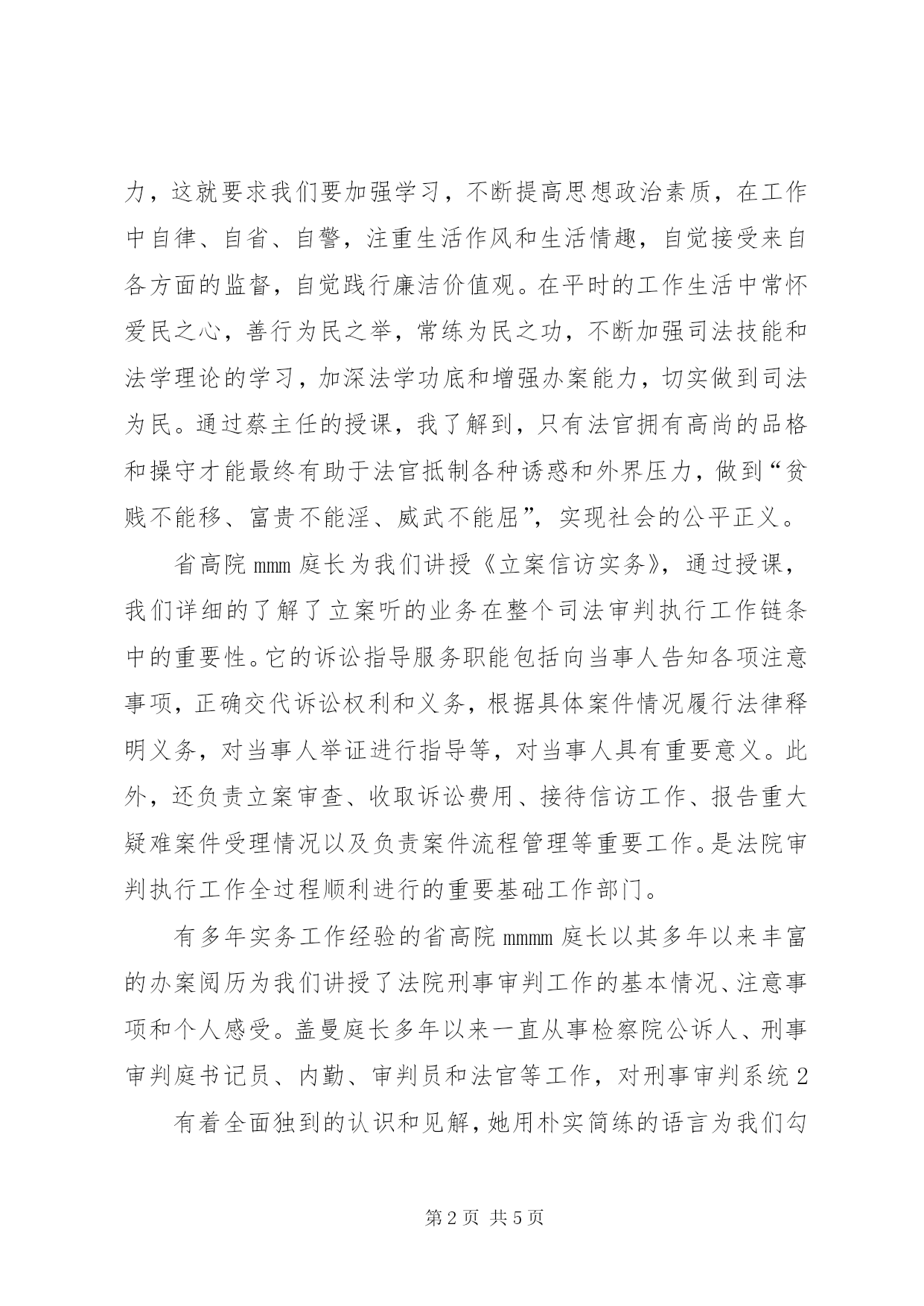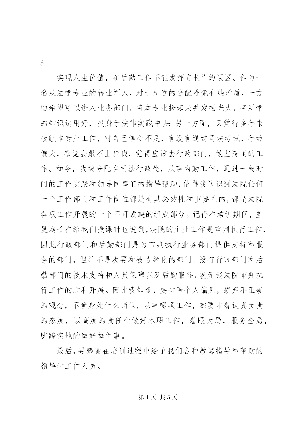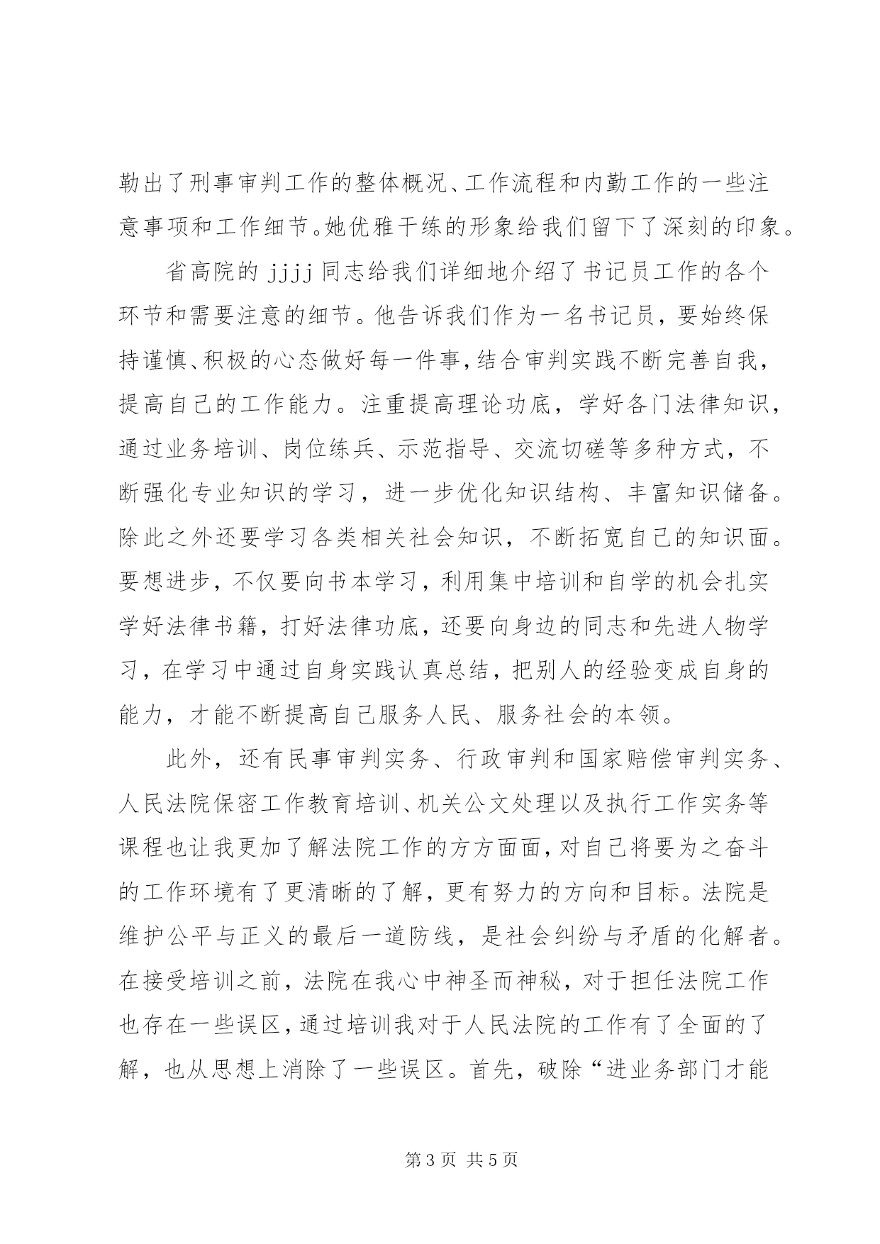 第PAGE\*Arabic\*MERGEFORMAT5页共NUMPAGES\*MERGEFORMAT5页法院新进公务员培训心得体会参加全省法院系统录用公务员培训班心得体会2014年2月mmm日,我有幸参加省法院系统录用公务员培训。对于刚从部队转业至法院工作仅3个月的我来说,这是一次难能可贵的学习交流的机会。虽说我是一名法学本科的毕业生,但十年的部队工作期间,运用到本专业的机会甚少,使得初到法院有种不可避免的茫然。因此,这次可以说是为迷途的我亮起了一盏航灯,为我指明道路。为期5天的培训紧凑充实,培训内容主要涉及法院工作的各个方面,让我收获良多,下面谈谈培训的心得体会。第一堂课由省高院mmm主任为我们讲授《社会主义法治理念与司法核心价值观》,mmm主任讲课风格沉稳,政治理论素养深厚。通过他深入浅出的讲解,我深刻领会到建立“公正、廉洁、为民”的司法核心价值观对法院工作人员是多么重要,这是关乎社会公平正义的重大课题。作为一名法院工作人员,一是要正确认识当前我国反腐倡廉形势;二是要反腐倡廉形势依然严峻和繁重;三是做一名模范执法廉洁的法官应该具备五种素质。法官的职责是庄严神圣的,但法官职业的庄严神圣,必须依靠法官的公正廉明作为保障,所谓“正人必先正己”。只有法官拥有高尚1的品格和操守才能最终有助于法官抵制各种诱惑和外界压力,这就要求我们要加强学习,不断提高思想政治素质,在工作中自律、自省、自警,注重生活作风和生活情趣,自觉接受来自各方面的监督,自觉践行廉洁价值观。在平时的工作生活中常怀爱民之心,善行为民之举,常练为民之功,不断加强司法技能和法学理论的学习,加深法学功底和增强办案能力,切实做到司法为民。通过蔡主任的授课,我了解到,只有法官拥有高尚的品格和操守才能最终有助于法官抵制各种诱惑和外界压力,做到“贫贱不能移、富贵不能淫、威武不能屈”,实现社会的公平正义。省高院mmm庭长为我们讲授《立案信访实务》,通过授课,我们详细的了解了立案听的业务在整个司法审判执行工作链条中的重要性。它的诉讼指导服务职能包括向当事人告知各项注意事项,正确交代诉讼权利和义务,根据具体案件情况履行法律释明义务,对当事人举证进行指导等,对当事人具有重要意义。此外,还负责立案审查、收取诉讼费用、接待信访工作、报告重大疑难案件受理情况以及负责案件流程管理等重要工作。是法院审判执行工作全过程顺利进行的重要基础工作部门。有多年实务工作经验的省高院mmmm庭长以其多年以来丰富的办案阅历为我们讲授了法院刑事审判工作的基本情况、注意事项和个人感受。盖曼庭长多年以来一直从事检察院公诉人、刑事审判庭书记员、内勤、审判员和法官等工作,对刑事审判系统2有着全面独到的认识和见解,她用朴实简练的语言为我们勾勒出了刑事审判工作的整体概况、工作流程和内勤工作的一些注意事项和工作细节。她优雅干练的形象给我们留下了深刻的印象。省高院的jjjj同志给我们详细地介绍了书记员工作的各个环节和需要注意的细节。他告诉我们作为一名书记员,要始终保持谨慎、积极的心态做好每一件事,结合审判实践不断完善自我,提高自己的工作能力。注重提高理论功底,学好各门法律知识,通过业务培训、岗位练兵、示范指导、交流切磋等多种方式,不断强化专业知识的学习,进一步优化知识结构、丰富知识储备。除此之外还要学习各类相关社会知识,不断拓宽自己的知识面。要想进步,不仅要向书本学习,利用集中培训和自学的机会扎实学好法律书籍,打好法律功底,还要向身边的同志和先进人物学习,在学习中通过自身实践认真总结,把别人的经验变成自身的能力,才能不断提高自己服务人民、服务社会的本领。此外,还有民事审判实务、行政审判和国家赔偿审判实务、人民法院保密工作教育培训、机关公文处理以及执行工作实务等课程也让我更加了解法院工作的方方面面,对自己将要为之奋斗的工作环境有了更清晰的了解,更有努力的方向和目标。法院是维护公平与正义的最后一道防线,是社会纠纷与矛盾的化解者。在接受培训之前,法院在我心中神圣而神秘,对于担任法院工作也存在一些误区,通过培训我对于人民法院的工作有了全面的了解,也从思想上消除了一些误区。首先,破除“进业务部门才能3实现人生价值,在后勤工作不能发挥专长”的误区。作为一名从法学专业的转业军人,对于岗位的分配难免有些矛盾,一方面希望可以进入业务部门,将本专业捡起来并发扬光大,将所学的知识运用好,投身于法律实践中去;另一方面,又觉得多年未接触本专业工作,对自己信心不足,有没有通过司法考试,年龄偏大,感觉会跟不上步伐,觉得应该去行政部门,做些清闲的工作。如今,我被分配在司法行政处,从事内勤工作,通过一段时间的工作实践和领导同事们的指导帮助,使得我认识到法院任何一个工作部门和工作岗位都是有其必然性和重要性的,都是法院各项工作开展的一个不可或缺