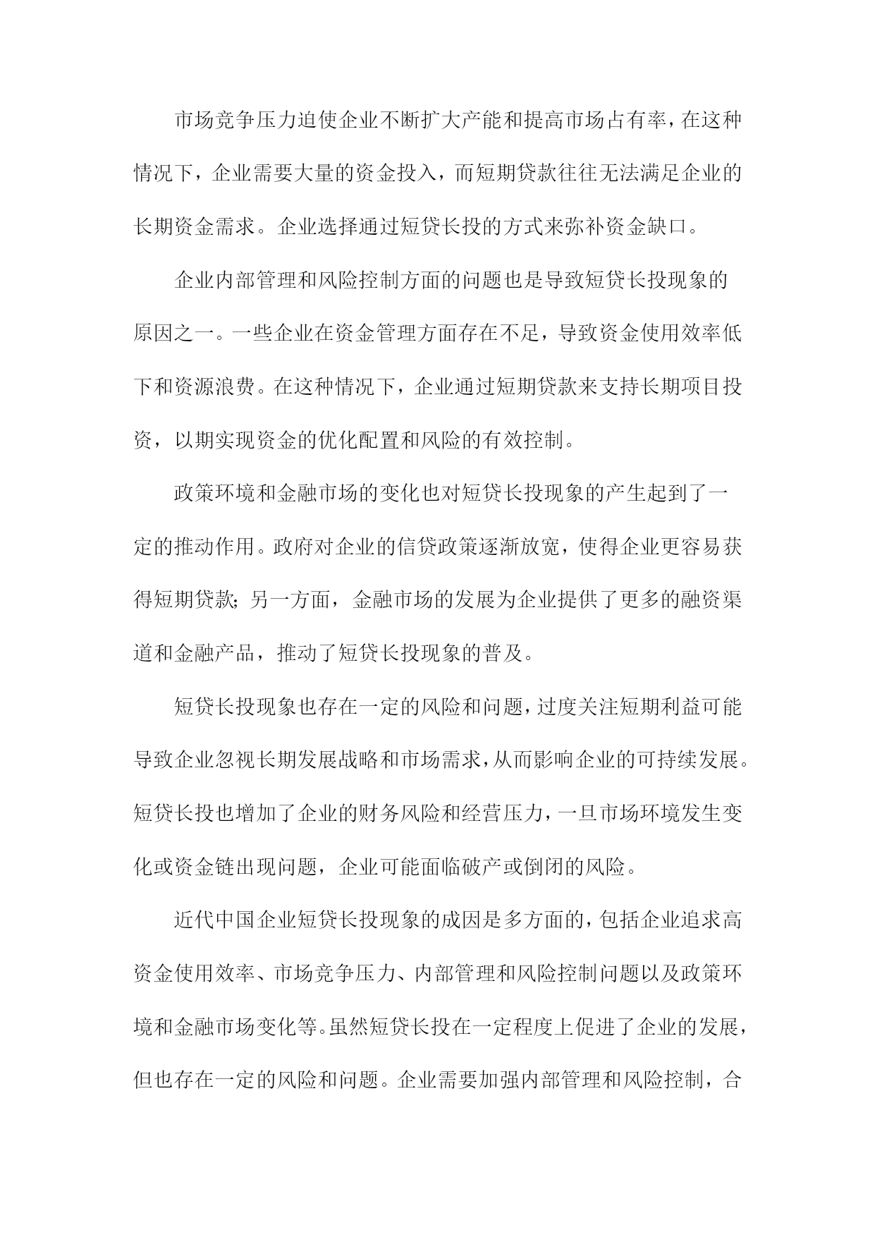 近代中国企业短贷长投现象探析目录一、内容综述................................................21.近代企业概述..........................................32.研究背景与意义........................................4二、近代中国企业短贷长投现象界定............................51.短贷长投定义及特点....................................62.短贷长投的成因分析....................................7三、近代中国企业短贷长投现象的发展历程......................91.起源阶段.............................................102.发展阶段.............................................113.成熟阶段.............................................12四、近代中国企业短贷长投现象的案例分析.....................141.案例一...............................................152.案例二...............................................163.案例三...............................................17五、近代中国企业短贷长投现象的影响.........................181.对企业自身的影响.....................................192.对金融市场的影响.....................................203.对政策制定者的启示...................................21六、结论与建议.............................................221.研究结论概述.........................................232.政策建议.............................................24一、内容综述近代中国企业短贷长投现象,是指企业在短期内通过短期贷款来满足其资金需求,同时长期投资于某一项目或产业,以期望获得稳定的回报。这种现象在近代中国经济发展过程中尤为普遍,不仅涉及国有企业,也涉及到许多民营企业和外资企业。本文将对这一现象进行深入探讨,分析其产生的原因、影响以及可能的解决方案。我们要了解短贷长投现象背后的动机,企业可能由于市场竞争激烈、政策调整、产业结构调整等因素,需要短期内筹集大量资金来应对经营风险或者抓住市场机遇。这些企业往往对未来的市场环境和行业趋势把握不够准确,因此选择了长期投资的方式来获取稳定的收益。这种做法虽然在一定程度上可以缓解企业的资金压力,但也存在较高的风险和不确定性。我们要探讨如何解决短贷长投现象带来的问题,政府可以通过制定相关政策和法规,引导企业合理规划资金使用,避免过度依赖短期贷款和盲目扩大投资。企业也需要加强内部管理,提高风险意识和市场判断能力,确保资金的合理使用和有效配置。金融机构也可以通过优化信贷政策,为实体经济提供更加稳健的金融服务。近代中国企业短贷长投现象是一个复杂而重要的经济现象,我们需要从多个角度进行分析和研究,以便更好地理解其背后的动机、影响以及可能的解决方案。1.近代企业概述进入近代以来,中国企业在面对经济全球化及国内外复杂多变的经济环境的双重挑战下,取得了长足的发展。这些企业在经营模式、资本运作、产业转型等方面不断探索和创新。在这样一个时代背景下,企业普遍面临资金周转的问题,而短贷长投现象正是其中一个引人注目的经济现象。本章节旨在对近代中国企业的发展背景进行概述,为后续探讨短贷长投现象提供背景基础。近代中国的企业大多经历了从计划经济时代向市场经济时代的转型过程,在这一过程中,企业的经营模式、资金来源及投资策略逐渐与市场机制相适应。特别是随着金融市场的逐步开放和深化,企业的融资渠道逐渐拓宽,融资方式也日益多样化。企业在资金运用方面出现了一些值得关注的现象,短贷长投便是其中之一。由于项目投资周期、市场不确定性等因素的影响,许多企业不得不采取短期贷款用于长期投资的方式,以应对资金周转的压力。这种现象对于企业的运营发展具