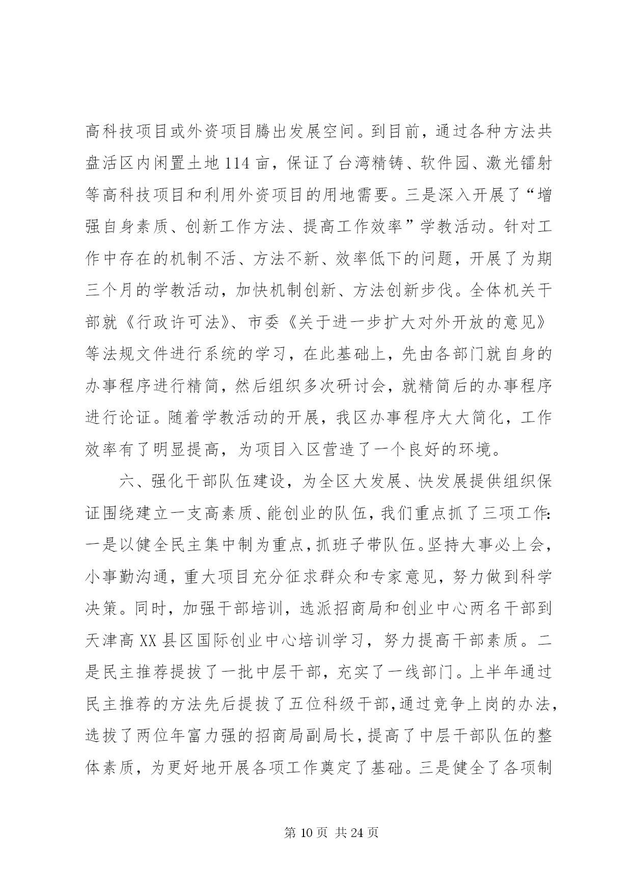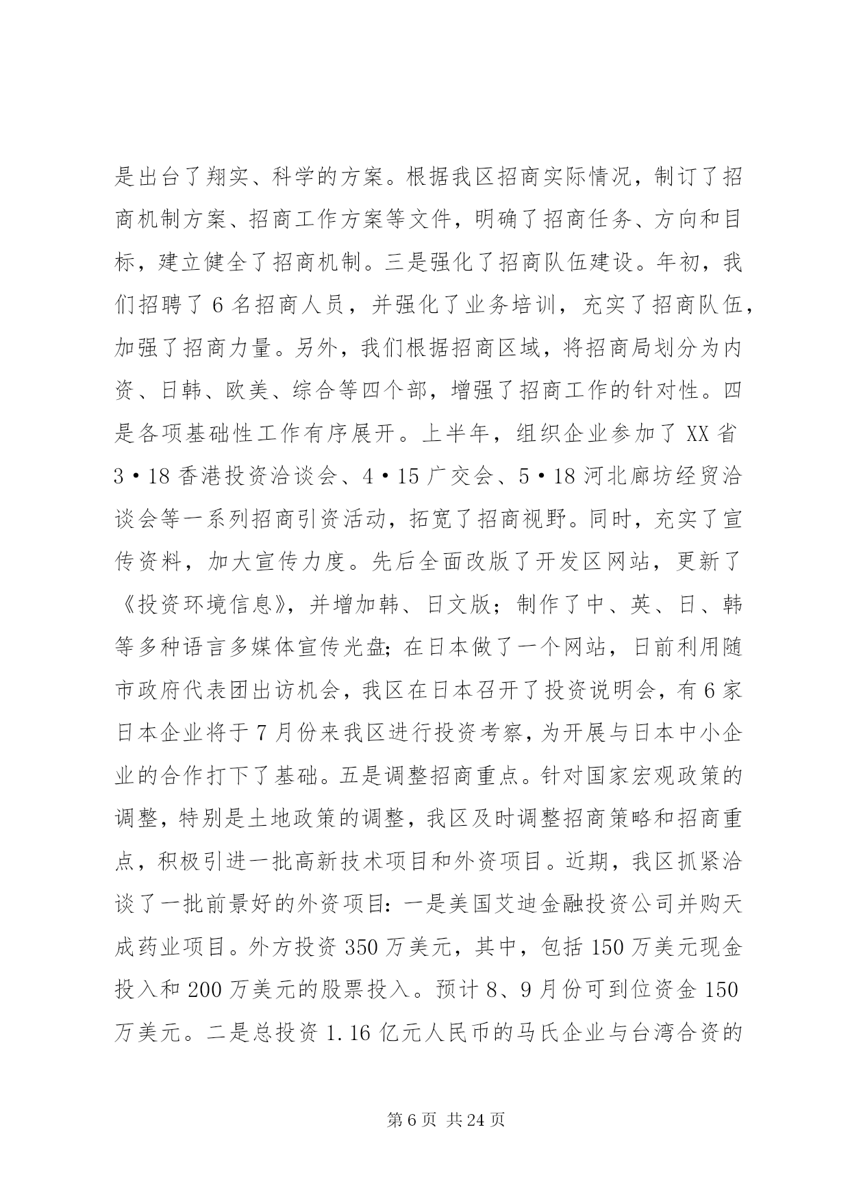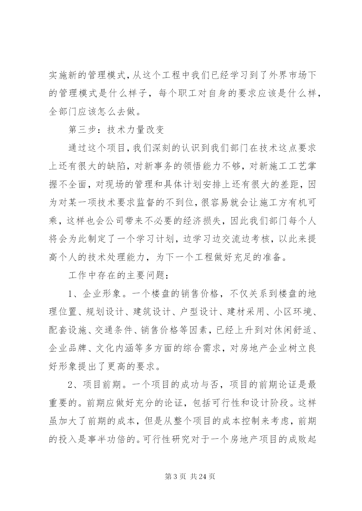 第PAGE\*Arabic\*MERGEFORMAT24页共NUMPAGES\*MERGEFORMAT24页开发工作总结4篇即将过去了,转眼间又将跨过一个年度之坎,回首这一年,内心不禁感慨万千,,虽没有轰轰烈烈的战果,但也算经历了一段不平凡的考验和磨砺。非常感谢相关领导给我这个成长的平台,令我在工作中不断的学习、不断的进步,慢慢的提升自身的素质与才能。回首这一年,我走过人生很重要的一个阶段,使我懂得了很多,领导给予了我很多的支持与关爱,在此我向相关领导及各位同事表示最衷心的感谢,有你们的协助才能使我在工作中更加的得心应手,也因为有你们的帮助,才能令到公司的发展更上一个台阶。本人主管的部门是工程技术部,绝大部分精力用在了项目的工作上,工作范围广、任务重、责任大。较好地履行了作为行政职务和作为专业技术职务的职责,发挥了领导管理和组织协调能力,调动了广大员工的工作积极性,较好地完成了所主管的全年工作任务。现就本人一年中所主管的工作总结汇报如下:一、生产任务完成情况:2、在项目的建设中深刻的体会到一个国有企业下的子公司要在现有的市场经济制度下生存并发展,我们还有很多东西要学习、要改变,在公司成立十个月来,工程技术部门也肩负的巨大的挑战,此项目是公司的成长项目也是形象项目,我们部门在施工中必须要更加努力和细心,具体心得如下:第一步:思想观念改变:国有企业有其特定的生存环境,有其独特事务处理方式,但是对于我们部门在对外的施工中还仍然保持以往的高姿态、高调子、以自己为中心的思想,那么我们将遭受到市场经济的淘汰,现行的市场经济奉行的是公平竞争和抓住机遇再加勤奋、实干,目前我们正一步步走向这个区域,我们就要意识到在这个区域生存的条件是什么。该怎么样去做才能生存,不能再依赖于以往的旧思想、旧观念、旧的模式去衡量我们现在新的生存环境,我们必须要有这样的思想转变,只有转变了这种观念和思想我们才会有更好的发挥空间,通过项目二年多的现场施工管理我们也认识到了思想转变的盲目和空白,因此下一个工程开始之前,我们就要先给自己的思想定一个位置,这也是我们部门在逐步努力向前转变的第一步。第二步:管理模式改变俗话说。国有国法,家有家规。我们工程部门的来说,管理的好与坏直接影响到公司的经济利益。在此项目中仍然存在老管理模式,与此同时新的管理模式的加入也在逐步取代旧的管理模式,毕竟此项目是我们公司从成立以来最大的、直接面向市场的项目,无论从思想转变还是到管理模式的改变和加强对于我们来说都需要一个过程,我们会在这个过程中认真学习和改变并逐步实施新的管理模式,从这个工程中我们已经学习到了外界市场下的管理模式是什么样子,每个职工对自身的要求应该是什么样,全部门应该怎么去做。第三步:技术力量改变通过这个项目,我们深刻的认识到我们部门在技术这点要求上还有很大的缺陷,对新事务的领悟能力不够,对新施工工艺掌握不全面,对现场的管理和具体计划安排上还有很大的差距,因为对某一项技术要求监督的不到位,很容易就会让施工方有机可乘,这样也会公司带来不必要的经济损失,因此我们部门每个人将会为此制定了一个学习计划,边学习边交流边考核,以此来提高个人的技术处理能力,为下一个工程做好充足的准备。工作中存在的主要问题:1、企业形象。一个楼盘的销售价格,不仅关系到楼盘的地理位置、规划设计、建筑设计、户型设计、建材采用、小区环境、配套设施、交通条件、销售价格等因素,已经上升到对休闲舒适、企业品牌、文化内涵等多方面的综合需求,对房地产企业树立良好形象提出了更高的要求。2、项目前期。一个项目的成功与否,项目的前期论证是最重要的。前期应做好充分的论证,包括可行性和设计阶段。这样虽加大了前期的成本,但是从整个项目的成本控制来考虑,前期的投入是事半功倍的。可行性研究对于一个房地产项目的成败起着关键的作用,此项目虽然做了也是流于形式,都是靠感觉去上项目,这是非常危险的。虽然现在可以说此项目基本成功了,但对下一个项目我们应充分掌握消费者的心理,准确地估计市场的容量,制定好完美、可行的销售计划。另外在可行性阶段必须把资金的流量和销售计划做出来,这样就可尽量的减少开发者的现金投入,减少资金成本,让项目得于顺利进行下去。经济技术开发区上半年工作总结开发工作总结(2)|返回目录***经济技术开发区xx年上半年工作总结xx年以来,在市委、市政府的正确领导下,我们认真贯彻落实市委六届六次全会精神,突出超常规、跨越式发展这一主题,继续加大基础设施投入,不断拓宽招商思路,全面优化发展环境,全区经济和各项事业走上了健康的发展道路。上半年,***开发区实现国内生产总值2.87亿元,同比增长104.4%;工业销售收入5.9亿元,同比增长122.9%;引进内资4.6亿元,同比增长41.9%;出口创汇625万美元,同比增长