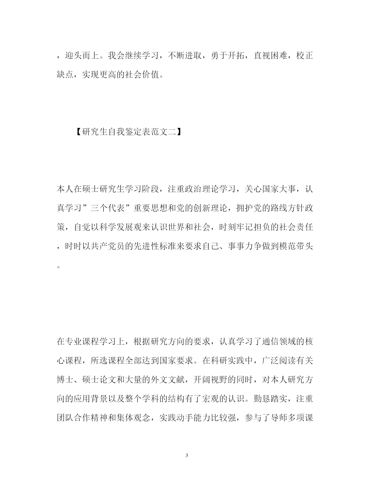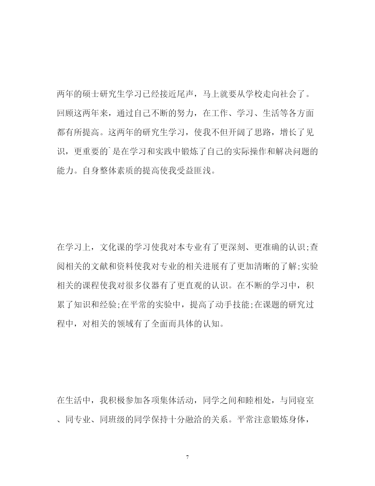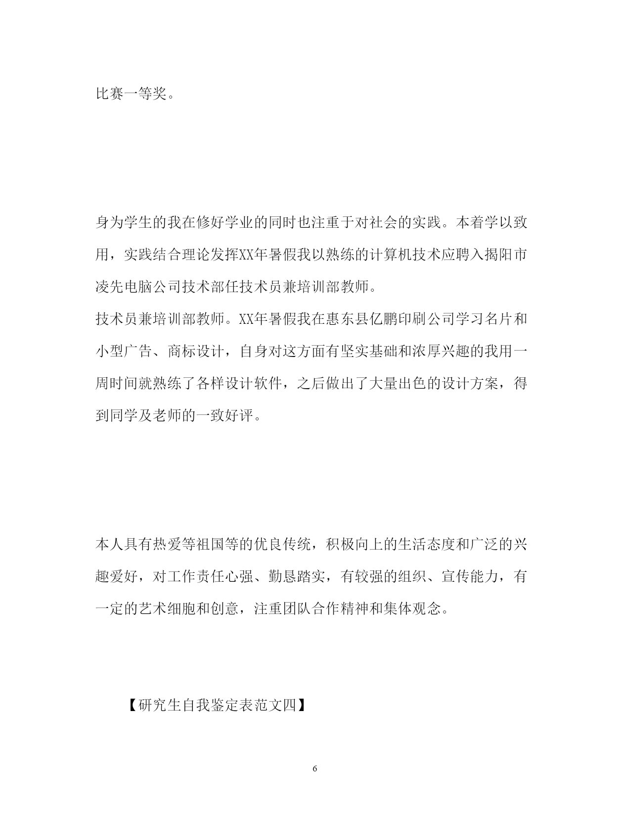 此资料由网络收集而来,如有侵权请告知上传者立即删除。资料共分享,我们负责传递知识。PAGEPAGE9最新研究生自我鉴定表最新研究生自我鉴定表范文自我鉴定时自己在学习、工作中的过程、成效进行评定。下面由小编为大家收集的4篇研究生自我鉴定表范文,仅供大家参考!【研究生自我鉴定表范文一】从本科毕业到走入研究生的教室,再由研究生的教育中走进社会,虽然短短几年,却是我人生中最大的财富,它将伴随着我的一生,渲染着我的思想,引导给我方向,传递给我力量。在进入研究生学习之前,我就暗自下定决心,要把握住任何机会锻炼自己,多积累实践经验和教训。思想上,我在本科期间已经成为了正式党员,于是在研究生学习期间不断帮助其他同学入党,无论是学习“三个代表”活动,还是党支部组织的趣味运动会,我都积极参与,争取为班争光,起表率带头作用。学习上,在LCF导师的教导下,深入研究了石家庄市科技局的基金项目——石家庄市企业自主创新能力建设研究,通过各位老师的帮助和自己的努力,项目进行有条不紊,指标设计有效,提出的对策建议切实可行。在此期间,我的学术研究水平得到了提高,经济学和管理学知识十分融洽地结合,达到了提高自我素质、深入社会实践的目的。在今后的社会生活中,会面临更大的挑战和机遇,我已经做好了准备,迎头而上。我会继续学习,不断进取,勇于开拓,直视困难,校正缺点,实现更高的社会价值。【研究生自我鉴定表范文二】本人在硕士研究生学习阶段,注重政治理论学习,关心国家大事,认真学习”三个代表”重要思想和党的创新理论,拥护党的路线方针政策,自觉以科学发展观来认识世界和社会,时刻牢记担负的社会责任,时时以共产党员的先进性标准来要求自己、事事力争做到模范带头。在专业课程学习上,根据研究方向的要求,认真学习了通信领域的核心课程,所选课程全部达到国家要求。在科研实践中,广泛阅读有关博士、硕士论文和大量的外文文献,开阔视野的同时,对本人研究方向的应用背景以及整个学科的结构有了宏观的认识。勤恳踏实,注重团队合作精神和集体观念,实践动手能力比较强,参与了导师多项课题的研究,使自己的理论知识与实践水平得到了进一步的增强和提高,同时顺利完成了硕士毕业论文。在平时生活中,为人处世和善热情,和同学关系融洽;积极参与班级各项集体活动,热情为同学们服务。在研究生阶段,从学业、科研工作,到个人素质,都得到了充分的培养和锻炼,是充实且有意义的两年。相信这些经历和积累都将成为本人人生道路上的宝贵财富。在以后的工作和学习中,本人将继续保持并发扬严谨治学的作风,兢兢业业,争取取得更大的成绩。【研究生自我鉴定表范文三】三年的大学校园生活是我人生的一大转折点。我于XX年9月以优异的成绩考入XX大学。四年的校园生涯和社会实践生活我不断的挑战自我、充实自己,为实现人生的价值打下坚实的基础。一直都认为人应该是活到老学到老的我对知识、对本专业一丝不苟,因而在成绩上一直都得到肯定,每学年都获得三等奖学金。在不满足于学好理论课的同时也注重于对各种应用软件和硬件的研究。因此在第四学期开始就被老师信任为计算机房的负责人。有广泛爱好的我特别擅长于排版及网页美工和多媒体的制作,就任本班组织委员的同时也加入了校学生会宣传部。对工作热情、任劳任怨,和部内成员团结一致,一年间我由部委升为部长。在任部长期间注重配合学校、学生会其它部门,出色的完成各项宣传工作,促使学校的各种运作更顺利的同时行。学校的各种活动都热情的参加,在XX年至XX年间获校文娱比赛及知识问答比赛等一等奖。大胆创新对校报版面进行改革,使得校报的受视率提高到一个层次。学校的各种活动都热情的参加,在XX年X月获校演讲比赛一等奖。身为学生的我在修好学业的同时也注重于对社会的实践。本着学以致用,实践结合理论发挥XX年暑假我以熟练的计算机技术应聘入揭阳市凌先电脑公司技术部任技术员兼培训部教师。技术员兼培训部教师。XX年暑假我在惠东县亿鹏印刷公司学习名片和小型广告、商标设计,自身对这方面有坚实基础和浓厚兴趣的我用一周时间就熟练了各样设计软件,之后做出了大量出色的设计方案,得到同学及老师的一致好评。本人具有热爱等祖国等的优良传统,积极向上的生活态度和广泛的兴趣爱好,对工作责任心强、勤恳踏实,有较强的组织、宣传能力,有一定的艺术细胞和创意,注重团队合作精神和集体观念。【研究生自我鉴定表范文四】两年的硕士研究生学习已经接近尾声,马上就要从学校走向社会了。回顾这两年来,通过自己不断的努力,在工作、学习、生活等各方面都有所提高。这两年的研究生学习,使我不但开阔了思路,增长了见识,更重要的`是在学习和实践中锻炼了自己的实际操作和解决问题的能力。自身整体素质的提高使我受益