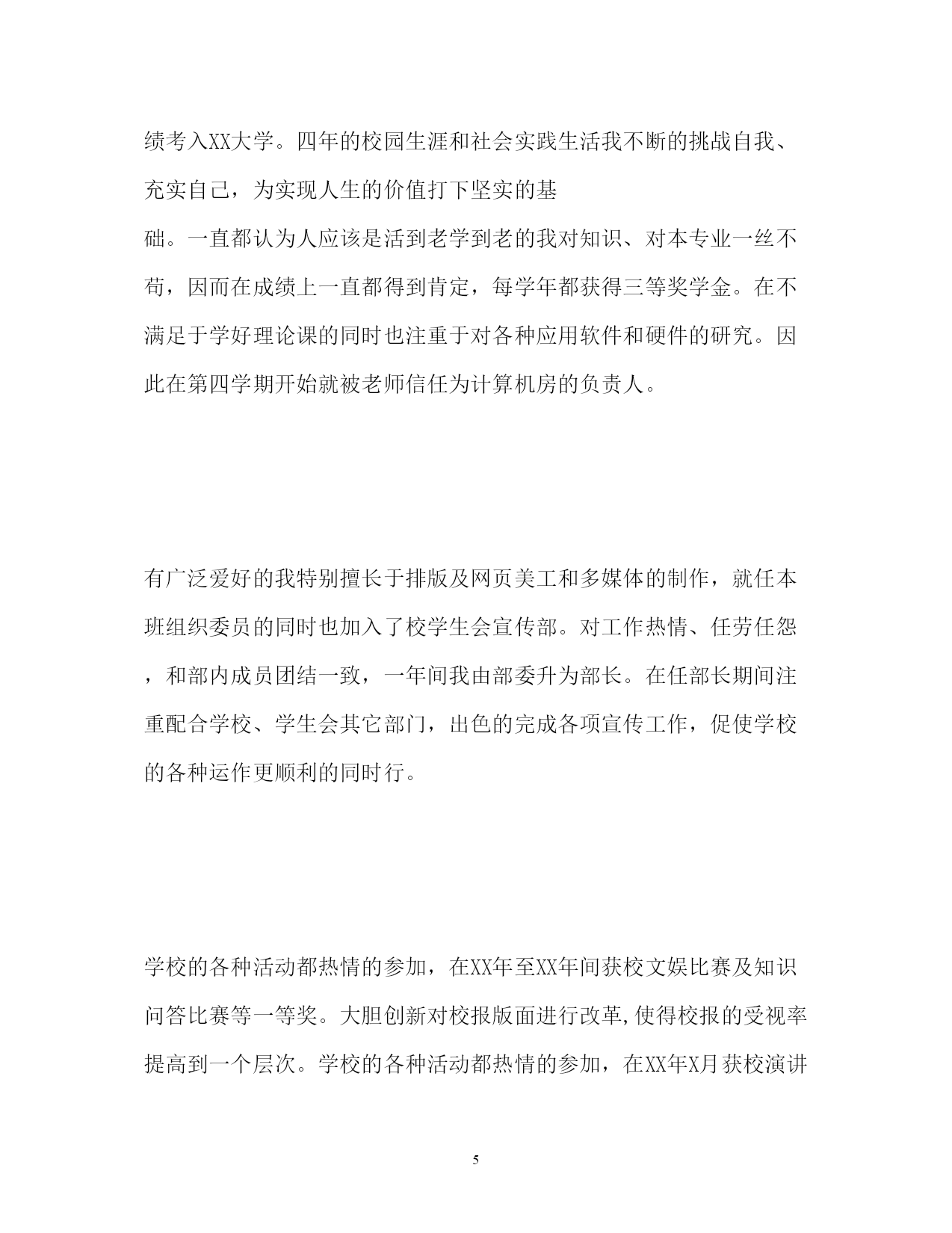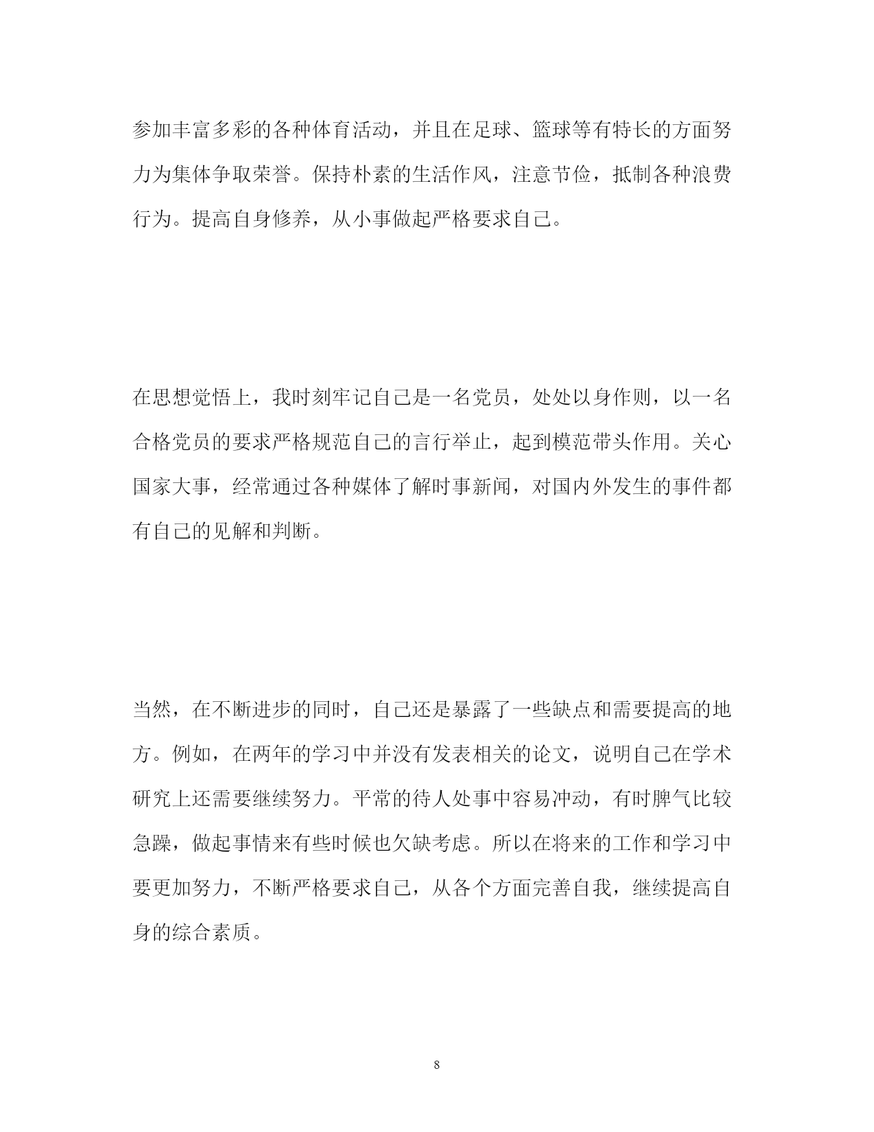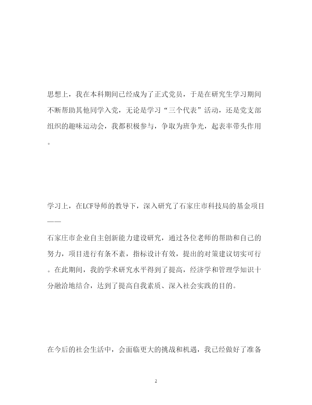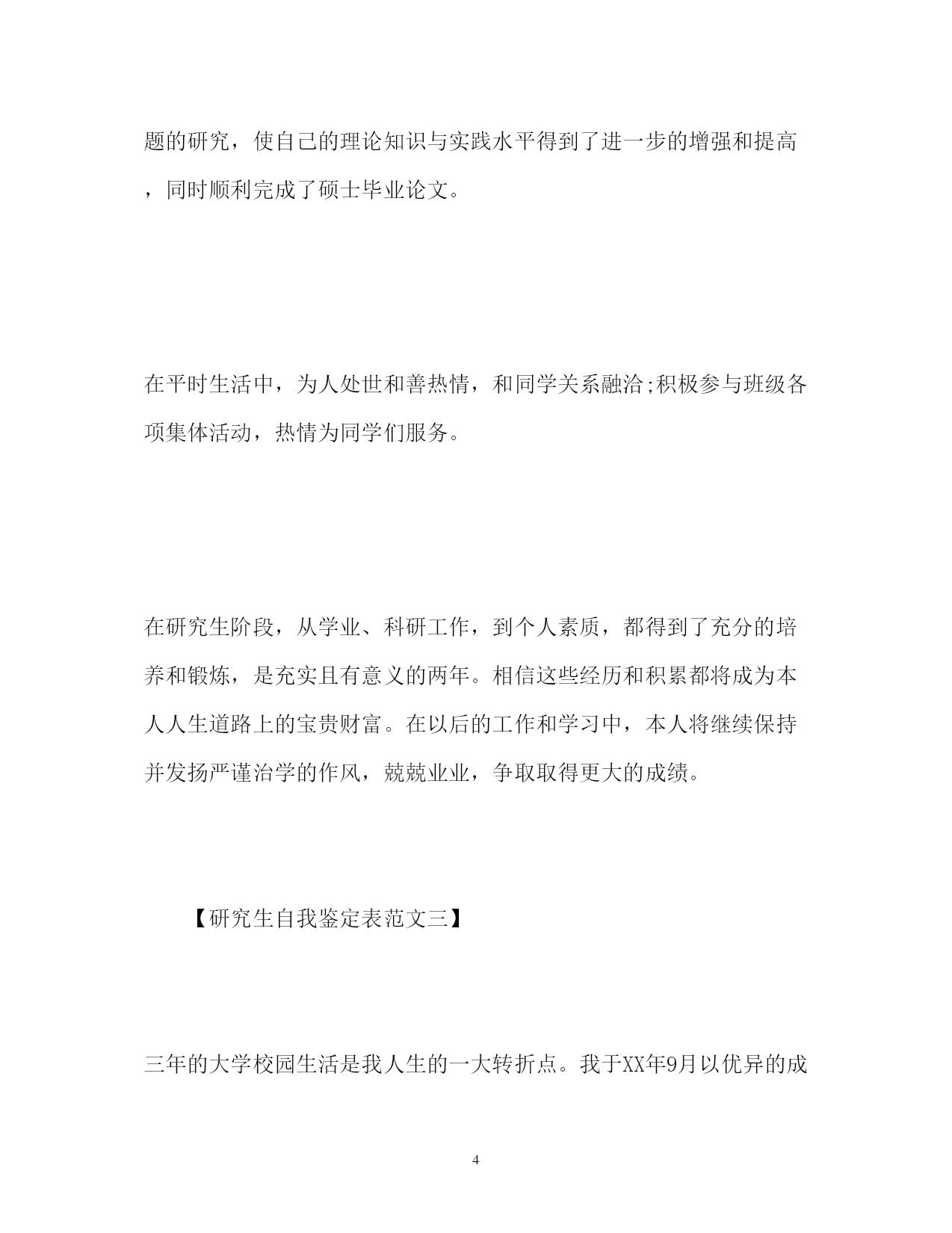 此资料由网络收集而来,如有侵权请告知上传者立即删除。资料共分享,我们负责传递知识。PAGEPAGE9最新研究生自我鉴定表最新研究生自我鉴定表范文自我鉴定时自己在学习、工作中的过程、成效进行评定。下面由小编为大家收集的4篇研究生自我鉴定表范文,仅供大家参考!【研究生自我鉴定表范文一】从本科毕业到走入研究生的教室,再由研究生的教育中走进社会,虽然短短几年,却是我人生中最大的财富,它将伴随着我的一生,渲染着我的思想,引导给我方向,传递给我力量。在进入研究生学习之前,我就暗自下定决心,要把握住任何机会锻炼自己,多积累实践经验和教训。思想上,我在本科期间已经成为了正式党员,于是在研究生学习期间不断帮助其他同学入党,无论是学习“三个代表”活动,还是党支部组织的趣味运动会,我都积极参与,争取为班争光,起表率带头作用。学习上,在LCF导师的教导下,深入研究了石家庄市科技局的基金项目——石家庄市企业自主创新能力建设研究,通过各位老师的帮助和自己的努力,项目进行有条不紊,指标设计有效,提出的对策建议切实可行。在此期间,我的学术研究水平得到了提高,经济学和管理学知识十分融洽地结合,达到了提高自我素质、深入社会实践的目的。在今后的社会生活中,会面临更大的挑战和机遇,我已经做好了准备,迎头而上。我会继续学习,不断进取,勇于开拓,直视困难,校正缺点,实现更高的社会价值。【研究生自我鉴定表范文二】本人在硕士研究生学习阶段,注重政治理论学习,关心国家大事,认真学习”三个代表”重要思想和党的创新理论,拥护党的路线方针政策,自觉以科学发展观来认识世界和社会,时刻牢记担负的社会责任,时时以共产党员的先进性标准来要求自己、事事力争做到模范带头。在专业课程学习上,根据研究方向的要求,认真学习了通信领域的核心课程,所选课程全部达到国家要求。在科研实践中,广泛阅读有关博士、硕士论文和大量的外文文献,开阔视野的同时,对本人研究方向的应用背景以及整个学科的结构有了宏观的认识。勤恳踏实,注重团队合作精神和集体观念,实践动手能力比较强,参与了导师多项课题的研究,使自己的理论知识与实践水平得到了进一步的增强和提高,同时顺利完成了硕士毕业论文。在平时生活中,为人处世和善热情,和同学关系融洽;积极参与班级各项集体活动,热情为同学们服务。在研究生阶段,从学业、科研工作,到个人素质,都得到了充分的培养和锻炼,是充实且有意义的两年。相信这些经历和积累都将成为本人人生道路上的宝贵财富。在以后的工作和学习中,本人将继续保持并发扬严谨治学的作风,兢兢业业,争取取得更大的成绩。【研究生自我鉴定表范文三】三年的大学校园生活是我人生的一大转折点。我于XX年9月以优异的成绩考入XX大学。四年的校园生涯和社会实践生活我不断的挑战自我、充实自己,为实现人生的价值打下坚实的基础。一直都认为人应该是活到老学到老的我对知识、对本专业一丝不苟,因而在成绩上一直都得到肯定,每学年都获得三等奖学金。在不满足于学好理论课的同时也注重于对各种应用软件和硬件的研究。因此在第四学期开始就被老师信任为计算机房的负责人。有广泛爱好的我特别擅长于排版及网页美工和多媒体的制作,就任本班组织委员的同时也加入了校学生会宣传部。对工作热情、任劳任怨,和部内成员团结一致,一年间我由部委升为部长。在任部长期间注重配合学校、学生会其它部门,出色的完成各项宣传工作,促使学校的各种运作更顺利的同时行。学校的各种活动都热情的参加,在XX年至XX年间获校文娱比赛及知识问答比赛等一等奖。大胆创新对校报版面进行改革,使得校报的受视率提高到一个层次。学校的各种活动都热情的参加,在XX年X月获校演讲比赛一等奖。身为学生的我在修好学业的同时也注重于对社会的实践。本着学以致用,实践结合理论发挥XX年暑假我以熟练的计算机技术应聘入揭阳市凌先电脑公司技术部任技术员兼培训部教师。技术员兼培训部教师。XX年暑假我在惠东县亿鹏印刷公司学习名片和小型广告、商标设计,自身对这方面有坚实基础和浓厚兴趣的我用一周时间就熟练了各样设计软件,之后做出了大量出色的设计方案,得到同学及老师的一致好评。本人具有热爱等祖国等的优良传统,积极向上的生活态度和广泛的兴趣爱好,对工作责任心强、勤恳踏实,有较强的组织、宣传能力,有一定的艺术细胞和创意,注重团队合作精神和集体观念。【研究生自我鉴定表范文四】两年的硕士研究生学习已经接近尾声,马上就要从学校走向社会了。回顾这两年来,通过自己不断的努力,在工作、学习、生活等各方面都有所提高。这两年的研究生学习,使我不但开阔了思路,增长了见识,更重要的`是在学习和实践中锻炼了自己的实际操作和解决问题的能力。自身整体素质的提高使我受益