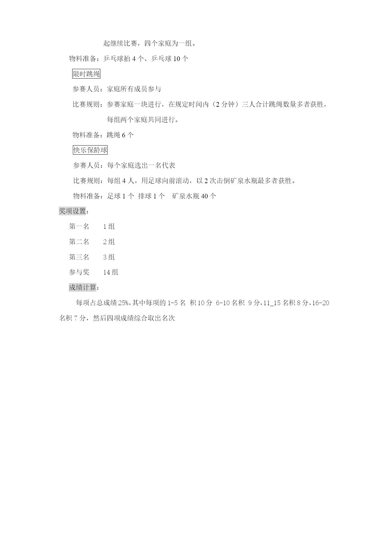 “迎奥运、鸿泰丰田杯”家庭趣味运动会活动时间:7月14日活动地点:鸿泰丰田展厅活动人数:限20个家庭,每个家庭限3人参加活动条件:比赛以家庭为单位,每个家庭3个成员,原则上以爸爸、妈妈和孩子组成。参加比赛人员需身体健康,年龄最大不超过40岁,最小不低于6岁。活动方式:销售顾问邀约客户到店项目设置:搭桥过河、运乒乓球接力赛跑、限时跳绳、快乐保龄球等比赛规则:见成绩计算办法竞赛项目:搭桥过河(配乐《待定》)参赛人数:每个家庭3人全部参与比赛规则:四个家庭为一组,每个家庭3人,小孩必须在垫子上跑,父母来回准备垫子,两个垫子之间不能有空隙,成绩以所有的时间为准。物料准备:垫子8个运乒乓球接力赛跑(配乐《冰河世纪》)参赛人数:每个家庭3人全部参与比赛规则:参赛人员手持乒乓球拍,上放乒乓球1枚,然后运球走,传至下一位,依次类推,运球至终点,按所用时间确定名次,如果中途气球掉下,必须原地捡起继续比赛,四个家庭为一组。物料准备:乒乓球拍4个、乒乓球10个限时跳绳参赛人员:家庭所有成员参与比赛规则:参赛家庭一块进行,在规定时间内(2分钟)三人合计跳绳数量多者获胜,每组两个家庭共同进行。物料准备:跳绳6个快乐保龄球参赛人员:每个家庭选出一名代表比赛规则:每组4人,用足球向前滚动,以2次击倒矿泉水瓶最多者获胜。物料准备:足球1个排球1个矿泉水瓶40个奖项设置:第一名1组第二名2组第三名3组参与奖14组成绩计算:每项占总成绩25%,其中每项的1-5名积10分6-10名积9分,11_15名积8分,16-20名积7分,然后四项成绩综合取出名次