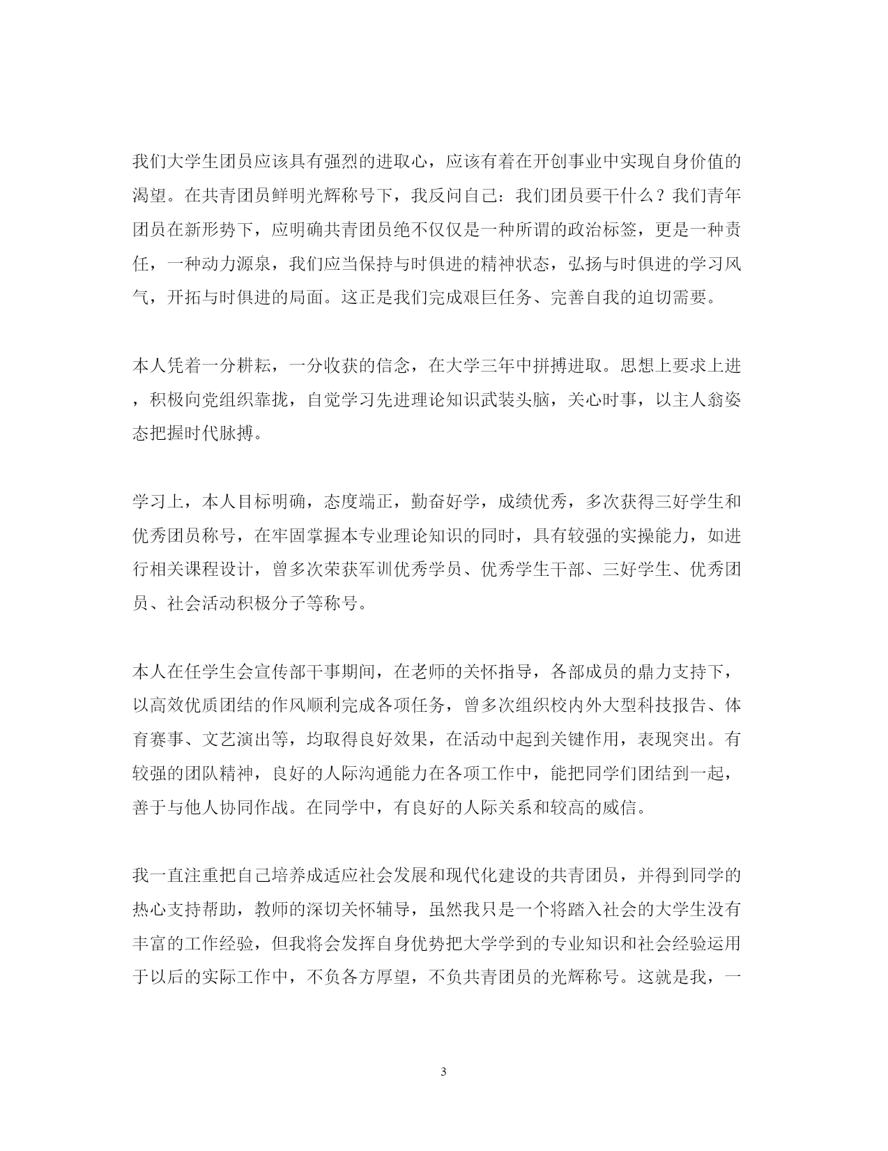 此资料由网络收集而来,如有侵权请告知上传者立即删除。资料共分享,我们负责传递知识。PAGEPAGE4研究生团员自我鉴定范文大全篇一自从入团到现在已经又x年了,在组织的关怀和帮组以及严格的监督下,我一路慢慢的长大,在学习、思想、工作,生活等方面都有很大的收获,如今我已经是一名大二的医学生,在繁忙的学习中,我与其他同学互相交流学习,并借鉴她人的学习经验,积极投入学习生活中,知道大学的学习生活是自主学习,勤奋、努力和拼搏精神,通过努力,在大一这一学年里我取得比较好的成绩工作上,我认真负责。作为一名班干我积极配合其他班团干组织班级各项活动和帮组同学,在担任班干期间,关心同学们的学习生活,并虚心接受老师的指导和倾听同学们的意见和建议。思想上,一直以一名团员的标准要求自己,积极参加组织的各项活动,在活动中学习。并按时缴纳团费。端正自己的思想,不断的学习来提高自己的思想觉悟。XX年4—6月参加了党校培训,学习了党的基本知识并在这两年来努力从各方面来完善自己。去年在同学们的支持下,成为了一名推优的入党的积极分子,现在正在发展为一名预备党员。生活上学会独立自主,我从我做起,管好自己并严格要求自己。内务整洁,生活俭朴,不铺张浪费。当然,每个人都会有缺点,我也是一样。但是,我会接受别人的建议,不断反省自己,尽量做到有错则改,无则加勉。努力在各个方面完善自己,相信,通过努力和付出,以后我可以做到更好。篇二一名名副其实的共青团员,应该始终能够做到脚踏实地、扎扎实实、一步一个脚印地按照团的章程严格要求自己,而决不能在团员条件上打折扣、自我放宽要求、降低标准、自欺欺人。在此,我还想说的是我们每一位大学生团员应该以党员的苛刻标准来规范自己的言与行。大学生是学习科学文化知识的大学生,也更应该是理论联系实际的大学生,我们只有把自己所学的知识融入到社会实践中去才能真正为祖国、为人类、为社会贡献自己的力量;大学生应始终坚持与人民群众站在一起,要始终做到一切为了群众,一切依靠群众,从群众中来,到群众中去的基本要求;大学生也是人民大众中普通的一员,难免会犯错误,但正如列宁同志所说:犯的错误并不可怕,而最怕的是犯了错误不去改正,由此我们每一位大学生更应该坚持批评与自我批评的优良作风;最重要的、也是最现实的是:我们大学生吃的、穿的、用的均来自我们的父母,由此我们不应与周围同学比吃、比穿、比用,我们更应该做的是发扬中华民族的优良传统艰苦奋斗。仔细回想如团的几年来,可以毫不客气的说我与模范团员还有一段差距。为了在以后的团员生涯中更好地履行团员义务,近阶段我也在不断的努力,试图来纠正自己以往与模范团员不相符的行为,效果当然是明显的。这次我们班团支部的保持团员先进性活动也正如一场及时雨,相信我在这次活动中一定会收获到我想要的东西。最后,我们每一位共青团员都应该做自己力所能及的事情,争取早日想党组织靠拢。篇三我们大学生团员应该具有强烈的进取心,应该有着在开创事业中实现自身价值的渴望。在共青团员鲜明光辉称号下,我反问自己:我们团员要干什么?我们青年团员在新形势下,应明确共青团员绝不仅仅是一种所谓的政治标签,更是一种责任,一种动力源泉,我们应当保持与时俱进的精神状态,弘扬与时俱进的学习风气,开拓与时俱进的局面。这正是我们完成艰巨任务、完善自我的迫切需要。本人凭着一分耕耘,一分收获的信念,在大学三年中拼搏进取。思想上要求上进,积极向党组织靠拢,自觉学习先进理论知识武装头脑,关心时事,以主人翁姿态把握时代脉搏。学习上,本人目标明确,态度端正,勤奋好学,成绩优秀,多次获得三好学生和优秀团员称号,在牢固掌握本专业理论知识的同时,具有较强的实操能力,如进行相关课程设计,曾多次荣获军训优秀学员、优秀学生干部、三好学生、优秀团员、社会活动积极分子等称号。本人在任学生会宣传部干事期间,在老师的关怀指导,各部成员的鼎力支持下,以高效优质团结的作风顺利完成各项任务,曾多次组织校内外大型科技报告、体育赛事、文艺演出等,均取得良好效果,在活动中起到关键作用,表现突出。有较强的团队精神,良好的人际沟通能力在各项工作中,能把同学们团结到一起,善于与他人协同作战。在同学中,有良好的人际关系和较高的威信。我一直注重把自己培养成适应社会发展和现代化建设的共青团员,并得到同学的热心支持帮助,教师的深切关怀辅导,虽然我只是一个将踏入社会的大学生没有丰富的工作经验,但我将会发挥自身优势把大学学到的专业知识和社会经验运用于以后的实际工作中,不负各方厚望,不负共青团员的光辉称号。这就是我,一个大学生团员的自我评价。