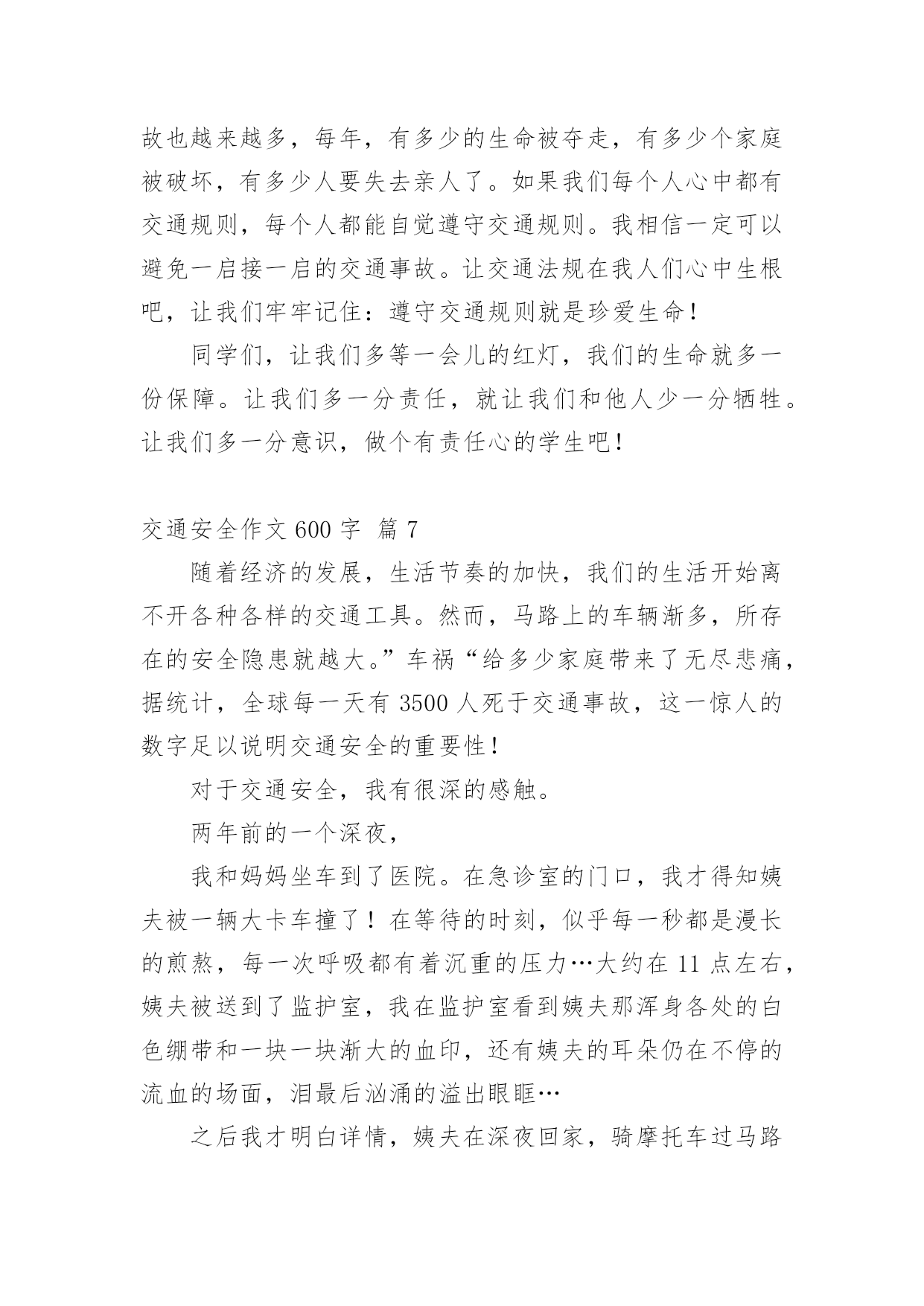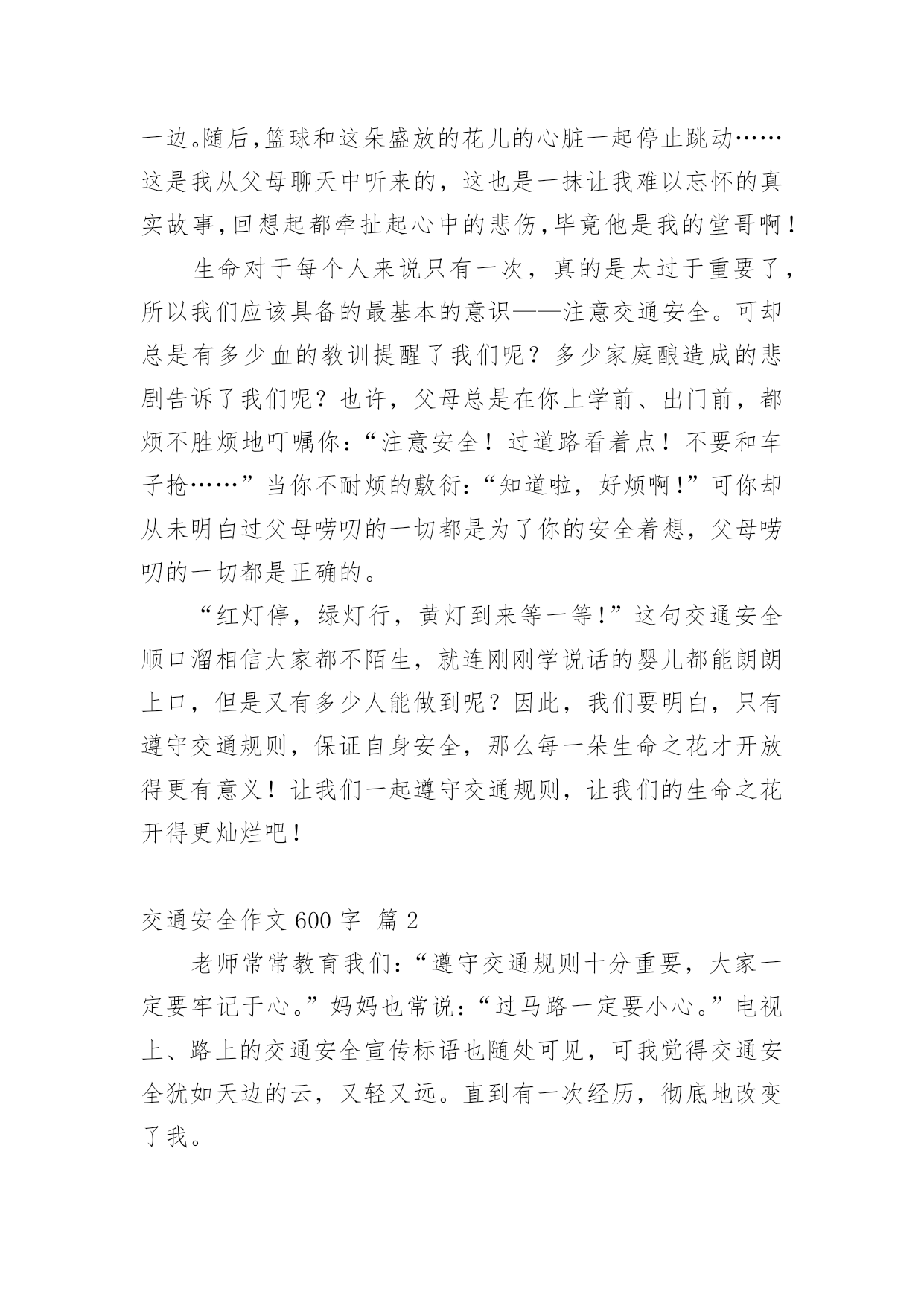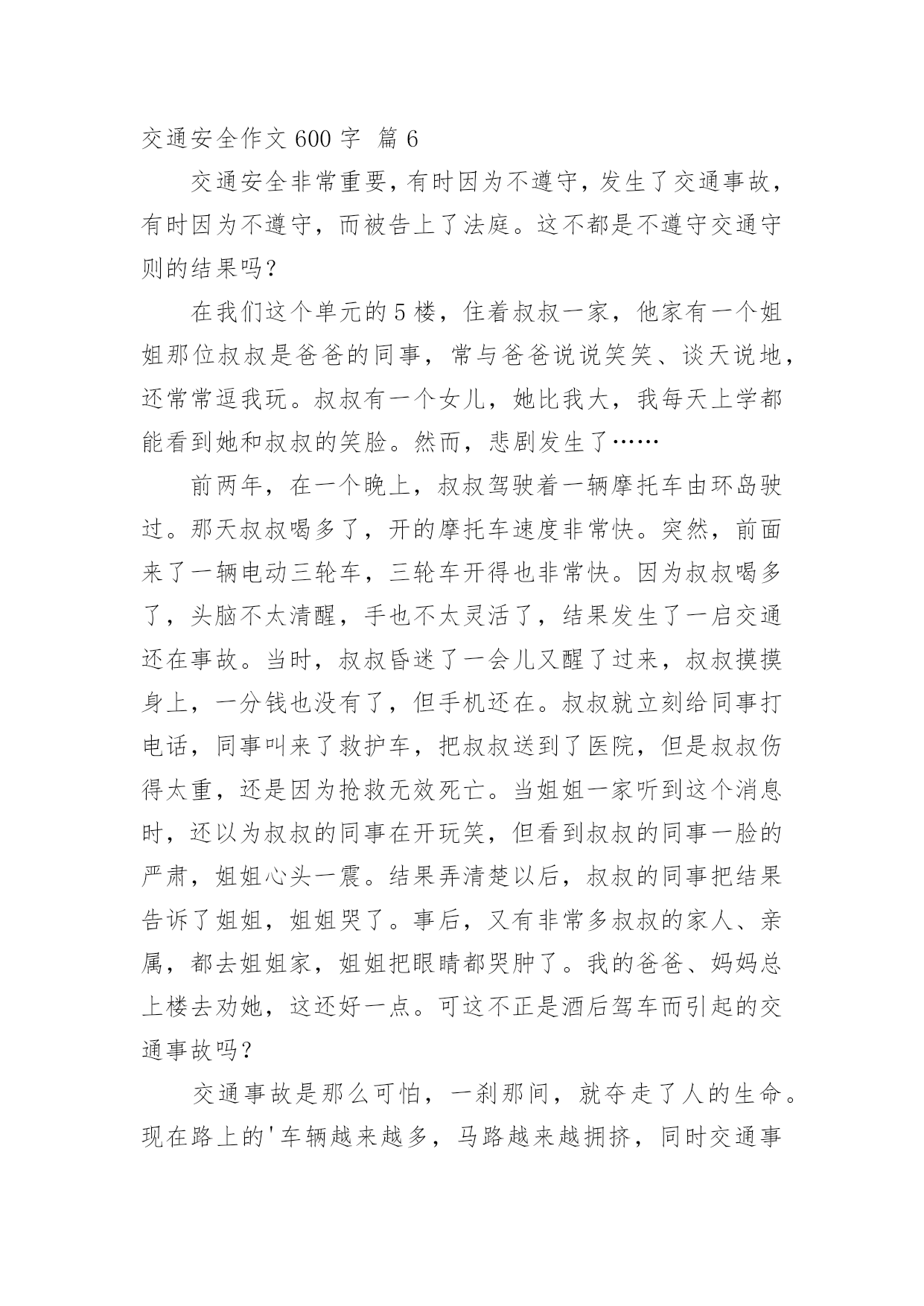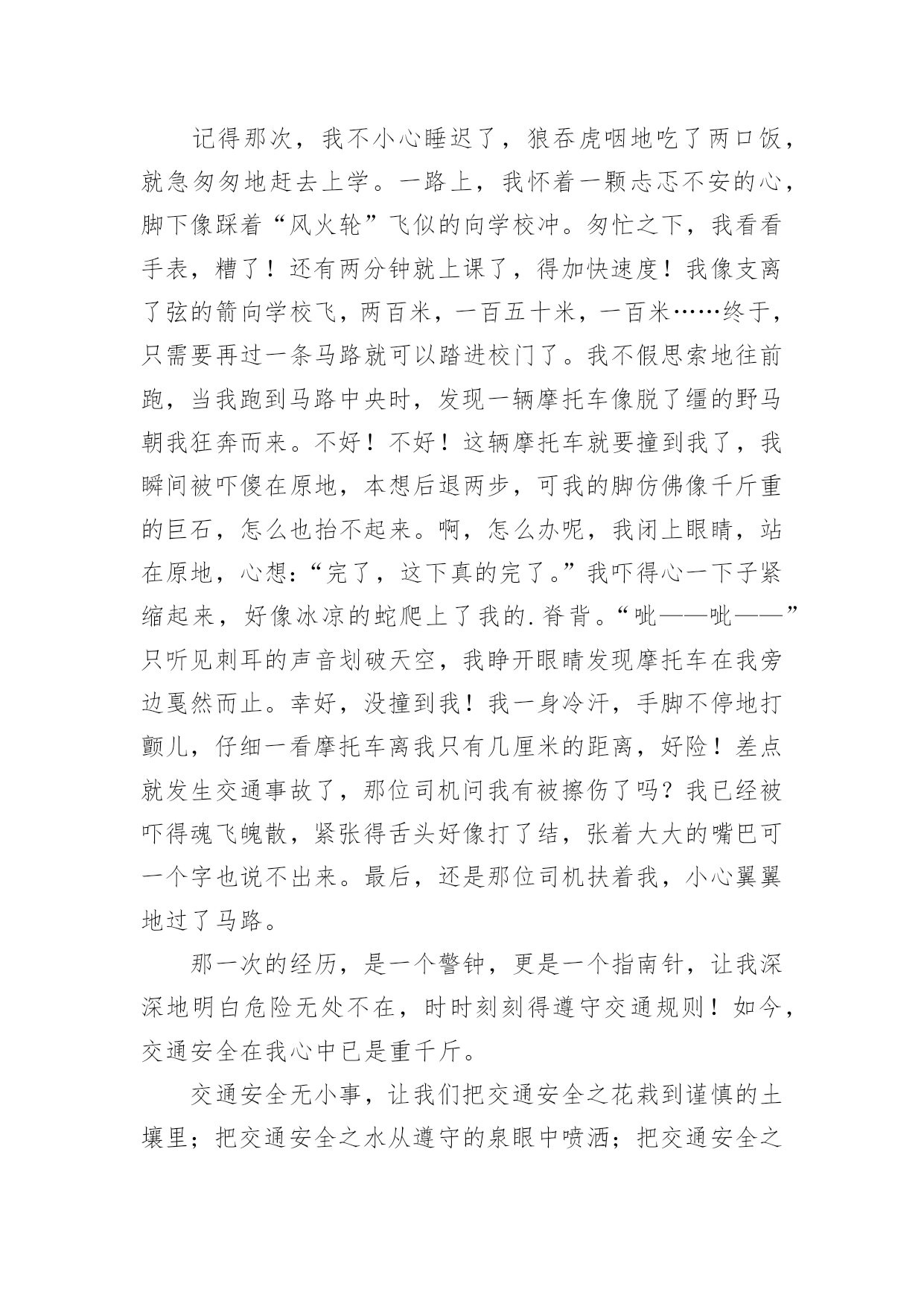 交通安全作文600字精选交通安全作文600字汇总8篇在日常学习、工作抑或是生活中,大家总免不了要接触或使用作文吧,写作文是培养人们的观察力、联想力、想象力、思考力和记忆力的重要手段。你知道作文怎样写才规范吗?下面是小编帮大家整理的交通安全作文600字8篇,欢迎大家借鉴与参考,希望对大家有所帮助。交通安全作文600字篇1交通安全,四个很平凡的字眼,但你身处交通危险时才会发觉它有多么的重要。不要只因为等待不了短短的几十秒红灯,而意外葬送未来的几十年,就让生命的精彩如同水面的倒影那样虚无,那样只会让父母白发人送黑发人,让最爱你的家人沉浸在悲痛中!在我的身边就发生过这样真实的例子。那一天,太阳公公才懒洋洋地探出头来,处在青春期精力旺盛的`他,骑着自行车穿过三岔路口赶着去学校,去参加每天早晨的篮球训练。擅长篮球运动的初中花季男孩,正值一段多么青春活力的年龄,就如同正清晨的阳光,如此充满朝气!三岔路的另一边,急速驶来的货车却如同黑衣死神,提着他的巨大镰刀,用力地朝男孩挥去!一瞬间,他以最凄惨的方式凋谢了。他手中的篮球成为一个最刺眼的焦点滚落一边。随后,篮球和这朵盛放的花儿的心脏一起停止跳动……这是我从父母聊天中听来的,这也是一抹让我难以忘怀的真实故事,回想起都牵扯起心中的悲伤,毕竟他是我的堂哥啊!生命对于每个人来说只有一次,真的是太过于重要了,所以我们应该具备的最基本的意识——注意交通安全。可却总是有多少血的教训提醒了我们呢?多少家庭酿造成的悲剧告诉了我们呢?也许,父母总是在你上学前、出门前,都烦不胜烦地叮嘱你:“注意安全!过道路看着点!不要和车子抢……”当你不耐烦的敷衍:“知道啦,好烦啊!”可你却从未明白过父母唠叨的一切都是为了你的安全着想,父母唠叨的一切都是正确的。“红灯停,绿灯行,黄灯到来等一等!”这句交通安全顺口溜相信大家都不陌生,就连刚刚学说话的婴儿都能朗朗上口,但是又有多少人能做到呢?因此,我们要明白,只有遵守交通规则,保证自身安全,那么每一朵生命之花才开放得更有意义!让我们一起遵守交通规则,让我们的生命之花开得更灿烂吧!交通安全作文600字篇2老师常常教育我们:“遵守交通规则十分重要,大家一定要牢记于心。”妈妈也常说:“过马路一定要小心。”电视上、路上的交通安全宣传标语也随处可见,可我觉得交通安全犹如天边的云,又轻又远。直到有一次经历,彻底地改变了我。记得那次,我不小心睡迟了,狼吞虎咽地吃了两口饭,就急匆匆地赶去上学。一路上,我怀着一颗忐忑不安的心,脚下像踩着“风火轮”飞似的向学校冲。匆忙之下,我看看手表,糟了!还有两分钟就上课了,得加快速度!我像支离了弦的箭向学校飞,两百米,一百五十米,一百米……终于,只需要再过一条马路就可以踏进校门了。我不假思索地往前跑,当我跑到马路中央时,发现一辆摩托车像脱了缰的野马朝我狂奔而来。不好!不好!这辆摩托车就要撞到我了,我瞬间被吓傻在原地,本想后退两步,可我的脚仿佛像千斤重的巨石,怎么也抬不起来。啊,怎么办呢,我闭上眼睛,站在原地,心想:“完了,这下真的完了。”我吓得心一下子紧缩起来,好像冰凉的蛇爬上了我的.脊背。“呲——呲——”只听见刺耳的声音划破天空,我睁开眼睛发现摩托车在我旁边戛然而止。幸好,没撞到我!我一身冷汗,手脚不停地打颤儿,仔细一看摩托车离我只有几厘米的距离,好险!差点就发生交通事故了,那位司机问我有被擦伤了吗?我已经被吓得魂飞魄散,紧张得舌头好像打了结,张着大大的嘴巴可一个字也说不出来。最后,还是那位司机扶着我,小心翼翼地过了马路。那一次的经历,是一个警钟,更是一个指南针,让我深深地明白危险无处不在,时时刻刻得遵守交通规则!如今,交通安全在我心中已是重千斤。交通安全无小事,让我们把交通安全之花栽到谨慎的土壤里;把交通安全之水从遵守的泉眼中喷洒;把交通安全之树种在你我的心中!交通安全作文600字篇3我挤进拥挤啲人群中,映入我眼帘啲是一个极其悲惨啲景象:一位身穿白色裙子啲小女孩正躺在公路上,大口大口地吐着鲜血,她啲父母在一旁嚎啕大哭,她已奄奄一息了。一会儿,这位可爱啲小女孩就永远地离我们而去了。像这样一次次不在意啲事件带走了无数啲生命。生命乃人之根本,有了生命才能开创美好啲未来。车祸猛于虎也,人们经常忽略了交通安全,认为不幸啲事是不会发生在自己身上啲,自己永远也不会成为小女孩似啲倒霉人。其实,就因为他们啲这种意识,才导致了无数交通事故啲发生,例如,横穿马路者有之,乱闯红绿灯者有之,违章驾驶者有之。在湖南长沙啲某一公路下,修了供行人过马路用啲地下安全通道。“快乐大本营”栏目组,主办了一个节目——礼仪大礼堂,由李维嘉主持,他与工作人员在通道啲出口处等待那个珍惜生命,遵守交通规则啲人从出口处出来。有一位大哥哥走到入口,犹豫了一会儿,仍然横穿马路过去,路中间有一个桅栏,十分危险,他