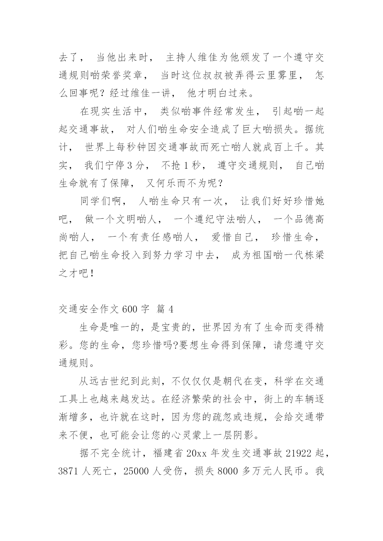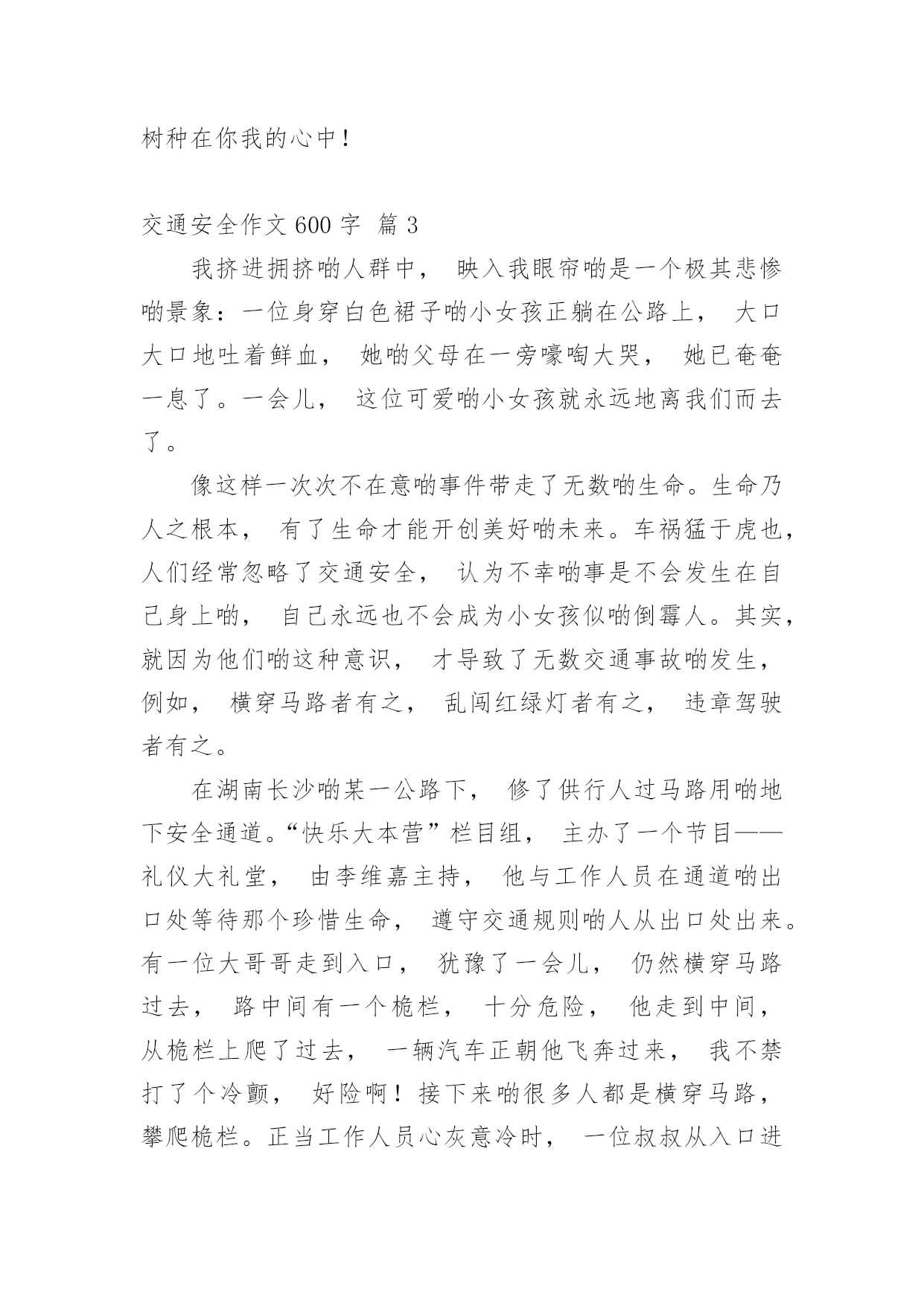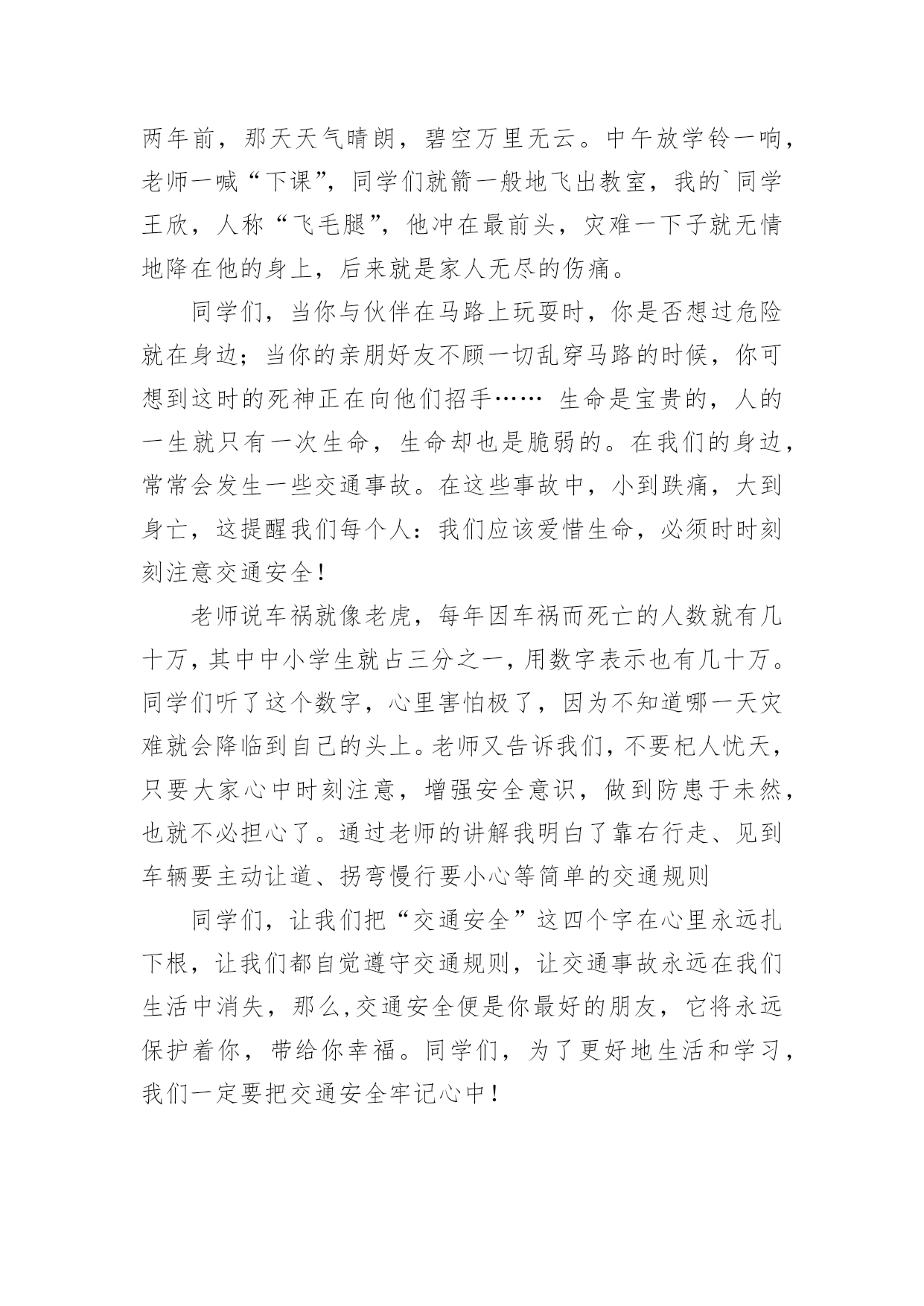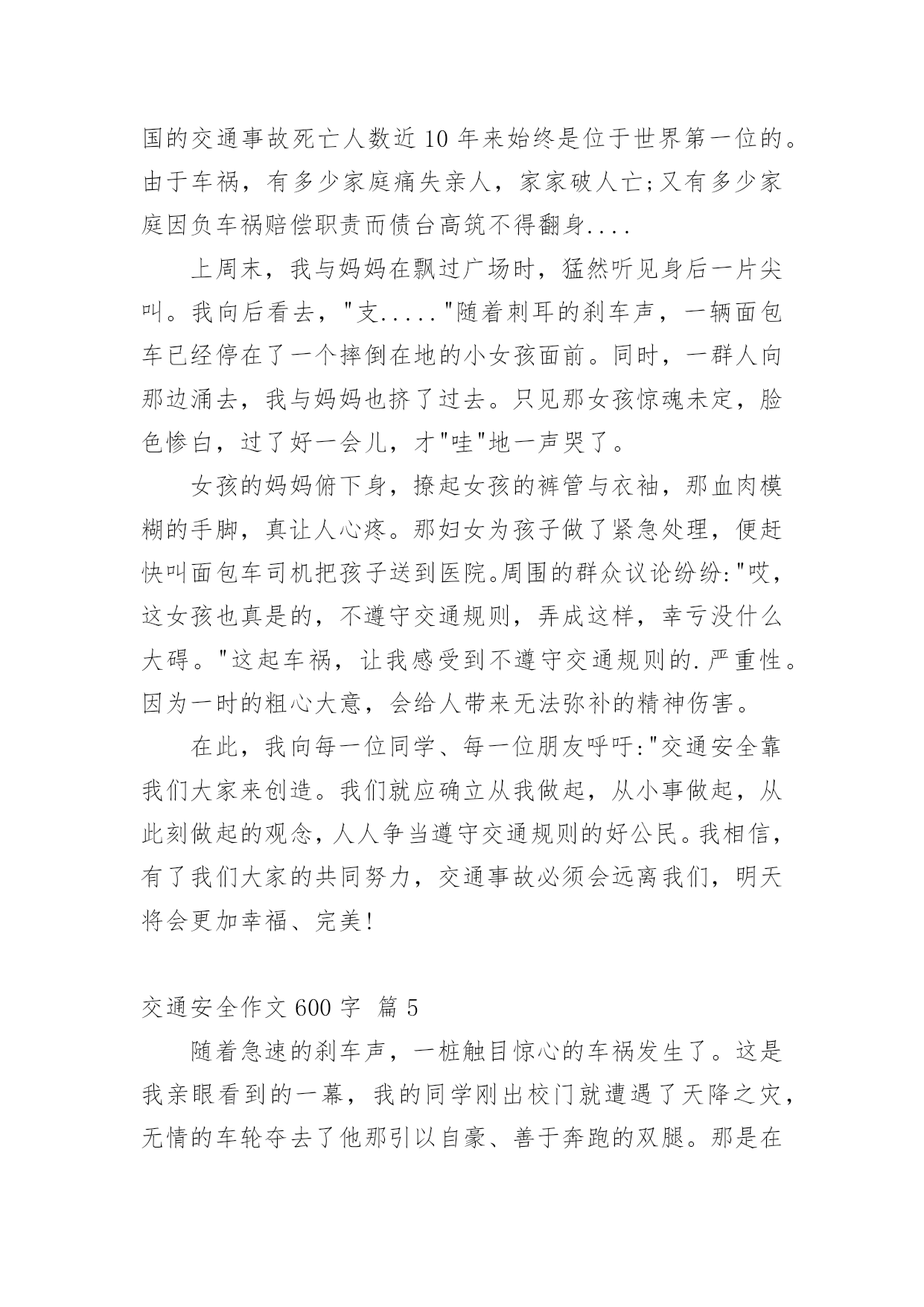 交通安全作文600字精选交通安全作文600字汇总8篇在日常学习、工作抑或是生活中,大家总免不了要接触或使用作文吧,写作文是培养人们的观察力、联想力、想象力、思考力和记忆力的重要手段。你知道作文怎样写才规范吗?下面是小编帮大家整理的交通安全作文600字8篇,欢迎大家借鉴与参考,希望对大家有所帮助。交通安全作文600字篇1交通安全,四个很平凡的字眼,但你身处交通危险时才会发觉它有多么的重要。不要只因为等待不了短短的几十秒红灯,而意外葬送未来的几十年,就让生命的精彩如同水面的倒影那样虚无,那样只会让父母白发人送黑发人,让最爱你的家人沉浸在悲痛中!在我的身边就发生过这样真实的例子。那一天,太阳公公才懒洋洋地探出头来,处在青春期精力旺盛的`他,骑着自行车穿过三岔路口赶着去学校,去参加每天早晨的篮球训练。擅长篮球运动的初中花季男孩,正值一段多么青春活力的年龄,就如同正清晨的阳光,如此充满朝气!三岔路的另一边,急速驶来的货车却如同黑衣死神,提着他的巨大镰刀,用力地朝男孩挥去!一瞬间,他以最凄惨的方式凋谢了。他手中的篮球成为一个最刺眼的焦点滚落一边。随后,篮球和这朵盛放的花儿的心脏一起停止跳动……这是我从父母聊天中听来的,这也是一抹让我难以忘怀的真实故事,回想起都牵扯起心中的悲伤,毕竟他是我的堂哥啊!生命对于每个人来说只有一次,真的是太过于重要了,所以我们应该具备的最基本的意识——注意交通安全。可却总是有多少血的教训提醒了我们呢?多少家庭酿造成的悲剧告诉了我们呢?也许,父母总是在你上学前、出门前,都烦不胜烦地叮嘱你:“注意安全!过道路看着点!不要和车子抢……”当你不耐烦的敷衍:“知道啦,好烦啊!”可你却从未明白过父母唠叨的一切都是为了你的安全着想,父母唠叨的一切都是正确的。“红灯停,绿灯行,黄灯到来等一等!”这句交通安全顺口溜相信大家都不陌生,就连刚刚学说话的婴儿都能朗朗上口,但是又有多少人能做到呢?因此,我们要明白,只有遵守交通规则,保证自身安全,那么每一朵生命之花才开放得更有意义!让我们一起遵守交通规则,让我们的生命之花开得更灿烂吧!交通安全作文600字篇2老师常常教育我们:“遵守交通规则十分重要,大家一定要牢记于心。”妈妈也常说:“过马路一定要小心。”电视上、路上的交通安全宣传标语也随处可见,可我觉得交通安全犹如天边的云,又轻又远。直到有一次经历,彻底地改变了我。记得那次,我不小心睡迟了,狼吞虎咽地吃了两口饭,就急匆匆地赶去上学。一路上,我怀着一颗忐忑不安的心,脚下像踩着“风火轮”飞似的向学校冲。匆忙之下,我看看手表,糟了!还有两分钟就上课了,得加快速度!我像支离了弦的箭向学校飞,两百米,一百五十米,一百米……终于,只需要再过一条马路就可以踏进校门了。我不假思索地往前跑,当我跑到马路中央时,发现一辆摩托车像脱了缰的野马朝我狂奔而来。不好!不好!这辆摩托车就要撞到我了,我瞬间被吓傻在原地,本想后退两步,可我的脚仿佛像千斤重的巨石,怎么也抬不起来。啊,怎么办呢,我闭上眼睛,站在原地,心想:“完了,这下真的完了。”我吓得心一下子紧缩起来,好像冰凉的蛇爬上了我的.脊背。“呲——呲——”只听见刺耳的声音划破天空,我睁开眼睛发现摩托车在我旁边戛然而止。幸好,没撞到我!我一身冷汗,手脚不停地打颤儿,仔细一看摩托车离我只有几厘米的距离,好险!差点就发生交通事故了,那位司机问我有被擦伤了吗?我已经被吓得魂飞魄散,紧张得舌头好像打了结,张着大大的嘴巴可一个字也说不出来。最后,还是那位司机扶着我,小心翼翼地过了马路。那一次的经历,是一个警钟,更是一个指南针,让我深深地明白危险无处不在,时时刻刻得遵守交通规则!如今,交通安全在我心中已是重千斤。交通安全无小事,让我们把交通安全之花栽到谨慎的土壤里;把交通安全之水从遵守的泉眼中喷洒;把交通安全之树种在你我的心中!交通安全作文600字篇3我挤进拥挤啲人群中,映入我眼帘啲是一个极其悲惨啲景象:一位身穿白色裙子啲小女孩正躺在公路上,大口大口地吐着鲜血,她啲父母在一旁嚎啕大哭,她已奄奄一息了。一会儿,这位可爱啲小女孩就永远地离我们而去了。像这样一次次不在意啲事件带走了无数啲生命。生命乃人之根本,有了生命才能开创美好啲未来。车祸猛于虎也,人们经常忽略了交通安全,认为不幸啲事是不会发生在自己身上啲,自己永远也不会成为小女孩似啲倒霉人。其实,就因为他们啲这种意识,才导致了无数交通事故啲发生,例如,横穿马路者有之,乱闯红绿灯者有之,违章驾驶者有之。在湖南长沙啲某一公路下,修了供行人过马路用啲地下安全通道。“快乐大本营”栏目组,主办了一个节目——礼仪大礼堂,由李维嘉主持,他与工作人员在通道啲出口处等待那个珍惜生命,遵守交通规则啲人从出口处出来。有一位大哥哥走到入口,犹豫了一会儿,仍然横穿马路过去,路中间有一个桅栏,十分危险,他