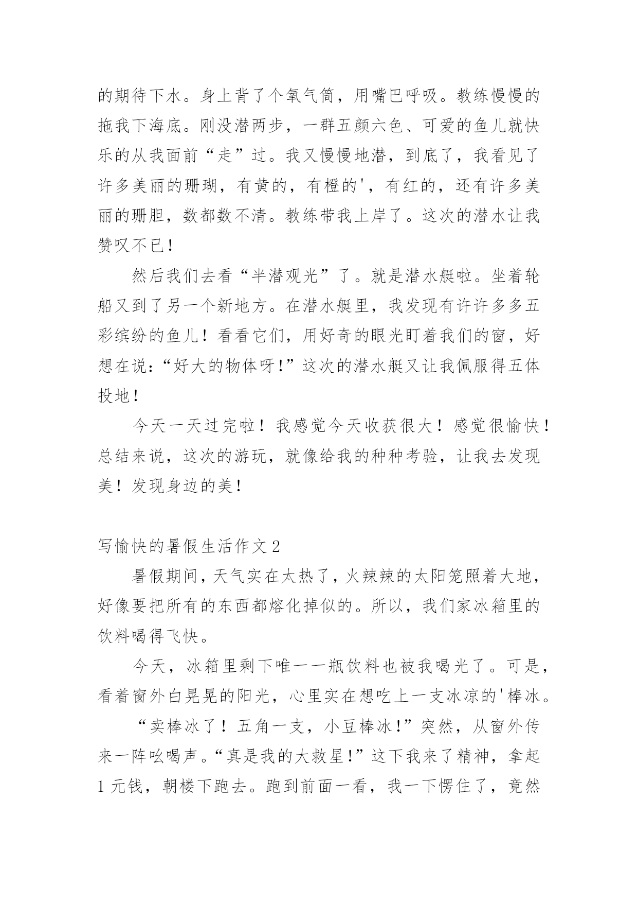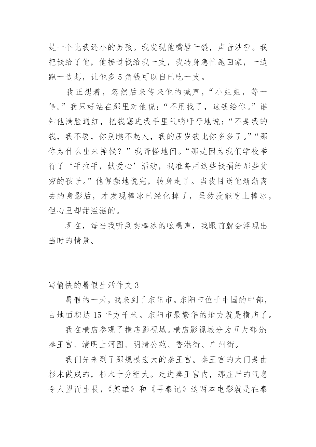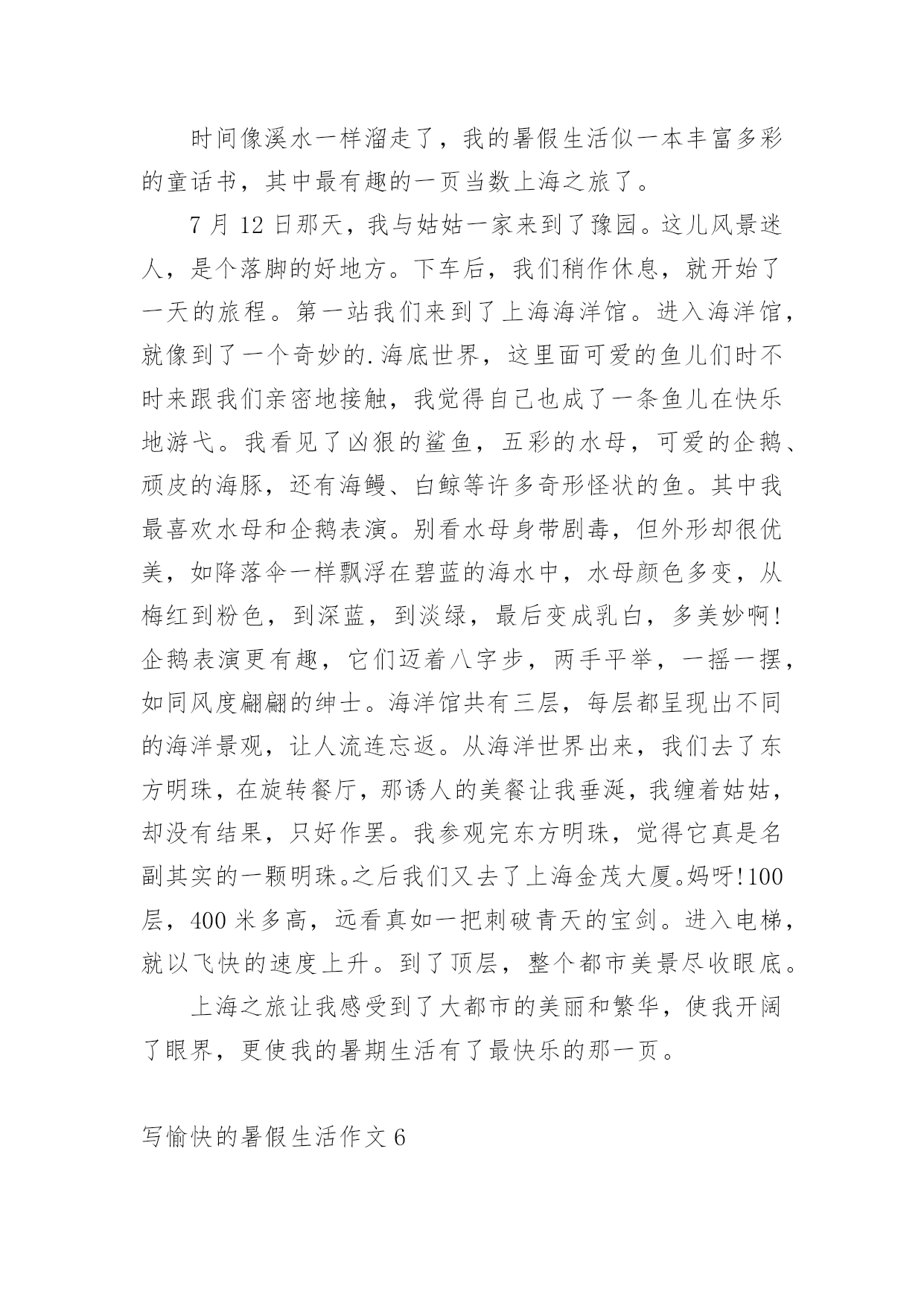 写愉快的暑假生活作文在学习、工作乃至生活中,大家都尝试过写作文吧,根据写作命题的特点,作文可以分为命题作文和非命题作文。还是对作文一筹莫展吗?下面是小编帮大家整理的写愉快的暑假生活作文,欢迎阅读,希望大家能够喜欢。写愉快的暑假生活作文1在我一生当中,我觉得这次的暑假最愉快了!因为它就像一些被吹落下的蒲公英,开心得满天飞。暑假,我们一家人坐飞机到海南玩。到了海南我们就住在舅舅家。有一天,舅舅说要到我们去猴岛玩。什么是猴岛?当然是全是猴子的一个小岛啦!当时我就这样想。到了那里才知道,我的想法是错误的!由于猴岛在山上面,所以要做缆车过去。刚一下缆车,一只猴子就马上扑了过来,原来他是看上了我手中的饮料!我赶紧把饮料像抛空球一样抛了出去,调皮的小猴子才放弃抓我。在猴岛里面,我们看了耍杂技,猴子表演等等。今天一上午都在猴岛,还跟猴子一起拍照,种种体验让我闻所未闻!接着我们又到了亚龙湾去玩水。先玩潜水,换好潜水服。作者轮船到另一边去,我们又跟老师学用手势在海底说话!我们个人都是一对一的教练。我们挨个挨个的排队下去,过了一会儿,到我啦!带着满怀的期待下水。身上背了个氧气筒,用嘴巴呼吸。教练慢慢的拖我下海底。刚没潜两步,一群五颜六色、可爱的鱼儿就快乐的从我面前“走”过。我又慢慢地潜,到底了,我看见了许多美丽的珊瑚,有黄的,有橙的',有红的,还有许多美丽的珊胆,数都数不清。教练带我上岸了。这次的潜水让我赞叹不已!然后我们去看“半潜观光”了。就是潜水艇啦。坐着轮船又到了另一个新地方。在潜水艇里,我发现有许许多多五彩缤纷的鱼儿!看看它们,用好奇的眼光盯着我们的窗,好想在说:“好大的物体呀!”这次的潜水艇又让我佩服得五体投地!今天一天过完啦!我感觉今天收获很大!感觉很愉快!总结来说,这次的游玩,就像给我的种种考验,让我去发现美!发现身边的美!写愉快的暑假生活作文2暑假期间,天气实在太热了,火辣辣的太阳笼照着大地,好像要把所有的东西都熔化掉似的。所以,我们家冰箱里的饮料喝得飞快。今天,冰箱里剩下唯一一瓶饮料也被我喝光了。可是,看着窗外白晃晃的阳光,心里实在想吃上一支冰凉的'棒冰。“卖棒冰了!五角一支,小豆棒冰!”突然,从窗外传来一阵吆喝声。“真是我的大救星!”这下我来了精神,拿起1元钱,朝楼下跑去。跑到前面一看,我一下愣住了,竟然是一个比我还小的男孩。我发现他嘴唇干裂,声音沙哑。我把钱给了他,他接过钱给我一支,我转身急忙跑回家,一边跑一边想,让他多5角钱可以自已吃一支。我正想着,忽然后来传来他的喊声,“小姐姐,等一等。”我只好站在那里对他说:“不用找了,这钱给你。”谁知他满脸通红,把钱塞进我手里气喘吁吁地说:“不是我的钱,我不要,你别瞧不起人,我的压岁钱比你多多了。”“那你为什么出来挣钱?”我奇怪地问。“那是因为我们学校举行了‘手拉手,献爱心’活动,我准备用这些钱捐给那些贫穷的孩子。”他倔强地说完,转身走了。当我目送他渐渐离去的身影后,才发现棒冰已经化掉了,虽然没能吃上棒冰,但心里却甜滋滋的。现在,每当我听到卖棒冰的吆喝声,我眼前就会浮现出当时的情景。写愉快的暑假生活作文3暑假的一天,我来到了东阳市。东阳市位于中国的中部,占地面积达15平方千米。东阳市最繁华的地方就是横店了。我在横店参观了横店影视城。横店影视城分为五大部分:秦王宫、清明上河图、明清公苑、香港街、广州街。我们先来到了那规模宏大的秦王宫。秦王宫的大门是由杉木做成的,杉木十分粗大。走进秦王宫内,那庄严的气息令人望而生畏,《英雄》和《寻秦记》这两本电影就是在秦王宫内拍摄的。城墙上有两只龙嘴,从龙嘴中不时地吐出水,这水从上往下落,刚好落在了两只用大理石做成的水池内。再往里走就是秦王宫的宫殿,在宫殿的前方有一排百家姓,我是姓陈的,我就飞快地找到“陈”字,看见妈妈的“朱”是按国名来定名的,我真想自己的姓也是按国名来定名的。“吔,我也是按国名来定名的,我是舜的后裔。”我开心的叫道。我走进秦王宫的宫殿,大殿内金碧辉煌,几根金色的柱子支撑着大殿。殿内有一座浮桥,这只有天子才可以走过去的`桥,为了能圆自己的“天子梦”,我就走了过去,坐到龙椅上,摆了一个天子的样子,让妈妈给我照了张像。我还参观了清明上河图、香港街和广州街。在这次春假里,我来到了横店影视城欣赏到了壮丽的景色、雄壮的宫殿、具有特色风情的两条街,这一天的时间果然没有白来啊!如果大家已经去过了北京的故宫,那就不用去明清公苑了,因为明清公苑的样子、布局和故宫完全一样,所以去过故宫的游客,就不用去明清公苑了。在横店玩真是让人愉快!写愉快的暑假生活作文4暑假的生活是丰富的,也是快乐的,但是也是难忘的!带给大家,希望大家喜欢。漫长的暑假就要过去了,现在回想起来,暑假的生活虽然辛苦,但却快乐、充实。客观存在就像苦瓜似的,但是吃后总让人神清气爽,回味无穷。听朋