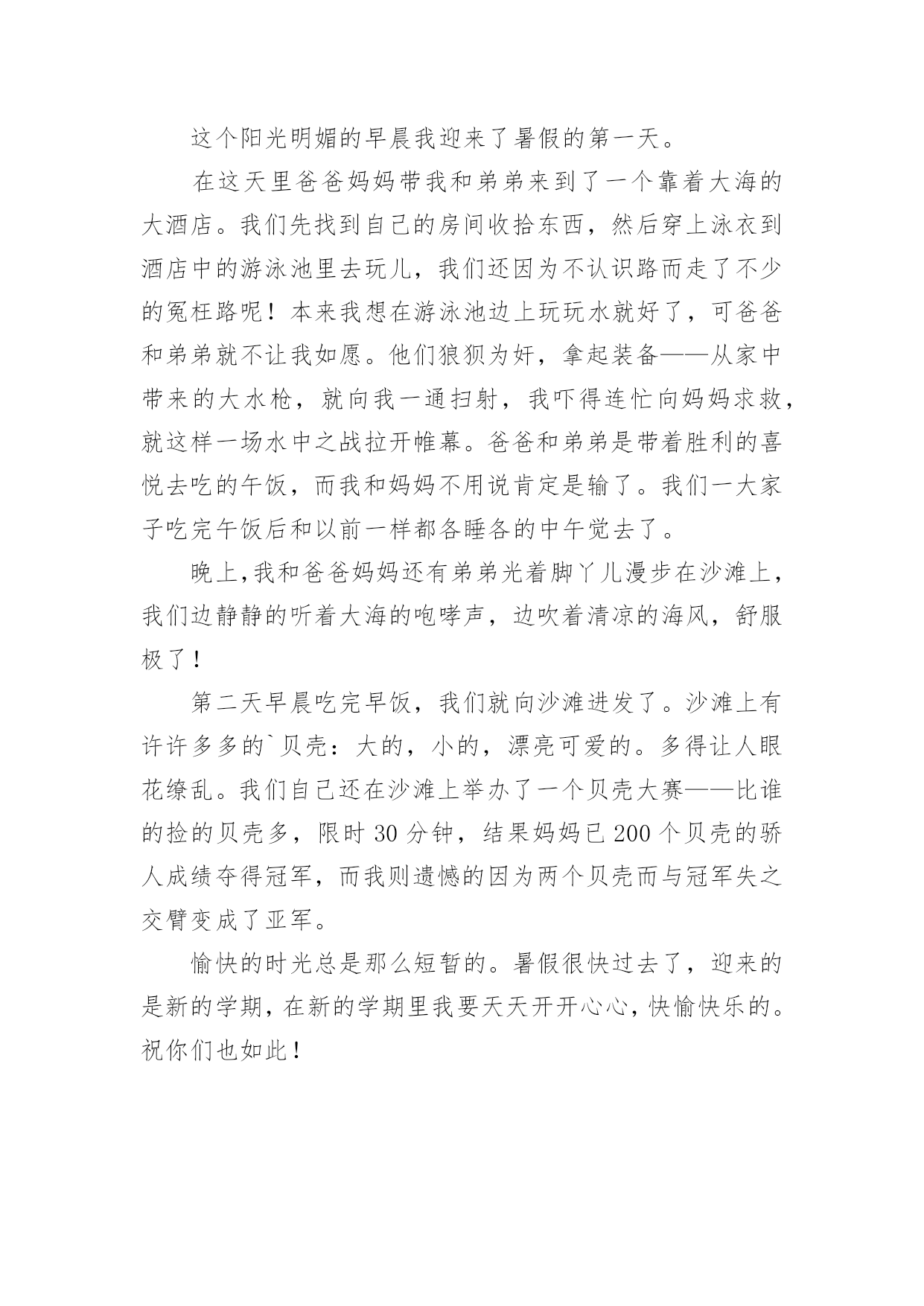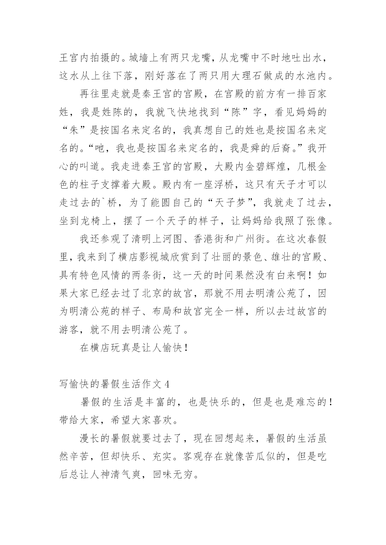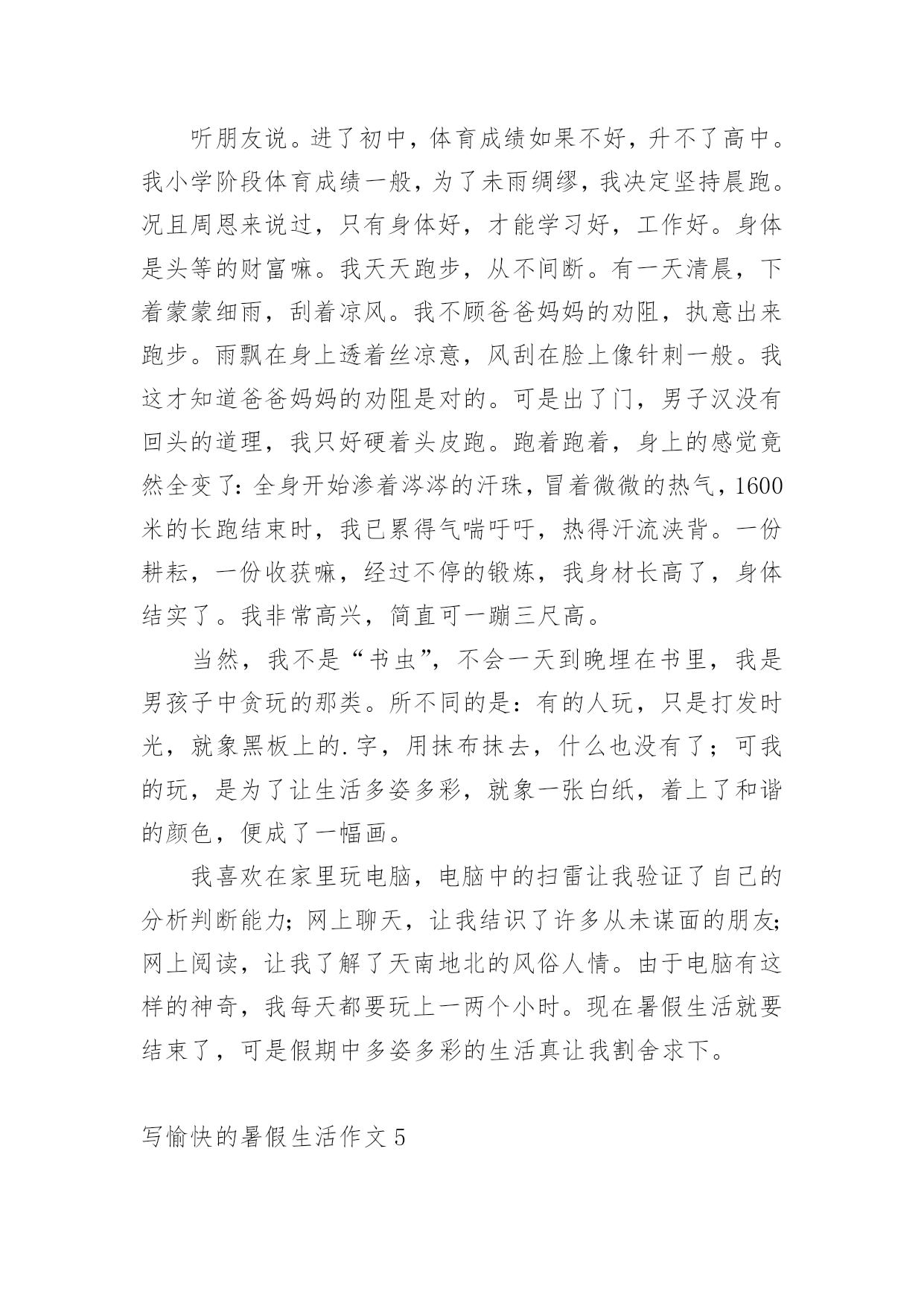 写愉快的暑假生活作文在学习、工作乃至生活中,大家都尝试过写作文吧,根据写作命题的特点,作文可以分为命题作文和非命题作文。还是对作文一筹莫展吗?下面是小编帮大家整理的写愉快的暑假生活作文,欢迎阅读,希望大家能够喜欢。写愉快的暑假生活作文1在我一生当中,我觉得这次的暑假最愉快了!因为它就像一些被吹落下的蒲公英,开心得满天飞。暑假,我们一家人坐飞机到海南玩。到了海南我们就住在舅舅家。有一天,舅舅说要到我们去猴岛玩。什么是猴岛?当然是全是猴子的一个小岛啦!当时我就这样想。到了那里才知道,我的想法是错误的!由于猴岛在山上面,所以要做缆车过去。刚一下缆车,一只猴子就马上扑了过来,原来他是看上了我手中的饮料!我赶紧把饮料像抛空球一样抛了出去,调皮的小猴子才放弃抓我。在猴岛里面,我们看了耍杂技,猴子表演等等。今天一上午都在猴岛,还跟猴子一起拍照,种种体验让我闻所未闻!接着我们又到了亚龙湾去玩水。先玩潜水,换好潜水服。作者轮船到另一边去,我们又跟老师学用手势在海底说话!我们个人都是一对一的教练。我们挨个挨个的排队下去,过了一会儿,到我啦!带着满怀的期待下水。身上背了个氧气筒,用嘴巴呼吸。教练慢慢的拖我下海底。刚没潜两步,一群五颜六色、可爱的鱼儿就快乐的从我面前“走”过。我又慢慢地潜,到底了,我看见了许多美丽的珊瑚,有黄的,有橙的',有红的,还有许多美丽的珊胆,数都数不清。教练带我上岸了。这次的潜水让我赞叹不已!然后我们去看“半潜观光”了。就是潜水艇啦。坐着轮船又到了另一个新地方。在潜水艇里,我发现有许许多多五彩缤纷的鱼儿!看看它们,用好奇的眼光盯着我们的窗,好想在说:“好大的物体呀!”这次的潜水艇又让我佩服得五体投地!今天一天过完啦!我感觉今天收获很大!感觉很愉快!总结来说,这次的游玩,就像给我的种种考验,让我去发现美!发现身边的美!写愉快的暑假生活作文2暑假期间,天气实在太热了,火辣辣的太阳笼照着大地,好像要把所有的东西都熔化掉似的。所以,我们家冰箱里的饮料喝得飞快。今天,冰箱里剩下唯一一瓶饮料也被我喝光了。可是,看着窗外白晃晃的阳光,心里实在想吃上一支冰凉的'棒冰。“卖棒冰了!五角一支,小豆棒冰!”突然,从窗外传来一阵吆喝声。“真是我的大救星!”这下我来了精神,拿起1元钱,朝楼下跑去。跑到前面一看,我一下愣住了,竟然是一个比我还小的男孩。我发现他嘴唇干裂,声音沙哑。我把钱给了他,他接过钱给我一支,我转身急忙跑回家,一边跑一边想,让他多5角钱可以自已吃一支。我正想着,忽然后来传来他的喊声,“小姐姐,等一等。”我只好站在那里对他说:“不用找了,这钱给你。”谁知他满脸通红,把钱塞进我手里气喘吁吁地说:“不是我的钱,我不要,你别瞧不起人,我的压岁钱比你多多了。”“那你为什么出来挣钱?”我奇怪地问。“那是因为我们学校举行了‘手拉手,献爱心’活动,我准备用这些钱捐给那些贫穷的孩子。”他倔强地说完,转身走了。当我目送他渐渐离去的身影后,才发现棒冰已经化掉了,虽然没能吃上棒冰,但心里却甜滋滋的。现在,每当我听到卖棒冰的吆喝声,我眼前就会浮现出当时的情景。写愉快的暑假生活作文3暑假的一天,我来到了东阳市。东阳市位于中国的中部,占地面积达15平方千米。东阳市最繁华的地方就是横店了。我在横店参观了横店影视城。横店影视城分为五大部分:秦王宫、清明上河图、明清公苑、香港街、广州街。我们先来到了那规模宏大的秦王宫。秦王宫的大门是由杉木做成的,杉木十分粗大。走进秦王宫内,那庄严的气息令人望而生畏,《英雄》和《寻秦记》这两本电影就是在秦王宫内拍摄的。城墙上有两只龙嘴,从龙嘴中不时地吐出水,这水从上往下落,刚好落在了两只用大理石做成的水池内。再往里走就是秦王宫的宫殿,在宫殿的前方有一排百家姓,我是姓陈的,我就飞快地找到“陈”字,看见妈妈的“朱”是按国名来定名的,我真想自己的姓也是按国名来定名的。“吔,我也是按国名来定名的,我是舜的后裔。”我开心的叫道。我走进秦王宫的宫殿,大殿内金碧辉煌,几根金色的柱子支撑着大殿。殿内有一座浮桥,这只有天子才可以走过去的`桥,为了能圆自己的“天子梦”,我就走了过去,坐到龙椅上,摆了一个天子的样子,让妈妈给我照了张像。我还参观了清明上河图、香港街和广州街。在这次春假里,我来到了横店影视城欣赏到了壮丽的景色、雄壮的宫殿、具有特色风情的两条街,这一天的时间果然没有白来啊!如果大家已经去过了北京的故宫,那就不用去明清公苑了,因为明清公苑的样子、布局和故宫完全一样,所以去过故宫的游客,就不用去明清公苑了。在横店玩真是让人愉快!写愉快的暑假生活作文4暑假的生活是丰富的,也是快乐的,但是也是难忘的!带给大家,希望大家喜欢。漫长的暑假就要过去了,现在回想起来,暑假的生活虽然辛苦,但却快乐、充实。客观存在就像苦瓜似的,但是吃后总让人神清气爽,回味无穷。听朋