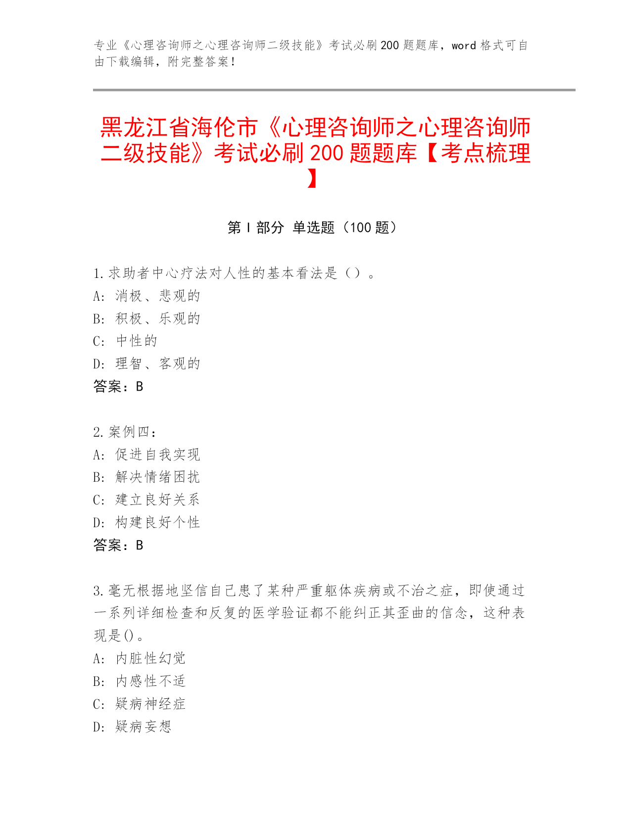 黑龙江省海伦市《心理咨询师之心理咨询师二级技能》考试必刷200题题库【考点梳理】