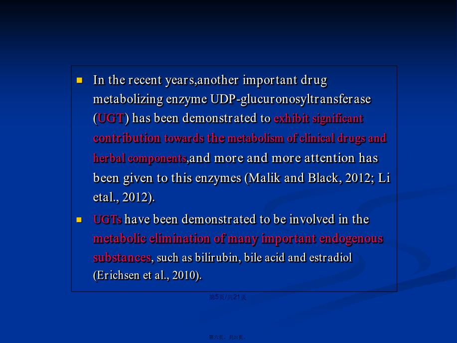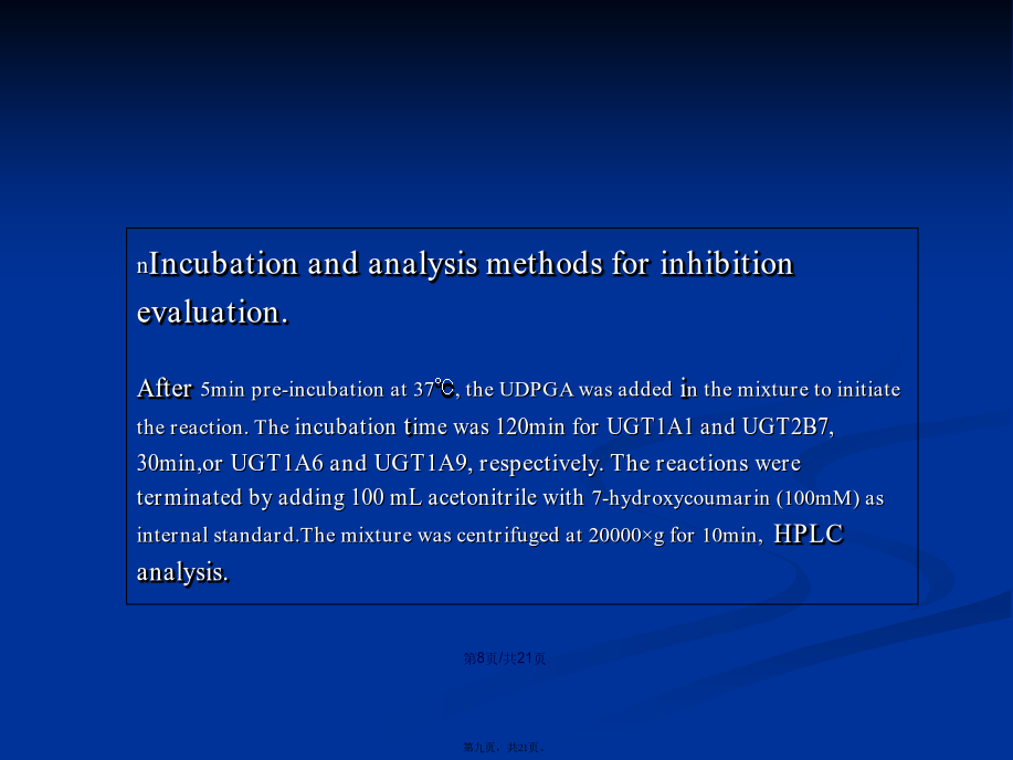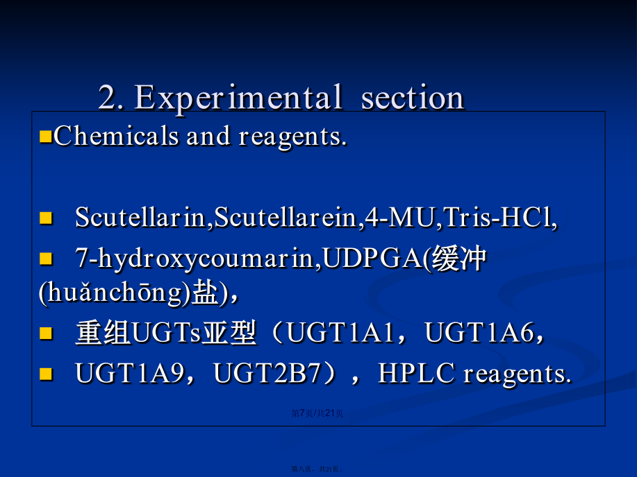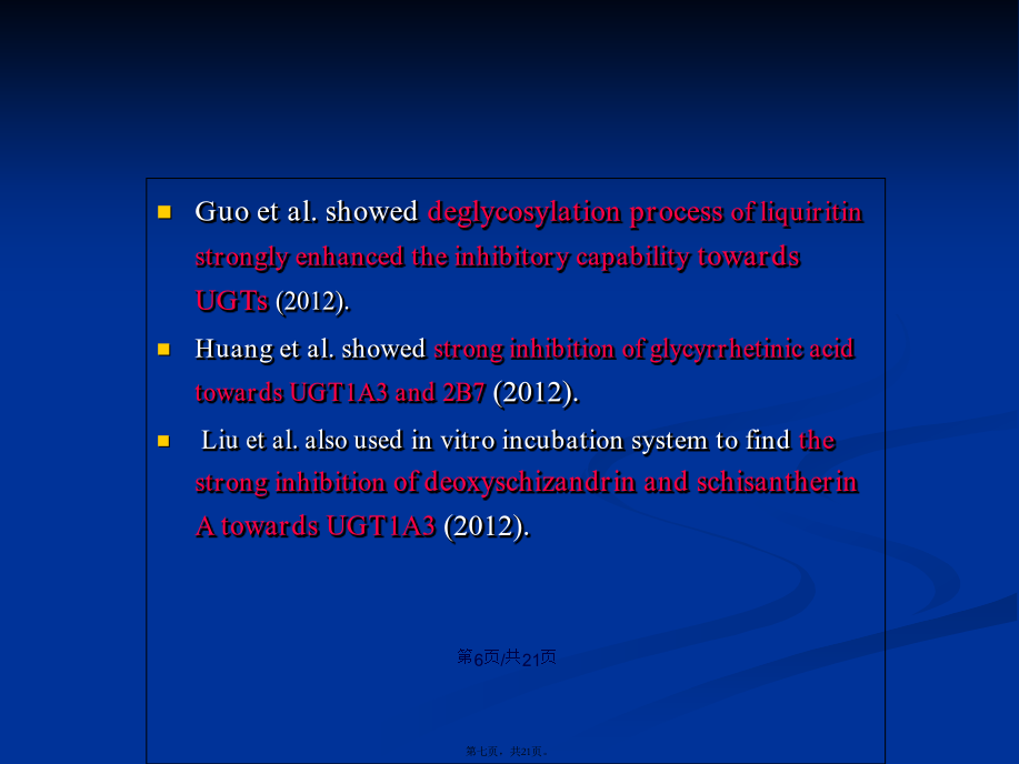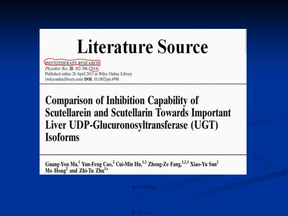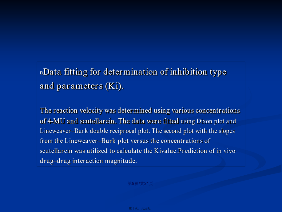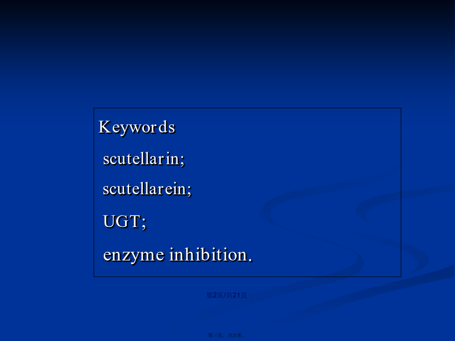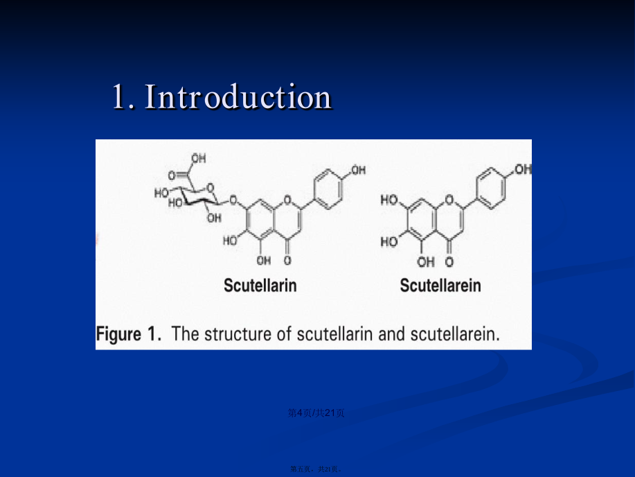 会计学Keywordsscutellarin;scutellarein;UGT;enzymeinhibition.Contents1.IntroductionIntherecentyears,anotherimportantdrugmetabolizingenzymeUDP-glucuronosyltransferase(UGT)hasbeendemonstratedtoexhibitsignificantcontributiontowardsthemetabolismofclinicaldrugsandherbalcomponents,andmoreandmoreattentionhasbeengiventothisenzymes(MalikandBlack,2012;Lietal.,2012).UGTshavebeendemonstratedtobeinvolvedinthemetaboliceliminationofmanyimportantendogenoussubstances,suchasbilirubin,bileacidandestradiol(Erichsenetal.,2010).Guoetal.showeddeglycosylationprocessofliquiritinstronglyenhancedtheinhibitorycapabilitytowardsUGTs(2012).Huangetal.showedstronginhibitionofglycyrrhetinicacidtowardsUGT1A3and2B7(2012).Liuetal.alsousedinvitroincubationsystemtofindthestronginhibitionofdeoxyschizandrinandschisantherinAtowardsUGT1A3(2012).Chemicalsandreagents.Scutellarin,Scutellarein,4-MU,Tris-HCl,7-hydroxycoumarin,UDPGA(缓冲(huǎnchōng)盐),重组UGTs亚型(UGT1A1,UGT1A6,UGT1A9,UGT2B7),HPLCreagents.Incubationandanalysismethodsforinhibitionevaluation.After5minpre-incubationat37℃,theUDPGAwasaddedinthemixturetoinitiatethereaction.Theincubationtimewas120minforUGT1A1andUGT2B7,30min,orUGT1A6andUGT1A9,respectively.Thereactionswereterminatedbyadding100mLacetonitrilewith7-hydroxycoumarin(100mM)asinternalstandard.Themixturewascentrifugedat20000×gfor10min,HPLCanalysis.Datafittingfordeterminationofinhibitiontypeandparameters(Ki).Thereactionvelocitywasdeterminedusingvariousconcentrationsof4-MUandscutellarein.ThedatawerefittedusingDixonplotandLineweaver–Burkdoublereciprocalplot.ThesecondplotwiththeslopesfromtheLineweaver–BurkplotversustheconcentrationsofscutellareinwasutilizedtocalculatetheKivalue.Predictionofinvivodrug–druginteractionmagnitude.Predictionofinvivodrug–druginteractionmagnitude.Themostcommonequationfordrug–druginteractionpredictionwasemployedtopredicttheAUCalterationofcoadministereddrugscausedbyco-administrationofscutellarein.3.Resultsanddiscussion图2表明,100mM野黄芩(huánɡqín)苷对UGT1A1,UGT1A6,UGT1A9,UGT2