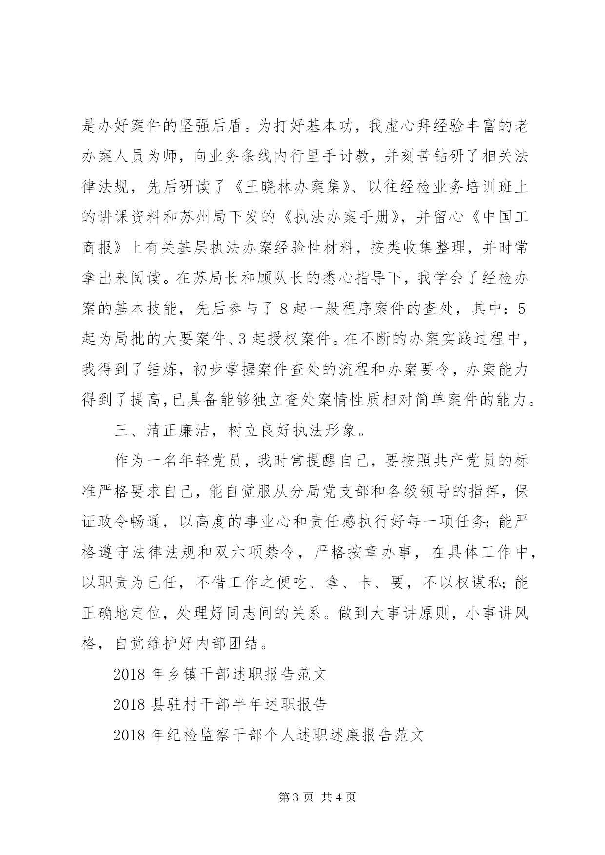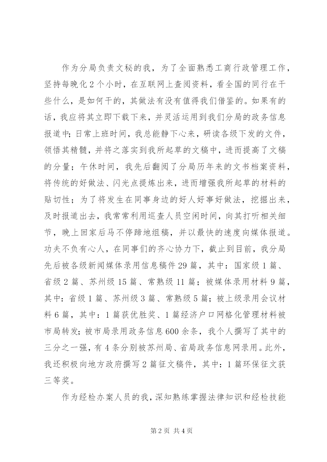 第PAGE\*Arabic\*MERGEFORMAT4页共NUMPAGES\*MERGEFORMAT4页工商分局干部述职报告范文工商分局干部述职报告怎么写。下面为有需求的人提供一篇相关范文供参考。一、努力学习,快速适应新岗位。学习是明确政治方向,提高能力水平的重要途径,更是适应新形势、新环境的必然要求。对我而言,面对由部队到地方的岗位转变,唯恐辜负组织的培养和领导的信任,更加自觉刻苦地学习政治理论和业务知识,努力提高自身政治水平和综合能力,尽快进入情况,适应新岗位。为此,我坚持做到勤学习、多思考、善总结,并自加压力,时常提醒自己要认真读好两本书,一是读好有字之书,即时刻向书本学习,学习政治理论、学习工商法律法规和经检办案业务技能,做到基础知识通学、法律知识深学、修身知识勤学、急需知识先学;二是读好无字之书,社会也是一本书,而且更丰富,更有现实意义,所以我一贯做到虚心向身边的有智之师学习,学习他们的理论观点、工作方法、为人处世及语言、文字表达等。在日常工作中,我坚持做到五多,即多看、多听、多想、多写、多做,养成学而思、思而入、入而进的良好习惯。一年来,我先后写下了上万字的读书笔记,并将之与实践有机地结合起来。通过不断地学习,本人较快地适应了经检办案和办公室文秘2个截然不同的工作岗位。二、勤奋工作,尽力做好本职工作。作为分局负责文秘的我,为了全面熟悉工商行政管理工作,坚持每晚化2个小时,在互联网上查阅资料,看全国的同行在干些什么,是如何干的,其做法有没有值得我们借鉴的。如果有的话,我应将其立即下载下来,并灵活运用到我们分局的政务信息报道中;日常上班时间,我总能静下心来,研读各级下发的文件,领悟其精髓,并将之落实到我所起草的文稿中,进而提高了文稿的分量;午休时间,我先后翻阅了分局历年来的文书档案资料,将传统的好做法、闪光点提炼出来,进而增强我所起草的材料的贴切性;为了将发生在同事身边的好人好事好做法,挖掘出来,及时报道出去,我常常利用巡查人员空闲时间,向其打听相关细节,晚上回家后马不停蹄地组稿,并以最快的速度向媒体报道。功夫不负有心人,在同事们的齐心协力下,截止到目前,我分局先后被各级新闻媒体录用信息稿件29篇,其中:国家级1篇、省级2篇、苏州级15篇、常熟级11篇;被媒体录用材料9篇,其中:省级1篇、苏州级3篇、常熟级5篇;被上级录用会议材料6篇,其中:1篇获优胜奖、1篇经济户口网格化管理材料被市局转发;被市局录用政务信息600余条,我个人撰写了其中的三分之一强,有4条分别被苏州局、省局政务信息网录用。此外,我还积极向地方政府撰写2篇征文稿件,其中:1篇环保征文获三等奖。作为经检办案人员的我,深知熟练掌握法律知识和经检技能是办好案件的坚强后盾。为打好基本功,我虚心拜经验丰富的老办案人员为师,向业务条线内行里手讨教,并刻苦钻研了相关法律法规,先后研读了《王晓林办案集》、以往经检业务培训班上的讲课资料和苏州局下发的《执法办案手册》,并留心《中国工商报》上有关基层执法办案经验性材料,按类收集整理,并时常拿出来阅读。在苏局长和顾队长的悉心指导下,我学会了经检办案的基本技能,先后参与了8起一般程序案件的查处,其中:5起为局批的大要案件、3起授权案件。在不断的办案实践过程中,我得到了锤炼,初步掌握案件查处的流程和办案要令,办案能力得到了提高,已具备能够独立查处案情性质相对简单案件的能力。三、清正廉洁,树立良好执法形象。作为一名年轻党员,我时常提醒自己,要按照共产党员的标准严格要求自己,能自觉服从分局党支部和各级领导的指挥,保证政令畅通,以高度的事业心和责任感执行好每一项任务;能严格遵守法律法规和双六项禁令,严格按章办事,在具体工作中,以职责为已任,不借工作之便吃、拿、卡、要,不以权谋私;能正确地定位,处理好同志间的关系。做到大事讲原则,小事讲风格,自觉维护好内部团结。2018年乡镇干部述职报告范文2018县驻村干部半年述职报告2018年纪检监察干部个人述职述廉报告范文2018最新乡镇干部个人述职报告范文乡干部目标规划述职报告范文2018年乡镇领导干部个人述职述廉报告范文2018年12月中层干部述职述廉报告2018年12月中层干部述职报告22018年领导干部关于不作为述职述德述廉报告优秀学生会干部个人述职报告范文