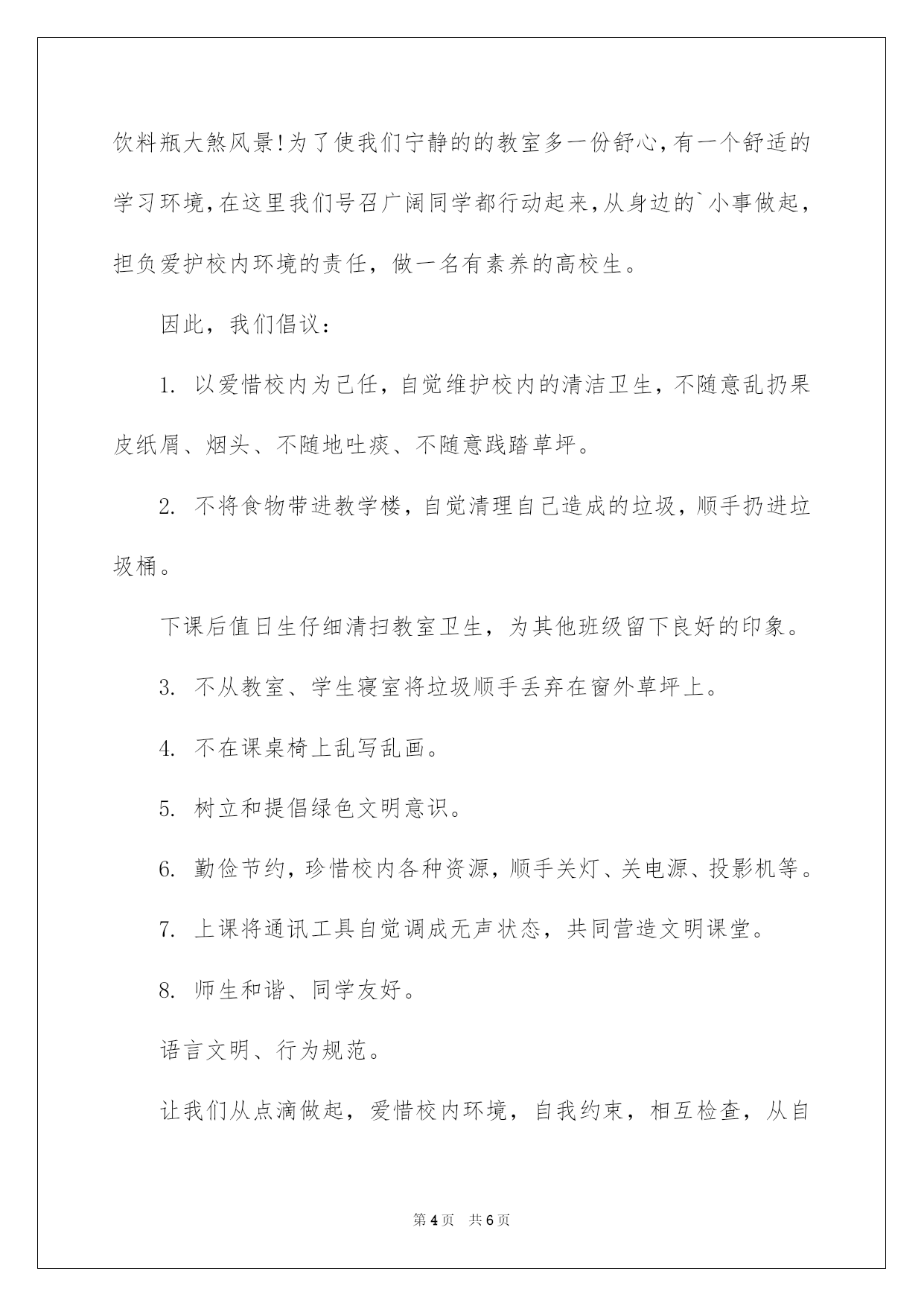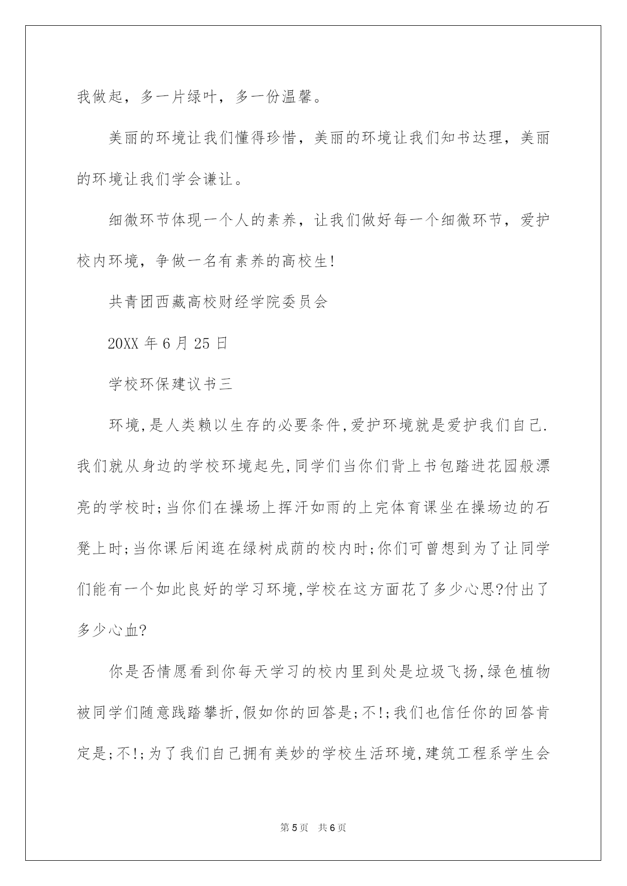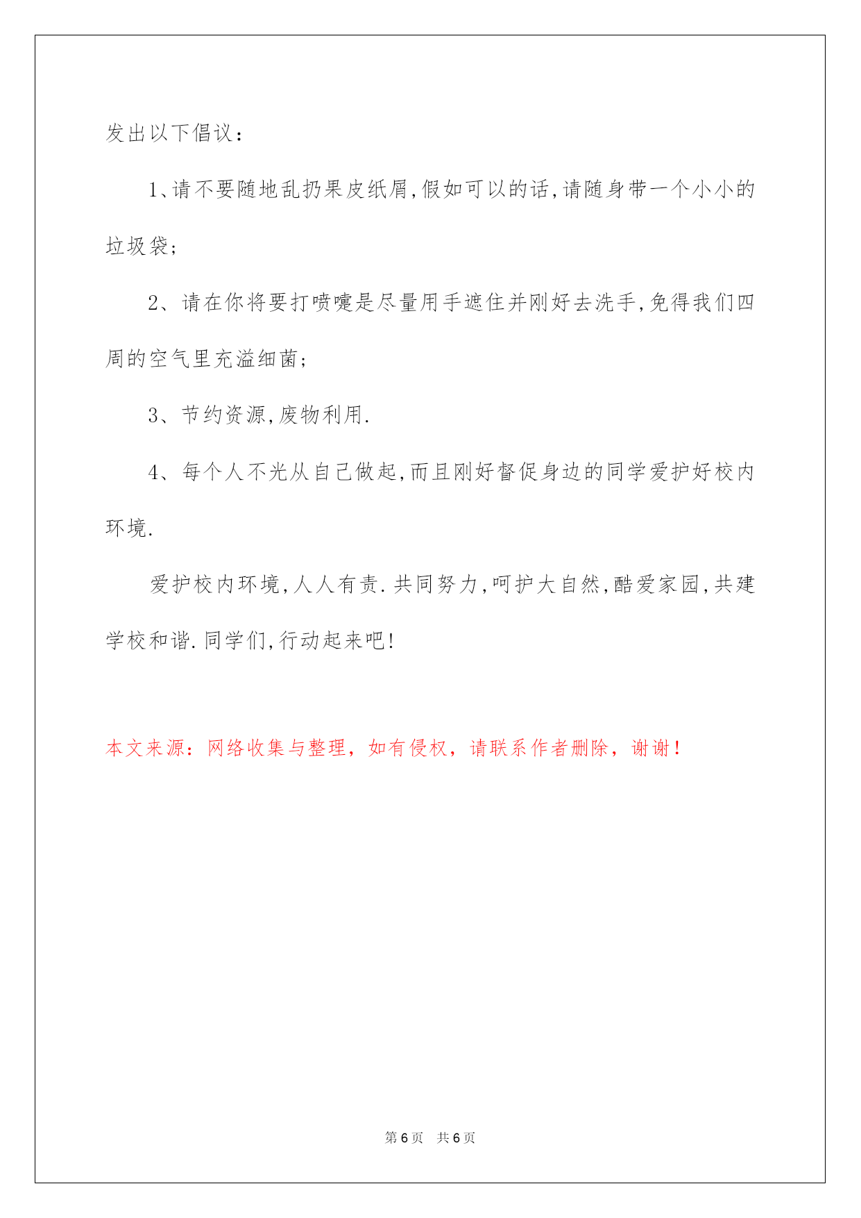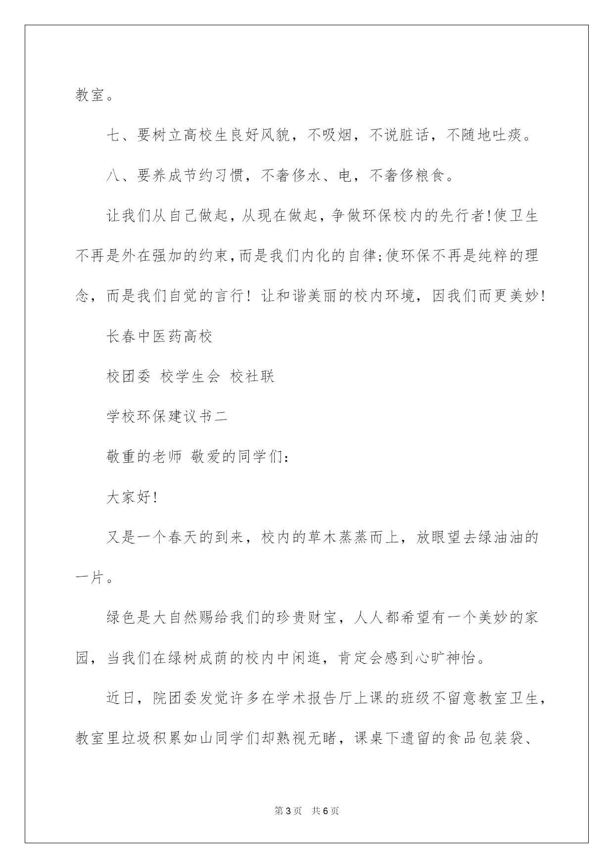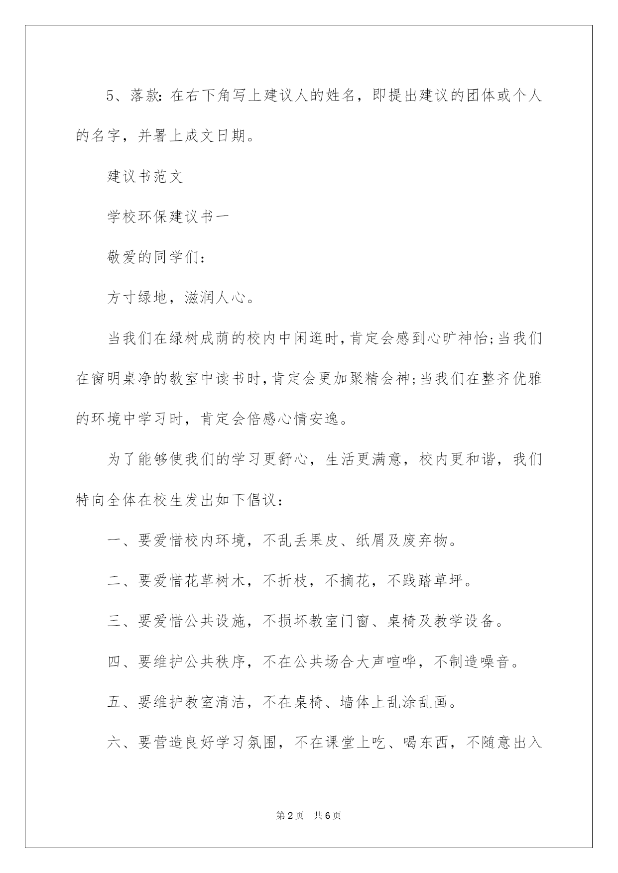 第PAGE\*Arabic\*MERGEFORMAT6页共NUMPAGES\*Arabic\*MERGEFORMAT6页第PAGE\*MERGEFORMAT6页共NUMPAGES\*MERGEFORMAT6页第PAGE\*MERGEFORMAT6页共NUMPAGES\*MERGEFORMAT6页第PAGE\*MERGEFORMAT6页共NUMPAGES\*MERGEFORMAT6页第PAGE\*MERGEFORMAT6页共NUMPAGES\*MERGEFORMAT6页第PAGE\*MERGEFORMAT6页共NUMPAGES\*MERGEFORMAT6页第PAGE\*MERGEFORMAT6页共NUMPAGES\*MERGEFORMAT6页第PAGE\*MERGEFORMAT6页共NUMPAGES\*MERGEFORMAT6页第PAGE\*MERGEFORMAT6页共NUMPAGES\*MERGEFORMAT6页第PAGE\*MERGEFORMAT6页共NUMPAGES\*MERGEFORMAT6页第PAGE\*MERGEFORMAT6页共NUMPAGES\*MERGEFORMAT6页2022学校环保建议书的格式及学校环保建议书的格式及范文校内是我家,环保靠大家。下面是我整理的几篇关于学校环保的建议书范文,供大家阅读参考。建议书格式1、标题:一般在第一行中间写上;建议书;。可以写上所建议的内容。2、称呼:注明受问单位的名称或个人姓名,换行定格写,后面加冒号。3、正文:正文就是建议的内容,从第三行空两格起先写。先写提出建议的理由,再写建议的详细内容。正文的内容要求结合实际,假如内容较多,可以分条来写。第一、阐明提出建议的内容、理由以及自己的目的、想法;其次、建议的详细内容;第三、提出自己的希望接受的想法。4、结尾:一般是表示敬意或祝福的话(与一般书信相同)。5、落款:在右下角写上建议人的姓名,即提出建议的团体或个人的名字,并署上成文日期。建议书范文学校环保建议书一敬爱的同学们:方寸绿地,滋润人心。当我们在绿树成荫的校内中闲逛时,肯定会感到心旷神怡;当我们在窗明桌净的教室中读书时,肯定会更加聚精会神;当我们在整齐优雅的环境中学习时,肯定会倍感心情安逸。为了能够使我们的学习更舒心,生活更满意,校内更和谐,我们特向全体在校生发出如下倡议:一、要爱惜校内环境,不乱丢果皮、纸屑及废弃物。二、要爱惜花草树木,不折枝,不摘花,不践踏草坪。三、要爱惜公共设施,不损坏教室门窗、桌椅及教学设备。四、要维护公共秩序,不在公共场合大声喧哗,不制造噪音。五、要维护教室清洁,不在桌椅、墙体上乱涂乱画。六、要营造良好学习氛围,不在课堂上吃、喝东西,不随意出入教室。七、要树立高校生良好风貌,不吸烟,不说脏话,不随地吐痰。八、要养成节约习惯,不奢侈水、电,不奢侈粮食。让我们从自己做起,从现在做起,争做环保校内的先行者!使卫生不再是外在强加的约束,而是我们内化的自律;使环保不再是纯粹的理念,而是我们自觉的言行!让和谐美丽的校内环境,因我们而更美妙!长春中医药高校校团委校学生会校社联学校环保建议书二敬重的老师敬爱的同学们:大家好!又是一个春天的到来,校内的草木蒸蒸而上,放眼望去绿油油的一片。绿色是大自然赐给我们的珍贵财宝,人人都希望有一个美妙的家园,当我们在绿树成荫的校内中闲逛,肯定会感到心旷神怡。近日,院团委发觉许多在学术报告厅上课的班级不留意教室卫生,教室里垃圾积累如山同学们却熟视无睹,课桌下遗留的食品包装袋、饮料瓶大煞风景!为了使我们宁静的的教室多一份舒心,有一个舒适的学习环境,在这里我们号召广阔同学都行动起来,从身边的`小事做起,担负爱护校内环境的责任,做一名有素养的高校生。因此,我们倡议:1.以爱惜校内为己任,自觉维护校内的清洁卫生,不随意乱扔果皮纸屑、烟头、不随地吐痰、不随意践踏草坪。2.不将食物带进教学楼,自觉清理自己造成的垃圾,顺手扔进垃圾桶。下课后值日生仔细清扫教室卫生,为其他班级留下良好的印象。3.不从教室、学生寝室将垃圾顺手丢弃在窗外草坪上。4.不在课桌椅上乱写乱画。5.树立和提倡绿色文明意识。6.勤俭节约,珍惜校内各种资源,顺手关灯、关电源、投影机等。7.上课将通讯工具自觉调成无声状态,共同营造文明课堂。8.师生和谐、同学友好。语言文明、行为规范。让我们从点滴做起,爱惜校内环境,自我约束,相互检查,从自我做起,多一片绿叶,多一份温馨。美丽的环境让我们懂得珍惜,美丽的环境让我们知书达理,美丽的环境让我们学会谦让。细微环节体现一个人的素养,让我们做好每一个细微环节,爱护校内环境,争做一名有素