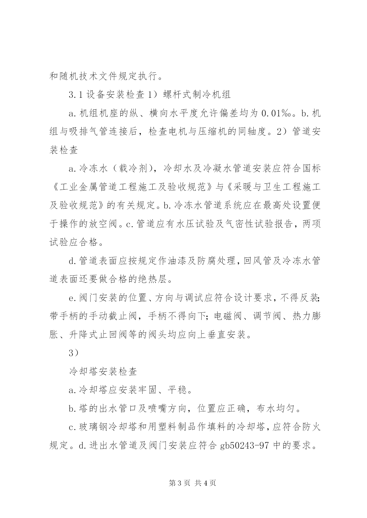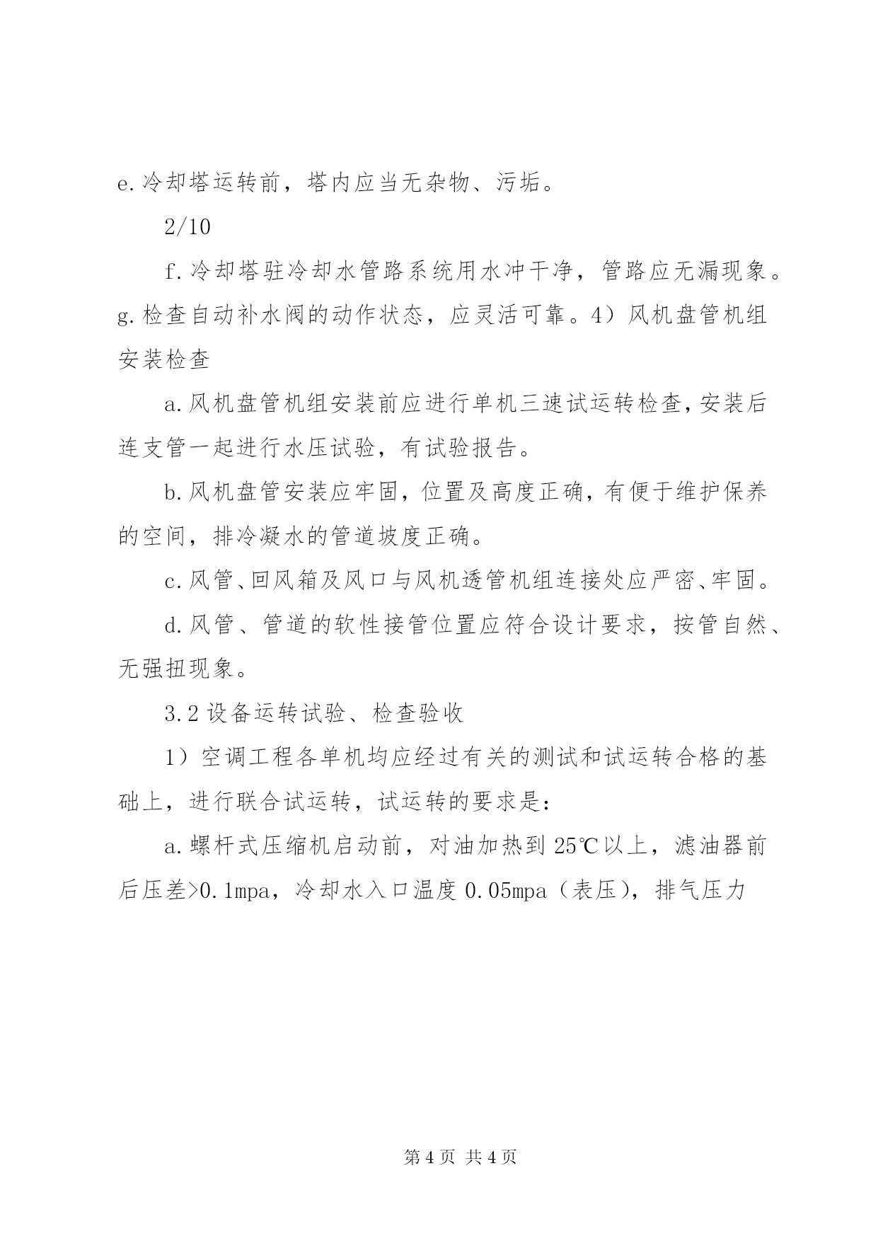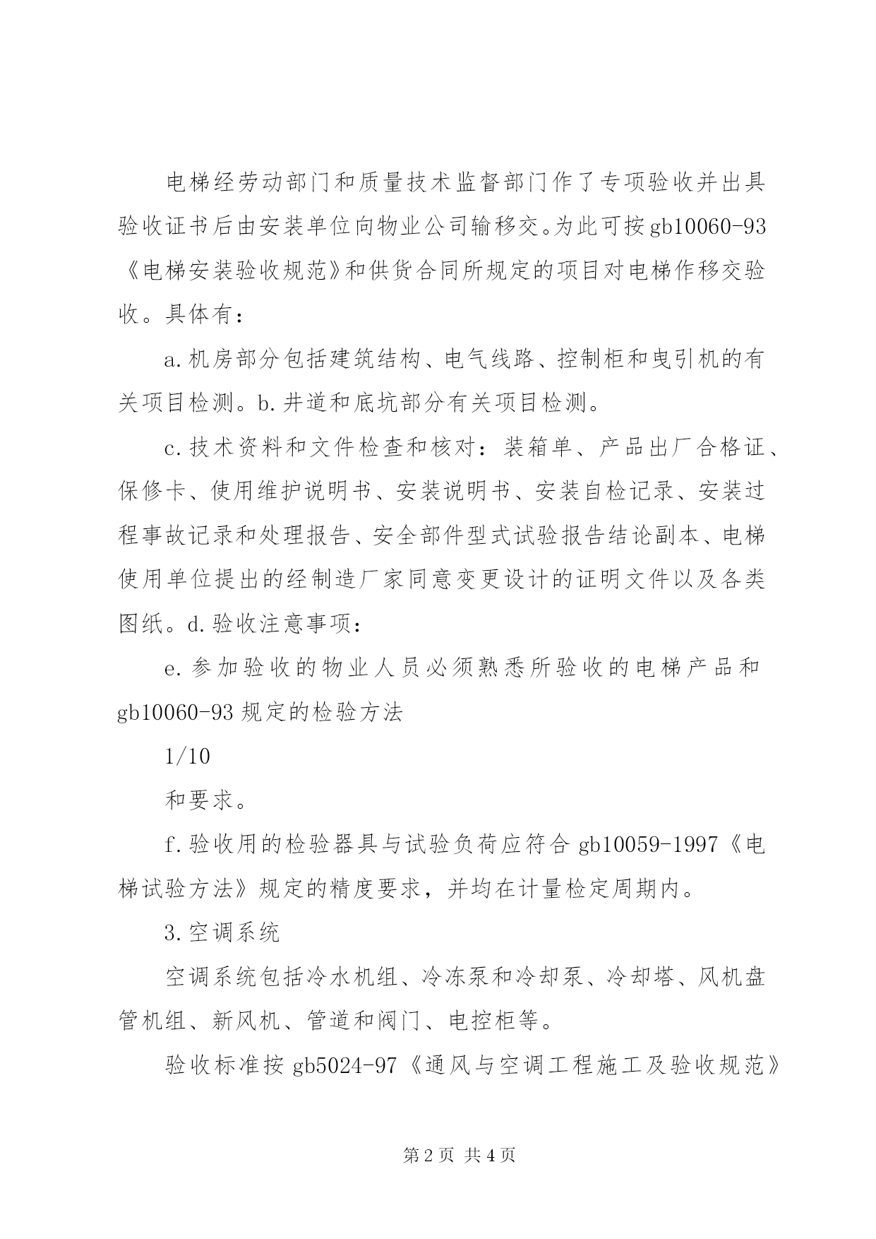 第PAGE\*Arabic\*MERGEFORMAT4页共NUMPAGES\*MERGEFORMAT4页机电设备接管验收工作标准列入本标准的机电设备有:供配电系统、电梯、空调系统、通风系统、给水排水系统、消防报警系统、闭路电视监控系统、可视对讲与门禁系统、停车场管理系统、电子巡更系统、周边防范系统和气体灭火装置。上述系统的移交验收标准如下:1.供配电系统包括高压开关柜、直流屏、变压器和低压配电柜(发电机组另行验收)。安装单位将这些设备安装调试完成后,通常由供电部门直接作测试验收并签署同意投入供电证书。因此当安装单位向物业公司移交时所作的验收主要有:a.依据设备移交清单的设备名称、型号规格、数量、生产厂家逐项检查核对。b.依据技术资料单核对所提供的产品或部件使用说明书、图纸、合格证、保修卡和供电部门所作的继电保护装置测试报告等。c.检查安装单位提供的绝缘手套、绝缘靴、高压验电棒(器)和接地软线以及各类指示牌等。d.检查各电柜的仪表指示是否正常,各部件安装和接地端子是否牢固,标牌是否齐全。如以上各项均符合要求,则在移交清单上签字。2.电梯包括客梯、货梯(消防梯)、观光梯和扶梯。电梯经劳动部门和质量技术监督部门作了专项验收并出具验收证书后由安装单位向物业公司输移交。为此可按gb10060-93《电梯安装验收规范》和供货合同所规定的项目对电梯作移交验收。具体有:a.机房部分包括建筑结构、电气线路、控制柜和曳引机的有关项目检测。b.井道和底坑部分有关项目检测。c.技术资料和文件检查和核对:装箱单、产品出厂合格证、保修卡、使用维护说明书、安装说明书、安装自检记录、安装过程事故记录和处理报告、安全部件型式试验报告结论副本、电梯使用单位提出的经制造厂家同意变更设计的证明文件以及各类图纸。d.验收注意事项:e.参加验收的物业人员必须熟悉所验收的电梯产品和gb10060-93规定的检验方法1/10和要求。f.验收用的检验器具与试验负荷应符合gb10059-1997《电梯试验方法》规定的精度要求,并均在计量检定周期内。3.空调系统空调系统包括冷水机组、冷冻泵和冷却泵、冷却塔、风机盘管机组、新风机、管道和阀门、电控柜等。验收标准按gb5024-97《通风与空调工程施工及验收规范》和随机技术文件规定执行。3.1设备安装检查1)螺杆式制冷机组a.机组机座的纵、横向水平度允许偏差均为0.01‰。b.机组与吸排气管连接后,检查电机与压缩机的同轴度。2)管道安装检查a.冷冻水(载冷剂),冷却水及冷凝水管道安装应符合国标《工业金属管道工程施工及验收规范》与《采暖与卫生工程施工及验收规范》的有关规定。b.冷冻水管道系统应在最高处设置便于操作的放空阀。c.管道应有水压试验及气密性试验报告,两项试验应合格。d.管道表面应按规定作油漆及防腐处理,回风管及冷冻水管道表面还要做合格的绝热层。e.阀门安装的位置、方向与调试应符合设计要求,不得反装;带手柄的手动截止阀,手柄不得向下;电磁阀、调节阀、热力膨胀、升降式止回阀等的阀头均应向上垂直安装。3)冷却塔安装检查a.冷却塔应安装牢固、平稳。b.塔的出水管口及喷嘴方向,位置应正确,布水均匀。c.玻璃钢冷却塔和用塑料制品作填料的冷却塔,应符合防火规定。d.进出水管道及阀门安装应符合gb50243-97中的要求。e.冷却塔运转前,塔内应当无杂物、污垢。2/10f.冷却塔驻冷却水管路系统用水冲干净,管路应无漏现象。g.检查自动补水阀的动作状态,应灵活可靠。4)风机盘管机组安装检查a.风机盘管机组安装前应进行单机三速试运转检查,安装后连支管一起进行水压试验,有试验报告。b.风机盘管安装应牢固,位置及高度正确,有便于维护保养的空间,排冷凝水的管道坡度正确。c.风管、回风箱及风口与风机透管机组连接处应严密、牢固。d.风管、管道的软性接管位置应符合设计要求,按管自然、无强扭现象。3.2设备运转试验、检查验收1)空调工程各单机均应经过有关的测试和试运转合格的基础上,进行联合试运转,试运转的要求是:a.螺杆式压缩机启动前,对油加热到25℃以上,滤油器前后压差>0.1mpa,冷却水入口温度0.05mpa(表压),排气压力
