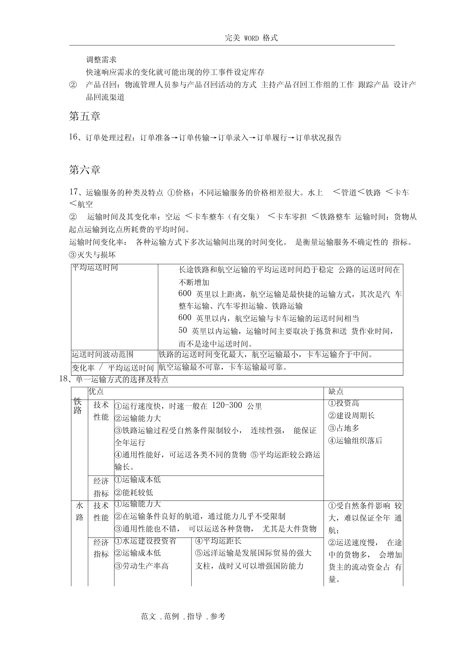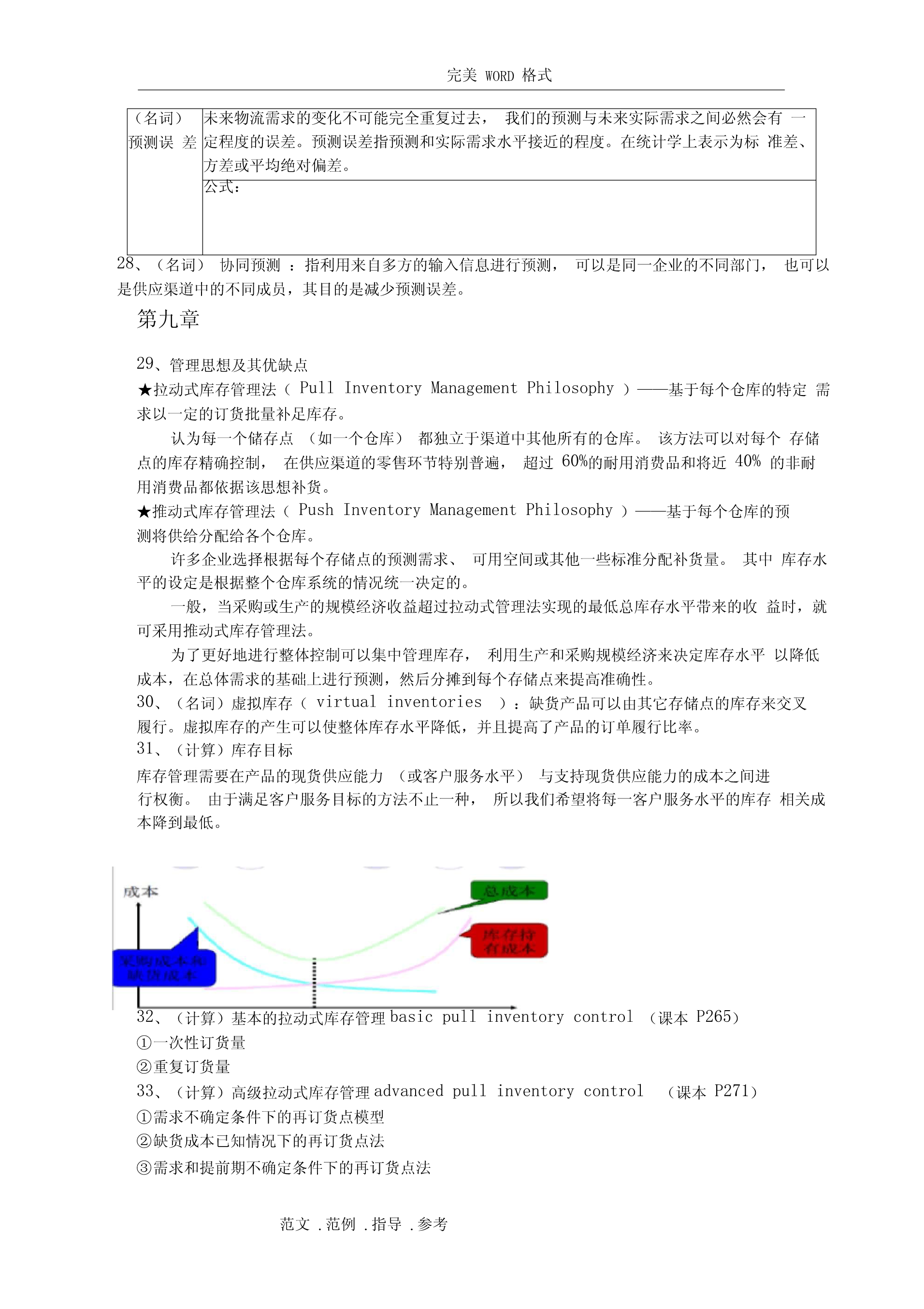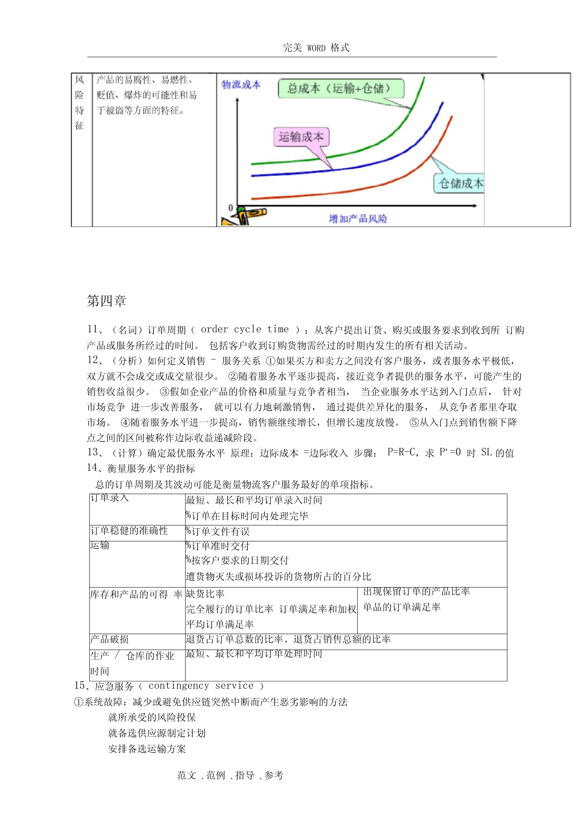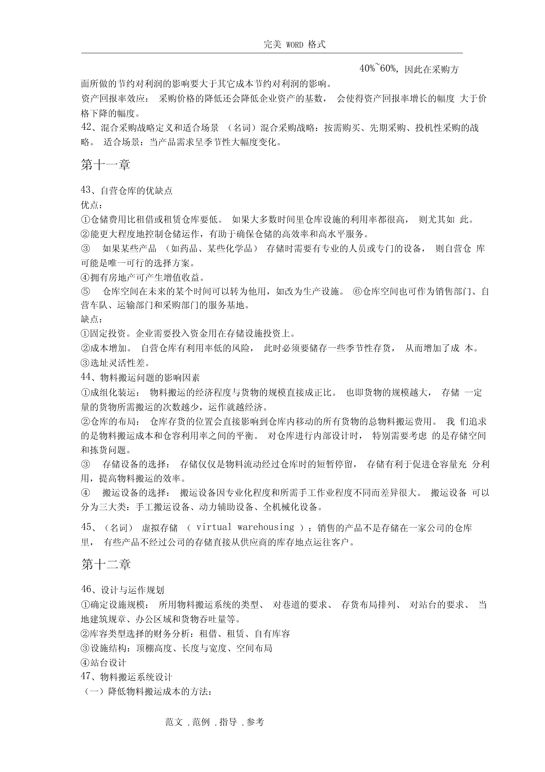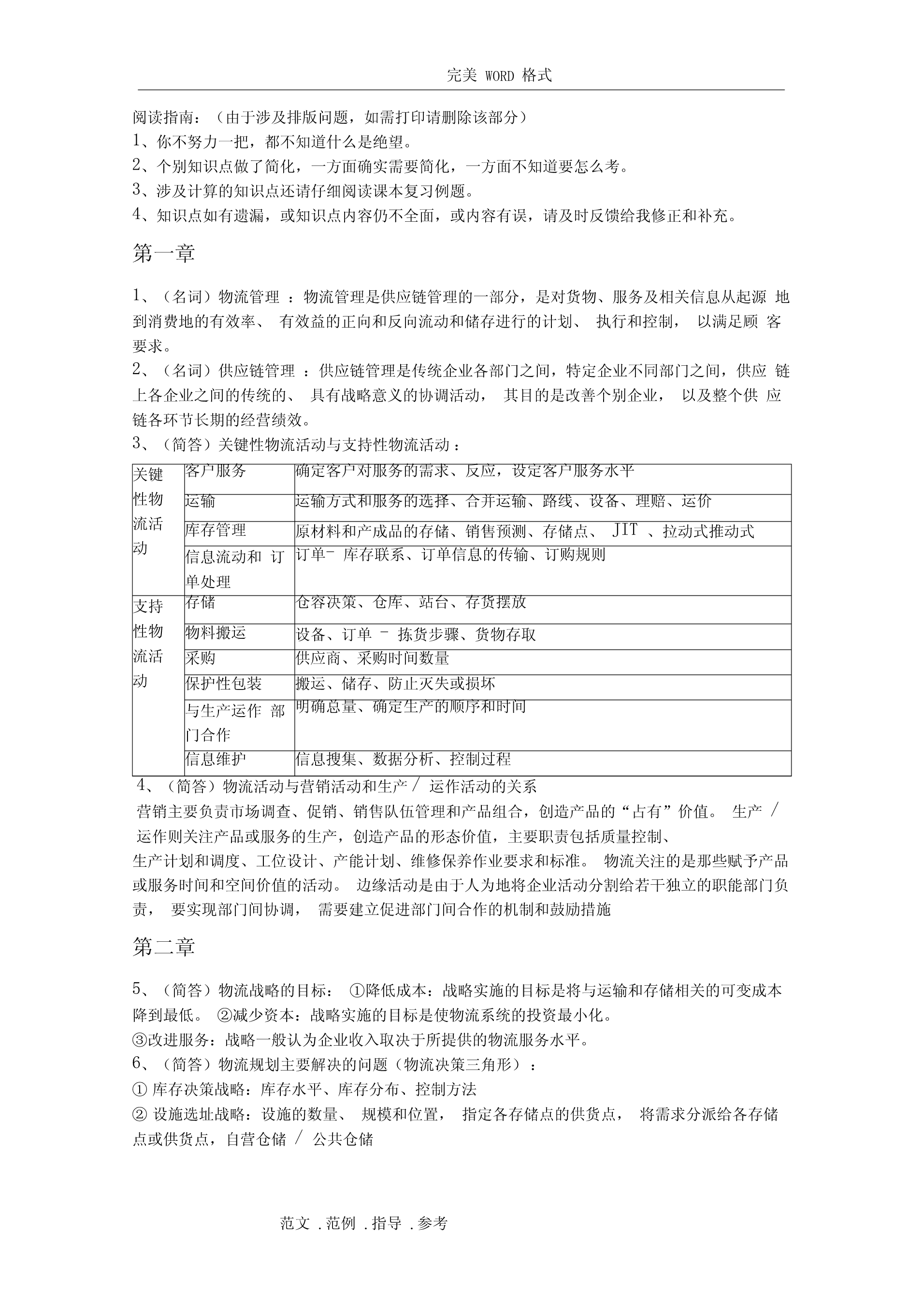 完美WORD格式阅读指南:(由于涉及排版问题,如需打印请删除该部分)1、你不努力一把,都不知道什么是绝望。2、个别知识点做了简化,一方面确实需要简化,一方面不知道要怎么考。3、涉及计算的知识点还请仔细阅读课本复习例题。4、知识点如有遗漏,或知识点内容仍不全面,或内容有误,请及时反馈给我修正和补充。第一章1、(名词)物流管理:物流管理是供应链管理的一部分,是对货物、服务及相关信息从起源地到消费地的有效率、有效益的正向和反向流动和储存进行的计划、执行和控制,以满足顾客要求。2、(名词)供应链管理:供应链管理是传统企业各部门之间,特定企业不同部门之间,供应链上各企业之间的传统的、具有战略意义的协调活动,其目的是改善个别企业,以及整个供应链各环节长期的经营绩效。3、(简答)关键性物流活动与支持性物流活动:关键客户服务确定客户对服务的需求、反应,设定客户服务水平性物运输运输方式和服务的选择、合并运输、路线、设备、理赔、运价流活库存管理原材料和产成品的存储、销售预测、存储点、JIT、拉动式推动式动信息流动和订订单-库存联系、订单信息的传输、订购规则单处理支持存储仓容决策、仓库、站台、存货摆放性物物料搬运设备、订单-拣货步骤、货物存取流活采购供应商、采购时间数量动保护性包装搬运、储存、防止灭失或损坏与生产运作部明确总量、确定生产的顺序和时间门合作信息维护信息搜集、数据分析、控制过程4、(简答)物流活动与营销活动和生产/运作活动的关系营销主要负责市场调查、促销、销售队伍管理和产品组合,创造产品的“占有”价值。生产/运作则关注产品或服务的生产,创造产品的形态价值,主要职责包括质量控制、生产计划和调度、工位设计、产能计划、维修保养作业要求和标准。物流关注的是那些赋予产品或服务时间和空间价值的活动。边缘活动是由于人为地将企业活动分割给若干独立的职能部门负责,要实现部门间协调,需要建立促进部门间合作的机制和鼓励措施第二章5、(简答)物流战略的目标:①降低成本:战略实施的目标是将与运输和存储相关的可变成本降到最低。②减少资本:战略实施的目标是使物流系统的投资最小化。③改进服务:战略一般认为企业收入取决于所提供的物流服务水平。6、(简答)物流规划主要解决的问题(物流决策三角形):①库存决策战略:库存水平、库存分布、控制方法②设施选址战略:设施的数量、规模和位置,指定各存储点的供货点,将需求分派给各存储点或供货点,自营仓储/公共仓储范文.范例.指导.参考完美WORD格式③运输战略:运输方式,运输路线/时间表,运输批量/合并运输④客户服务目标:由库存战略、运输战略、选址战略共同实现7、(简答)制定战略时的指导原则:①总成本概念TotalCostConcept④推迟Postponement②多样化分拨Differentiated⑧合并ConsolidationDistribution⑨标准化Standardization③混合战略MixedStrategy⑤生产技术和生产流程的特点可⑦市场特征产品生命将初步生产和推迟作业分离定制周期短销售量波动大⑥产品特征模块的通用程度较高不太复杂模块化产品设计从多个提前期短而可靠价格产品有具体形态有具体参数产品单地点采购竞争多个市场,多个位价值高定植后产品的体积和/或客户重量增加8、选择适当的渠道战略供应链类型渠道的特征产品特征可预测的/成熟产难以预测的/新产品品效率型供应链食品、文具、原材如果产品归于此类,可以经济生产批量成品供给入库料等寻找更好的预测方法适用库存经济采购批量供给入库的战略;或将供大批量运输批量订给入库的模式更新为按单单处理供给或反应型工艺链设计反应型供应链如果产品归于此电脑、时装、工艺品、电按单供货类,可以改成效率影等额外产能快速调整型供应链。提前期短灵活处理机制高价的运输服务单订单处理第三章9、(分析)产品生命周期(theproductlifecycle)导入期:实物分拨战略是谨慎的,库存限制在相对少的地点,产品现货供应比率有限。增长期:反拨管理常常在管理人员的判断和控制下进行,更多地区的产品现货供应比率会迅速提高。处于增长期的产品可充分利用公司已处于衰退期产品的分拨渠道。成熟期:产品分拨渠道最广,会用到很多存储点,产品的现货供应比率也控制在较好的水平上。衰退期:存储点将减少,产品库存将下降,存放地点将更加集中。范文.范例.指导.参考完美WORD格式10、(简答)产品特征如何影响物流战略的重1、与运输和仓储成本直接制定量相关。2、密度大的产品,可充体分利用