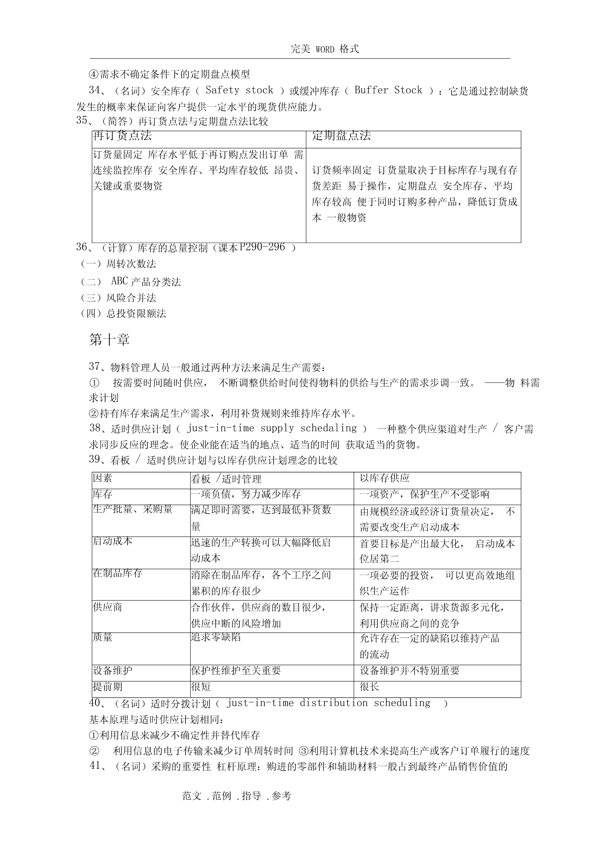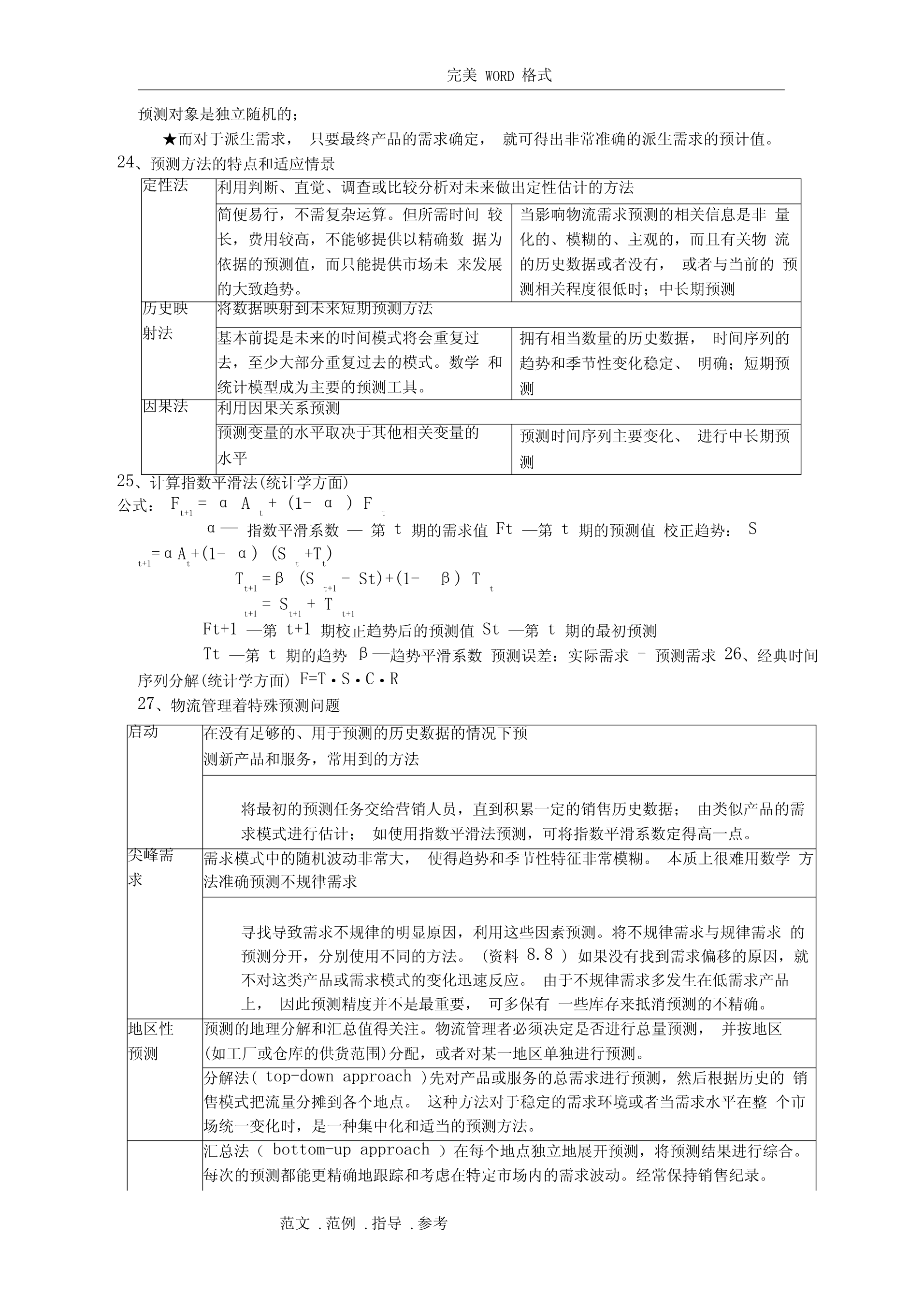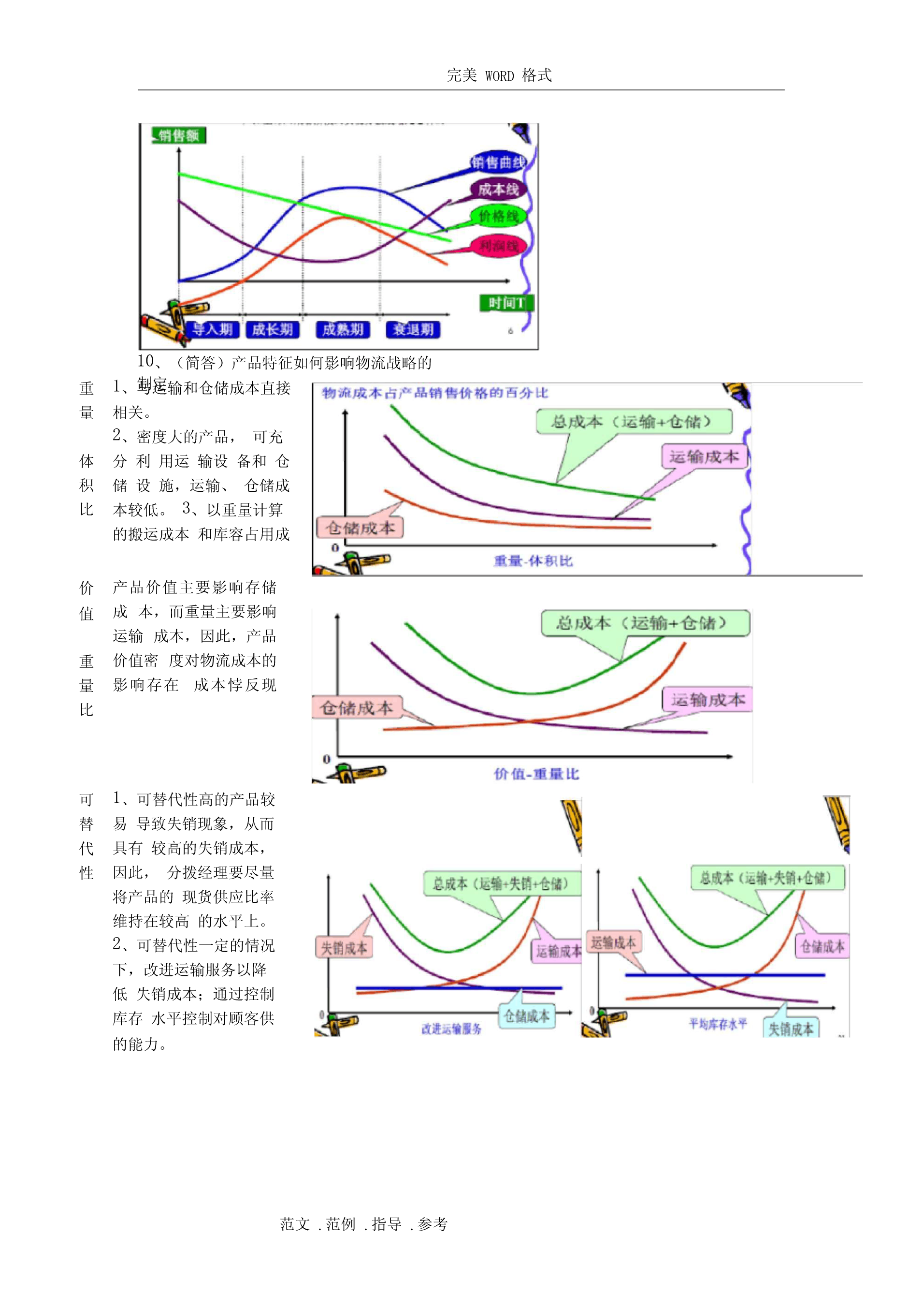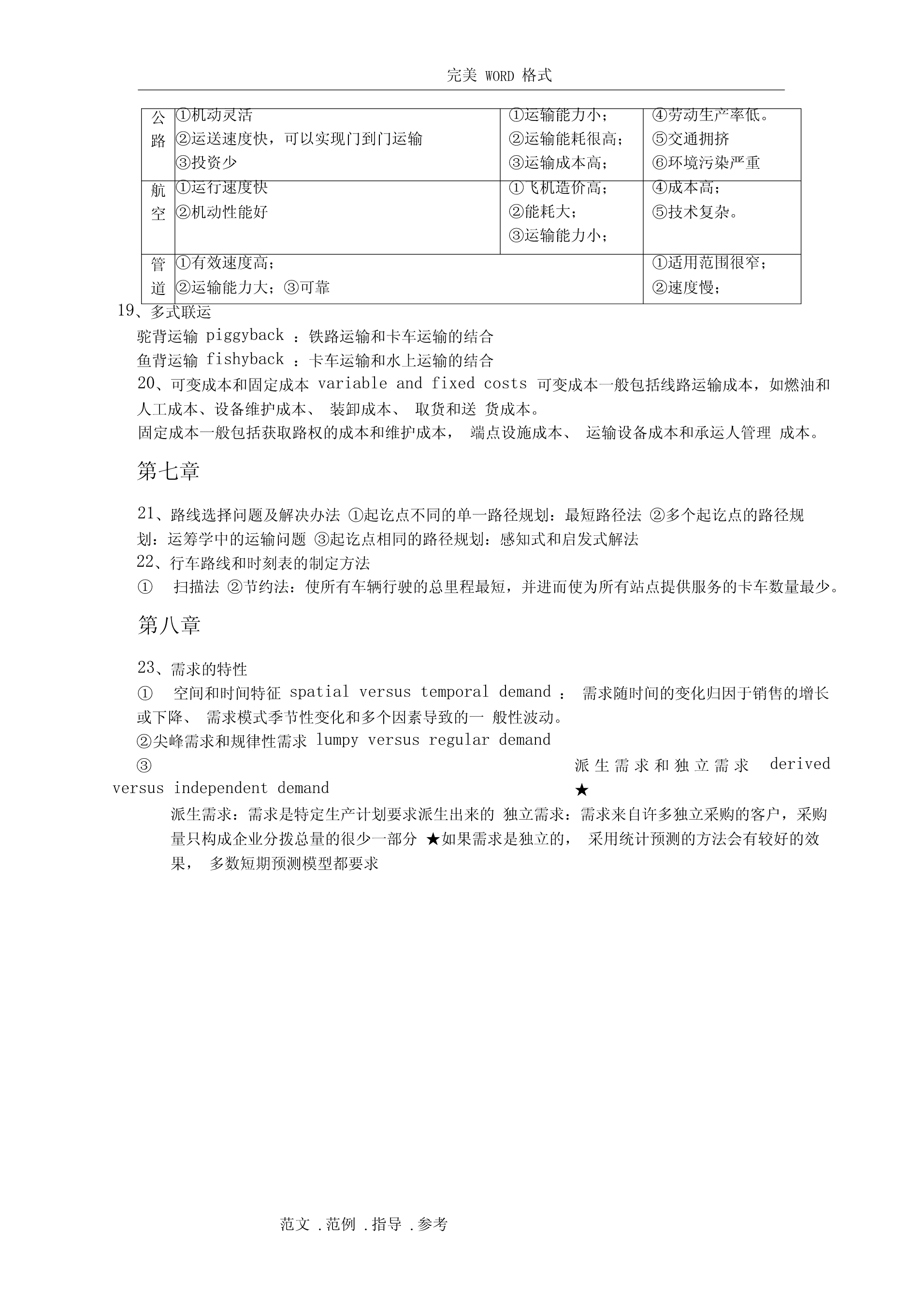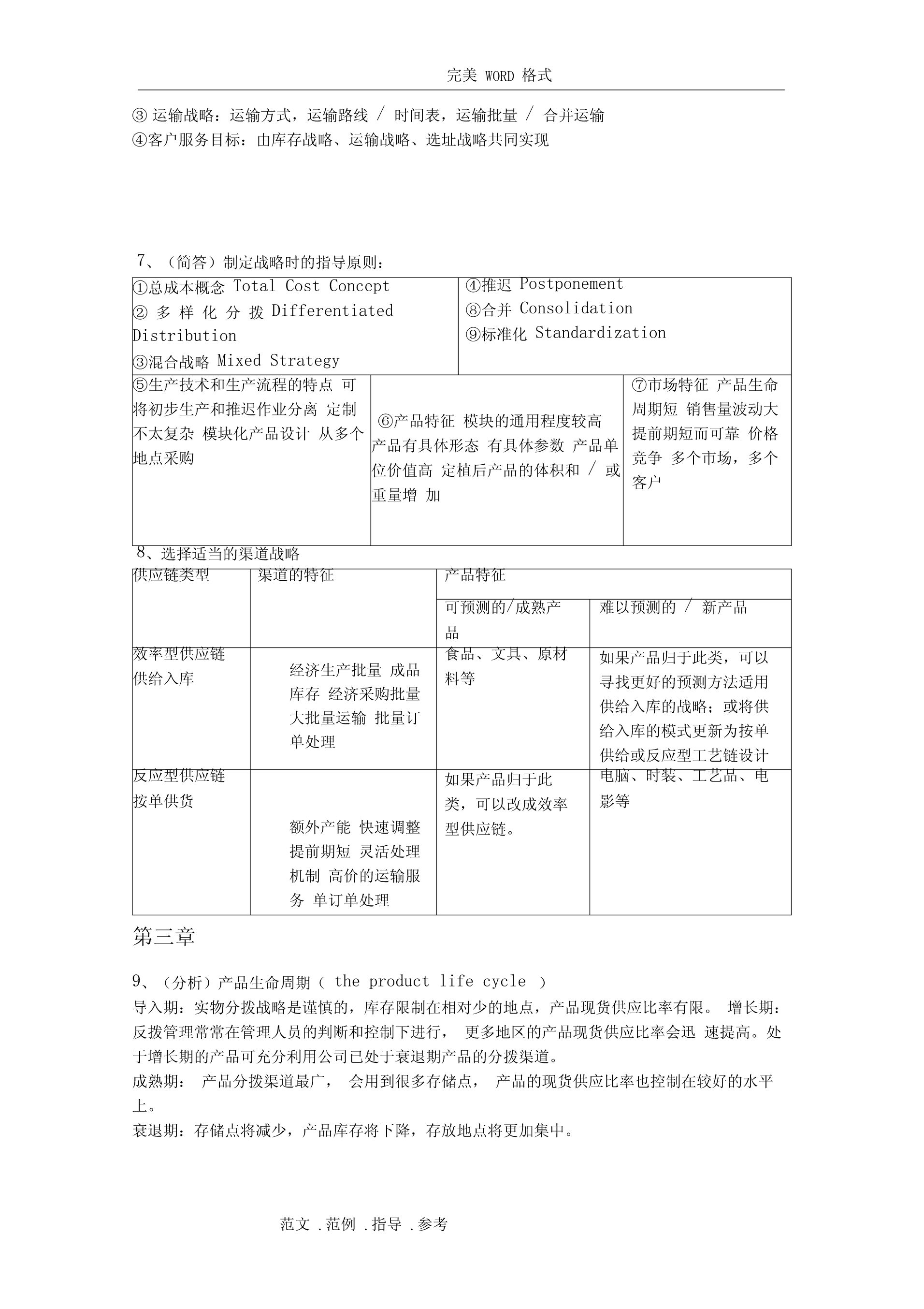 完美WORD格式阅读指南:(由于涉及排版问题,如需打印请删除该部分)1、你不努力一把,都不知道什么是绝望。2、个别知识点做了简化,一方面确实需要简化,一方面不知道要怎么考。3、涉及计算的知识点还请仔细阅读课本复习例题。4、知识点如有遗漏,或知识点内容仍不全面,或内容有误,请及时反馈给我修正和补充。第一章1、(名词)物流管理:物流管理是供应链管理的一部分,是对货物、服务及相关信息从起源地到消费地的有效率、有效益的正向和反向流动和储存进行的计划、执行和控制,以满足顾客要求。2、(名词)供应链管理:供应链管理是传统企业各部门之间,特定企业不同部门之间,供应链上各企业之间的传统的、具有战略意义的协调活动,其目的是改善个别企业,以及整个供应链各环节长期的经营绩效。3、(简答)关键性物流活动与支持性物流活动:关键客户服务确定客户对服务的需求、反应,设定客户服务水平性物运输运输方式和服务的选择、合并运输、路线、设备、理赔、运价流活库存管理原材料和产成品的存储、销售预测、存储点、JIT、拉动式推动式动信息流动和订订单-库存联系、订单信息的传输、订购规则单处理支持存储仓容决策、仓库、站台、存货摆放性物物料搬运设备、订单-拣货步骤、货物存取流活采购供应商、采购时间数量动保护性包装搬运、储存、防止灭失或损坏与生产运作部明确总量、确定生产的顺序和时间门合作信息维护信息搜集、数据分析、控制过程4、(简答)物流活动与营销活动和生产/运作活动的关系营销主要负责市场调查、促销、销售队伍管理和产品组合,创造产品的“占有”价值。生产/运作则关注产品或服务的生产,创造产品的形态价值,主要职责包括质量控制、生产计划和调度、工位设计、产能计划、维修保养作业要求和标准。物流关注的是那些赋予产品或服务时间和空间价值的活动。边缘活动是由于人为地将企业活动分割给若干独立的职能部门负责,要实现部门间协调,需要建立促进部门间合作的机制和鼓励措施第二章5、(简答)物流战略的目标:①降低成本:战略实施的目标是将与运输和存储相关的可变成本降到最低。②减少资本:战略实施的目标是使物流系统的投资最小化。③改进服务:战略一般认为企业收入取决于所提供的物流服务水平。6、(简答)物流规划主要解决的问题(物流决策三角形):①库存决策战略:库存水平、库存分布、控制方法②设施选址战略:设施的数量、规模和位置,指定各存储点的供货点,将需求分派给各存储点或供货点,自营仓储/公共仓储范文.范例.指导.参考完美WORD格式③运输战略:运输方式,运输路线/时间表,运输批量/合并运输④客户服务目标:由库存战略、运输战略、选址战略共同实现7、(简答)制定战略时的指导原则:①总成本概念TotalCostConcept④推迟Postponement②多样化分拨Differentiated⑧合并ConsolidationDistribution⑨标准化Standardization③混合战略MixedStrategy⑤生产技术和生产流程的特点可⑦市场特征产品生命将初步生产和推迟作业分离定制周期短销售量波动大⑥产品特征模块的通用程度较高不太复杂模块化产品设计从多个提前期短而可靠价格产品有具体形态有具体参数产品单地点采购竞争多个市场,多个位价值高定植后产品的体积和/或客户重量增加8、选择适当的渠道战略供应链类型渠道的特征产品特征可预测的/成熟产难以预测的/新产品品效率型供应链食品、文具、原材如果产品归于此类,可以经济生产批量成品供给入库料等寻找更好的预测方法适用库存经济采购批量供给入库的战略;或将供大批量运输批量订给入库的模式更新为按单单处理供给或反应型工艺链设计反应型供应链如果产品归于此电脑、时装、工艺品、电按单供货类,可以改成效率影等额外产能快速调整型供应链。提前期短灵活处理机制高价的运输服务单订单处理第三章9、(分析)产品生命周期(theproductlifecycle)导入期:实物分拨战略是谨慎的,库存限制在相对少的地点,产品现货供应比率有限。增长期:反拨管理常常在管理人员的判断和控制下进行,更多地区的产品现货供应比率会迅速提高。处于增长期的产品可充分利用公司已处于衰退期产品的分拨渠道。成熟期:产品分拨渠道最广,会用到很多存储点,产品的现货供应比率也控制在较好的水平上。衰退期:存储点将减少,产品库存将下降,存放地点将更加集中。范文.范例.指导.参考完美WORD格式10、(简答)产品特征如何影响物流战略的重1、与运输和仓储成本直接制定量相关。2、密度大的产品,可充体分利用