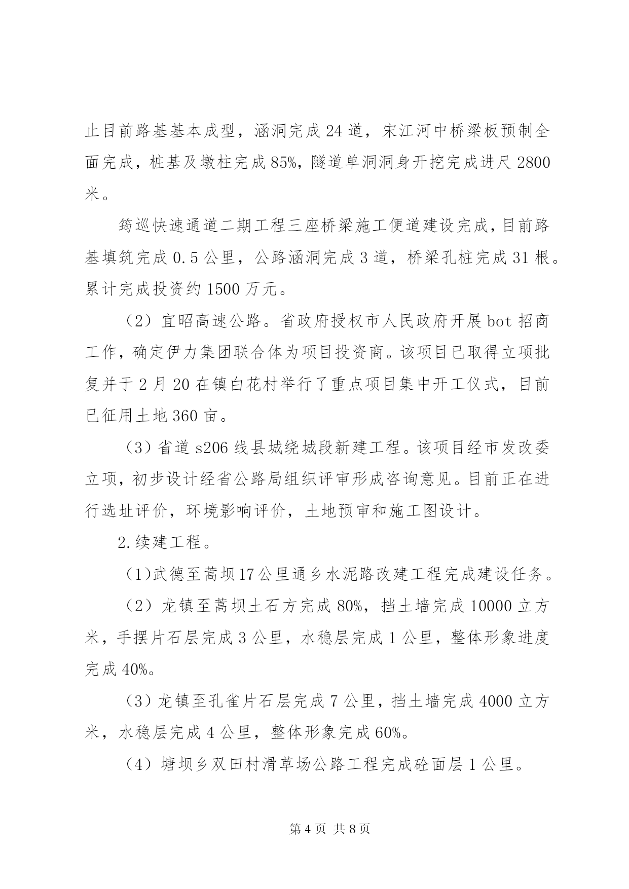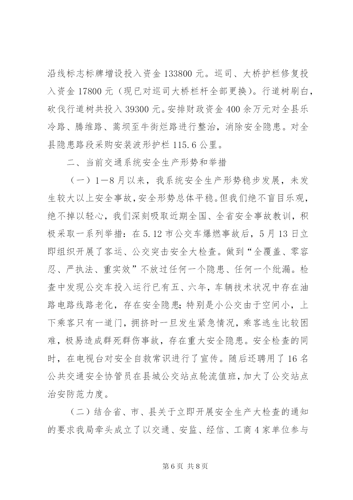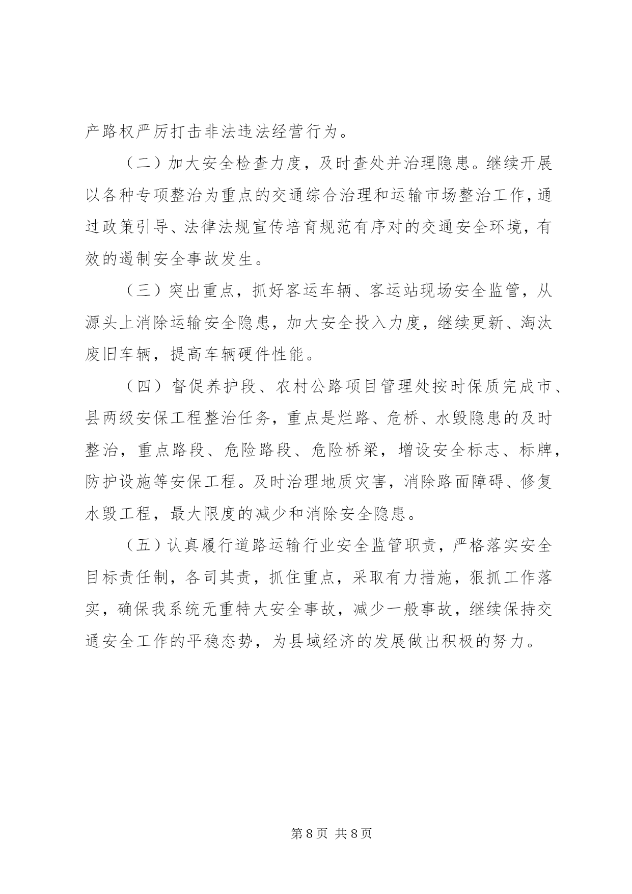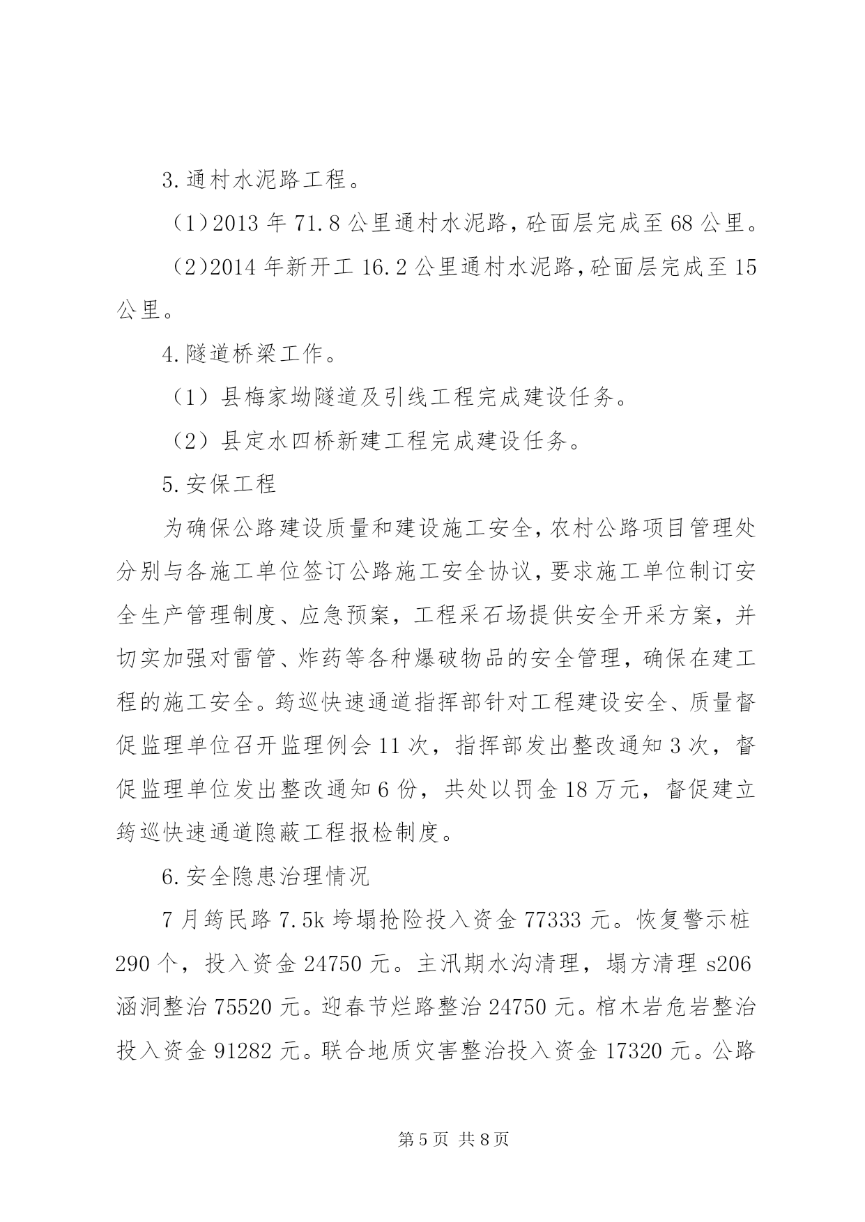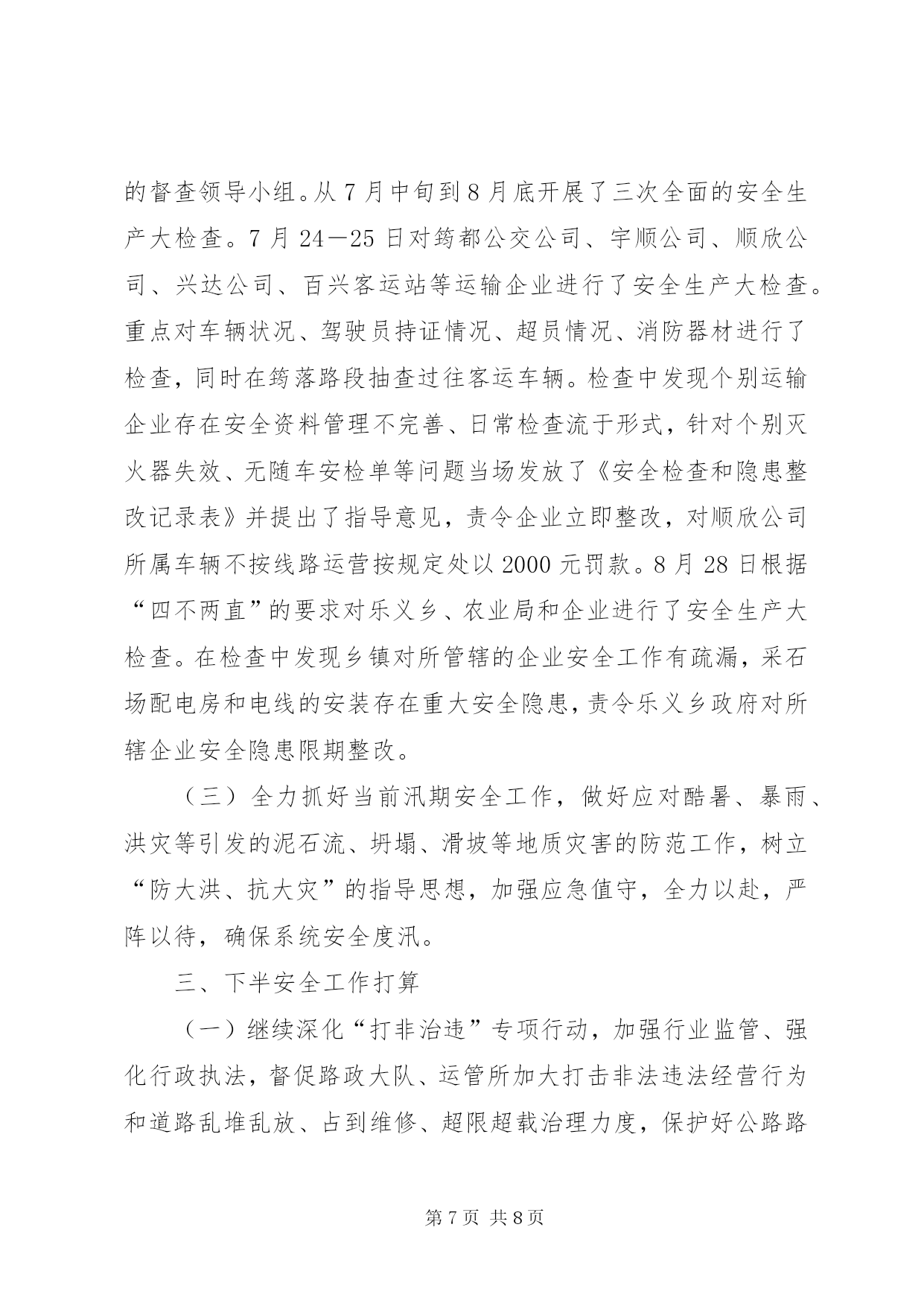 第PAGE\*Arabic\*MERGEFORMAT8页共NUMPAGES\*MERGEFORMAT8页交通局安全半年工作总结2014年交通系统安全工作继续深入开展“安全生产年”活动,以贯彻落实《国务院关于进一步加强企业安全生产工作的通知》精神,落实企业安全生产主体责任、落实“一岗双责”、牢固树立“安全责任重于泰山”的思想,以遏止重特大事故,减少一般事故,努力完成市局、县政府下达的安全工作目标任务,坚持“以人为本”科学发展观和“安全发展”指导原则,强化源头治理、现场监管和责任追究,加大隐患排查整治力度,夯实安全基层基础,有效遏止和减少安全事故的发生。一、今年1—8月交通安全工作情况(一)运输安全生产情况。完成客运量351.6万人,客运周转量17290.7万人公里,货运量243.7万吨,货运周转16099.5万吨公里,较好地完成了运输安全生产任务,主要开展了以下工作:1.年初就制定安全工作意见,对全年安全工作进行周密的安排布置,并与下属相关单位签定安全生产目标管理责任书,层层落实行政一把手负总则、分管领导负分管范围内的安全工作责任、股、所、站、段负责各自范围内的安全工作的“一岗双责”制度。2.强化客车驾驶安全培训和操作技能考核工作,加强客车驾驶员职业道德教育,严格客运车辆gps全程监控,严禁客运驾驶员超速、超时、超载和疲劳驾驶,有力地促进安全生产,提高珍爱生命、安全为本意识。3.集中开展“打非治违”专项整治工作,和交警联合检查,出动执法人员960人次,出动执法车辆210台次,发放宣传资料2300余份,检查运营车辆2100台次,打击黑车10台次,检查维修企业80余家,纠正和处理不规范经营行为12家,治理各类违法、违章行为60余台次,有效地打击非法运营的嚣张气焰。4.认真抓好春运、清明、“五一”等假日旅客运输工作。贯彻落实县委、县政府及上级交通运输主管部门有关做好节假日运输工作的指示精神,春运期间,日均投入客运车辆173辆,日均开行班次295班,开行总车次11800(次),安全疏运旅客18.6万人次。城市公交运输日均投入车辆数25辆,总开行趟次17600趟次,总客运量30.4万人次,出租汽车运输日均投入车辆数30辆,总客运量7.2万人次。未发生一起大小安全责任事故,实现春运安全零事故,圆满完成2014年春运各项工作任务。在清明节、“五一”等假日旅客运输中,科学合理调配运力,均未造成假日期间旅客滞留现象。5.狠抓“百安活动”、“安全生产月”、“汛期工作”的组织领导,认真落实全国安全生产电视电话会议精神,开展不同时期的专项安全生产大检查,作到活动有布置、有检查、有总结、有汇报,为各项活动顺利开展奠定扎实基础,确保系统安全工作稳步推进。(二)道路交通安全隐患治理情况。年初县养护段对全县县道公路水毁塌方,堡坎垮塌、涵洞畅通,水沟堵塞、警示标志、标牌、波形护栏、防撞墩是否缺损,病危害桥梁设施是否完善,进行了隐患排查。排查结果为:1、筠落路11公里处,弯急、视线受阻,存在安全隐患;2、筠落路4k+900米、5k+300米、10k+500米、11k+800桥涵垮塌,单幅通行,存在重大安全隐患;3、政高路17公里处,山体整体下滑,造成砼路面悬空,长55米,宽2米高1.5米,存在重大安全隐患;4、水腾路13公里处,大桥栏杆损坏15米,存在安全隐患;5、巡武路23公里处,堡坎垮塌17米,存在安全隐患。7月4日,我县遭遇连续几天大雨,导致镇村公路危岩严重塌方,我局紧急启动应急预案,组织交通各职能部门运管、路政、养护段投入了紧张的抗洪、抢险、保通工作,连续奋战两天两夜,采取各种应急措施,投入爆破作业人员12人,排危放炮两次,各类机械挖机、铲车6台次,行政执法车辆10台次,投入执法人员30余人次,实现了安全施工、文明施工,没有出现一起次生灾害事故。(三)在建工程安全情况1.重点项目建设。(1)至巡司快速通道一期工程。筠巡快速通道一期工程截止目前路基基本成型,涵洞完成24道,宋江河中桥梁板预制全面完成,桩基及墩柱完成85%,隧道单洞洞身开挖完成进尺2800米。筠巡快速通道二期工程三座桥梁施工便道建设完成,目前路基填筑完成0.5公里,公路涵洞完成3道,桥梁孔桩完成31根。累计完成投资约1500万元。(2)宜昭高速公路。省政府授权市人民政府开展bot招商工作,确定伊力集团联合体为项目投资商。该项目已取得立项批复并于2月20在镇白花村举行了重点项目集中开工仪式,目前已征用土地360亩。(3)省道s206线县城绕城段新建工程。该项目经市发改委立项,初步设计经省公路局组织评审形成咨询意见。目前正在进行选址评价,环境影响评价,土地预审和施工图设计。2.续建工程。(1)武德至蒿坝17公里通乡水泥路改建工程完成建设任务。(2)龙镇至蒿坝土石方完成80