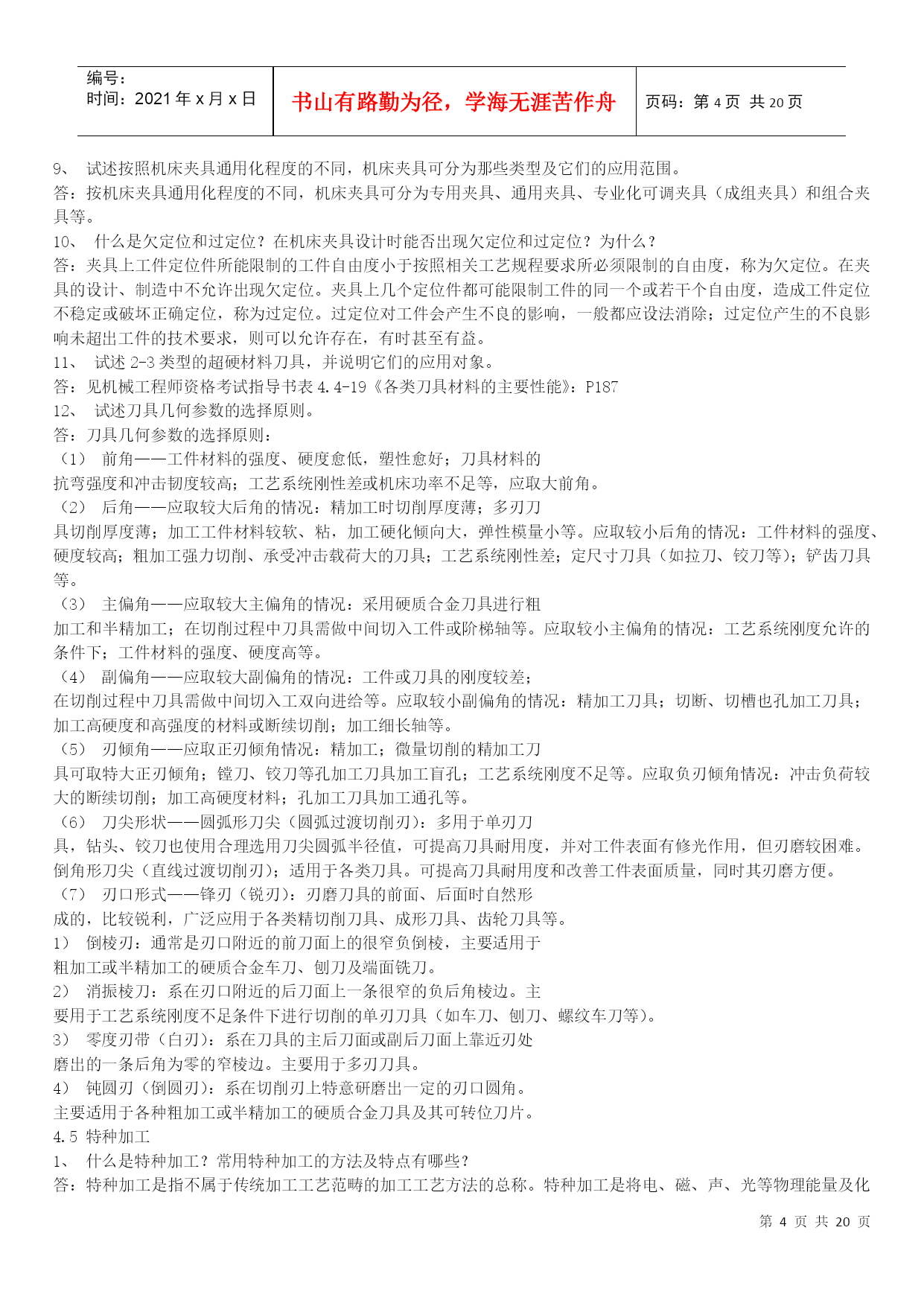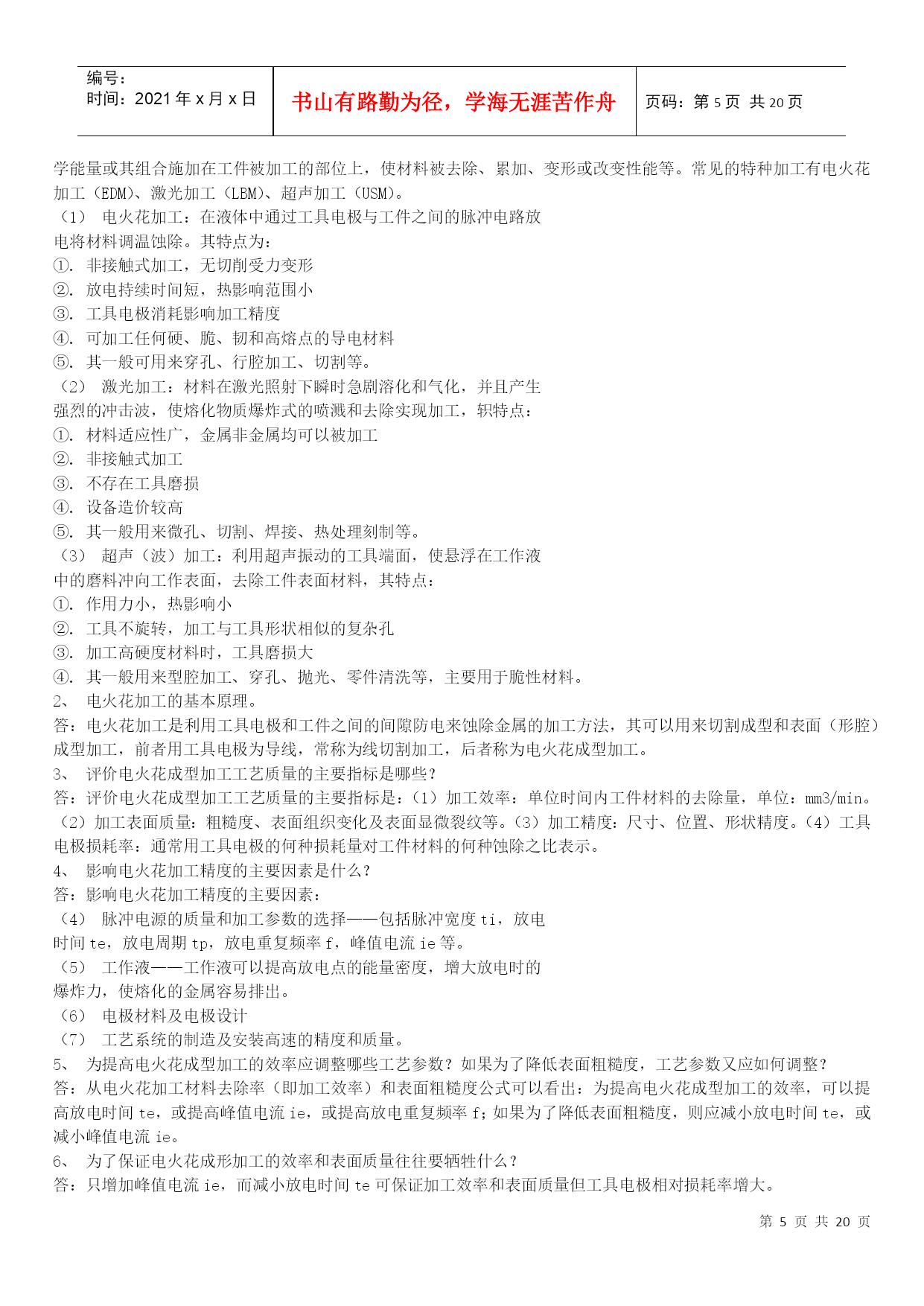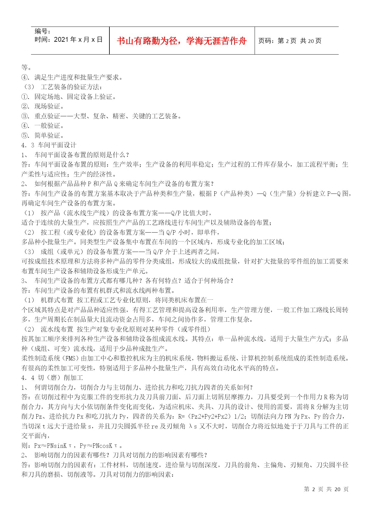 编号:时间:2021年x月x日书山有路勤为径,学海无涯苦作舟页码:第PAGE20页共NUMPAGES20页第PAGE\*MERGEFORMAT20页共NUMPAGES\*MERGEFORMAT20页(1)应小于工艺装备使用年限(2)应小于产品生产年限(3)应小于国家规定的年限4.2工艺装备的设计与制造1、工艺装备包括哪些内容?它们如何分类?答:为完成加工工艺过程必须的切削刀具、机床夹具、压力加工和铸造加工用的各种模具和工具焊接加工用的夹具和工具装配用的工具、特种加工用工具各种计量检测工具各种加工用辅具以及各种工位器具等统称为工艺装备。工艺装备的类型:(1)按制造工艺分类:切削加工用的工艺装备、装配用工艺装备、特殊加工用工艺装备、铸造用工艺装备、压力加工用工艺装备、焊接用工艺装备。(2)按标准化、通用化、组合化程度分类:标准工艺装备、通用工艺装备、专用工艺装备、组合工艺装备。2、工艺装备的选用和设计原则是什么?答:工艺装备的选用和设计原则是:①.高低耗原则;②.遵守工装设备的通化(标准化、通用化、系列化和组合化)原则;③.尽量缩短生产准备周期,满足试制和投产期要求;④.缩短工艺装备投资回收期与满足相应的技术经济指标,产品试制中的工艺装备费用不超过试制产品成本的10%-15%。产品正式生产阶段中工艺装备费用占产品成本的比例应该在5%以下。外购工艺装备、自制工艺装备与专用工艺装备的消耗成本比例应为2:1:3,以此来提高经济效益;⑤.保证快速高效与安全方便;⑥.工艺装备具有良好的结构工艺性。3、组合工艺装备(夹具)的特点是什么?答:组合工艺装备是一种带有柔性的特殊的工艺装备,其特点为:1)其完全或主要由标准元件和标准部件组装而成2)其是针对被加工工件的某道工序的要求组装而成的3)用完后可拆卸还原以备后用4)一般可组成各类机床的组合夹具、焊接、检验、装配及冲模组合夹具。4、工艺装备选择的依据是什么?选择的原则是什么?选择的程序又是什么?答:(1)工艺装备选择的依据是:工艺方案;工艺规程;工序要求与设备;本企业的现有工艺装备条件;各类工艺装备的标准、订购手册、图册及使用说明书。(2)其选择的原则是:高效低耗;标准化、通用化、系列化、组合化;生产周期短;满足投资回收期要求及经济指标;方便、省力;良好的结构工艺性,便于制造。(3)其选择的程序是:认真分析工艺方案;确定工艺装备类型(标准、通用、专用、组合)与规格;填写各种工艺装备明细表或编制工艺装备设计任务书;主管批准。5、进行工艺装备验证的目的和内容是什么?如何进行工艺装备的验证?(1)进行工艺装备验证的目的:①.保证产品零件部件加工质量符合设计和工艺要求。②.验证工艺装备的可靠性、合理性、安全性以保证产品的正常生产。(2)工艺装备验证的内容:①.安装方便、可靠、安全、总重量是否超过设备承重能力。②.保证工件正确、可靠的定位与夹紧等。③.满足工艺要求,在加工余量、切削用量符合工艺要求的条件下工艺装备刚度是否满足加工要求,刀具是否干涉等。④.满足生产进度和批量生产要求。(3)工艺装备的验证方法:①.固定场地、固定设备上验证。②.现场验证。③.重点验证——大型、复杂、精密、关键的工艺装备。④.一般验证。⑤.简单验证。4.3车间平面设计1、车间平面设备布置的原则是什么?答:车间平面设备布置的原则:生产效率;生产设备的利用率稳定;生产过程的工件库存量小,加工流程平衡;生产柔性与适应性;生产的经济性。2、如何根据产品品种P和产品Q来确定车间生产设备的布置方案?答:车间生产设备的布置方案基本取决于产品种类和生产量,根据P(产品种类)—Q(生产量)分析建立P—Q图,再确定车间生产设备的布置方案。(1)按产品(流水线生产线)的设备布置方案——Q/P比值大时,适合于连续的大量生产,应按照生产产品的工艺路线进行车间生产以及辅助设备的布置;(2)按工程(或专业化)的设备布置方案——当Q/P小时,即单件,多品种小批量生产。同类型生产设备集中布置在车间的一个区域内,形成专业化的加工区域;(3)成组(或单元)的设备布置方案——当Q/P介于上述两者之间,可按成组技术原理和方法将多种产品的零件分类成组,形成较大的成组批量,针对扩大批量的零件组的加工需要来布置车间生产设备和辅助设备形成生产单元。3、车间生产设备的布置方式都有哪几种?各有何特点?适合于何种场合?答:车间生产设备的布置有机群式和流水线两种布置。(1)机群式布置按工程或工艺专业化原则,将同类机床布置在一个区域其特点是对产品品种适应性强,有得工艺管理和提高设备利用率,生产管理方便,一般工件加工路线长周转多,生产周期长在制品量大且流动资金占用多,车间之间协作多,管理工作复杂。(2)流水线布置按生产对象专业化原则对某种零件(或零件组)按
