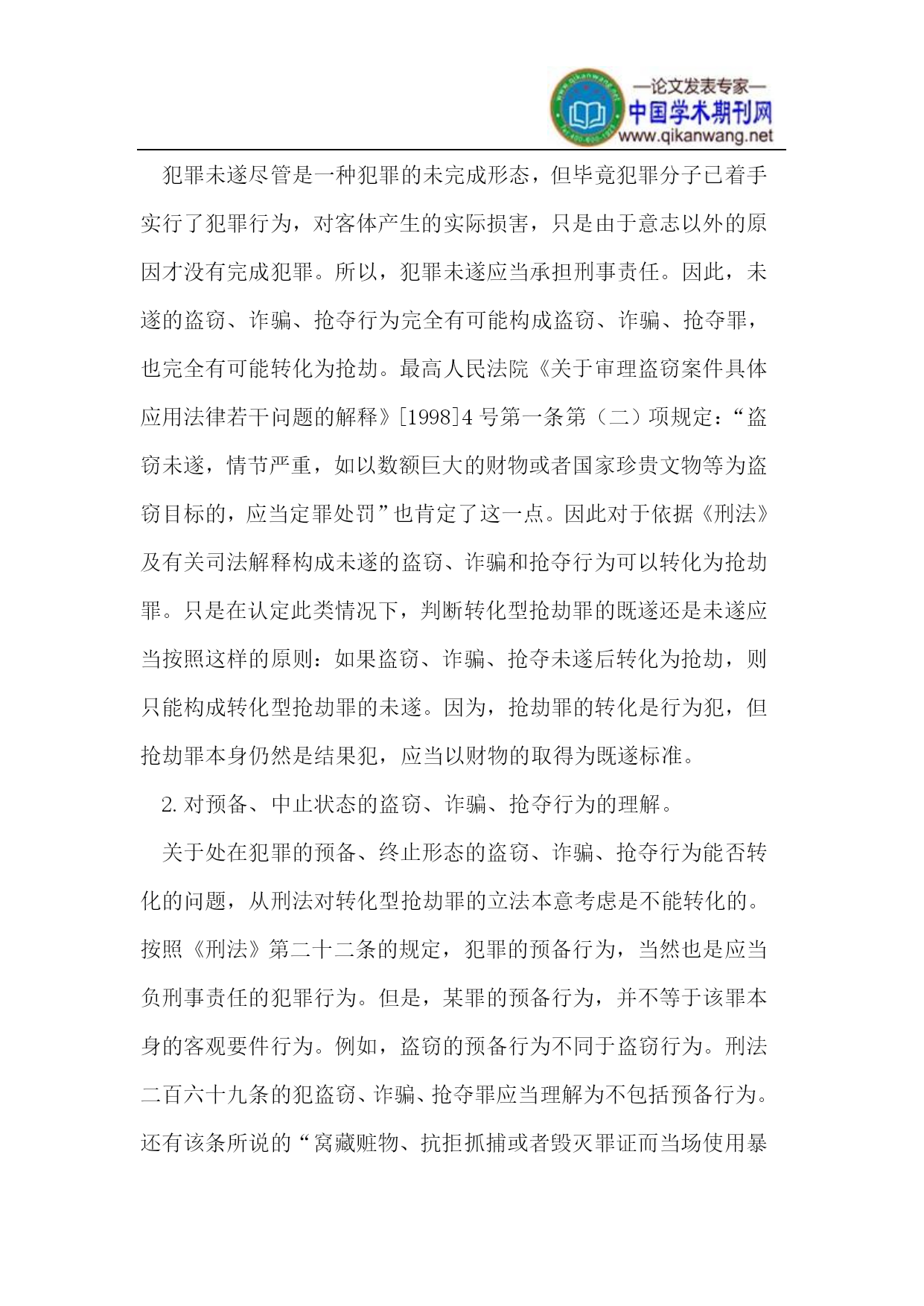 转化型抢劫的司法认定摘要:我国《刑法》第二百六十九条规定:犯盗窃、诈骗、抢夺罪,为窝藏赃物、抗拒抓捕或者毁灭罪证而当场使用暴力或者以暴力相威胁的,依照本法第二百六十三条的规定定罪处罚。“该条规定在理论上被称为转化型抢劫罪。转化型抢劫罪涉及转化前后的犯罪行为和转化的条件。转化型抢劫罪在司法实践中的认定确属难点,争议也颇多。本文将就对“犯盗窃、诈骗、抢夺罪”的理解、处在犯罪未遂、预备、中止状态的盗窃、诈骗、抢夺行为的转化问题、诈骗、抢夺行为的转化问题、转化型抢劫罪共同犯罪的认定、实施特殊类型的盗窃、诈骗、抢夺的行为能否转化为抢劫罪的认定、入户盗窃转化成入户抢劫的认定等方面的问题作一些探讨。关键词:抢劫;转化型抢劫;具体认定中图分类号:d90文献标识码:adoi:10.3969/j.issn.1672-0407.2012.07.017文章编号:1672-0407(2012)07-054-03收稿日期:2012-05-20我国《刑法》第二百六十九条规定:“犯盗窃、诈骗、抢夺罪,为窝藏赃物、抗拒抓捕或者毁灭罪证而当场使用暴力或者以暴力相威胁的,依照本法第二百六十三条的规定定罪处罚。”该条规定在理论上被称为转化型抢劫罪,也称为转化犯。关于转化型抢劫罪的司法认定在理论界和实务界一直是一个争论的热点。《刑法》第二百六十九条的规定表明了转化型抢劫罪的前提条件为行为人须先“犯盗窃、诈骗、抢夺罪”;客观条件为“当场使用暴力或以暴力相威胁”;主观条件为“为了窝藏赃物、抗拒抓捕或者毁灭罪证”。本文将就转化型抢劫罪认定过程中的以下一些方面的问题作一下探讨。一、抢劫与转化型抢劫抢劫是指以非法占有为目的,以暴力、胁迫或者其他方法,强行劫取公私财物的行为。该罪不仅侵犯了公私财产所有权,同时也侵犯了被害人的人身权利,在客观方面表现为对财物的所有人、保管人或者守护人当场使用暴力、胁迫或者其他方法,迫使其当场交出财物的行为。由于其严重的社会危害性,我国《刑法》规定只要年满14周岁即可构成本罪。该类犯罪在主观上恶性比较大,一般表现为直接故意,具有非法占有公私财物的目的。转化型抢劫是指行为人并没有实施抢劫犯罪行为,而是实施了盗窃、诈骗、抢夺行为,但因为又有特殊情节,使得社会危害性大大提高,行为性质也从本质上发生了变化,针对此种情形,我国《刑法》明文规定以抢劫罪论处。在学理上也将这种情形称之为转化犯,即指某一违法行为或者犯罪行为在实施过程中或者非法状态持续过程中,由于行为人主客观表现的变化而使整个行为的性质转化为犯罪或更为严重的犯罪,从而应以转化后的犯罪定罪或应按法律拟制的某一犯罪论处的犯罪形态。二、转化型抢劫的含义我国《刑法》第二百六十九条的规定,仅从刑法条文规定的字面意思来看,明确表述为“犯盗窃、诈骗、抢夺罪”而不是“盗窃、诈骗、抢夺行为”,由此理解为转化前的行为已经构成盗窃、诈骗、抢夺罪似乎更符合条文的字面意思,符合罪行法定的原则。但是在司法实践中,如果认为转化前提必须构成上述三罪的话,遵循罪行法定原则,对盗窃数额不大和非多次盗窃行为、诈骗及抢夺数额不大的行为,为窝藏赃物、抗拒抓捕或者毁灭罪证而当场伤害或杀人行为的案件认定为故意杀人罪或故意伤害罪的话,这样并不能真实地反映这种案件本身的特点和危害性质,可能会导致重罪轻判,从而不利于对抢劫行为的打击。因此,对于盗窃数额不大和非多次盗窃行为、诈骗及抢夺数额不大的行为,为窝藏赃物、抗拒抓捕或者毁灭罪证而当场使用暴力或者以暴力相威胁的,情节严重的,应以刑法二百六十九条认定为转化型抢劫罪。三、转化型抢劫的具体认定(一)处在犯罪未遂、预备、中止状态的盗窃、诈骗、抢夺行为的转化问题在转化型抢劫罪的认定中,对于先前行为的犯罪既遂的转化没有什么异议,但对于未遂、预备、中止状态的盗窃、诈骗、抢夺能否转化为抢劫罪,在实践中我们应该区分不同的情况区别对待。1.对未遂的盗窃、诈骗、抢夺行为的理解。犯罪未遂尽管是一种犯罪的未完成形态,但毕竟犯罪分子已着手实行了犯罪行为,对客体产生的实际损害,只是由于意志以外的原因才没有完成犯罪。所以,犯罪未遂应当承担刑事责任。因此,未遂的盗窃、诈骗、抢夺行为完全有可能构成盗窃、诈骗、抢夺罪,也完全有可能转化为抢劫。最高人民法院《关于审理盗窃案件具体应用法律若干问题的解释》[1998]4号第一条第(二)项规定:“盗窃未遂,情节严重,如以数额巨大的财物或者国家珍贵文物等为盗窃目标的,应当定罪处罚”也肯定了这一点。因此对于依据《刑法》及有关司法解释构成未遂的盗窃、诈骗和抢夺行为可以转化为抢劫罪。只是在认定此类情况下,判断转化型抢劫罪的既遂还是未遂应当按照这样的原则:如果盗窃、诈骗、抢夺未遂后转化为抢劫,则只能构成转化型抢劫罪的未遂。因为,抢劫罪的转化是行为犯