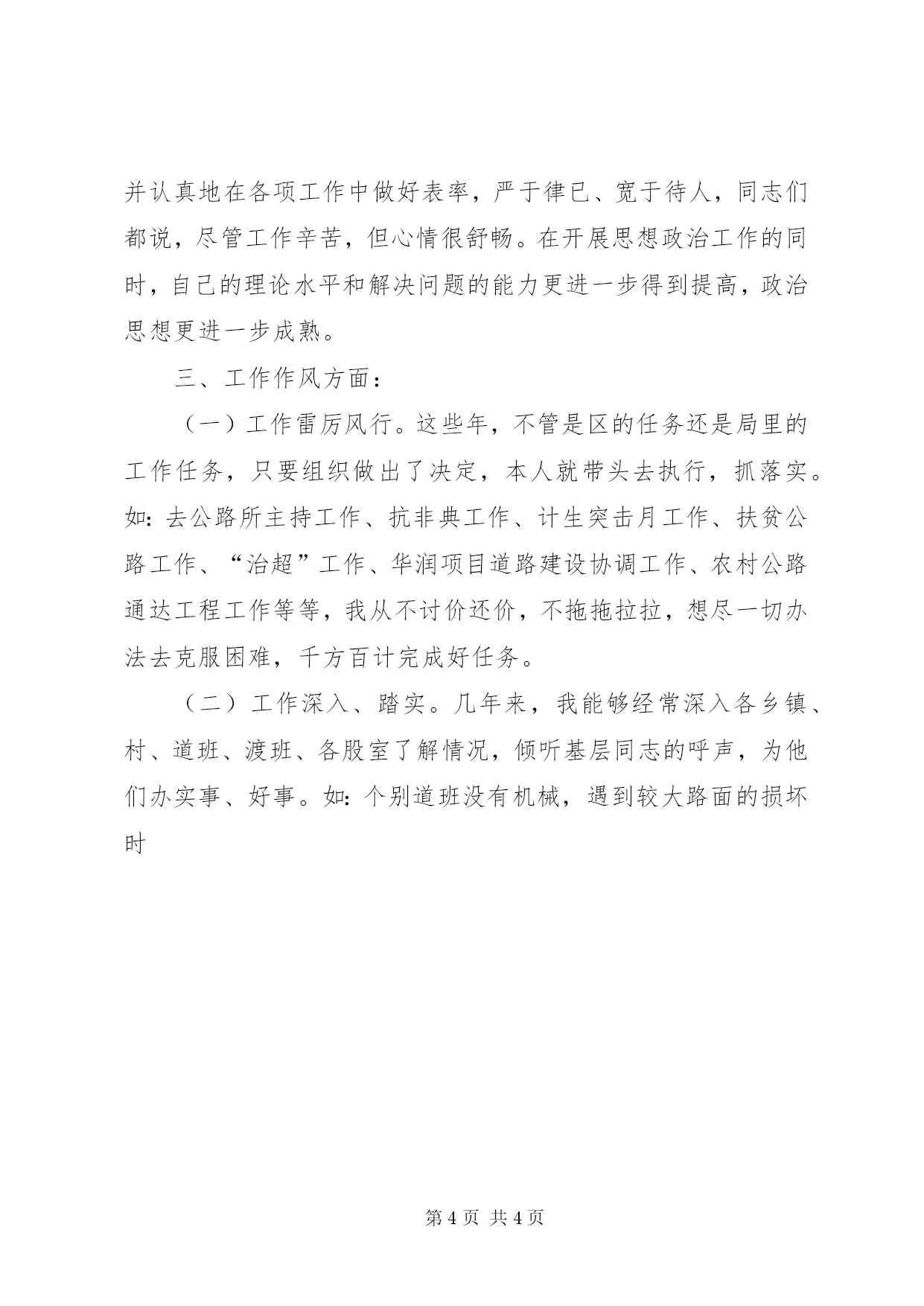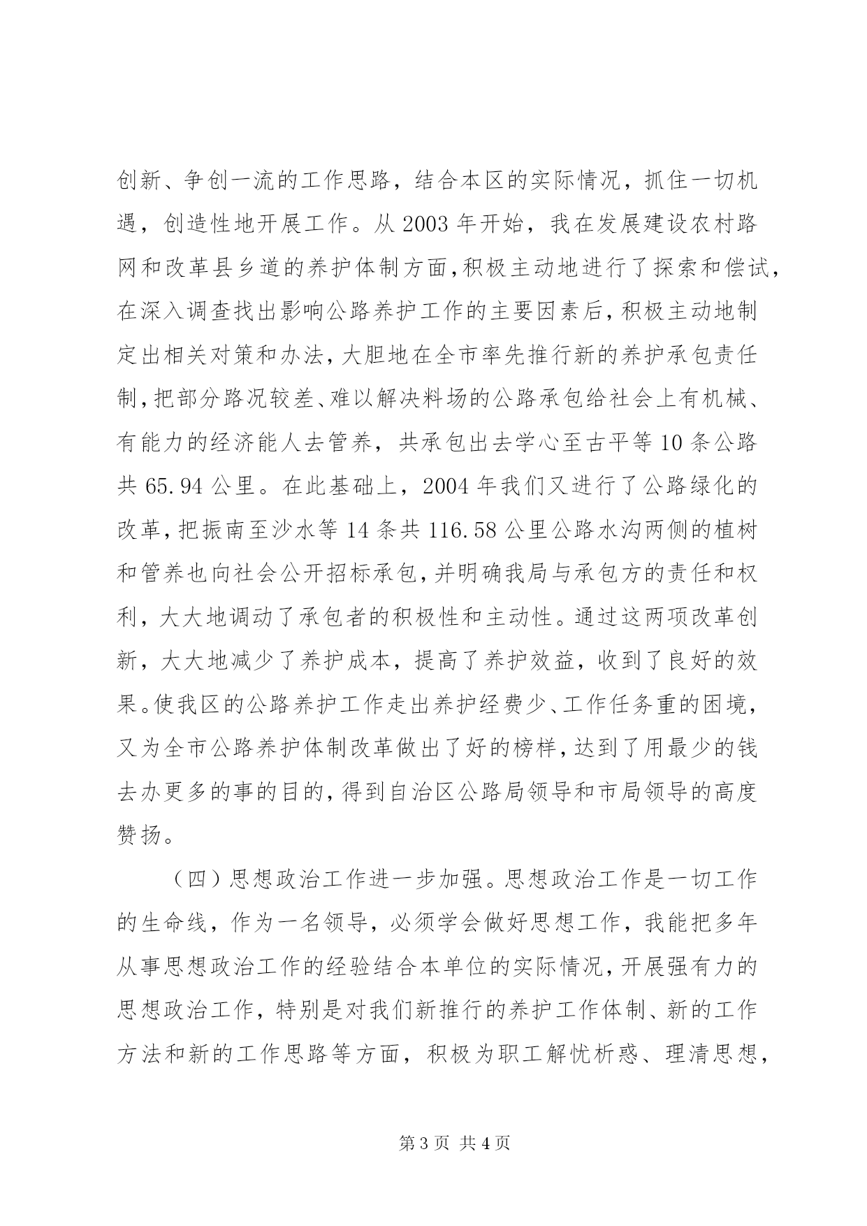 第PAGE\*Arabic\*MERGEFORMAT4页共NUMPAGES\*MERGEFORMAT4页交通局个人述职报告三年来,在区委、区政府的正确领导下,在市交通局的指导和有关领导的带领下,我作为交通局宣传、普法、综治、公路养护等工作的分管领导,能够发挥了自己的最大能力,出色地完成了上级下达的各项工作任务及领导临时交办的各项任务,并协助其他同志搞好工作,归纳起来,主要有以下几个方面。一、思想政治素质方面(一)政治理论和思想素质进一步提高。三年来,我比较注重政治理论学习,能认真地学习马列主义、毛泽东思想、邓小平理论和江总书记“三个代表”的重要思想,通过实践“三个代表”的重要活动和贯彻党的十六大报告精神以及解放思想再教育活动和今年上半年的保持共产党员先进性教育这样一系列从理论到实践、从实践到理论的活动过程,自己的理论水平有了一定的提高,思想上得到了一定的充实,党性修养也得到了全面的锻炼,政治敏锐性更进一步增强。可以说在政治理论学习,贯彻执行党的路线、方针、政策,树正气、抵歪风的意识,全心全意为人民服务的自觉性等方面都比过去有所增强。思想作风、工作作风、组织协调能力都有较大的提高。在思想上、政治上、行动上都与党中央保持了高度的一致,与区委、区政府保持高度的一致。(二)思想端正,组织纪律性进一步增强。作为一名副职领导,我能够摆正好自己的位置,不论是什么时候,在任何情况下,讲组织、讲纪律、讲原则。主动、自觉地维护好领导的威信,维护班子的团结,不拉帮结派,不搞小圈子,不搞两面派,办事光明磊落,做好参谋、助手的工作。2003年,组织安排我主持公路所工作,我坚决服从安排,并努力把公路所工作搞好。2004年,组织抽我到华润项目道路建设协调组,我都积极负责地开展各项协调工作,不怕威协,不怕辛苦,勤勤恳恳,任劳任怨,起到一名领导干部应有的作用。二、组织领导工作方面:(一)树立正确的政绩观。坚持求真务实,按照客观规律办事,讲真话、办实事、求实效;坚持“两个务必”,深入实际,深入群众,脚踏实地,艰苦奋斗;坚持科学发展观,顾全大局,统筹兼顾,立足当前,着眼长远。坚决反对弄虚作假,搞劳民伤财的“形象工程”、“政绩工程”。(二)大局意识更进一步增强。三年来,不管是作为公路所主要领导或是局分管领导,在本职范围内,每一项决策都能够做到局部利益和整体利益相兼顾,长远利益和暂时利益相照顾,党和广大人民群众的利益放在首位,做到大事讲原则,小事讲风格。(三)开拓创新的工作能力有了进一步的提高。作为分管公路所的主要领导,我在具体的工作中,深刻领会上级的指示精神,紧紧围绕我局解放思想、更新观念、求实务真,与时俱进、开拓创新、争创一流的工作思路,结合本区的实际情况,抓住一切机遇,创造性地开展工作。从2003年开始,我在发展建设农村路网和改革县乡道的养护体制方面,积极主动地进行了探索和偿试,在深入调查找出影响公路养护工作的主要因素后,积极主动地制定出相关对策和办法,大胆地在全市率先推行新的养护承包责任制,把部分路况较差、难以解决料场的公路承包给社会上有机械、有能力的经济能人去管养,共承包出去学心至古平等10条公路共65.94公里。在此基础上,2004年我们又进行了公路绿化的改革,把振南至沙水等14条共116.58公里公路水沟两侧的植树和管养也向社会公开招标承包,并明确我局与承包方的责任和权利,大大地调动了承包者的积极性和主动性。通过这两项改革创新,大大地减少了养护成本,提高了养护效益,收到了良好的效果。使我区的公路养护工作走出养护经费少、工作任务重的困境,又为全市公路养护体制改革做出了好的榜样,达到了用最少的钱去办更多的事的目的,得到自治区公路局领导和市局领导的高度赞扬。(四)思想政治工作进一步加强。思想政治工作是一切工作的生命线,作为一名领导,必须学会做好思想工作,我能把多年从事思想政治工作的经验结合本单位的实际情况,开展强有力的思想政治工作,特别是对我们新推行的养护工作体制、新的工作方法和新的工作思路等方面,积极为职工解忧析惑、理清思想,并认真地在各项工作中做好表率,严于律已、宽于待人,同志们都说,尽管工作辛苦,但心情很舒畅。在开展思想政治工作的同时,自己的理论水平和解决问题的能力更进一步得到提高,政治思想更进一步成熟。三、工作作风方面:(一)工作雷厉风行。这些年,不管是区的任务还是局里的工作任务,只要组织做出了决定,本人就带头去执行,抓落实。如:去公路所主持工作、抗非典工作、计生突击月工作、扶贫公路工作、“治超”工作、华润项目道路建设协调工作、农村公路通达工程工作等等,我从不讨价还价,不拖拖拉拉,想尽一切办法去克服困难,千方百计完成好任务。(二)工作深入、踏实。几年来,我能够经常深入各乡镇、村、道班、渡班、各股室了解情况,倾听基层同志的呼声,