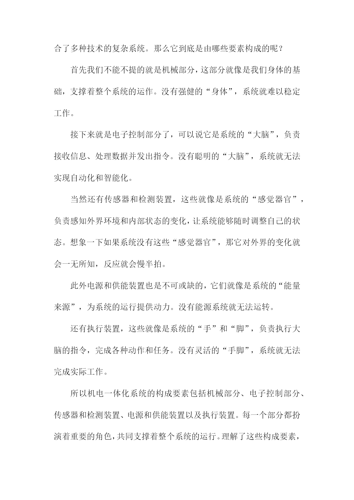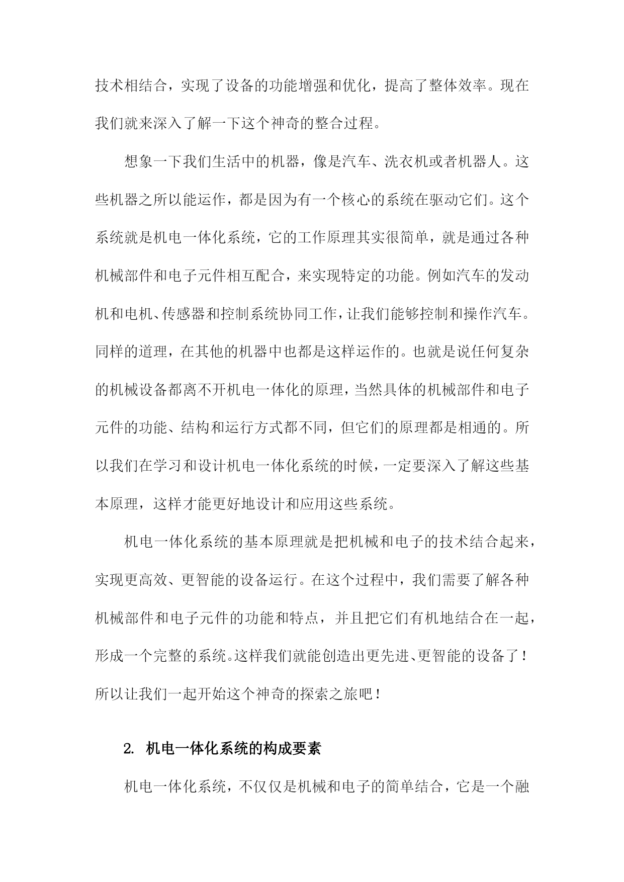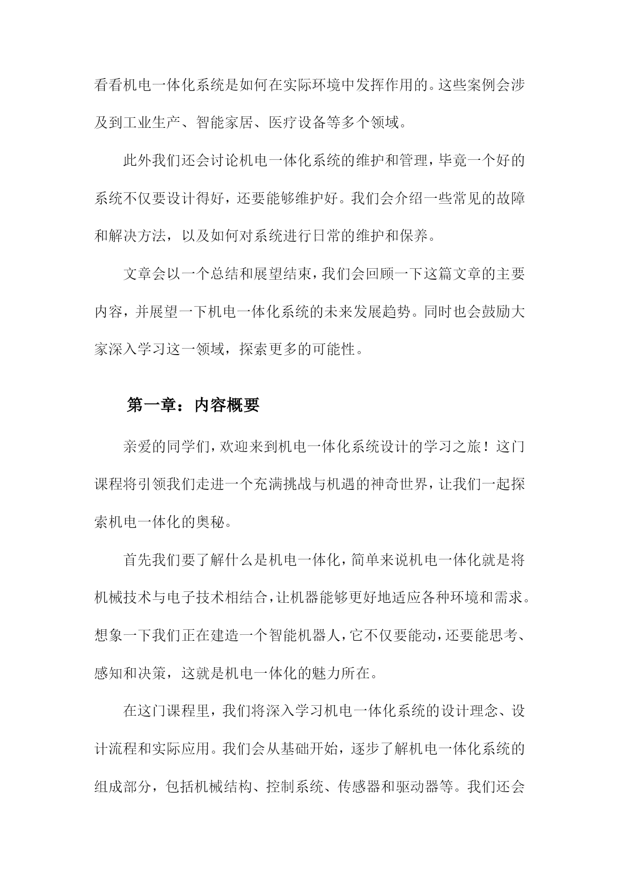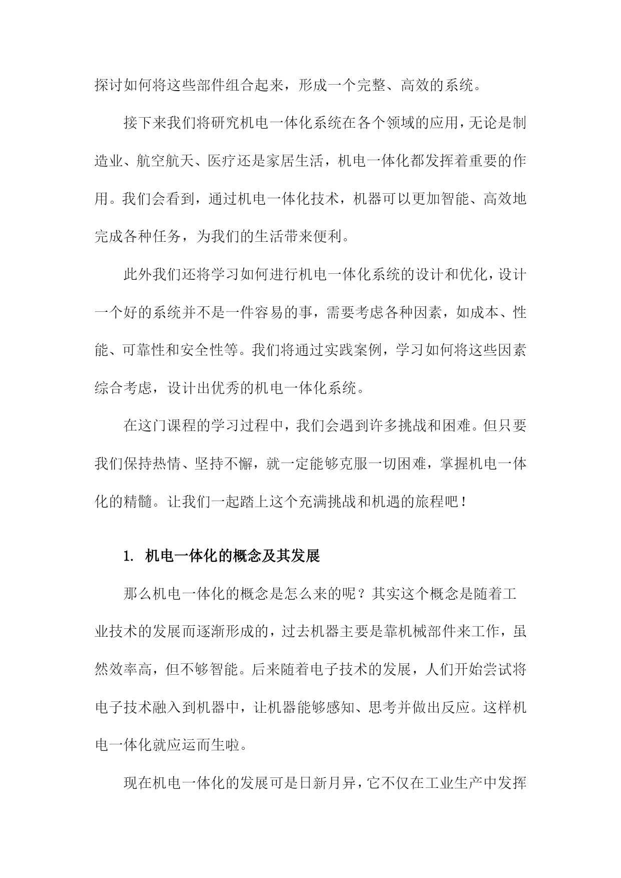 机电一体化系统设计课件一、《机电一体化系统设计课件》文章大纲欢迎各位走进《机电一体化系统设计课件》的学习之旅。这篇文章大纲将引领我们共同探索这一领域的奥秘,从基础知识到高级应用,一步步深入了解机电一体化的魅力。首先文章开头我们先从概述部分开始,这里我们会简单介绍一下机电一体化是什么,它的重要性以及它在现代工业中的应用。这部分内容会用一个通俗易懂的例子来说明这个概念,让大家有一个初步的认识。接下来我们会深入探讨机电一体化系统的基本构成,就像我们搭建积木一样,了解每个组成部分的功能和特点是非常重要的。我们会介绍机械结构、电气控制、传感器、执行器等关键部分,并解释它们是如何协同工作的。然后我们会进入设计的环节,在这一部分,我们会讲解如何根据实际需求进行机电一体化系统的设计。从需求分析、方案设计、系统仿真到最后的优化调整,每一步都会详细讲解,并配以实例让大家更好地理解。当然实践是检验真理的唯一标准,我们会介绍一些实际应用案例,看看机电一体化系统是如何在实际环境中发挥作用的。这些案例会涉及到工业生产、智能家居、医疗设备等多个领域。此外我们还会讨论机电一体化系统的维护和管理,毕竟一个好的系统不仅要设计得好,还要能够维护好。我们会介绍一些常见的故障和解决方法,以及如何对系统进行日常的维护和保养。文章会以一个总结和展望结束,我们会回顾一下这篇文章的主要内容,并展望一下机电一体化系统的未来发展趋势。同时也会鼓励大家深入学习这一领域,探索更多的可能性。第一章:内容概要亲爱的同学们,欢迎来到机电一体化系统设计的学习之旅!这门课程将引领我们走进一个充满挑战与机遇的神奇世界,让我们一起探索机电一体化的奥秘。首先我们要了解什么是机电一体化,简单来说机电一体化就是将机械技术与电子技术相结合,让机器能够更好地适应各种环境和需求。想象一下我们正在建造一个智能机器人,它不仅要能动,还要能思考、感知和决策,这就是机电一体化的魅力所在。在这门课程里,我们将深入学习机电一体化系统的设计理念、设计流程和实际应用。我们会从基础开始,逐步了解机电一体化系统的组成部分,包括机械结构、控制系统、传感器和驱动器等。我们还会探讨如何将这些部件组合起来,形成一个完整、高效的系统。接下来我们将研究机电一体化系统在各个领域的应用,无论是制造业、航空航天、医疗还是家居生活,机电一体化都发挥着重要的作用。我们会看到,通过机电一体化技术,机器可以更加智能、高效地完成各种任务,为我们的生活带来便利。此外我们还将学习如何进行机电一体化系统的设计和优化,设计一个好的系统并不是一件容易的事,需要考虑各种因素,如成本、性能、可靠性和安全性等。我们将通过实践案例,学习如何将这些因素综合考虑,设计出优秀的机电一体化系统。在这门课程的学习过程中,我们会遇到许多挑战和困难。但只要我们保持热情、坚持不懈,就一定能够克服一切困难,掌握机电一体化的精髓。让我们一起踏上这个充满挑战和机遇的旅程吧!1.机电一体化的概念及其发展那么机电一体化的概念是怎么来的呢?其实这个概念是随着工业技术的发展而逐渐形成的,过去机器主要是靠机械部件来工作,虽然效率高,但不够智能。后来随着电子技术的发展,人们开始尝试将电子技术融入到机器中,让机器能够感知、思考并做出反应。这样机电一体化就应运而生啦。现在机电一体化的发展可是日新月异,它不仅在工业生产中发挥着重要作用,还深入到我们的日常生活中。比如我们的智能手机、智能家居、无人驾驶汽车等等,都是机电一体化的典型应用。可以说机电一体化技术已经改变了我们的生活,让我们生活变得更加便捷、舒适。机电一体化是一个很有前景的技术领域,它不仅融合了机械技术和电子技术的优点,还在不断地发展创新。相信未来机电一体化会有更多的应用,为我们带来更多的惊喜和便利。那么接下来我们就详细了解一下机电一体化系统的设计理念吧。2.机电一体化设计的重要性接下来我们来聊聊机电一体化设计的重要性,可以说机电一体化已经成为现代制造业的核心技术之一,而机电一体化设计则是这个领域中的关键环节。想象一下如果一个机器能够集机械、电子、控制等多方面的技术于一身,那将会是多么神奇的一件事!而这就是机电一体化设计给我们带来的魅力。那么为什么机电一体化设计这么重要呢?首先随着科技的发展,人们对于产品的质量和生产效率的要求越来越高。传统的机械生产方式已经无法满足现代制造业的需求,而机电一体化设计则能够大大提升生产效率,降低生产成本,提高产品质量。比如通过精确的控制系统,机器可以更加精准地完成任务,减少人工操作的误差。同时机电一体化设计还能够让机器具备更多的功能,满足不同的生产需求。因此可以说机电一体化设计在现代制造业中的地位越来越重要。它不仅能够帮助企业提高生产效率和产品质量,还能够为企业节省大量的成本。所