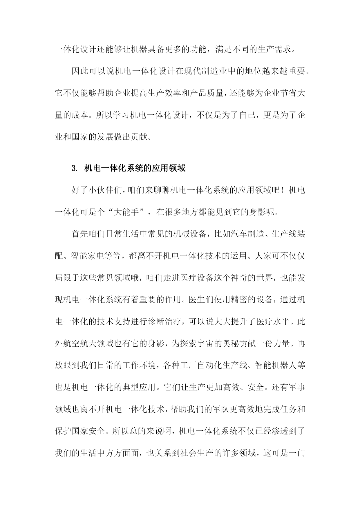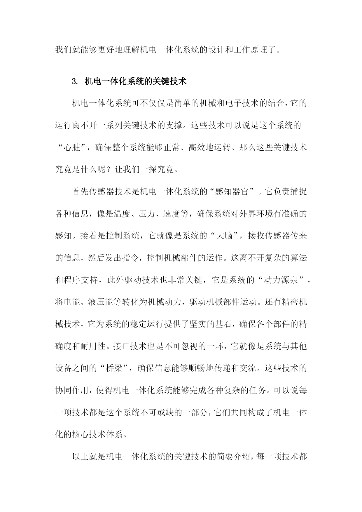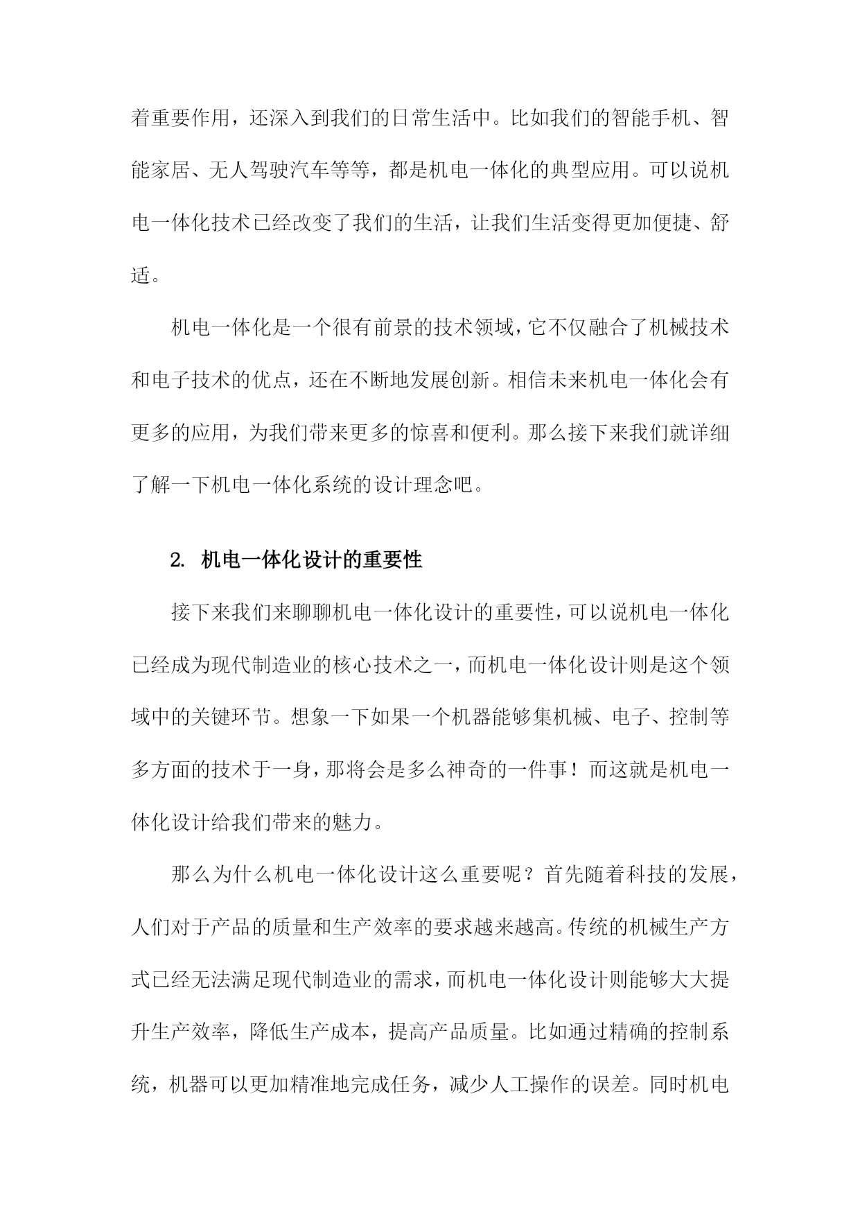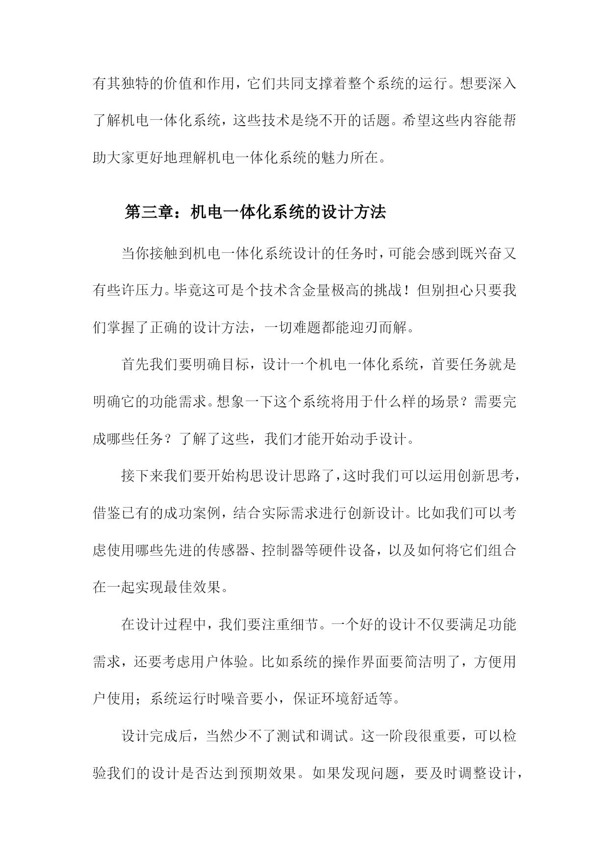 机电一体化系统设计课件一、《机电一体化系统设计课件》文章大纲欢迎各位走进《机电一体化系统设计课件》的学习之旅。这篇文章大纲将引领我们共同探索这一领域的奥秘,从基础知识到高级应用,一步步深入了解机电一体化的魅力。首先文章开头我们先从概述部分开始,这里我们会简单介绍一下机电一体化是什么,它的重要性以及它在现代工业中的应用。这部分内容会用一个通俗易懂的例子来说明这个概念,让大家有一个初步的认识。接下来我们会深入探讨机电一体化系统的基本构成,就像我们搭建积木一样,了解每个组成部分的功能和特点是非常重要的。我们会介绍机械结构、电气控制、传感器、执行器等关键部分,并解释它们是如何协同工作的。然后我们会进入设计的环节,在这一部分,我们会讲解如何根据实际需求进行机电一体化系统的设计。从需求分析、方案设计、系统仿真到最后的优化调整,每一步都会详细讲解,并配以实例让大家更好地理解。当然实践是检验真理的唯一标准,我们会介绍一些实际应用案例,看看机电一体化系统是如何在实际环境中发挥作用的。这些案例会涉及到工业生产、智能家居、医疗设备等多个领域。此外我们还会讨论机电一体化系统的维护和管理,毕竟一个好的系统不仅要设计得好,还要能够维护好。我们会介绍一些常见的故障和解决方法,以及如何对系统进行日常的维护和保养。文章会以一个总结和展望结束,我们会回顾一下这篇文章的主要内容,并展望一下机电一体化系统的未来发展趋势。同时也会鼓励大家深入学习这一领域,探索更多的可能性。第一章:内容概要亲爱的同学们,欢迎来到机电一体化系统设计的学习之旅!这门课程将引领我们走进一个充满挑战与机遇的神奇世界,让我们一起探索机电一体化的奥秘。首先我们要了解什么是机电一体化,简单来说机电一体化就是将机械技术与电子技术相结合,让机器能够更好地适应各种环境和需求。想象一下我们正在建造一个智能机器人,它不仅要能动,还要能思考、感知和决策,这就是机电一体化的魅力所在。在这门课程里,我们将深入学习机电一体化系统的设计理念、设计流程和实际应用。我们会从基础开始,逐步了解机电一体化系统的组成部分,包括机械结构、控制系统、传感器和驱动器等。我们还会探讨如何将这些部件组合起来,形成一个完整、高效的系统。接下来我们将研究机电一体化系统在各个领域的应用,无论是制造业、航空航天、医疗还是家居生活,机电一体化都发挥着重要的作用。我们会看到,通过机电一体化技术,机器可以更加智能、高效地完成各种任务,为我们的生活带来便利。此外我们还将学习如何进行机电一体化系统的设计和优化,设计一个好的系统并不是一件容易的事,需要考虑各种因素,如成本、性能、可靠性和安全性等。我们将通过实践案例,学习如何将这些因素综合考虑,设计出优秀的机电一体化系统。在这门课程的学习过程中,我们会遇到许多挑战和困难。但只要我们保持热情、坚持不懈,就一定能够克服一切困难,掌握机电一体化的精髓。让我们一起踏上这个充满挑战和机遇的旅程吧!1.机电一体化的概念及其发展那么机电一体化的概念是怎么来的呢?其实这个概念是随着工业技术的发展而逐渐形成的,过去机器主要是靠机械部件来工作,虽然效率高,但不够智能。后来随着电子技术的发展,人们开始尝试将电子技术融入到机器中,让机器能够感知、思考并做出反应。这样机电一体化就应运而生啦。现在机电一体化的发展可是日新月异,它不仅在工业生产中发挥着重要作用,还深入到我们的日常生活中。比如我们的智能手机、智能家居、无人驾驶汽车等等,都是机电一体化的典型应用。可以说机电一体化技术已经改变了我们的生活,让我们生活变得更加便捷、舒适。机电一体化是一个很有前景的技术领域,它不仅融合了机械技术和电子技术的优点,还在不断地发展创新。相信未来机电一体化会有更多的应用,为我们带来更多的惊喜和便利。那么接下来我们就详细了解一下机电一体化系统的设计理念吧。2.机电一体化设计的重要性接下来我们来聊聊机电一体化设计的重要性,可以说机电一体化已经成为现代制造业的核心技术之一,而机电一体化设计则是这个领域中的关键环节。想象一下如果一个机器能够集机械、电子、控制等多方面的技术于一身,那将会是多么神奇的一件事!而这就是机电一体化设计给我们带来的魅力。那么为什么机电一体化设计这么重要呢?首先随着科技的发展,人们对于产品的质量和生产效率的要求越来越高。传统的机械生产方式已经无法满足现代制造业的需求,而机电一体化设计则能够大大提升生产效率,降低生产成本,提高产品质量。比如通过精确的控制系统,机器可以更加精准地完成任务,减少人工操作的误差。同时机电一体化设计还能够让机器具备更多的功能,满足不同的生产需求。因此可以说机电一体化设计在现代制造业中的地位越来越重要。它不仅能够帮助企业提高生产效率和产品质量,还能够为企业节省大量的成本。所