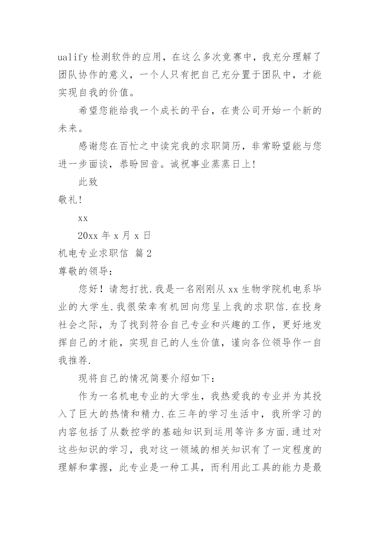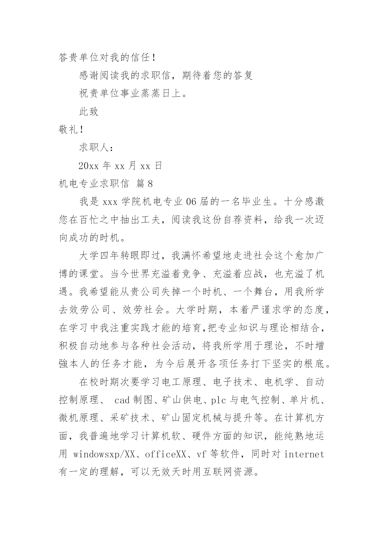 机电专业求职信机电专业求职信集合8篇时间一晃而过,新一轮的招聘又在朝我们招手,这时是不是该好好写一封求职信了呢?写求职信需要注意哪些问题呢?以下是小编为大家收集的机电专业求职信8篇,供大家参考借鉴,希望可以帮助到有需要的朋友。机电专业求职信篇1尊敬的公司领导:您好!非常感谢您在百忙之中审阅我的求职材料,为一位满腔热情的大学生开启一扇希望之门,给我一个迈向成功的机会,相信我这样一个热血的求职者是一定不会让您失望的。扎实的专业知识是成功的根本。我深知这一点,充分利用大学四年时间,认真学习,并且取得了良好的成绩。通过大学四年的学习,不仅使我掌握了机械行业的相关理论,而且使我具备了较强的动手能力和设计能力,曾多次参加全国类专业知识竞赛,并获得相应奖励。一个人经历越多,见识越广,能力越强。在学院办公室担任副主任期间,我充分掌握了Word、EXCEL等办公软件的应用。在大学期间,我利用课余时间自学通过了计算机C语言二级。通过多次参加全国类竞赛,我掌握了Proe三维软件、CAD及caxa二维软件、Geomagicstudio逆向软件、Geomagic中专生机电系求职信ualify检测软件的应用,在这么多次竞赛中,我充分理解了团队协作的意义,一个人只有把自己充分置于团队中,才能实现自我的价值。希望您能给我一个成长的平台,在贵公司开始一个新的未来。感谢您在百忙之中读完我的求职简历,非常盼望能与您进一步面谈,恭盼回音。诚祝事业蒸蒸日上!此致敬礼!xx20xx年x月x日机电专业求职信篇2尊敬的领导:您好!请恕打扰.我是一名刚刚从xx生物学院机电系毕业的大学生.我很荣幸有机回向您呈上我的求职信.在投身社会之际,为了找到符合自己专业和兴趣的工作,更好地发挥自己的才能,实现自己的人生价值,谨向各位领导作一自我推荐.现将自己的情况简要介绍如下:作为一名机电专业的大学生,我热爱我的专业并为其投入了巨大的热情和精力.在三年的学习生活中,我所学习的内容包括了从数控学的基础知识到运用等许多方面.通过对这些知识的学习,我对这一领域的相关知识有了一定程度的理解和掌握,此专业是一种工具,而利用此工具的能力是最重要的,在与课程同步进行的各种相关时践和实习中,具有了一定的实际操作能力和技术.在学校工作中,加强锻炼处世能力,学习管理知识,吸收管理经验.我正处于人生中精力充沛的时期,我渴望在更广阔的天地里展露自己的才能,我不满足与现有的知识水平,期望在实践中得到锻炼和提高,因此我希望能够加入你们的单位.我会踏踏实实的做好属于自己的一份工作,竭尽全力的在工作中取得好的`成绩.我相信经过自己的勤奋和努力,一定会做出应有的贡献.刚谢您在百忙之中所给与我的关注,愿贵单位事业蒸蒸日上,屡创佳绩,祝您的事业白尺竿头,更进一步!希望各位领导能够对我予以考虑,我热切期盼你们的回音.谢谢!此致敬礼!求职人:20xx年xx月xx日机电专业求职信篇3尊敬的xxx:我是黑龙江科技学院机电专业08届的一名毕业生。非常感谢您在百忙之中抽出时间,阅读我这份自荐材料,给我一次迈向成功的机会。大学四年转眼即过,我满怀希望地走进社会这个更加博大的课堂。当今世界充满着竞争、充满着挑战,也充满了机遇。我希望能从贵公司得到一个机会、一个舞台,用我所学去服务公司,服务社会。大学期间,本着严谨求学的态度,在学习中我注重实际能力的培养,把专业知识与实践相结合,积极主动地参加各种社会活动,将我所学用于实践,不断增強自己的工作能力,为今后开展各项工作打下坚实的基础。在校期间主要学习电工原理、电子技术、电机学、自动控制原理、CAD制图、矿山供电、PLC与电气控制、单片机、微机原理、采矿技术、矿山固定机械与提升等。在计算机方面,我广泛地学习计算机软、硬件方面的知识,能熟练地运用Windows98/20xx、Office20xx、VF等软件,同时对Internet有一定的了解,能够有效地利用互联网资源。最后,祝愿贵单位事业蒸蒸日上!此致敬礼!xxx日期:20xx年x月x日机电专业求职信篇4尊敬的贵公司领导:你好!我的名字叫xxx,我是20xx级机电一体化专业。毕业将至,我满怀期待的为自己的第一份工作准备着,等待着我继续努力奋斗、迎接挑战。时光飞梭,转眼两年过去了。怀着理想即将离开学校,走上工作岗位。职校两年是我思想、知识结构及心理、生长成熟的两年。在职教中心浓厚的学习、创新氛围中,熔融其中两年使我成为一名复合型人才。在校的主要任务是学习,所以我掌握了较强的专业知识,并把理论知识运用到实践中去,期末总评成绩名列前茅。同时加入学校校团委锻炼自己,让自己各方面都有很大的提高,时刻严格要求自己,积极参加学校和班上组织的活动。我所学专业是机电一体化,我对自己所学的专业有着浓厚的兴趣。经过两年的学习掌握了机电一体化专业需要掌握的基本知识。一名