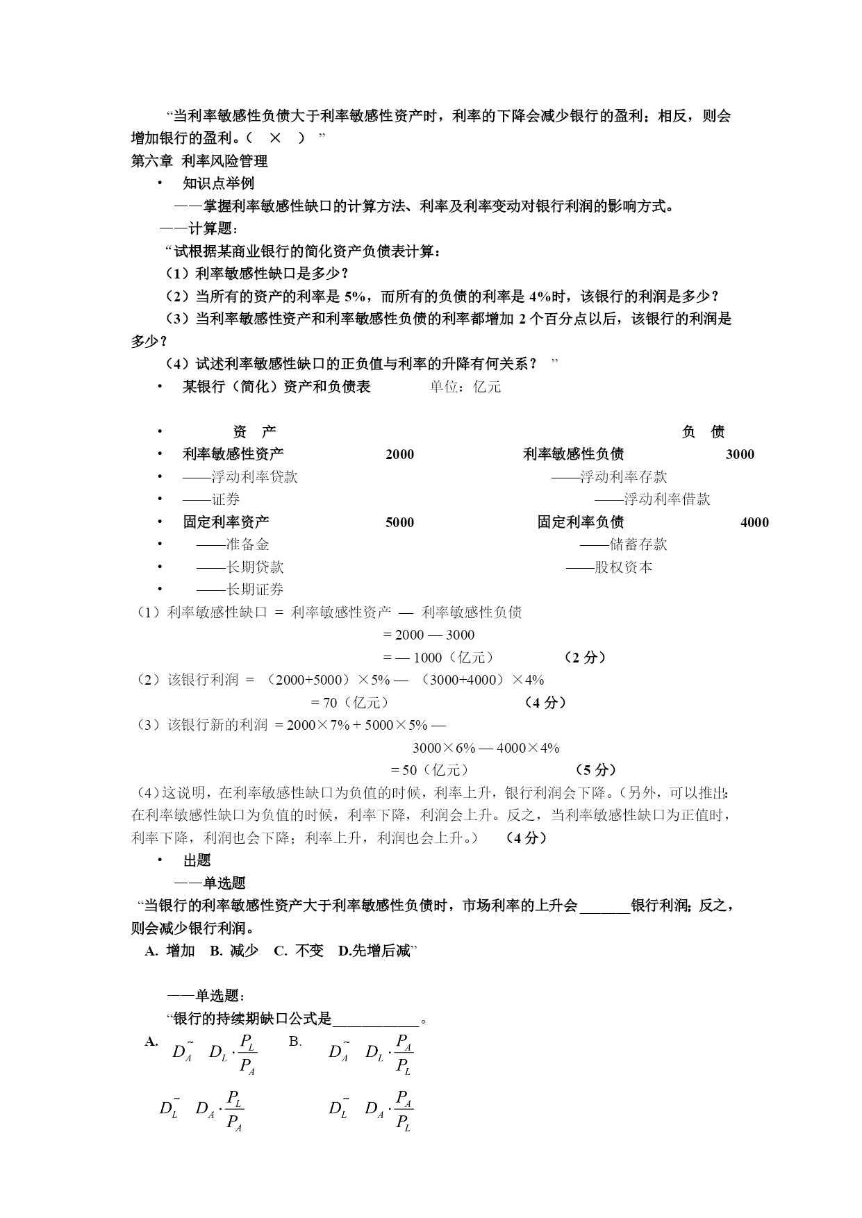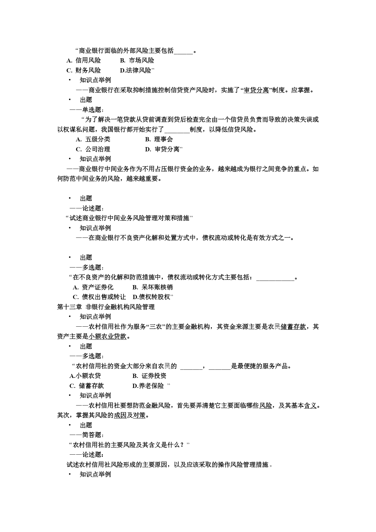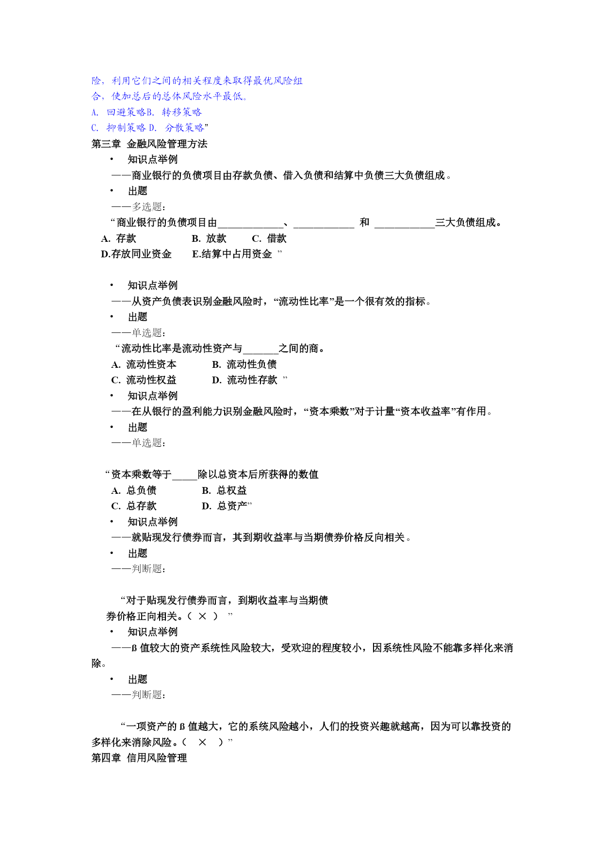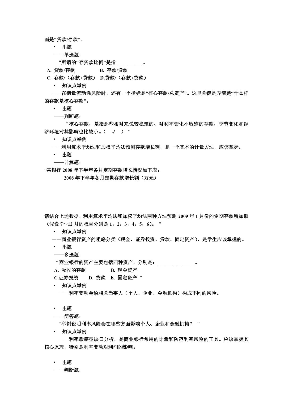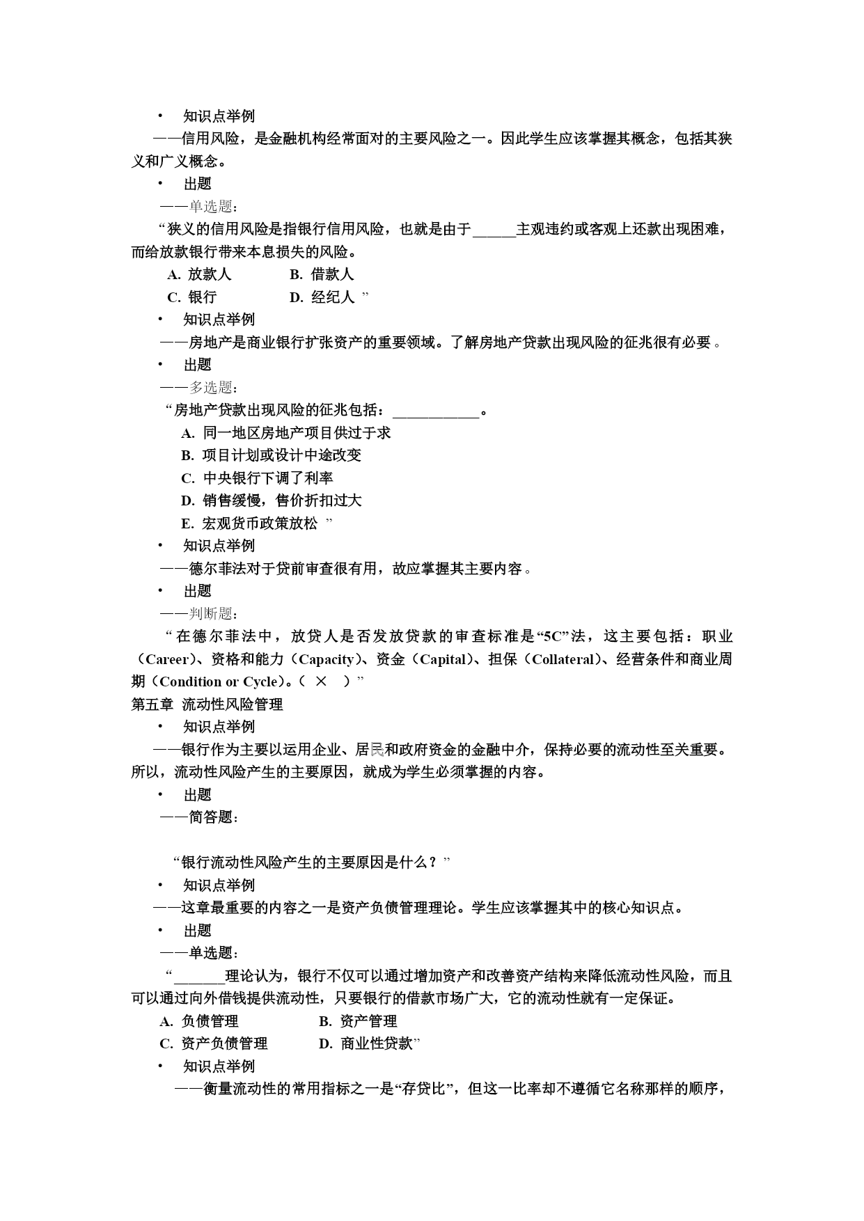 金融风险管理考试复习(一)题型介绍全部考试题型包括六种题型:——单选题(每题1分,共10分)——多选题(每题2分,共10分)——判断题(每题1分,共5分)——计算题(每题15分,共30分)——简答题(每题10分,共30分)——论述题(每题15分,共15分)合计100分第一章金融风险概述•知识点举例——按受险主体划分,金融风险如何划分。•出题——多项选择题:“按金融风险主体分类,金融风险可以划分为以下哪几类风险:_________________A.国家金融风险B.金融机构风险C.居民金融风险D.企业金融风险”第一章金融风险概述•知识点举例——金融风险产生的原因(是什么?)出题——论述题:“试述金融风险产生的原因。”知识点举例——信息不对称会导致道德风险和逆向选择•出题——多项选择题:“‥‥信息不对称又导致信贷市场的________和______,从而呆坏帐和金融风险的发生。A.逆向选择B.收入下降C.道德风险D.逆向撤资”第二章金融风险管理系统•知识点举例——金融风险管理的目的(是什么?)•出题——多项选择题:“金融风险管理的目的主要应该包括以下几点:____A.保证各金融机构和整个金融体系的稳健安全B.保证国际货币的可兑换性和可接受性C.保证金融机构的公平竞争和较高效率D.保证国家宏观货币政策制订和贯彻执行E.维护社会公众的利益”知识点举例——分散投资策略是降低风险的主要策略之一•出题——单选题:“______是指管理者通过承担各种性质不同的风险,利用它们之间的相关程度来取得最优风险组合,使加总后的总体风险水平最低。A.回避策略B.转移策略C.抑制策略D.分散策略”第三章金融风险管理方法知识点举例——商业银行的负债项目由存款负债、借入负债和结算中负债三大负债组成。出题——多选题:“商业银行的负债项目由_____________、____________和____________三大负债组成。A.存款B.放款C.借款D.存放同业资金E.结算中占用资金”知识点举例——从资产负债表识别金融风险时,“流动性比率”是一个很有效的指标。出题——单选题:“流动性比率是流动性资产与_______之间的商。A.流动性资本B.流动性负债C.流动性权益D.流动性存款”知识点举例——在从银行的盈利能力识别金融风险时,“资本乘数”对于计量“资本收益率”有作用。出题——单选题:“资本乘数等于_____除以总资本后所获得的数值A.总负债B.总权益C.总存款D.总资产”知识点举例——就贴现发行债券而言,其到期收益率与当期债券价格反向相关。出题——判断题:“对于贴现发行债券而言,到期收益率与当期债券价格正向相关。(×)”知识点举例——ß值较大的资产系统性风险较大,受欢迎的程度较小,因系统性风险不能靠多样化来消除。出题——判断题:“一项资产的ß值越大,它的系统风险越小,人们的投资兴趣就越高,因为可以靠投资的多样化来消除风险。(×)”第四章信用风险管理知识点举例——信用风险,是金融机构经常面对的主要风险之一。因此学生应该掌握其概念,包括其狭义和广义概念。出题——单选题:“狭义的信用风险是指银行信用风险,也就是由于______主观违约或客观上还款出现困难,而给放款银行带来本息损失的风险。A.放款人B.借款人C.银行D.经纪人”知识点举例——房地产是商业银行扩张资产的重要领域。了解房地产贷款出现风险的征兆很有必要。出题——多选题:“房地产贷款出现风险的征兆包括:____________。A.同一地区房地产项目供过于求B.项目计划或设计中途改变C.中央银行下调了利率D.销售缓慢,售价折扣过大E.宏观货币政策放松”知识点举例——德尔菲法对于贷前审查很有用,故应掌握其主要内容。出题——判断题:“在德尔菲法中,放贷人是否发放贷款的审查标准是“5C”法,这主要包括:职业(Career)、资格和能力(Capacity)、资金(Capital)、担保(Collateral)、经营条件和商业周期(ConditionorCycle)。(×)”第五章流动性风险管理知识点举例——银行作为主要以运用企业、居民和政府资金的金融中介,保持必要的流动性至关重要。所以,流动性风险产生的主要原因,就成为学生必须掌握的内容。出题——简答题:“银行流动性风险产生的主要原因是什么?”知识点举例——这章最重要的内容之一是资产负债管理理论。学生应该掌握其中的核心知识点。出题——单选题:“_______理论认为,银行不仅可以通过增加资产和改善资产结构来降低流动性风险,而且可以通过