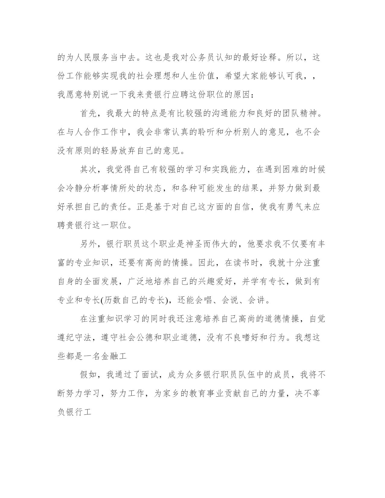 关于应聘公务员自我介绍范文参考除了学习之外,我还积极参加各种社会实践活动。我曾担任班级的宣传委员,组织了几次班级和学院的公益活动:如青年志愿者助残活动,向孤儿院儿童献爱心活动等。组织这些活动以及和活动中和成员的相处让我学到了很多东西,对培养自己的能力和人际关系的处理有很大的好处,为我更快的走向社会提供了良好的平台。此外,计算机和篮球是我业余最大的爱好,我计算机过了国家2级,除熟悉日常电脑操作和维护外,还自学了网站设计等,并自己设计了个人主页。我是班级的篮球队主力,我觉的篮球不仅可以强身健体还可以培养一个人的团队精神。回顾自己大学四年的工作学习生活,感触很深,但觉的收获还是颇丰的。掌握了专业知识,培养了自己各方面的能力,这些对今后的工作都将产生重要的帮助。除此之外,也应该看到我的一些缺点,如有时候做事情比较急于求成,在工作中实际经验不足等等。但“金无足赤,人无完人”每个人都不可避免的存在他的缺点,有缺点并不可怕,关键的是如何看待自己的缺点,只有正视它的存在改正缺点,开拓前进。公务员是一个神圣而高尚的职业,它追求的是公共利益的最大化,它存在的根本目的是为人民服务,为国家服务。雷锋说过:人的生命是有限的,而为人民服务是无限的,我要把有限的生命投入到无限的为人民服务当中去。这也是我对公务员认知的最好诠释。所以,这份工作能够实现我的社会理想和人生价值,希望大家能够认可我,,我愿意特别说一下我来贵银行应聘这份职位的原因:首先,我最大的特点是有比较强的沟通能力和良好的团队精神。在与人合作工作中,我会非常认真的聆听和分析别人的意见,也不会没有原则的轻易放弃自己的意见。其次,我觉得自己有较强的学习和实践能力,在遇到困难的时候会冷静分析事情所处的状态,和各种可能发生的结果,并努力做到最好承担自己的责任。正是基于对自己这方面的自信,使我有勇气来应聘贵银行这一职位。另外,银行职员这个职业是神圣而伟大的,他要求我不仅要有丰富的专业知识,还要有高尚的情操。因此,在读书时,我就十分注重自身的全面发展,广泛地培养自己的兴趣爱好,并学有专长,做到有专业和专长(历数自己的专长),还能会唱、会说、会讲。在注重知识学习的同时我还注意培养自己高尚的道德情操,自觉遵纪守法,遵守社会公德和职业道德,没有不良嗜好和行为。我想这些都是一名金融工假如,我通过了面试,成为众多银行职员队伍中的成员,我将不断努力学习,努力工作,为家乡的教育事业贡献自己的力量,决不辜负银行工