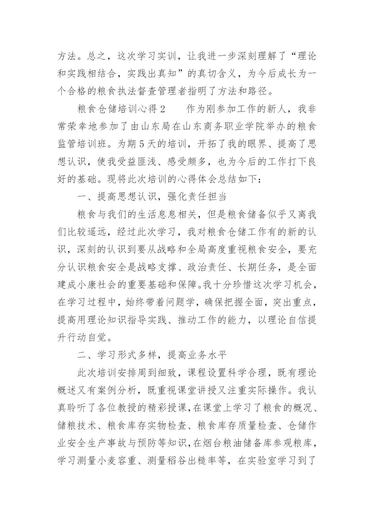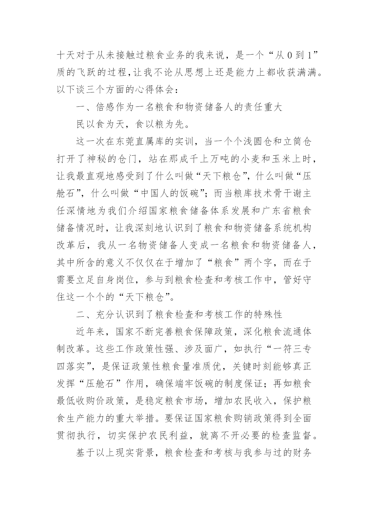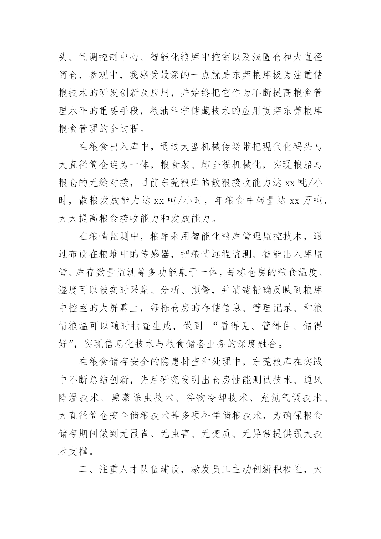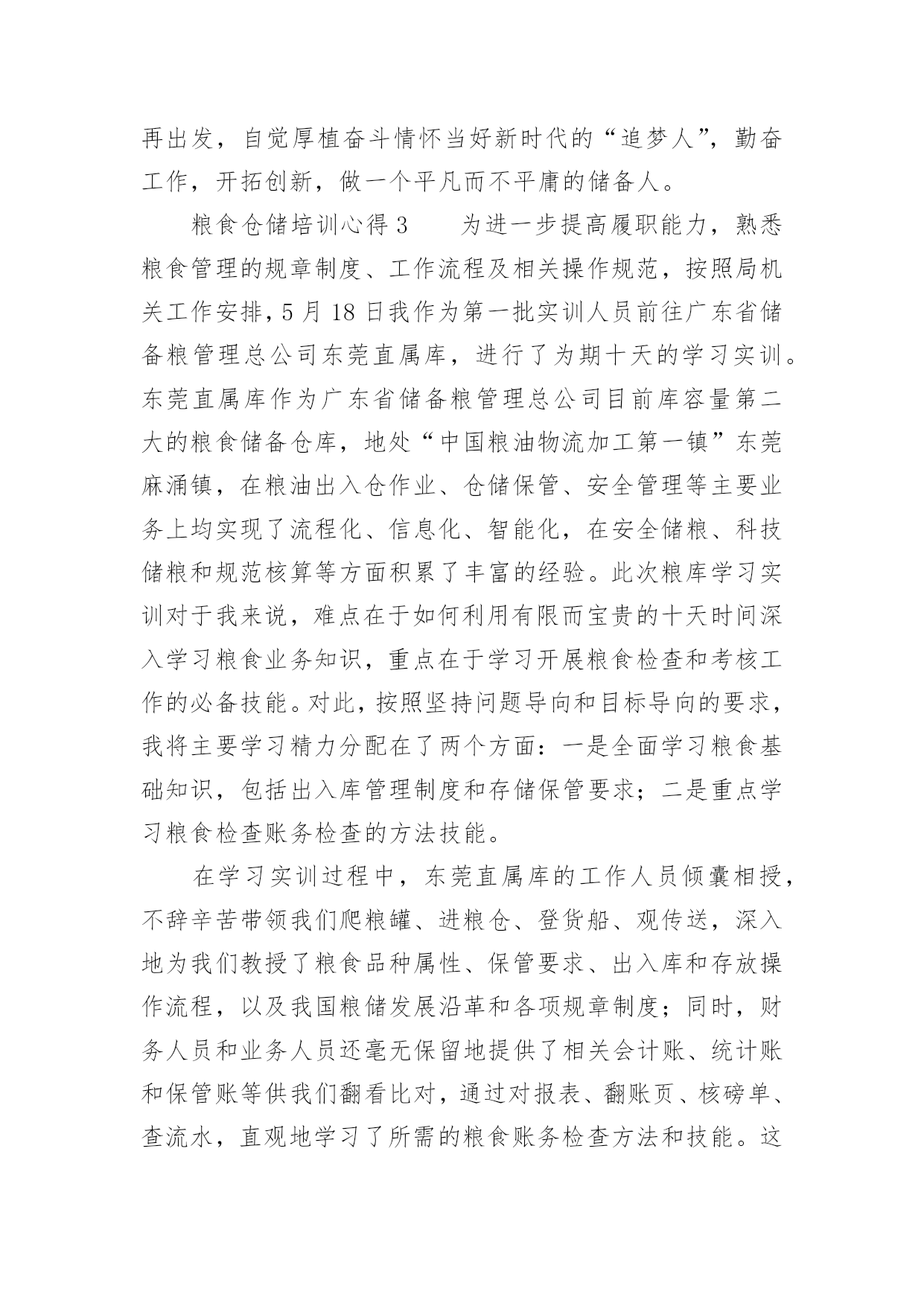 粮食仓储培训心得粮食仓储培训心得范文(通用7篇)当我们受到启发,对学习和工作生活有了新的看法时,不如来好好地做个总结,写一篇心得体会,这样可以记录我们的思想活动。那么如何写心得体会才能更有感染力呢?下面是小编为大家整理的粮食仓储培训心得范文(通用7篇),仅供参考,大家一起来看看吧。粮食仓储培训心得1为加强粮食督查检查能力,提高粮食监管水平,按照单位统一安排,5月18日-27日,我和粮棉糖处苏楚彪、罗导远及财务审计处陈润深等4人作为第一批队员到广东省储备粮管理总公司东莞直属库学习实训。在为期10天的实训中,我们采取跟班作业和集中研讨相结合的方式,重点学习了粮食管理的规章制度、工作流程及相关操作规范、粮食品种属性、保管要求、粮库账目处理、出入库管理、粮食监管检查难点、重点、粮温、粮情的判断及常见问题的发现方法和处理办法等。粮库领导高度重视,组织粮库各方面的业务骨干,全程轮流教学,答疑解惑,毫无保留,倾囊相授,我们深感此行受益匪浅,收获良多。现将我在东莞粮库学习实训的心得体会进行简单梳理:一、科学技术的研发和应用,是不断提高粮食管理水平的重要手段。实训第一天,在总公司和库领导的带领下,我们参观了粮库现代化的50000吨级的海港码头和5000吨级的内河码头、气调控制中心、智能化粮库中控室以及浅圆仓和大直径筒仓,参观中,我感受最深的一点就是东莞粮库极为注重储粮技术的研发创新及应用,并始终把它作为不断提高粮食管理水平的重要手段,粮油科学储藏技术的应用贯穿东莞粮库粮食管理的全过程。在粮食出入库中,通过大型机械传送带把现代化码头与大直径筒仓连为一体,粮食装、卸全程机械化,实现粮船与粮仓的无缝对接,目前东莞粮库的散粮接收能力达xx吨/小时,散粮发放能力达xx吨/小时,年粮食中转量达xx万吨,大大提高粮食接收能力和发放能力。在粮情监测中,粮库采用智能化粮库管理监控技术,通过布设在粮堆中的传感器,把粮情远程监测、智能出入库监管、库存数量监测等多功能集于一体,每栋仓房的粮食温度、湿度可以被实时采集、分析、预警,并清楚精确反映到粮库中控室的大屏幕上,每栋仓房的存储信息、管理记录、和粮情粮温可以随时抽查生成,做到“看得见、管得住、储得好”,实现信息化技术与粮食储备业务的深度融合。在粮食储存安全的隐患排查和处理中,东莞粮库在实践中不断总结创新,先后研究发明出仓房性能测试技术、通风降温技术、熏蒸杀虫技术、谷物冷却技术、充氮气调技术、大直径筒仓安全储粮技术等多项科学储粮技术,为确保粮食储存期间做到无鼠雀、无虫害、无变质、无异常提供强大技术支撑。二、注重人才队伍建设,激发员工主动创新积极性,大力营造“科技兴储”氛围,是加快粮食储备良性发展的重要保证。东莞粮库自2008年成立之初就制定了“人才兴储”计划,通过10多年持续不断的努力,取得了骄人的成绩,截止2018年,已完成的技术改造创新项目达32项,其中,稻谷胶稠度测定仪、粮食库仓深层粮食扦样设备、筒仓用测温电缆预埋件、粮温和气体浓度检测专用线缆等7项技术发明还取得了国家专利,他们在人才队伍建设和鼓励创新的许多经验做法值得我们好好借鉴。一是设立省级技能人才工作室,对外引进、对内培养创新技能人才,不断加大和更新人才储备,每年,按照粮食管理的需要拟定年度调研科研课题,组建各类技术研发团队,积极开展粮油科学储藏研究和技术攻关;二是积极与相关高校交流、对接、沟通和合作,及时了解国内外粮食管理前沿技术,进一步调整、充实和完善年度科研课题的内容;三是组织开展与各粮食行业单位粮油科学储藏技术交流活动,促进行业间、企业间的经验交流和技术合作;四是定期邀请专家,举办粮油科学储藏技术专题讲座,组织粮油仓储保管人员及质检管理人员学习、培训,不断提高工作人员的工作能力和业务水平;五是做好已完成科研攻关项目的资料收集整理和建案立档工作,科研攻关全程可查,实行痕迹化管理;六是建立创新激发机制,充分发挥全库人员的主动创新的积极性,大力营造“科技兴储”浓烈氛围。三、理论和实践相结合,实践出真知,从实践中不断总结工作经验和工作方法,是快速提高粮食执法督察检查水平的重要途径。实训前,我简单以为只要熟悉掌握《粮食流通管理条例》、《中央储备粮管理条例》、《粮食库存检查暂行办法》、《粮食流通监督检查暂行办法》等法规政策制度,对照条款要求就能开展好粮食督查检查工作了,10天的学习实训,通过参观现场、跟班作业、专家讲座和老员工的经验介绍,彻底颠覆了我的这一看法,意识到要成为一个合格的粮食监管和粮食督查检查的管理者,光熟悉掌握粮食管理的法律法规政策,有理论知识远远不够,还必须要有丰富的粮食管理经验。包括:一要熟悉粮食流通的收购、销售、储存、运输、加工、进出口等各个环节的具体流程和管理细节;二要懂得通过储仓的气温、仓温和粮温熟练判断粮情;三要能一看二嗅三触摸,