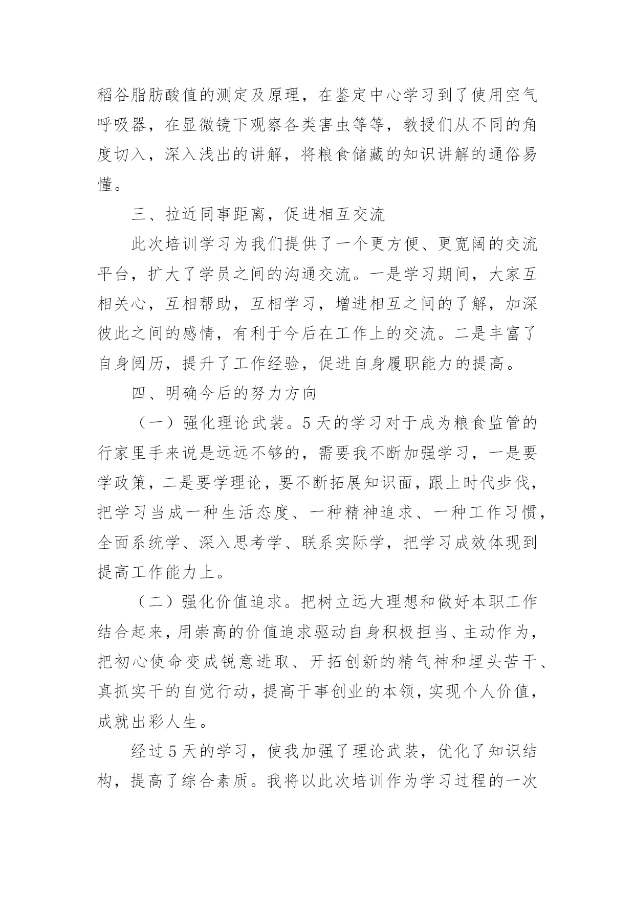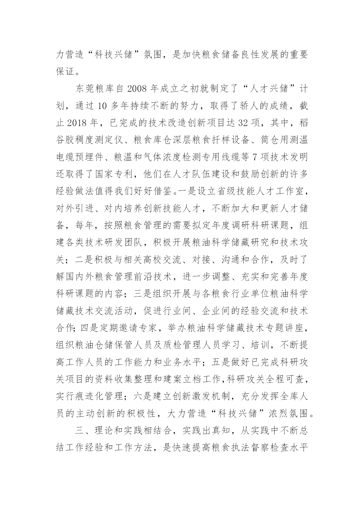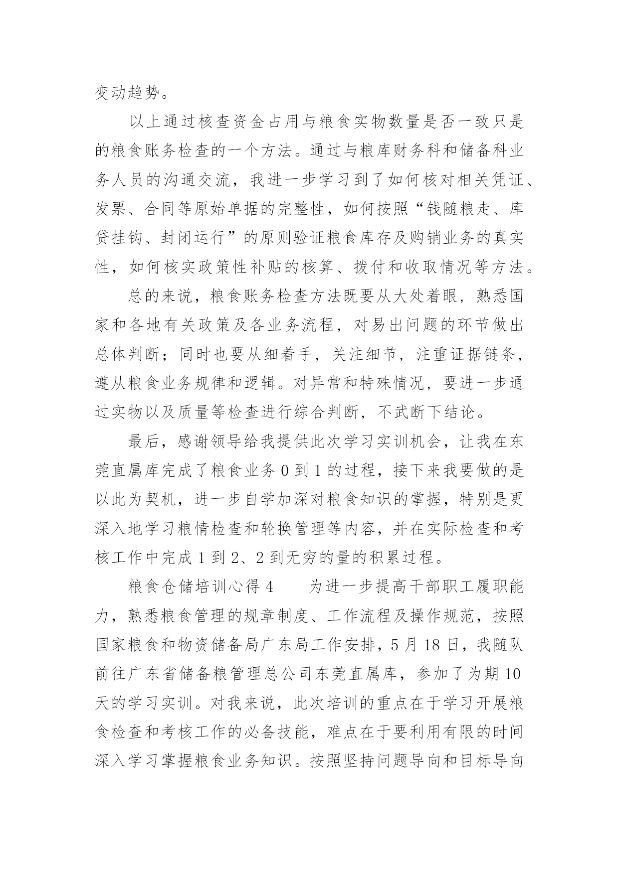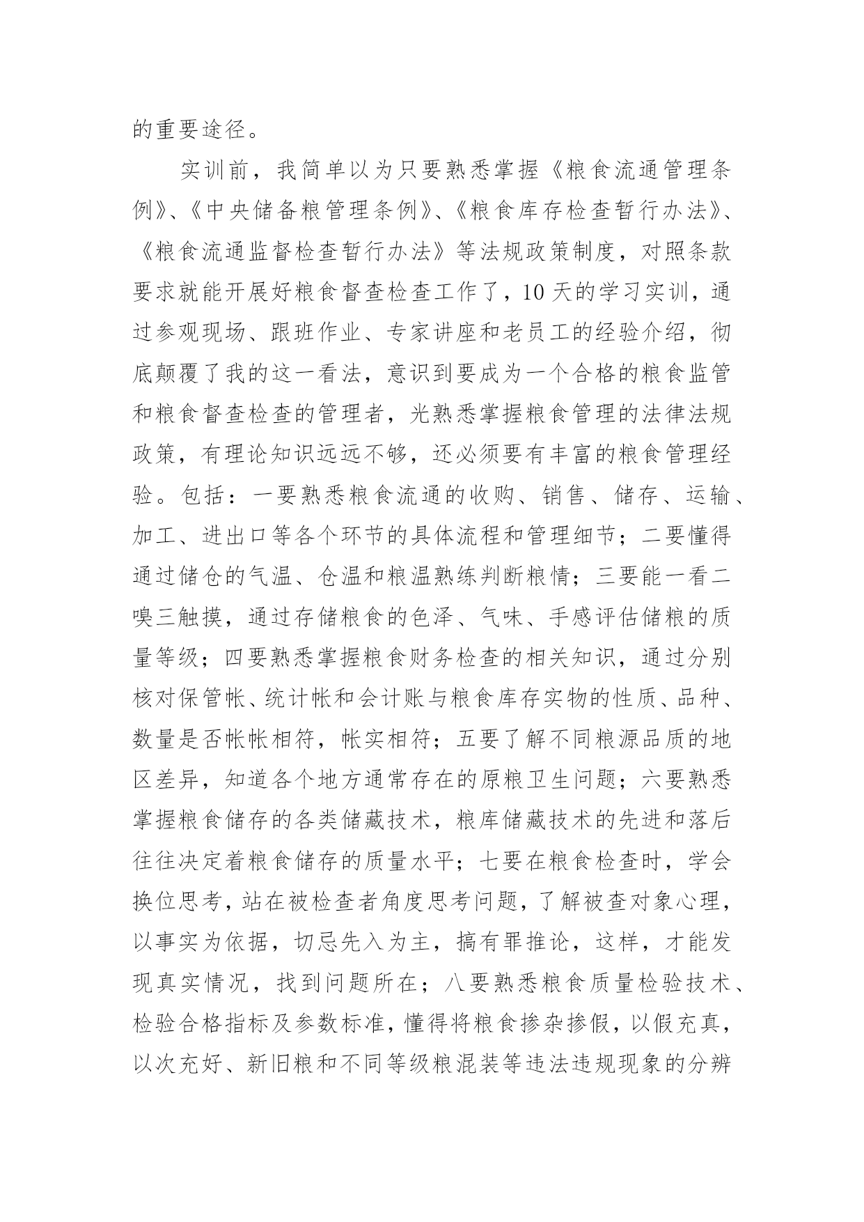 粮食仓储培训心得粮食仓储培训心得范文(通用7篇)当我们受到启发,对学习和工作生活有了新的看法时,不如来好好地做个总结,写一篇心得体会,这样可以记录我们的思想活动。那么如何写心得体会才能更有感染力呢?下面是小编为大家整理的粮食仓储培训心得范文(通用7篇),仅供参考,大家一起来看看吧。粮食仓储培训心得1为加强粮食督查检查能力,提高粮食监管水平,按照单位统一安排,5月18日-27日,我和粮棉糖处苏楚彪、罗导远及财务审计处陈润深等4人作为第一批队员到广东省储备粮管理总公司东莞直属库学习实训。在为期10天的实训中,我们采取跟班作业和集中研讨相结合的方式,重点学习了粮食管理的规章制度、工作流程及相关操作规范、粮食品种属性、保管要求、粮库账目处理、出入库管理、粮食监管检查难点、重点、粮温、粮情的判断及常见问题的发现方法和处理办法等。粮库领导高度重视,组织粮库各方面的业务骨干,全程轮流教学,答疑解惑,毫无保留,倾囊相授,我们深感此行受益匪浅,收获良多。现将我在东莞粮库学习实训的心得体会进行简单梳理:一、科学技术的研发和应用,是不断提高粮食管理水平的重要手段。实训第一天,在总公司和库领导的带领下,我们参观了粮库现代化的50000吨级的海港码头和5000吨级的内河码头、气调控制中心、智能化粮库中控室以及浅圆仓和大直径筒仓,参观中,我感受最深的一点就是东莞粮库极为注重储粮技术的研发创新及应用,并始终把它作为不断提高粮食管理水平的重要手段,粮油科学储藏技术的应用贯穿东莞粮库粮食管理的全过程。在粮食出入库中,通过大型机械传送带把现代化码头与大直径筒仓连为一体,粮食装、卸全程机械化,实现粮船与粮仓的无缝对接,目前东莞粮库的散粮接收能力达xx吨/小时,散粮发放能力达xx吨/小时,年粮食中转量达xx万吨,大大提高粮食接收能力和发放能力。在粮情监测中,粮库采用智能化粮库管理监控技术,通过布设在粮堆中的传感器,把粮情远程监测、智能出入库监管、库存数量监测等多功能集于一体,每栋仓房的粮食温度、湿度可以被实时采集、分析、预警,并清楚精确反映到粮库中控室的大屏幕上,每栋仓房的存储信息、管理记录、和粮情粮温可以随时抽查生成,做到“看得见、管得住、储得好”,实现信息化技术与粮食储备业务的深度融合。在粮食储存安全的隐患排查和处理中,东莞粮库在实践中不断总结创新,先后研究发明出仓房性能测试技术、通风降温技术、熏蒸杀虫技术、谷物冷却技术、充氮气调技术、大直径筒仓安全储粮技术等多项科学储粮技术,为确保粮食储存期间做到无鼠雀、无虫害、无变质、无异常提供强大技术支撑。二、注重人才队伍建设,激发员工主动创新积极性,大力营造“科技兴储”氛围,是加快粮食储备良性发展的重要保证。东莞粮库自2008年成立之初就制定了“人才兴储”计划,通过10多年持续不断的努力,取得了骄人的成绩,截止2018年,已完成的技术改造创新项目达32项,其中,稻谷胶稠度测定仪、粮食库仓深层粮食扦样设备、筒仓用测温电缆预埋件、粮温和气体浓度检测专用线缆等7项技术发明还取得了国家专利,他们在人才队伍建设和鼓励创新的许多经验做法值得我们好好借鉴。一是设立省级技能人才工作室,对外引进、对内培养创新技能人才,不断加大和更新人才储备,每年,按照粮食管理的需要拟定年度调研科研课题,组建各类技术研发团队,积极开展粮油科学储藏研究和技术攻关;二是积极与相关高校交流、对接、沟通和合作,及时了解国内外粮食管理前沿技术,进一步调整、充实和完善年度科研课题的内容;三是组织开展与各粮食行业单位粮油科学储藏技术交流活动,促进行业间、企业间的经验交流和技术合作;四是定期邀请专家,举办粮油科学储藏技术专题讲座,组织粮油仓储保管人员及质检管理人员学习、培训,不断提高工作人员的工作能力和业务水平;五是做好已完成科研攻关项目的资料收集整理和建案立档工作,科研攻关全程可查,实行痕迹化管理;六是建立创新激发机制,充分发挥全库人员的主动创新的积极性,大力营造“科技兴储”浓烈氛围。三、理论和实践相结合,实践出真知,从实践中不断总结工作经验和工作方法,是快速提高粮食执法督察检查水平的重要途径。实训前,我简单以为只要熟悉掌握《粮食流通管理条例》、《中央储备粮管理条例》、《粮食库存检查暂行办法》、《粮食流通监督检查暂行办法》等法规政策制度,对照条款要求就能开展好粮食督查检查工作了,10天的学习实训,通过参观现场、跟班作业、专家讲座和老员工的经验介绍,彻底颠覆了我的这一看法,意识到要成为一个合格的粮食监管和粮食督查检查的管理者,光熟悉掌握粮食管理的法律法规政策,有理论知识远远不够,还必须要有丰富的粮食管理经验。包括:一要熟悉粮食流通的收购、销售、储存、运输、加工、进出口等各个环节的具体流程和管理细节;二要懂得通过储仓的气温、仓温和粮温熟练判断粮情;三要能一看二嗅三触摸,