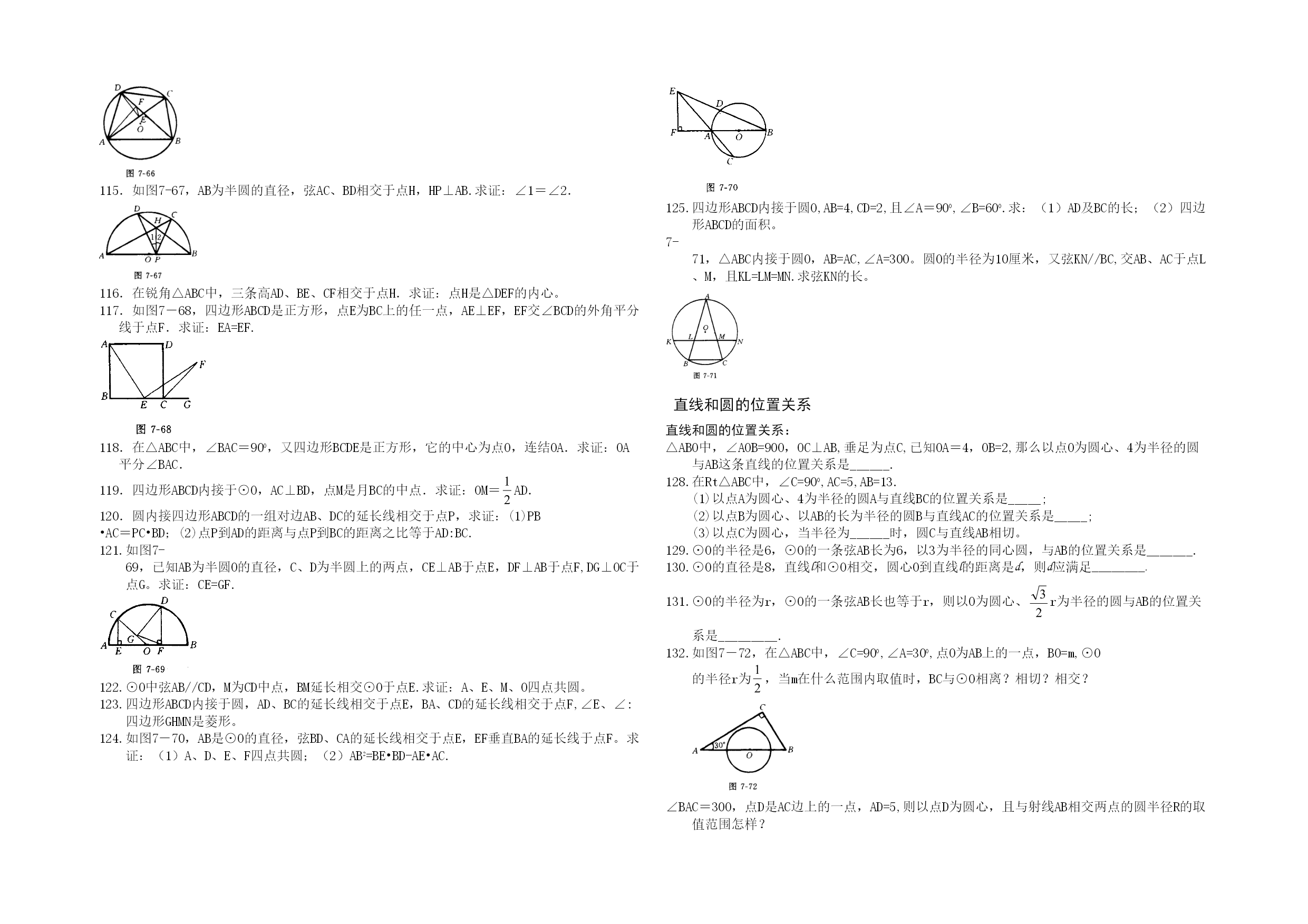 圆的基本性质点与圆的位置关系决定圆的大小的是圆_____;决定圆位置的是_____.在Rt△ABC中∠C=90O,AC=4,OC=3,E、F分别为AO、AC的中点,以O为圆心、OC为半径作圆,点E在⊙O的圆_____,点F在⊙O的圆_____.如图;AB、CD是⊙O的两条直径,AE∥CD,BE与CD相交于P点,则OP∶AE=____.经过A、B两点的圆的圆心在________,这样的圆有______个.⊥AB,则CD=_______.一已知点到圆周上的点的最大距离为m,最小距离为n.则此圆的半径_____.有个长、宽分别为4和3的矩形ABCD,现以点A为圆心,若B、C、D至少有一个点在圆内,且至少有一个点在圆外,则⊙A半径r的范围是_________.⊙O的半径为15厘米,点O到直线l的距离OH=9厘米,P,Q,R为l上的三个点,PH=9厘米,QH=12厘米,RH=15厘米,则P,Q,R与⊙O的位置关系分别为.若点A(a,-27)在以点B(-35,-27)为圆心,37为半径的圆上,a=.在矩形ABCD中,AB=8,AD=6,以点A为圆心作圆,若B,C,D三点中至少有一点在圆内,且至少有一点在圆外,则⊙A的半径R的取值范围是在直角坐标系中,⊙O的半径为5厘米,圆心O的坐标为(-1,-4),点P(3,-1)与圆O的位置关系是.如图⊙O是是等腰三角形ABC的外接圆,AB=AC,D是弧AC的中点,已知∠EAD=114O,求∠CAD在度数。已知⊙O的直径为16厘米,点E是⊙O内任意一点,(1)作出过点E的最短的弦;(2)若OE=4厘米,则最短弦在长度是多少?如图7-4,已知在△ABC中,∠CAB=900,AB=3厘米,AC=4厘米,以点A为圆心、AC长为半径画弧交CB的延长线于点D.求CD的长。试问:任意四边形的四个内角的平分线相交的四个点在同一个圆上吗?又问:任意四边形各外角在平分线所相交在四边形在同一圆上吗?为什么?如图7-6,AB是⊙O的直径,弦CD⊥AB于点P,(1)已知CD=8厘米,AP:PB=1:4,求⊙O的半径;(2)如果弦AE交CD于点F。求证:AC2=AF•AE.已知四边形ABCD是菱形,设点E、F、G、H是各边的中点,试判断点E、F、G、H是否在同一个圆上,为什么?又自AC、BD的交点O向菱形各边作垂线,垂足分别为M、N、P、Q点,问:这四点在同一个圆上吗?为什么?⊙O中有n条等弦A1B1、A2B2、•••AnBn,它们的中点分别是P1、P2、•••Pn,试问:P1、P2、•••Pn这n个点在同一个圆上吗?请证明你的判断。又若⊙O上有一点A,自点A引n条弦A1B1、A2B2、•••AnBn,,若它们的中点分别为Q1、Q2、•••Qn,试问:Q1、Q2、•••Qn,这n个点在同一圆上吗?请证明你的判断。垂径定理19.⊙o中等于1200劣弧所对的弦是12厘米,则⊙O的半径是厘米.⊙o上一点A,作弦AB、AC、分别等于该圆的半径R,连结BC,则点O到BC的距离=_______,BC=_______。21.如图7-7,在⊙O中,弦AB=2a,点C是弧的中点,CD⊥AB,CD=b,则⊙O的半径R=______.22.如图7-8,ABCD是⊙O1的内接矩形,边AB平行y轴,且AB∶BC=3∶4,已知⊙O1的半径为5,圆心O1的坐标是(10,10),矩形四个顶点A、B、C、D的坐标是A______;B______;C______;D_______.23.在⊙O中,弦AB=40厘米,CD=48厘米,且AB∥CD,AB与CD距离是22厘米,则圆的半径为________厘米24.四边形ABCD是⊙O的内接梯形,AB∥BC,对角线AC、BD相交于点E.求证:OE平分∠BEC.25.如图7-9,在⊙O中,已待AC=BD.求证:(1)OC=OD;(2)26.⊙O1与⊙O2相交于点A、B,过点B作CD∥O1O2:CD=2O1O227.如图7-10,⊙O1、⊙O2是两个等圆,点P是O1O2的中点,过点P的直线交⊙O1、⊙O2于点A、B、C、D。求证:AB=CD.28.如图7-11,⊙O的半径为5,P是圆外一点,PO=8,∠OPA=30O,求AB、PB的长。29.如图7-12,圆管内,原有积水平面宽CD=10厘米,水深GF=1厘米,后水面上升1厘米(即EG=1厘米),问:些时水面宽AB为多少?30.在⊙O的弦AB上取AC=BD,过点C、D分别作AB的垂线CE、DF交圆于点E、F,并使E、F在AB的同旁。求证:CE=DF.31.如图7-13,在⊙O的直径MN上任取一点P,过点P作弦AC、BD,使∠APN=∠BPN.求证:PA=PB.32.AB、CD是⊙O
