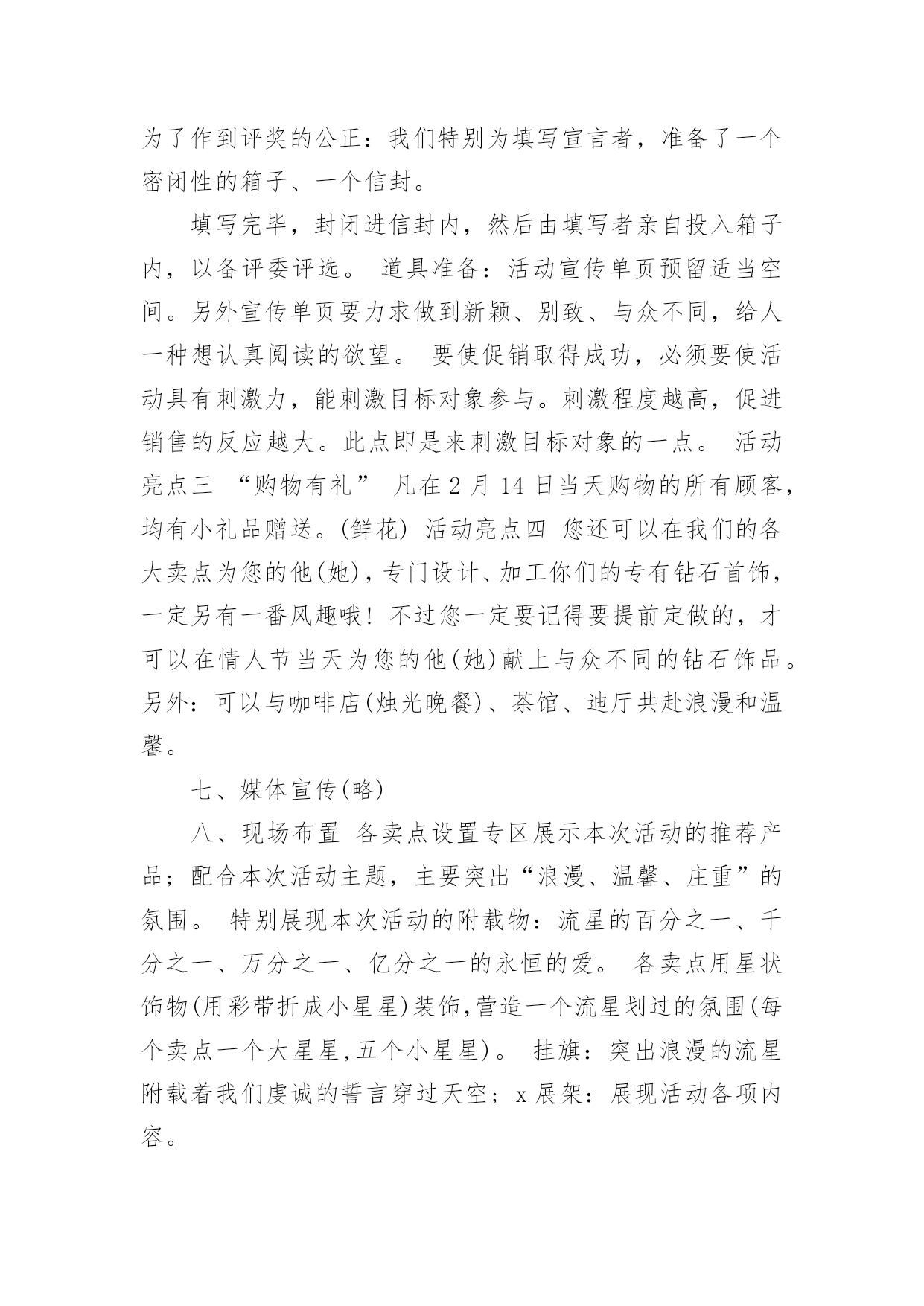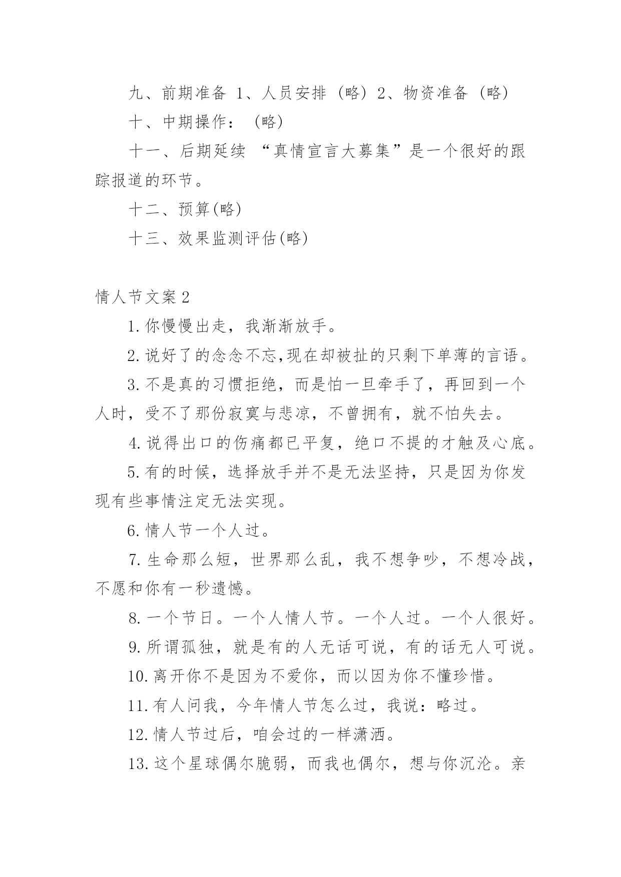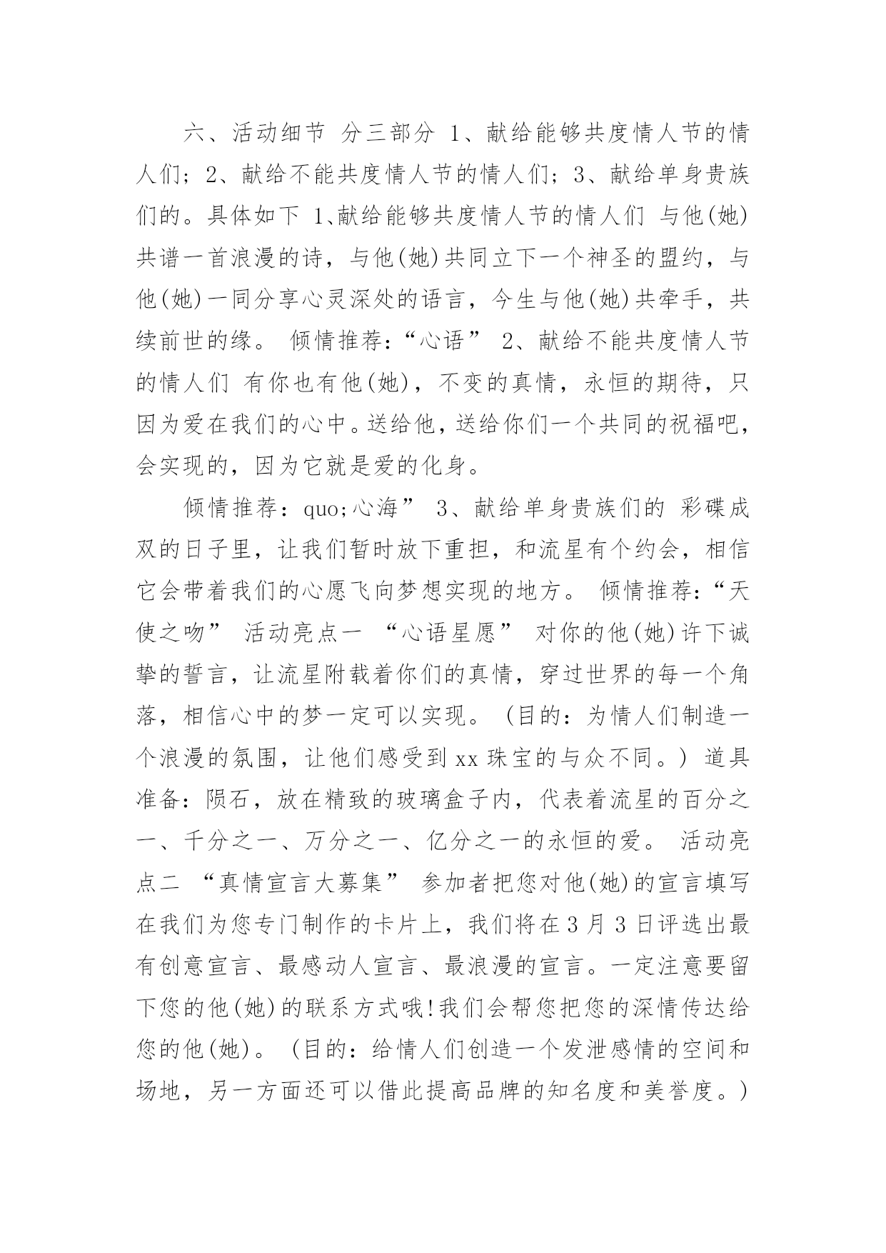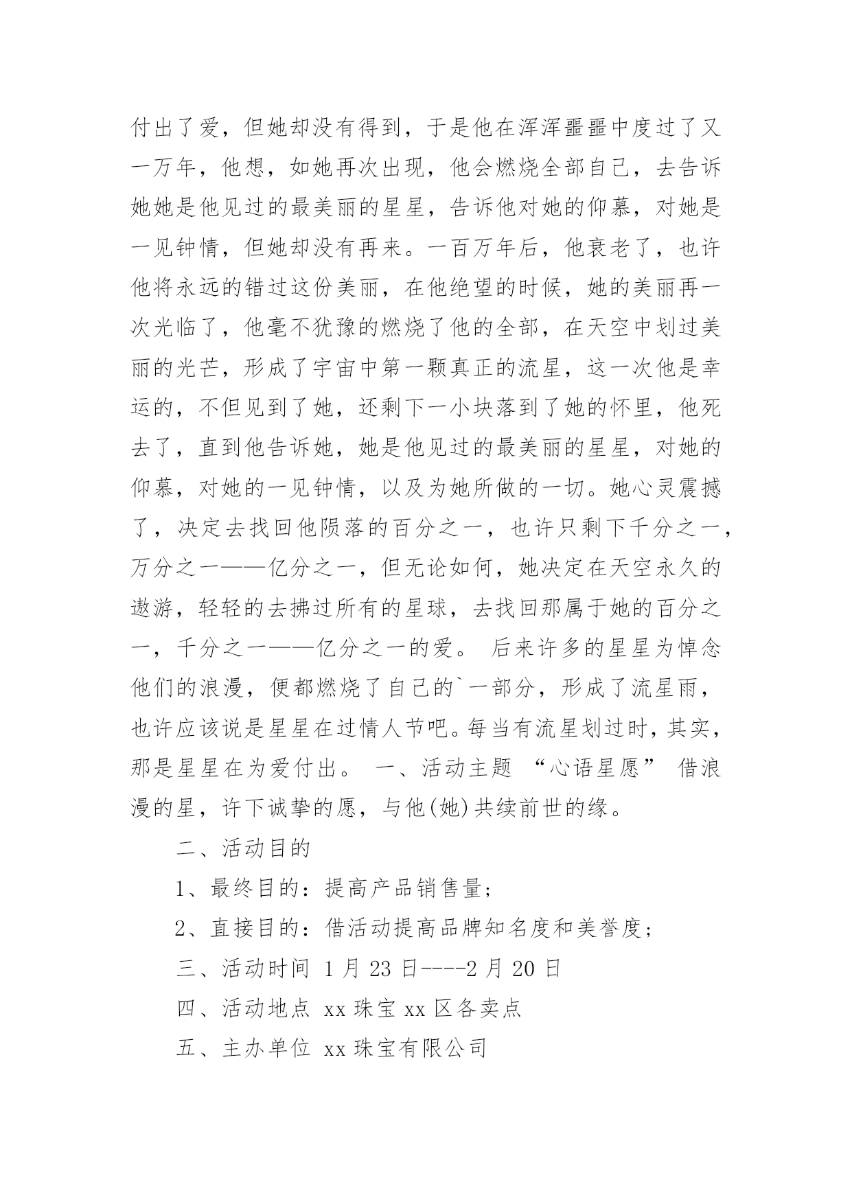 情人节文案情人节文案通用15篇随着社交网络的发展,越来越多人钟情于在线上发布文案,文案在生活中是比较重要的一种宣传形式。那什么样的文案才算得上是经典呢?以下是小编为大家收集的情人节文案,希望对大家有所帮助。情人节文案1一、活动背景2月14日,一年中最浪漫的日子,这一天无限柔情和蜜意尽情释放,真诚的渴望与期待等待回答,心与心的碰撞,撞出永恒不熄的爱的火花。在这样一个浪漫的日子里,我们以实际行动送上真诚的祝福,愿天下有情人终成眷属,白头偕老,美满幸福。流星的传说在广阔无限的宇宙中,有一个很小很小的星球,在一个晚霞满布的傍晚,邂逅了一颗美丽的星星,那星星奔跑时,身后会带着一道飘逸五彩的光芒,“她好美,”他叹道,被她的美丽打动了,并等待为她做点什么,可是等了一年,二年——十年,二十年——直到一万年以后,她才再一次神采怡怡的跑过,他决定燃烧自己的身体的百分之一,去照亮她,让更多的星星去见证她的美丽,于是天空中有一道美丽的光弧划过。可是他毕竟太小了,那光芒也太弱太弱,还没有来得及靠近,就已经陨落了,不知去向,他失望了,他付出了爱,但她却没有得到,于是他在浑浑噩噩中度过了又一万年,他想,如她再次出现,他会燃烧全部自己,去告诉她她是他见过的最美丽的星星,告诉他对她的仰慕,对她是一见钟情,但她却没有再来。一百万年后,他衰老了,也许他将永远的错过这份美丽,在他绝望的时候,她的美丽再一次光临了,他毫不犹豫的燃烧了他的全部,在天空中划过美丽的光芒,形成了宇宙中第一颗真正的流星,这一次他是幸运的,不但见到了她,还剩下一小块落到了她的怀里,他死去了,直到他告诉她,她是他见过的最美丽的星星,对她的仰慕,对她的一见钟情,以及为她所做的一切。她心灵震撼了,决定去找回他陨落的百分之一,也许只剩下千分之一,万分之一——亿分之一,但无论如何,她决定在天空永久的遨游,轻轻的去拂过所有的星球,去找回那属于她的百分之一,千分之一——亿分之一的爱。后来许多的星星为悼念他们的浪漫,便都燃烧了自己的`一部分,形成了流星雨,也许应该说是星星在过情人节吧。每当有流星划过时,其实,那是星星在为爱付出。一、活动主题“心语星愿”借浪漫的星,许下诚挚的愿,与他(她)共续前世的缘。二、活动目的1、最终目的:提高产品销售量;2、直接目的:借活动提高品牌知名度和美誉度;三、活动时间1月23日----2月20日四、活动地点xx珠宝xx区各卖点五、主办单位xx珠宝有限公司六、活动细节分三部分1、献给能够共度情人节的情人们;2、献给不能共度情人节的情人们;3、献给单身贵族们的。具体如下1、献给能够共度情人节的情人们与他(她)共谱一首浪漫的诗,与他(她)共同立下一个神圣的盟约,与他(她)一同分享心灵深处的语言,今生与他(她)共牵手,共续前世的缘。倾情推荐:“心语”2、献给不能共度情人节的情人们有你也有他(她),不变的真情,永恒的期待,只因为爱在我们的心中。送给他,送给你们一个共同的祝福吧,会实现的,因为它就是爱的化身。倾情推荐:quo;心海”3、献给单身贵族们的彩碟成双的日子里,让我们暂时放下重担,和流星有个约会,相信它会带着我们的心愿飞向梦想实现的地方。倾情推荐:“天使之吻”活动亮点一“心语星愿”对你的他(她)许下诚挚的誓言,让流星附载着你们的真情,穿过世界的每一个角落,相信心中的梦一定可以实现。(目的:为情人们制造一个浪漫的氛围,让他们感受到xx珠宝的与众不同。)道具准备:陨石,放在精致的玻璃盒子内,代表着流星的百分之一、千分之一、万分之一、亿分之一的永恒的爱。活动亮点二“真情宣言大募集”参加者把您对他(她)的宣言填写在我们为您专门制作的卡片上,我们将在3月3日评选出最有创意宣言、最感动人宣言、最浪漫的宣言。一定注意要留下您的他(她)的联系方式哦!我们会帮您把您的深情传达给您的他(她)。(目的:给情人们创造一个发泄感情的空间和场地,另一方面还可以借此提高品牌的知名度和美誉度。)为了作到评奖的公正:我们特别为填写宣言者,准备了一个密闭性的箱子、一个信封。填写完毕,封闭进信封内,然后由填写者亲自投入箱子内,以备评委评选。道具准备:活动宣传单页预留适当空间。另外宣传单页要力求做到新颖、别致、与众不同,给人一种想认真阅读的欲望。要使促销取得成功,必须要使活动具有刺激力,能刺激目标对象参与。刺激程度越高,促进销售的反应越大。此点即是来刺激目标对象的一点。活动亮点三“购物有礼”凡在2月14日当天购物的所有顾客,均有小礼品赠送。(鲜花)活动亮点四您还可以在我们的各大卖点为您的他(她),专门设计、加工你们的专有钻石首饰,一定另有一番风趣哦!不过您一定要记得要提前定做的,才可以在情人节当天为您的他(她)献上与众不同的钻石饰品。另外:可以与咖啡店(烛光晚餐)、茶馆、迪厅共赴浪漫和温馨。七、媒体宣传(略)八、现场布置