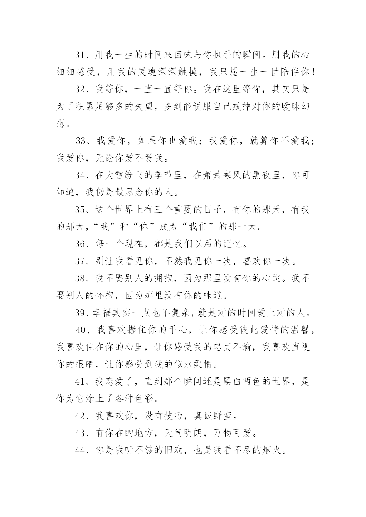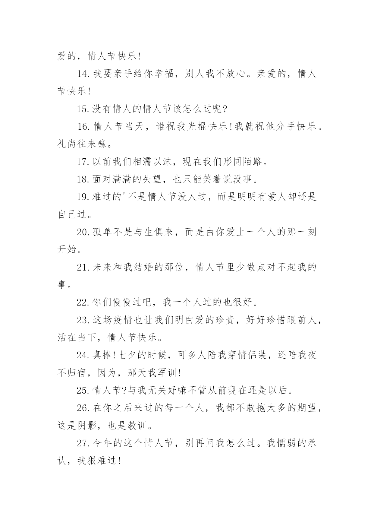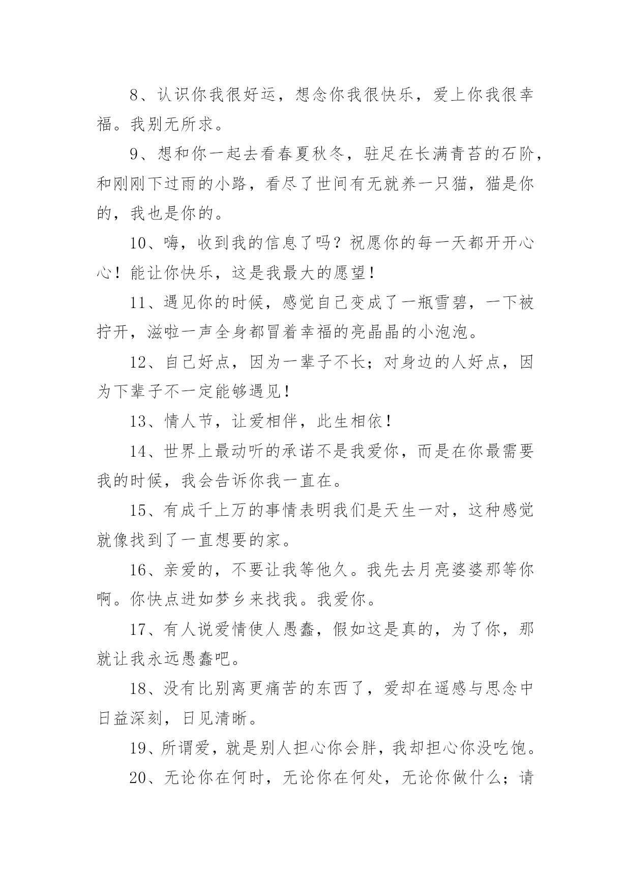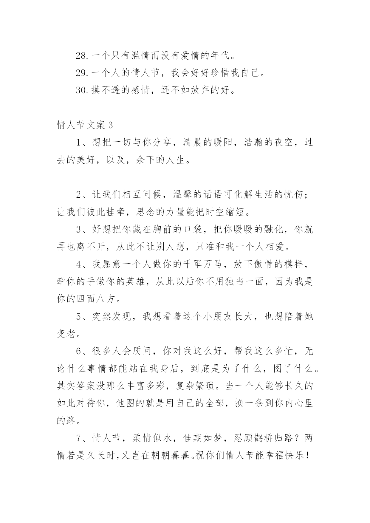 情人节文案情人节文案通用15篇随着社交网络的发展,越来越多人钟情于在线上发布文案,文案在生活中是比较重要的一种宣传形式。那什么样的文案才算得上是经典呢?以下是小编为大家收集的情人节文案,希望对大家有所帮助。情人节文案1一、活动背景2月14日,一年中最浪漫的日子,这一天无限柔情和蜜意尽情释放,真诚的渴望与期待等待回答,心与心的碰撞,撞出永恒不熄的爱的火花。在这样一个浪漫的日子里,我们以实际行动送上真诚的祝福,愿天下有情人终成眷属,白头偕老,美满幸福。流星的传说在广阔无限的宇宙中,有一个很小很小的星球,在一个晚霞满布的傍晚,邂逅了一颗美丽的星星,那星星奔跑时,身后会带着一道飘逸五彩的光芒,“她好美,”他叹道,被她的美丽打动了,并等待为她做点什么,可是等了一年,二年——十年,二十年——直到一万年以后,她才再一次神采怡怡的跑过,他决定燃烧自己的身体的百分之一,去照亮她,让更多的星星去见证她的美丽,于是天空中有一道美丽的光弧划过。可是他毕竟太小了,那光芒也太弱太弱,还没有来得及靠近,就已经陨落了,不知去向,他失望了,他付出了爱,但她却没有得到,于是他在浑浑噩噩中度过了又一万年,他想,如她再次出现,他会燃烧全部自己,去告诉她她是他见过的最美丽的星星,告诉他对她的仰慕,对她是一见钟情,但她却没有再来。一百万年后,他衰老了,也许他将永远的错过这份美丽,在他绝望的时候,她的美丽再一次光临了,他毫不犹豫的燃烧了他的全部,在天空中划过美丽的光芒,形成了宇宙中第一颗真正的流星,这一次他是幸运的,不但见到了她,还剩下一小块落到了她的怀里,他死去了,直到他告诉她,她是他见过的最美丽的星星,对她的仰慕,对她的一见钟情,以及为她所做的一切。她心灵震撼了,决定去找回他陨落的百分之一,也许只剩下千分之一,万分之一——亿分之一,但无论如何,她决定在天空永久的遨游,轻轻的去拂过所有的星球,去找回那属于她的百分之一,千分之一——亿分之一的爱。后来许多的星星为悼念他们的浪漫,便都燃烧了自己的`一部分,形成了流星雨,也许应该说是星星在过情人节吧。每当有流星划过时,其实,那是星星在为爱付出。一、活动主题“心语星愿”借浪漫的星,许下诚挚的愿,与他(她)共续前世的缘。二、活动目的1、最终目的:提高产品销售量;2、直接目的:借活动提高品牌知名度和美誉度;三、活动时间1月23日----2月20日四、活动地点xx珠宝xx区各卖点五、主办单位xx珠宝有限公司六、活动细节分三部分1、献给能够共度情人节的情人们;2、献给不能共度情人节的情人们;3、献给单身贵族们的。具体如下1、献给能够共度情人节的情人们与他(她)共谱一首浪漫的诗,与他(她)共同立下一个神圣的盟约,与他(她)一同分享心灵深处的语言,今生与他(她)共牵手,共续前世的缘。倾情推荐:“心语”2、献给不能共度情人节的情人们有你也有他(她),不变的真情,永恒的期待,只因为爱在我们的心中。送给他,送给你们一个共同的祝福吧,会实现的,因为它就是爱的化身。倾情推荐:quo;心海”3、献给单身贵族们的彩碟成双的日子里,让我们暂时放下重担,和流星有个约会,相信它会带着我们的心愿飞向梦想实现的地方。倾情推荐:“天使之吻”活动亮点一“心语星愿”对你的他(她)许下诚挚的誓言,让流星附载着你们的真情,穿过世界的每一个角落,相信心中的梦一定可以实现。(目的:为情人们制造一个浪漫的氛围,让他们感受到xx珠宝的与众不同。)道具准备:陨石,放在精致的玻璃盒子内,代表着流星的百分之一、千分之一、万分之一、亿分之一的永恒的爱。活动亮点二“真情宣言大募集”参加者把您对他(她)的宣言填写在我们为您专门制作的卡片上,我们将在3月3日评选出最有创意宣言、最感动人宣言、最浪漫的宣言。一定注意要留下您的他(她)的联系方式哦!我们会帮您把您的深情传达给您的他(她)。(目的:给情人们创造一个发泄感情的空间和场地,另一方面还可以借此提高品牌的知名度和美誉度。)为了作到评奖的公正:我们特别为填写宣言者,准备了一个密闭性的箱子、一个信封。填写完毕,封闭进信封内,然后由填写者亲自投入箱子内,以备评委评选。道具准备:活动宣传单页预留适当空间。另外宣传单页要力求做到新颖、别致、与众不同,给人一种想认真阅读的欲望。要使促销取得成功,必须要使活动具有刺激力,能刺激目标对象参与。刺激程度越高,促进销售的反应越大。此点即是来刺激目标对象的一点。活动亮点三“购物有礼”凡在2月14日当天购物的所有顾客,均有小礼品赠送。(鲜花)活动亮点四您还可以在我们的各大卖点为您的他(她),专门设计、加工你们的专有钻石首饰,一定另有一番风趣哦!不过您一定要记得要提前定做的,才可以在情人节当天为您的他(她)献上与众不同的钻石饰品。另外:可以与咖啡店(烛光晚餐)、茶馆、迪厅共赴浪漫和温馨。七、媒体宣传(略)八、现场布置