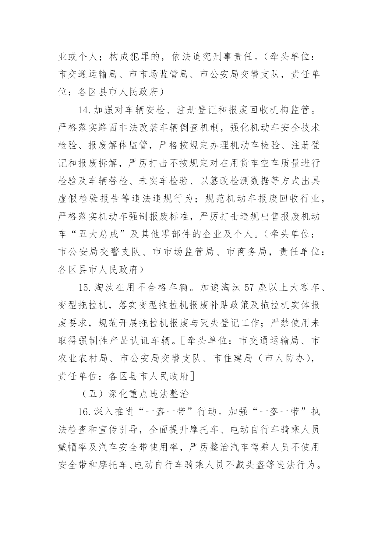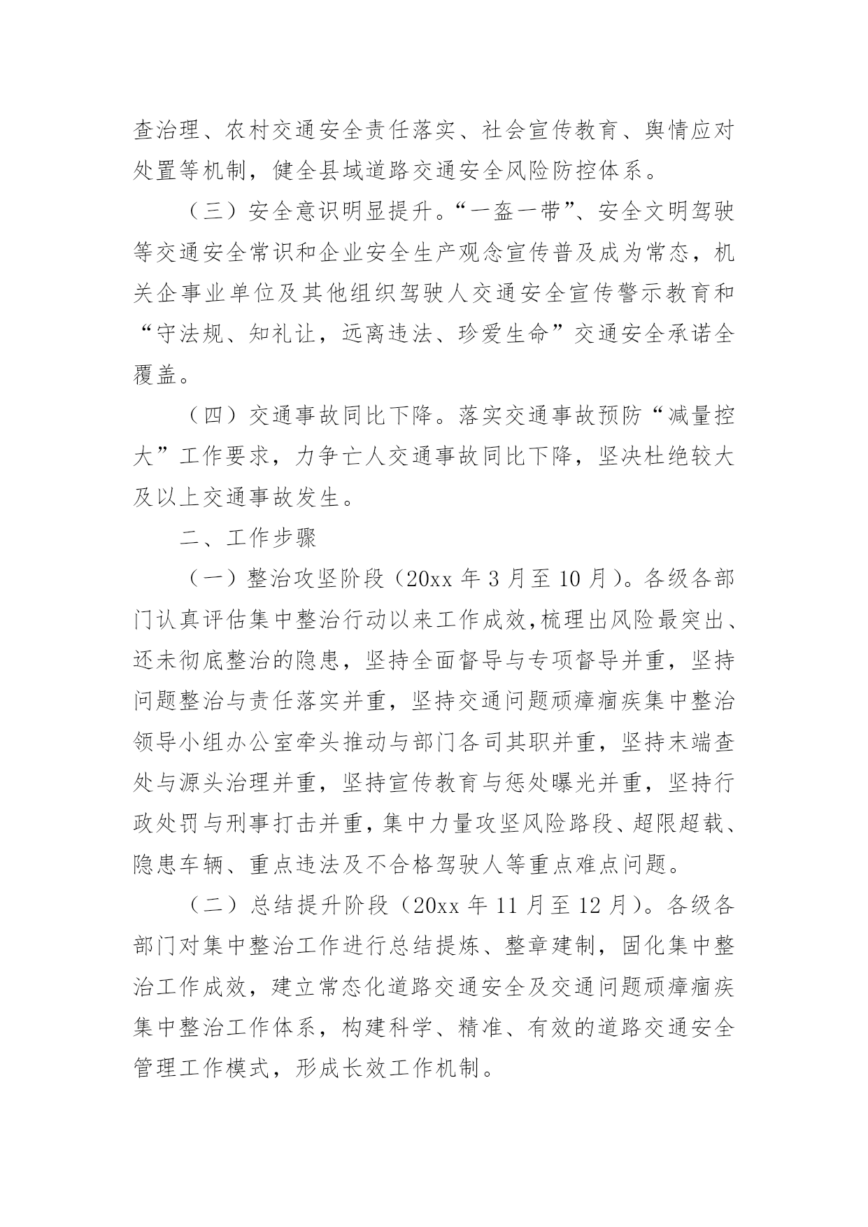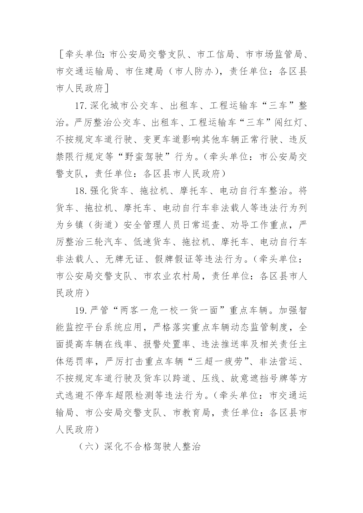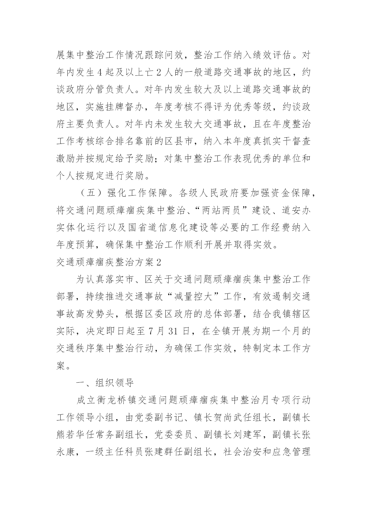 交通顽瘴痼疾整治方案交通顽瘴痼疾整治方案(优选6篇)为了确保工作或事情有序地进行,常常需要预先准备方案,方案是在案前得出的方法计划。方案要怎么制定呢?以下是小编收集整理的交通顽瘴痼疾整治方案,仅供参考,大家一起来看看吧。交通顽瘴痼疾整治方案1为进一步治理交通问题顽瘴痼疾,建设更高水平的平安常德,根据《中共湖南省委办公厅湖南省人民政府办公厅关于印发〈20xx年全省交通问题顽瘴痼疾集中整治行动方案〉的通知》(湘办发电〔20xx〕8号)精神,结合我市实际,制定本方案。一、工作目标全市交通管理责任体系更加完备,防控体系更加健全,安全意识明显提升,交通事故同比下降,实现降事故、保安全、保畅通的总体目标。(一)责任体系更加完备。形成党委领导、政府负责、部门协同、社会参与的综合治理格局,地方属地管理责任、部门行业监管责任、企业安全生产主体责任有效落实,失职渎职人员责任得到严厉追究。(二)防控体系更加健全。完善交通事故倒查问责、多部门协同共治、交通失信行为信用联合惩戒、常态化隐患排查治理、农村交通安全责任落实、社会宣传教育、舆情应对处置等机制,健全县域道路交通安全风险防控体系。(三)安全意识明显提升。“一盔一带”、安全文明驾驶等交通安全常识和企业安全生产观念宣传普及成为常态,机关企事业单位及其他组织驾驶人交通安全宣传警示教育和“守法规、知礼让,远离违法、珍爱生命”交通安全承诺全覆盖。(四)交通事故同比下降。落实交通事故预防“减量控大”工作要求,力争亡人交通事故同比下降,坚决杜绝较大及以上交通事故发生。二、工作步骤(一)整治攻坚阶段(20xx年3月至10月)。各级各部门认真评估集中整治行动以来工作成效,梳理出风险最突出、还未彻底整治的隐患,坚持全面督导与专项督导并重,坚持问题整治与责任落实并重,坚持交通问题顽瘴痼疾集中整治领导小组办公室牵头推动与部门各司其职并重,坚持末端查处与源头治理并重,坚持宣传教育与惩处曝光并重,坚持行政处罚与刑事打击并重,集中力量攻坚风险路段、超限超载、隐患车辆、重点违法及不合格驾驶人等重点难点问题。(二)总结提升阶段(20xx年11月至12月)。各级各部门对集中整治工作进行总结提炼、整章建制,固化集中整治工作成效,建立常态化道路交通安全及交通问题顽瘴痼疾集中整治工作体系,构建科学、精准、有效的道路交通安全管理工作模式,形成长效工作机制。三、工作任务(一)深化农村道路交通安全管理1.加强农村道路安全设施建设。深入排查治理农村公路平交路口及临水临崖、路侧险要、穿村过镇路段安全隐患,排查清理“占道摆摊”;20xx年以来发生过冲出路面翻坠交通事故导致死亡人数累计超过3人的临水临崖、急弯陡坡等路侧险要路段,落实警告标志、减速带、路侧护栏“三必上”;20xx年以来发生一次死亡3人以上交通事故或死亡人数累计超过5人的平交路口,落实警告标志、道路标线、减速带、警示桩、交通信号灯(含闪光警告信号灯)“五必上”。(牵头单位:市交通运输局、市公安局交警支队,责任单位:各区县市人民政府)2.全面压实工作责任。明确乡镇人民政府(街道办事处)道路交通安全管理责任,负责组织协调和督促指导农村道路交通安全工作,整合工作力量,完善工作责任体系,认真落实委托执法相关工作措施,充分履行工作职责。适时开展农村道路交通安全督查,及时发现重大道路交通隐患,实行挂牌督办;对发生较大及以上道路交通事故或整治工作不力的,按规定追责问责。(牵头单位:市道安办,责任单位:各区县市人民政府)3.开展“三无”乡镇建设活动。积极鼓励建设无亡人事故、无酒驾醉驾、无重大道路隐患乡镇,按规定予以奖励。(牵头单位:市道安办,责任单位:各区县市人民政府)(二)深化风险路段整治4.强化高速公路隐患治理。集中治理事故多发、长下坡、桥隧相连、易积水、20xx年以来发生过穿越中央护栏事故且未提质改造等风险路段及紧急停车带、护栏端头等隐患;将大型车辆流量大、穿越事故风险高的高速公路未改造的中央护栏按要求逐步提质升级;完善高速公路货车“靠右行”道路交通标志、监控等设施。(牵头单位:市交通运输局、省高警局常德支队,责任单位:省高速公路集团公司常德分公司及各高速公路经营管理单位)5.加强城市道路隐患治理。深入排查治理影响城市隧道桥梁结构安全、设施设备使用、安全运营等风险隐患,全面提升城市隧道桥梁安全风险防控能力。[牵头单位:市住建局(市人防办),责任单位:各区县市人民政府]6.深入推进国省道隐患治理。完善国省道基础设施,建设交通气象监测预警等设备,治理突出风险隐患,借鉴推广示范路建设经验与做法,全面推动国省道隐患排查治理工作,逐步推进国省道平交路口“五小工程”(减速带、警示牌、凸面镜、道口标柱和爆闪灯)建设。[牵头单位:市交通运输局、市住建局(市人防办)、市气象局、市公安局交警支队,责任单位:各区县