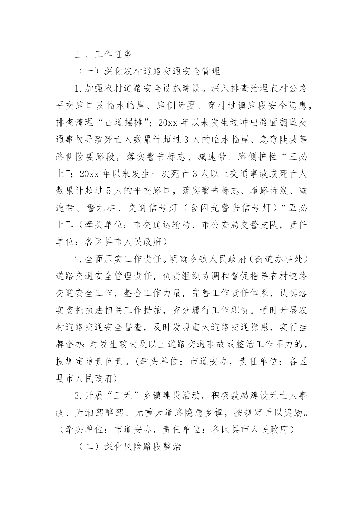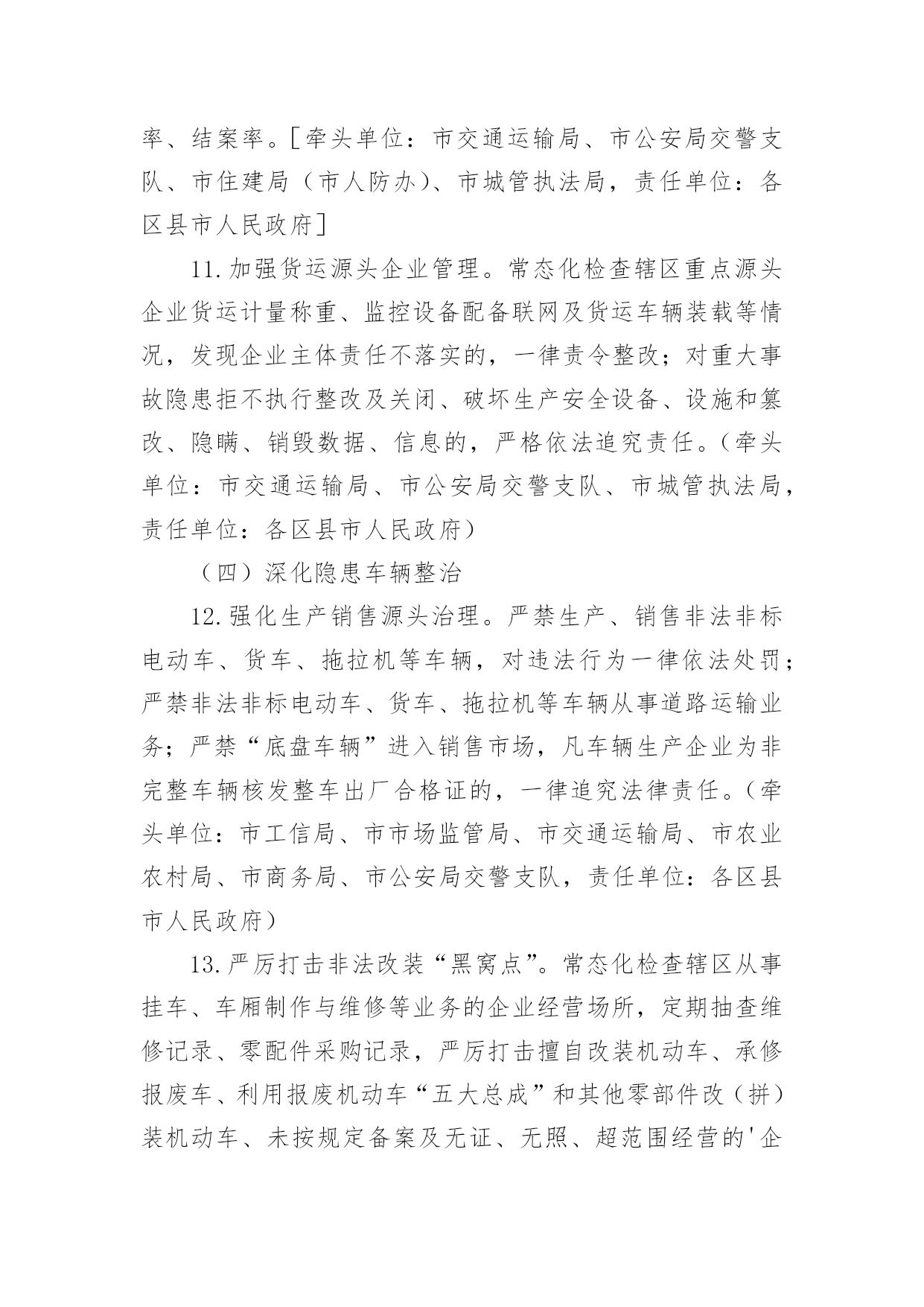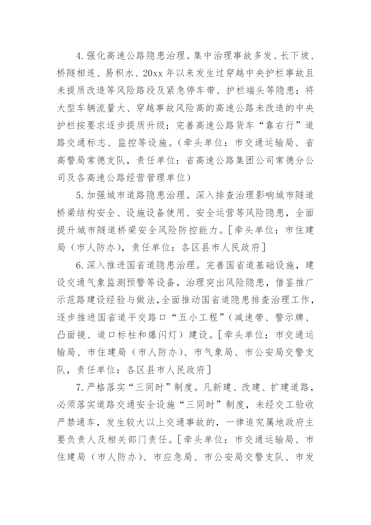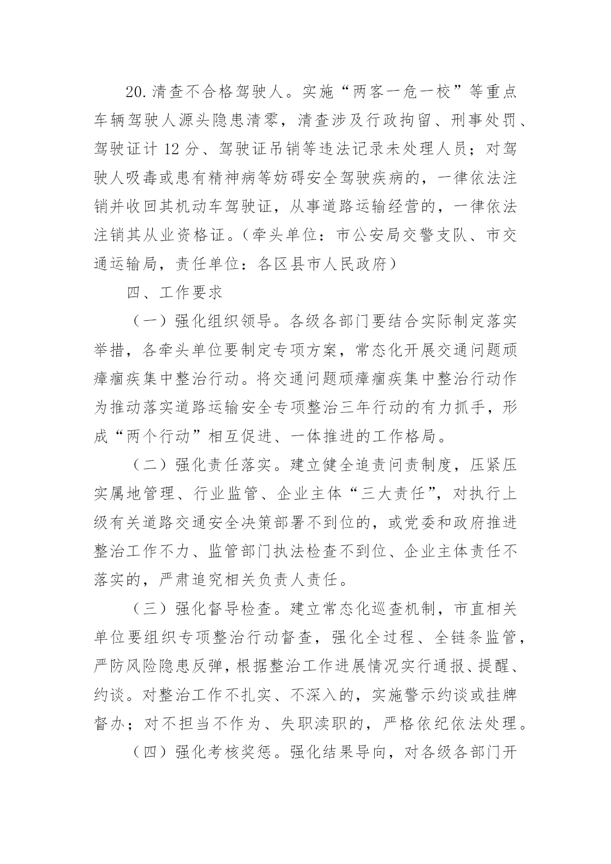 交通顽瘴痼疾整治方案交通顽瘴痼疾整治方案(优选6篇)为了确保工作或事情有序地进行,常常需要预先准备方案,方案是在案前得出的方法计划。方案要怎么制定呢?以下是小编收集整理的交通顽瘴痼疾整治方案,仅供参考,大家一起来看看吧。交通顽瘴痼疾整治方案1为进一步治理交通问题顽瘴痼疾,建设更高水平的平安常德,根据《中共湖南省委办公厅湖南省人民政府办公厅关于印发〈20xx年全省交通问题顽瘴痼疾集中整治行动方案〉的通知》(湘办发电〔20xx〕8号)精神,结合我市实际,制定本方案。一、工作目标全市交通管理责任体系更加完备,防控体系更加健全,安全意识明显提升,交通事故同比下降,实现降事故、保安全、保畅通的总体目标。(一)责任体系更加完备。形成党委领导、政府负责、部门协同、社会参与的综合治理格局,地方属地管理责任、部门行业监管责任、企业安全生产主体责任有效落实,失职渎职人员责任得到严厉追究。(二)防控体系更加健全。完善交通事故倒查问责、多部门协同共治、交通失信行为信用联合惩戒、常态化隐患排查治理、农村交通安全责任落实、社会宣传教育、舆情应对处置等机制,健全县域道路交通安全风险防控体系。(三)安全意识明显提升。“一盔一带”、安全文明驾驶等交通安全常识和企业安全生产观念宣传普及成为常态,机关企事业单位及其他组织驾驶人交通安全宣传警示教育和“守法规、知礼让,远离违法、珍爱生命”交通安全承诺全覆盖。(四)交通事故同比下降。落实交通事故预防“减量控大”工作要求,力争亡人交通事故同比下降,坚决杜绝较大及以上交通事故发生。二、工作步骤(一)整治攻坚阶段(20xx年3月至10月)。各级各部门认真评估集中整治行动以来工作成效,梳理出风险最突出、还未彻底整治的隐患,坚持全面督导与专项督导并重,坚持问题整治与责任落实并重,坚持交通问题顽瘴痼疾集中整治领导小组办公室牵头推动与部门各司其职并重,坚持末端查处与源头治理并重,坚持宣传教育与惩处曝光并重,坚持行政处罚与刑事打击并重,集中力量攻坚风险路段、超限超载、隐患车辆、重点违法及不合格驾驶人等重点难点问题。(二)总结提升阶段(20xx年11月至12月)。各级各部门对集中整治工作进行总结提炼、整章建制,固化集中整治工作成效,建立常态化道路交通安全及交通问题顽瘴痼疾集中整治工作体系,构建科学、精准、有效的道路交通安全管理工作模式,形成长效工作机制。三、工作任务(一)深化农村道路交通安全管理1.加强农村道路安全设施建设。深入排查治理农村公路平交路口及临水临崖、路侧险要、穿村过镇路段安全隐患,排查清理“占道摆摊”;20xx年以来发生过冲出路面翻坠交通事故导致死亡人数累计超过3人的临水临崖、急弯陡坡等路侧险要路段,落实警告标志、减速带、路侧护栏“三必上”;20xx年以来发生一次死亡3人以上交通事故或死亡人数累计超过5人的平交路口,落实警告标志、道路标线、减速带、警示桩、交通信号灯(含闪光警告信号灯)“五必上”。(牵头单位:市交通运输局、市公安局交警支队,责任单位:各区县市人民政府)2.全面压实工作责任。明确乡镇人民政府(街道办事处)道路交通安全管理责任,负责组织协调和督促指导农村道路交通安全工作,整合工作力量,完善工作责任体系,认真落实委托执法相关工作措施,充分履行工作职责。适时开展农村道路交通安全督查,及时发现重大道路交通隐患,实行挂牌督办;对发生较大及以上道路交通事故或整治工作不力的,按规定追责问责。(牵头单位:市道安办,责任单位:各区县市人民政府)3.开展“三无”乡镇建设活动。积极鼓励建设无亡人事故、无酒驾醉驾、无重大道路隐患乡镇,按规定予以奖励。(牵头单位:市道安办,责任单位:各区县市人民政府)(二)深化风险路段整治4.强化高速公路隐患治理。集中治理事故多发、长下坡、桥隧相连、易积水、20xx年以来发生过穿越中央护栏事故且未提质改造等风险路段及紧急停车带、护栏端头等隐患;将大型车辆流量大、穿越事故风险高的高速公路未改造的中央护栏按要求逐步提质升级;完善高速公路货车“靠右行”道路交通标志、监控等设施。(牵头单位:市交通运输局、省高警局常德支队,责任单位:省高速公路集团公司常德分公司及各高速公路经营管理单位)5.加强城市道路隐患治理。深入排查治理影响城市隧道桥梁结构安全、设施设备使用、安全运营等风险隐患,全面提升城市隧道桥梁安全风险防控能力。[牵头单位:市住建局(市人防办),责任单位:各区县市人民政府]6.深入推进国省道隐患治理。完善国省道基础设施,建设交通气象监测预警等设备,治理突出风险隐患,借鉴推广示范路建设经验与做法,全面推动国省道隐患排查治理工作,逐步推进国省道平交路口“五小工程”(减速带、警示牌、凸面镜、道口标柱和爆闪灯)建设。[牵头单位:市交通运输局、市住建局(市人防办)、市气象局、市公安局交警支队,责任单位:各区县