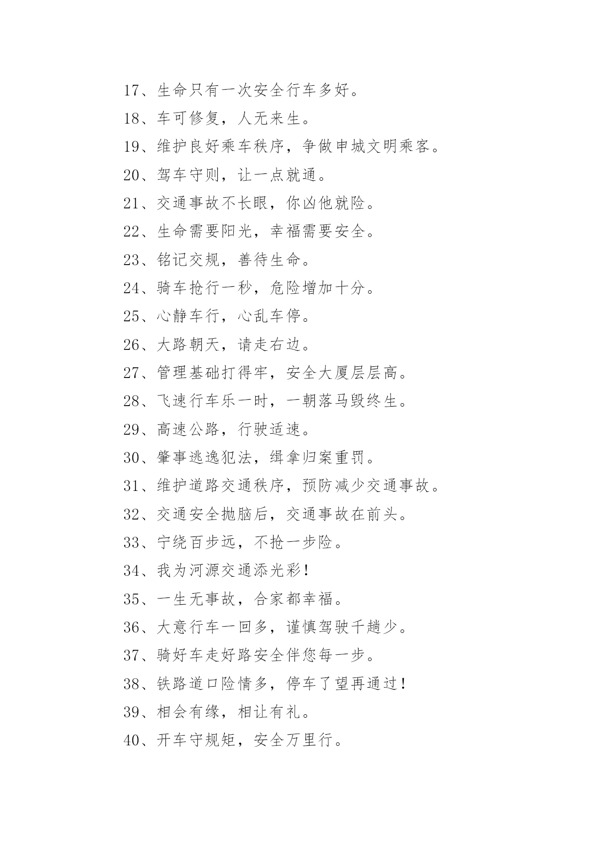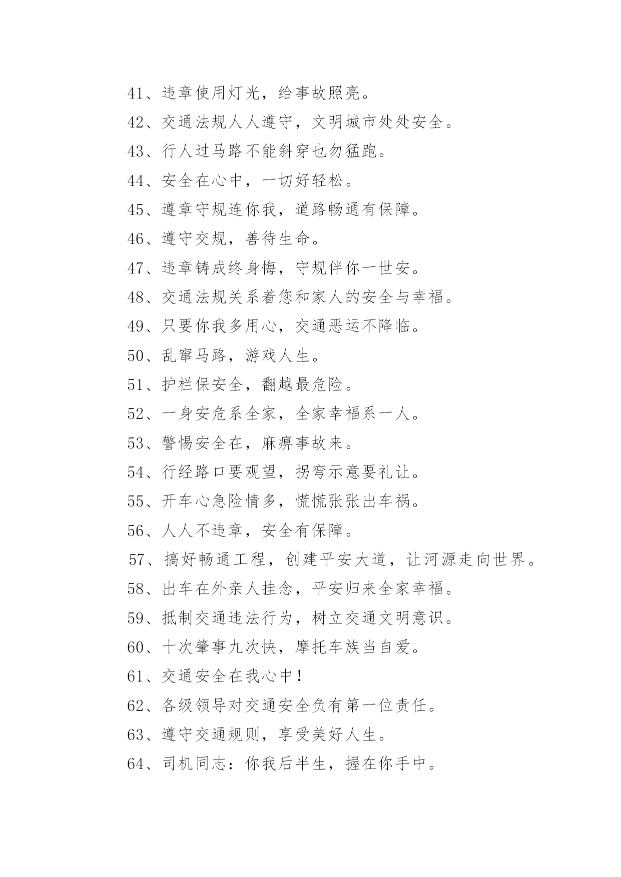 交通安全教育宣传标语2021年交通安全教育宣传标语在学习、工作乃至生活中,大家都知道一些经典的标语吧,标语在一定程度上反映了社会经济制度的本质和社会的文明程度,它的意义十分重大。还在苦苦寻找优秀经典的标语吗?以下是小编为大家收集的'2021年交通安全教育宣传标语,仅供参考,希望能够帮助到大家。1、违法超载的重罚,酒后驾车害人害己。2、上班早出十分钟,路上安全有保证。3、握好方向盘,心中装安全。4、纠正您的违章是为了您和他人的安全。5、行人过马路要先看左,后看右,左右看清再通过。6、车好路好,安全。7、管理靠制度,制度在落实。8、司机遵章千家乐,安全畅通百业兴。9、人行横道车让人,各种车道人让车。10、拒酒千里外,安全万里行。11、经济以市场为本,交通以安全为先。12、守交规迎春夏秋冬福,保安全纳东西南北财。13、骑车上路别着急,争超抢道不安全。14、加强管理为人民群众,严格执法保交通安全。15、为了您和他人的幸福,请自觉遵守交通法规。16、将道路交通安全教育纳入学校法制教育的内容。17、生命只有一次安全行车多好。18、车可修复,人无来生。19、维护良好乘车秩序,争做申城文明乘客。20、驾车守则,让一点就通。21、交通事故不长眼,你凶他就险。22、生命需要阳光,幸福需要安全。23、铭记交规,善待生命。24、骑车抢行一秒,危险增加十分。25、心静车行,心乱车停。26、大路朝天,请走右边。27、管理基础打得牢,安全大厦层层高。28、飞速行车乐一时,一朝落马毁终生。29、高速公路,行驶适速。30、肇事逃逸犯法,缉拿归案重罚。31、维护道路交通秩序,预防减少交通事故。32、交通安全抛脑后,交通事故在前头。33、宁绕百步远,不抢一步险。34、我为河源交通添光彩!35、一生无事故,合家都幸福。36、大意行车一回多,谨慎驾驶千趟少。37、骑好车走好路安全伴您每一步。38、铁路道口险情多,停车了望再通过!39、相会有缘,相让有礼。40、开车守规矩,安全万里行。41、违章使用灯光,给事故照亮。42、交通法规人人遵守,文明城市处处安全。43、行人过马路不能斜穿也勿猛跑。44、安全在心中,一切好轻松。45、遵章守规连你我,道路畅通有保障。46、遵守交规,善待生命。47、违章铸成终身悔,守规伴你一世安。48、交通法规关系着您和家人的安全与幸福。49、只要你我多用心,交通恶运不降临。50、乱窜马路,游戏人生。51、护栏保安全,翻越最危险。52、一身安危系全家,全家幸福系一人。53、警惕安全在,麻痹事故来。54、行经路口要观望,拐弯示意要礼让。55、开车心急险情多,慌慌张张出车祸。56、人人不违章,安全有保障。57、搞好畅通工程,创建平安大道,让河源走向世界。58、出车在外亲人挂念,平安归来全家幸福。59、抵制交通违法行为,树立交通文明意识。60、十次肇事九次快,摩托车族当自爱。61、交通安全在我心中!62、各级领导对交通安全负有第一位责任。63、遵守交通规则,享受美好人生。64、司机同志:你我后半生,握在你手中。65、维护交通秩序,遵守社会公德。66、道路连者你和他,安全系着千万家。67、头戴小黄帽上学必不可少。68、加强综合治理,保障交通安全。69、礼让礼让,人车无恙。70、人的生命只有一次,请您注意交通安全。