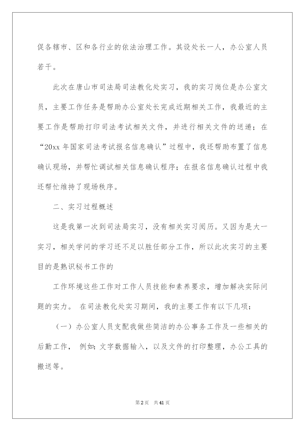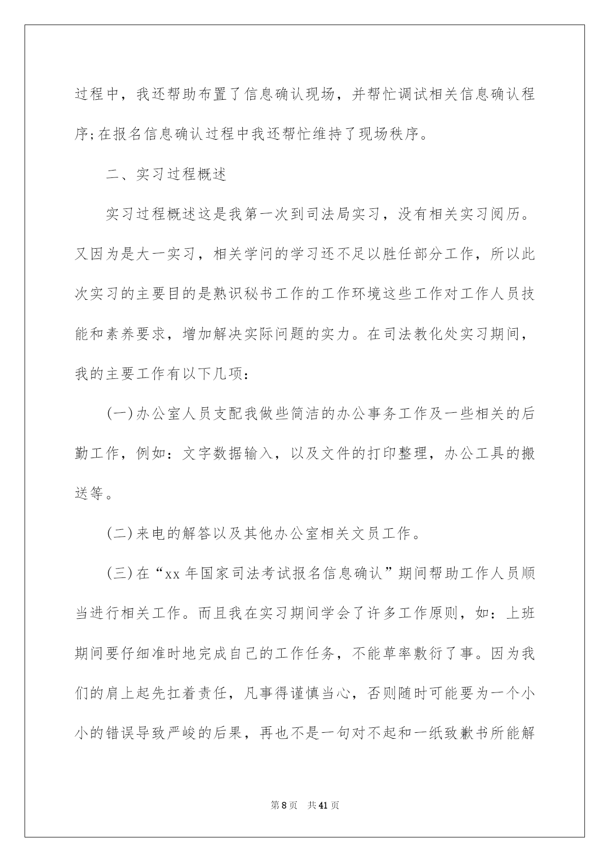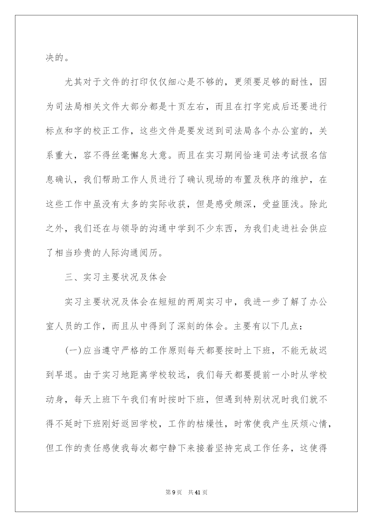 第PAGE\*Arabic\*MERGEFORMAT41页共NUMPAGES\*Arabic\*MERGEFORMAT41页第PAGE\*MERGEFORMAT41页共NUMPAGES\*MERGEFORMAT41页第PAGE\*MERGEFORMAT41页共NUMPAGES\*MERGEFORMAT41页第PAGE\*MERGEFORMAT41页共NUMPAGES\*MERGEFORMAT41页第PAGE\*MERGEFORMAT41页共NUMPAGES\*MERGEFORMAT41页第PAGE\*MERGEFORMAT41页共NUMPAGES\*MERGEFORMAT41页第PAGE\*MERGEFORMAT41页共NUMPAGES\*MERGEFORMAT41页第PAGE\*MERGEFORMAT41页共NUMPAGES\*MERGEFORMAT41页第PAGE\*MERGEFORMAT41页共NUMPAGES\*MERGEFORMAT41页第PAGE\*MERGEFORMAT41页共NUMPAGES\*MERGEFORMAT41页第PAGE\*MERGEFORMAT41页共NUMPAGES\*MERGEFORMAT41页2022在司法局实习报告在司法局实习报告8篇随着个人的文明素养不断提升,我们都不行避开地要接触到报告,报告具有成文事后性的特点。你所见过的报告是什么样的呢?下面是我为大家收集的在司法局实习报告8篇,欢迎阅读与保藏。在司法局实习报告篇1为了巩固中文专业的理论学问,将理论应用于实践,丰富实际工作和社会的阅历,提高实践实力,达到理论与实践相结合,依据学校教学支配,我于20xx年6月29日至7月10日在唐山市司法局司法教化处进行为期两周的实习。现将实习状况汇报如下:一、实习单位及岗位简介唐山市司法局司法教处是司法局,它主要负责指导、管理、监督全市的法律服务工作,监督、管理全市律师事务所、公证处、法律服务所和在我市设立的外国(境外)律师、公证机构。承办社会法律询问机构资质的审批,负责基层法律服务所执业许可和年检的核准工作。并依据市委依法治市领导小组的部署,承办依法治市工作,协调、督促各辖市、区和各行业的依法治理工作。其设处长一人,办公室人员若干。此次在唐山市司法局司法教化处实习,我的实习岗位是办公室文员,主要工作任务是帮助办公室处长完成近期相关工作,我最近的主要工作是帮助打印司法考试相关文件,并进行相关文件的送递;在“20xx年国家司法考试报名信息确认”过程中,我还帮助布置了信息确认现场,并帮忙调试相关信息确认程序;在报名信息确认过程中我还帮忙维持了现场秩序。二、实习过程概述这是我第一次到司法局实习,没有相关实习阅历。又因为是大一实习,相关学问的学习还不足以胜任部分工作,所以此次实习的主要目的是熟识秘书工作的工作环境这些工作对工作人员技能和素养要求,增加解决实际问题的实力。在司法教化处实习期间,我的主要工作有以下几项:(一)办公室人员支配我做些简洁的办公事务工作及一些相关的后勤工作,例如:文字数据输入,以及文件的打印整理,办公工具的搬送等。(二)来电的解答以及其他办公室相关文员工作。(三)在“20xx年国家司法考试报名信息确认”期间帮助工作人员顺当进行相关工作。而且我在实习期间学会了许多工作原则,如:上班期间要仔细准时地完成自己的工作任务,不能草率敷衍了事。因为我们的肩上起先扛着责任,凡事得谨慎当心,否则随时可能要为一个小小的错误导致严峻的后果,再也不是一句对不起和一纸致歉书所能解决的。尤其对于文件的打印仅仅细心是不够的,更须要足够的耐性,因为司法局相关文件大部分都是十页左右,而且在打字完成后还要进行标点和字的校正工作,这些文件是要发送到司法局各个办公室的,关系重大,容不得丝毫懈怠大意。而且在实习期间恰逢司法考试报名信息确认,我们帮助工作人员进行了确认现场的布置及秩序的维护,在这些工作中虽没有太多的实际收获,但是感受颇深,受益匪浅。除此之外,我们还在与领导的沟通中学到不少东西,为我们走进社会供应了相当珍贵的人际沟通阅历。三、实习主要状况及体会在短短的两周实习中,我进一步了解了办公室人员的工作,而且从中得到了深刻的体会。主要有以下几点:(一)应当遵守严格的工作原则每天都要按时上下班,不能无故迟到早退。由于实习地距离学校较远,我们每天都要提前一小时从学校动身,每天上班下午我们有时按时下班,但遇到特别状况时我们就不得不延时下班刚好返回学校,工作的枯燥性,时常使我产生厌烦心情,但工作的责任感使我每次都宁静下来接着坚持完成工作任务,这使得我的工作耐性有了极大的提高。(