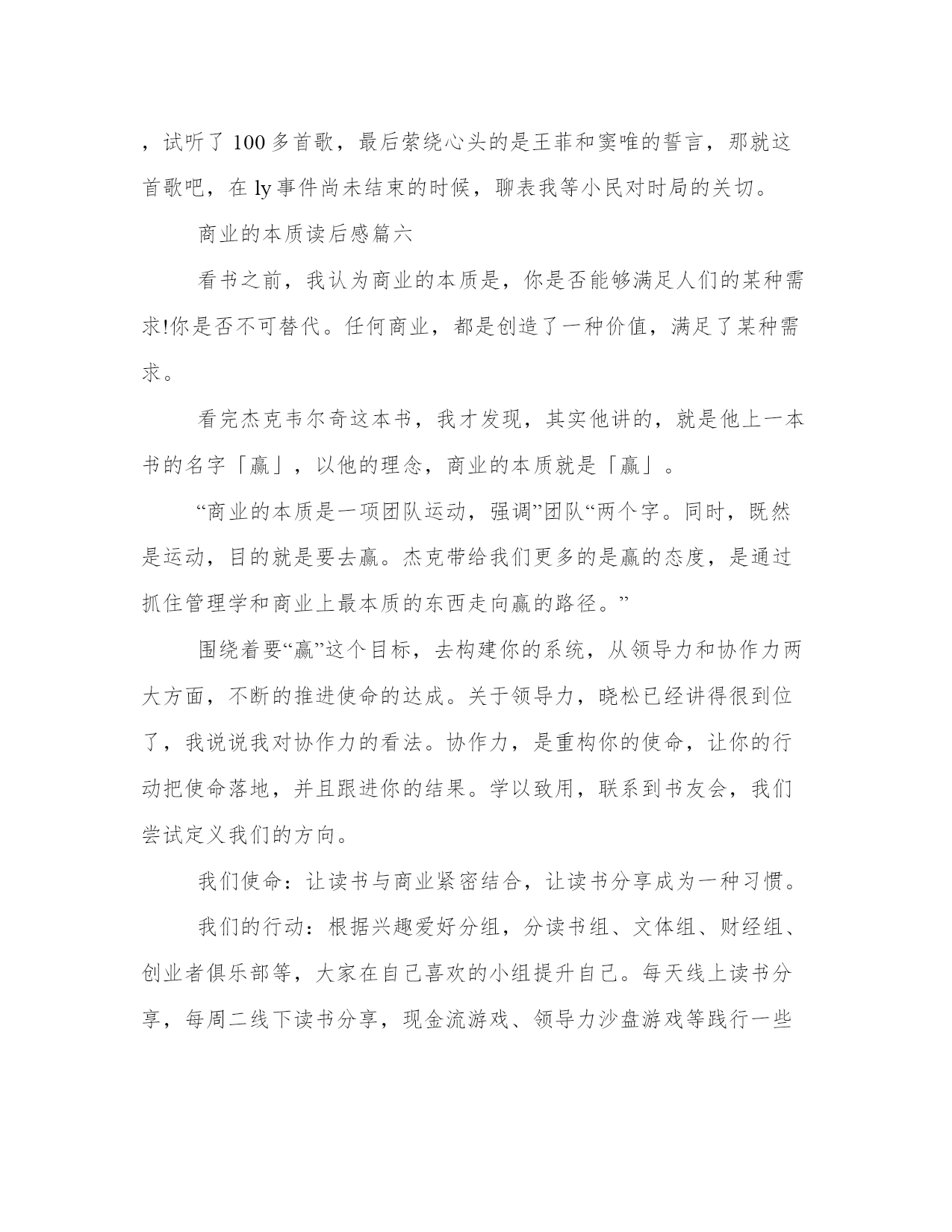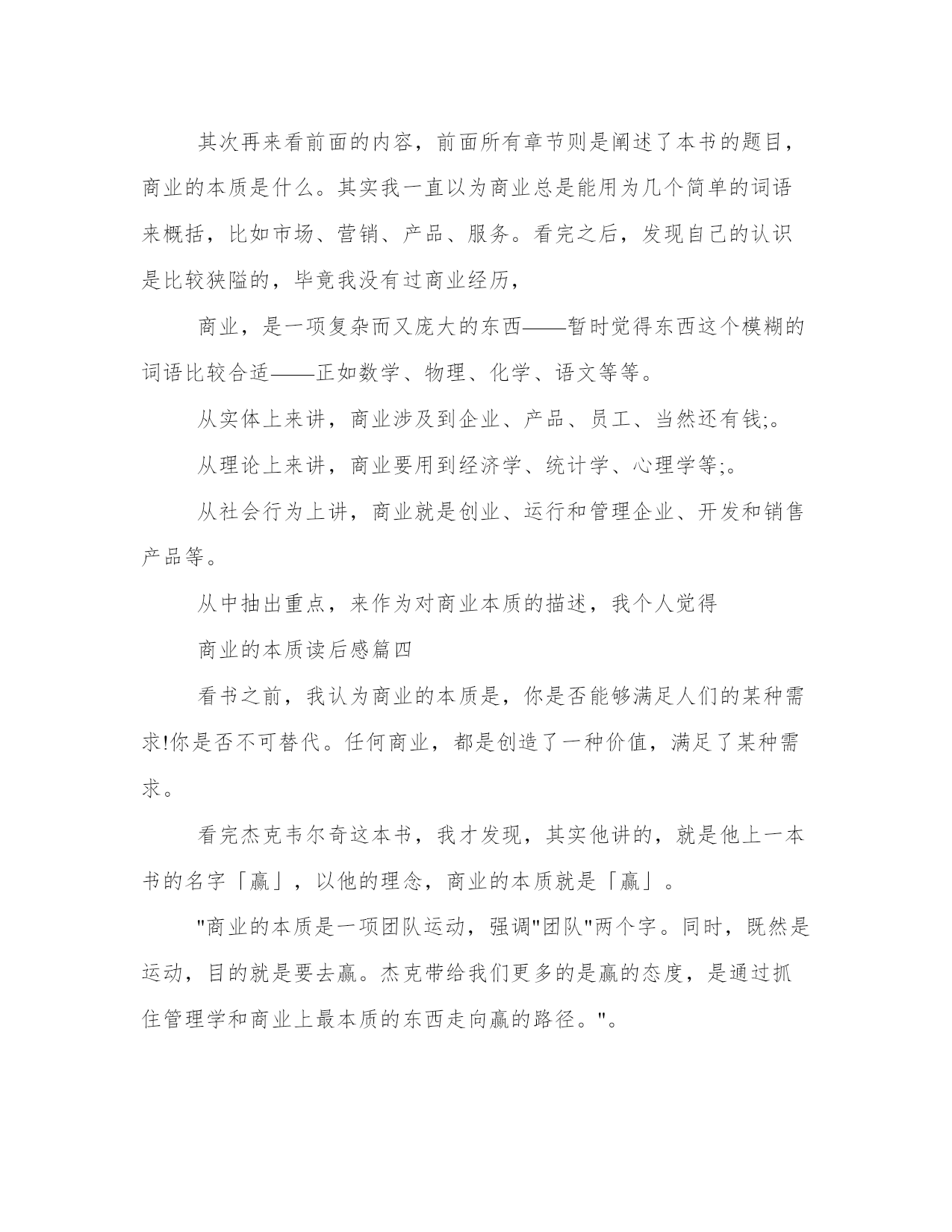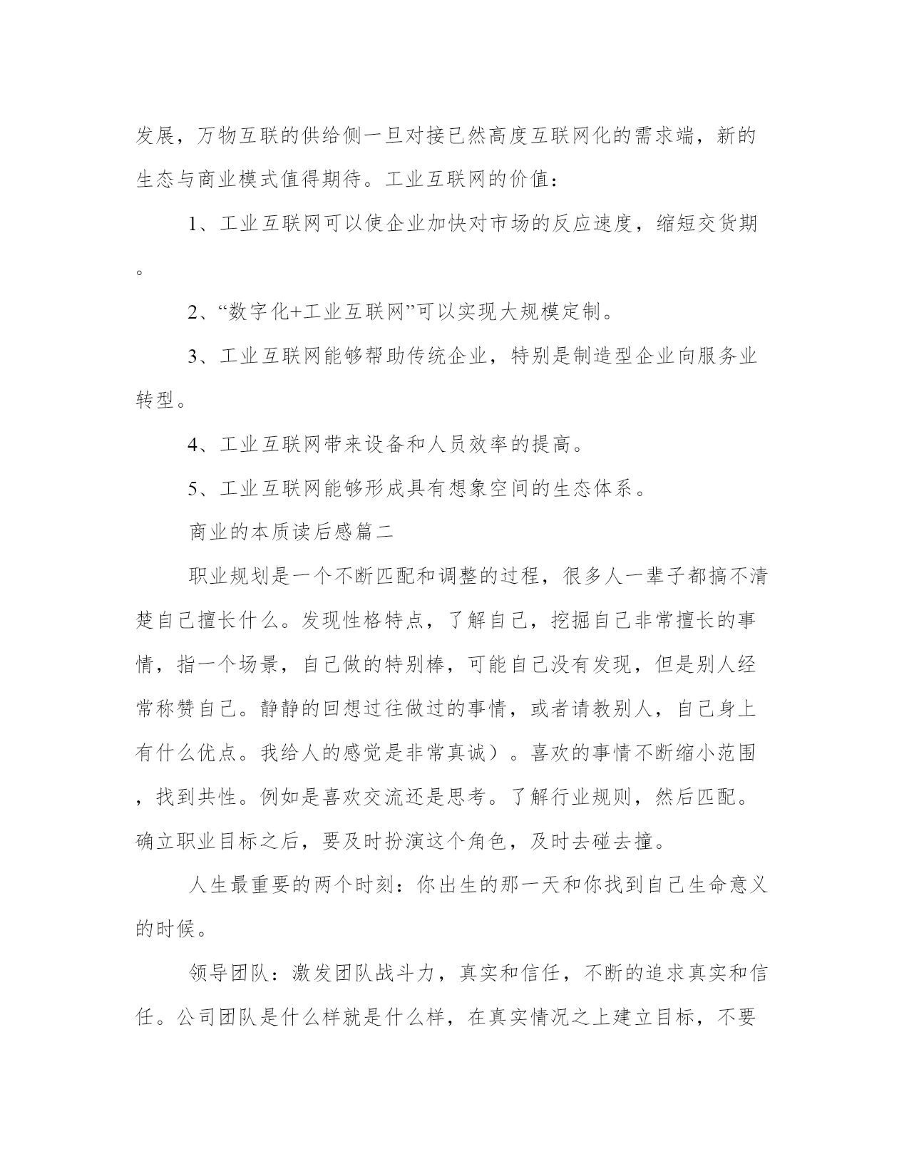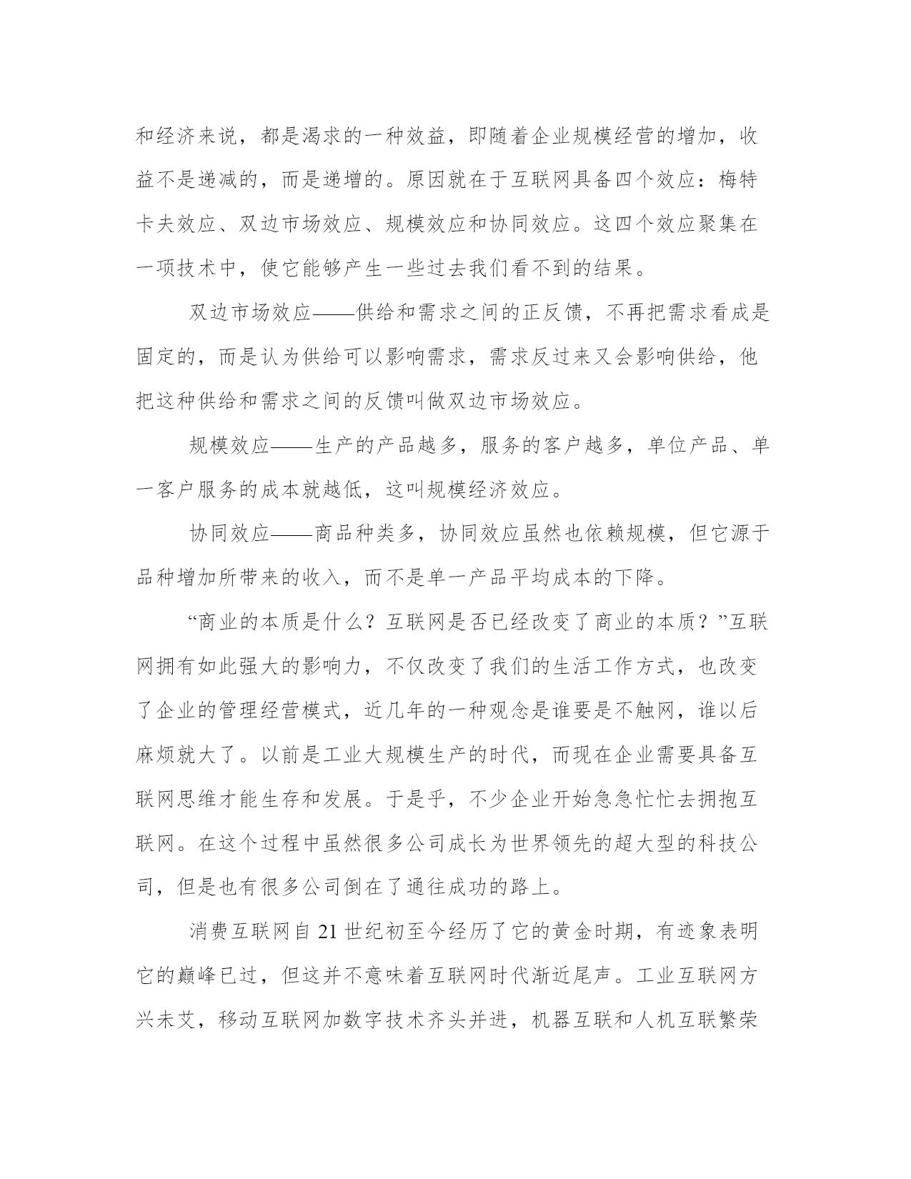 最新商业的本质读后感(大全8篇)在观看完一部作品以后,一定对生活有了新的感悟和看法吧,为此需要好好认真地写读后感。什么样的读后感才能对得起这个作品所表达的含义呢?以下是小编为大家准备的读后感精彩范文,希望对大家有帮助!商业的本质读后感篇一商业的本质是如何去创造价值,价值创造又两个标准:第一个标准是你能开发出市场接受的新产品和服务,也就是别人没有做的产品你做出来了,你创造价值了。第二个标准是价值创造的方法,你不能做出新产品没关系,你生产产品的成本比别人低,这也叫创造价值。“在互联网时代,我们看到过很多企业长期不盈利,有人就讲说你们老讲企业要盈利,这是一种落后的观念。”这种观念本身是违反商业本质的,已经在企业经营的最重要的目标上迷失了方向。那么创造价值和赚钱是什么关系?“很多企业家都问过我这个问题,其实,赚钱未必创造价值,而创造价值总要赚钱。”如果创造价值而未赚到钱,这是短期的事情,从长期来说,创造了价值,要想不赚钱都很难。在传统的行业里,我们看到的都是收益递减,而在互联网技术应用企业中,市场上可以呈现出非常难得的收益递增现象,这对于企业和经济来说,都是渴求的一种效益,即随着企业规模经营的增加,收益不是递减的,而是递增的。原因就在于互联网具备四个效应:梅特卡夫效应、双边市场效应、规模效应和协同效应。这四个效应聚集在一项技术中,使它能够产生一些过去我们看不到的结果。双边市场效应——供给和需求之间的正反馈,不再把需求看成是固定的,而是认为供给可以影响需求,需求反过来又会影响供给,他把这种供给和需求之间的反馈叫做双边市场效应。规模效应——生产的产品越多,服务的客户越多,单位产品、单一客户服务的成本就越低,这叫规模经济效应。协同效应——商品种类多,协同效应虽然也依赖规模,但它源于品种增加所带来的收入,而不是单一产品平均成本的下降。“商业的本质是什么?互联网是否已经改变了商业的本质?”互联网拥有如此强大的影响力,不仅改变了我们的生活工作方式,也改变了企业的管理经营模式,近几年的一种观念是谁要是不触网,谁以后麻烦就大了。以前是工业大规模生产的时代,而现在企业需要具备互联网思维才能生存和发展。于是乎,不少企业开始急急忙忙去拥抱互联网。在这个过程中虽然很多公司成长为世界领先的超大型的科技公司,但是也有很多公司倒在了通往成功的路上。消费互联网自21世纪初至今经历了它的黄金时期,有迹象表明它的巅峰已过,但这并不意味着互联网时代渐近尾声。工业互联网方兴未艾,移动互联网加数字技术齐头并进,机器互联和人机互联繁荣发展,万物互联的供给侧一旦对接已然高度互联网化的需求端,新的生态与商业模式值得期待。工业互联网的价值:1、工业互联网可以使企业加快对市场的反应速度,缩短交货期。2、“数字化+工业互联网”可以实现大规模定制。3、工业互联网能够帮助传统企业,特别是制造型企业向服务业转型。4、工业互联网带来设备和人员效率的提高。5、工业互联网能够形成具有想象空间的生态体系。商业的本质读后感篇二职业规划是一个不断匹配和调整的过程,很多人一辈子都搞不清楚自己擅长什么。发现性格特点,了解自己,挖掘自己非常擅长的事情,指一个场景,自己做的特别棒,可能自己没有发现,但是别人经常称赞自己。静静的回想过往做过的事情,或者请教别人,自己身上有什么优点。我给人的感觉是非常真诚)。喜欢的事情不断缩小范围,找到共性。例如是喜欢交流还是思考。了解行业规则,然后匹配。确立职业目标之后,要及时扮演这个角色,及时去碰去撞。人生最重要的两个时刻:你出生的那一天和你找到自己生命意义的时候。领导团队:激发团队战斗力,真实和信任,不断的追求真实和信任。公司团队是什么样就是什么样,在真实情况之上建立目标,不要过于乐观。例如海贼模式,对自己负责,成为领导者之前,自己的成功来自于自己的成长。成为领导之后,自己的成功来自于帮助他人的成长。公司的业绩需要持续的增长,为公司注入新鲜的血液,进行换血。每个人都是有价值的,但是公司没有时间去匹配,公司只负责用人,教育是上帝的事情,即使给员工高额的赔偿金也是可以得。新鲜血液带来新的想法,逼迫原来的团队不断的成长,集中资源,全力以赴的投入,不要低估对手。创新:每个员工都要有优化自己手上工作的意识。对人才的重视程度,好公司就是好人才聚集的公司。薪酬:和优秀人员谈感情就是耍流氓,就是谈钱。协同力:使命,行动,结果。使命和员工:尼尔森改使命,目标远大,鼓舞人心,切合实际。行为:拥有开放的思维,有整合数据的热情(保安,小区,扫码枪)。结果:奖励促进使命的行为。没有落实机制的保障没有人听得进去。解雇和公司使命的不一样的人,发两次大的奖金和目标相关。不能留的人:无所事事,胆小懦弱,陈词滥调。ceo需要不断向员工解释为什么要这么