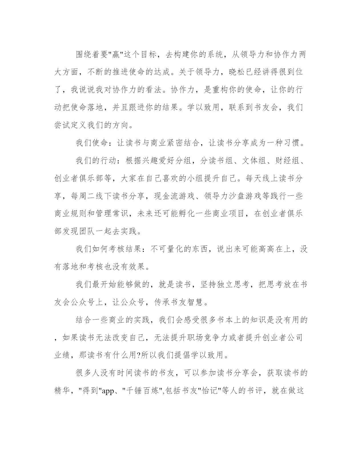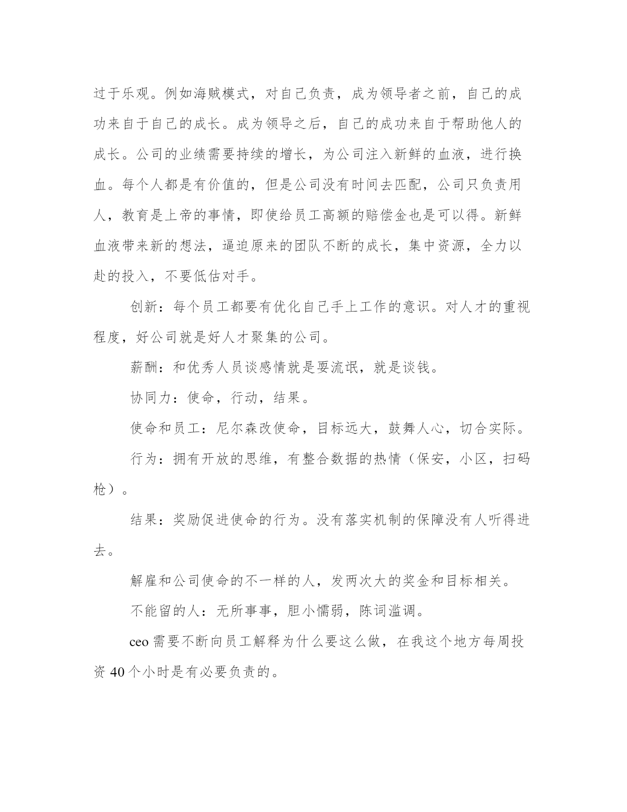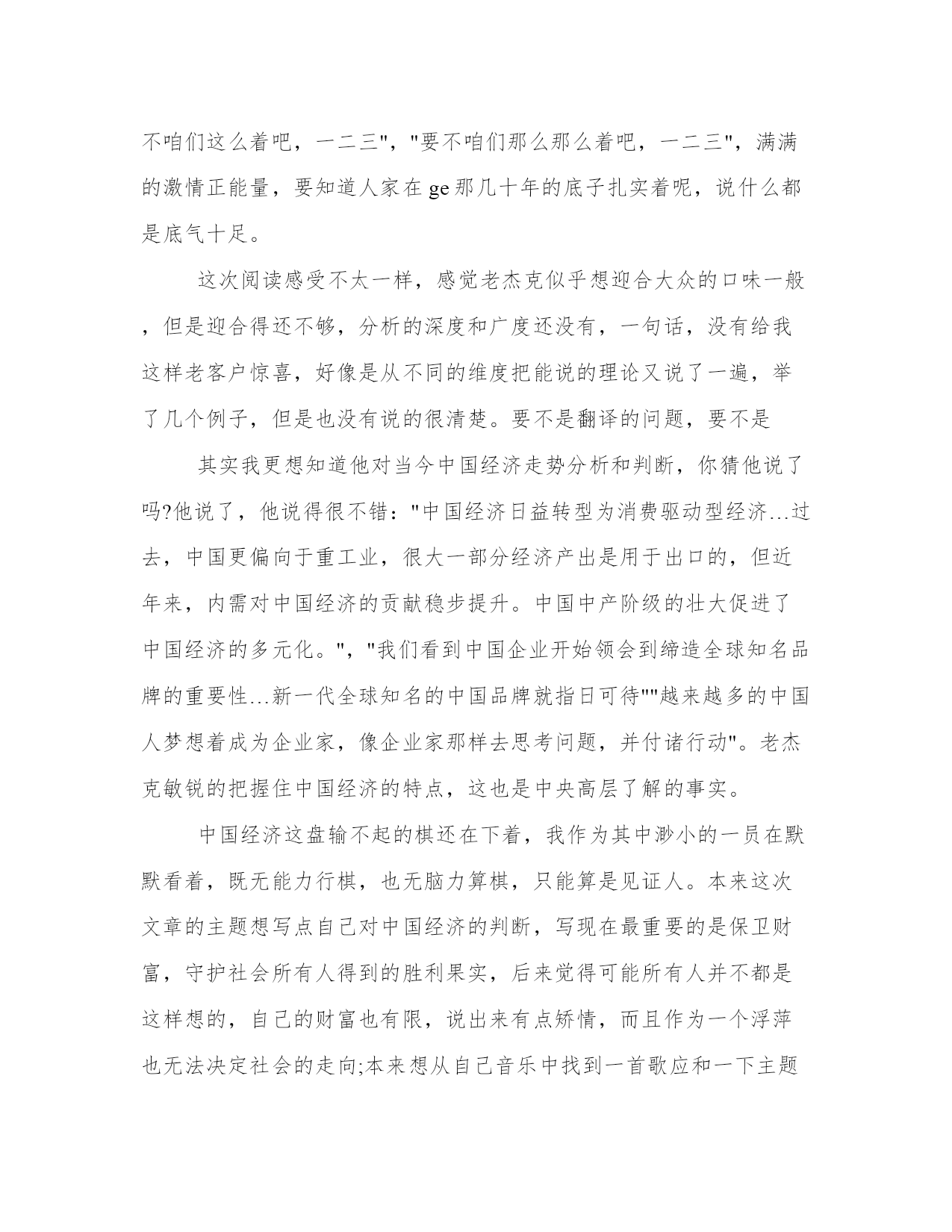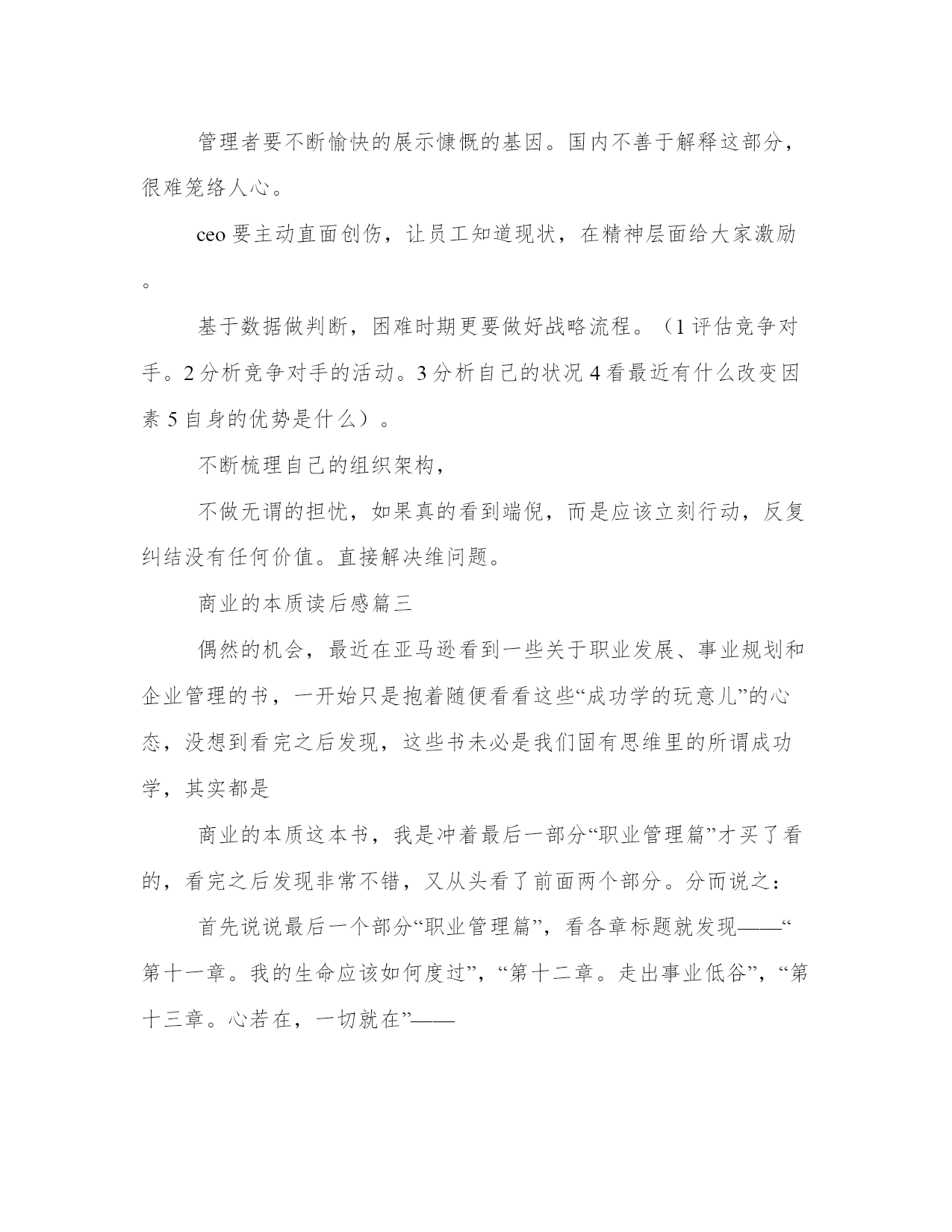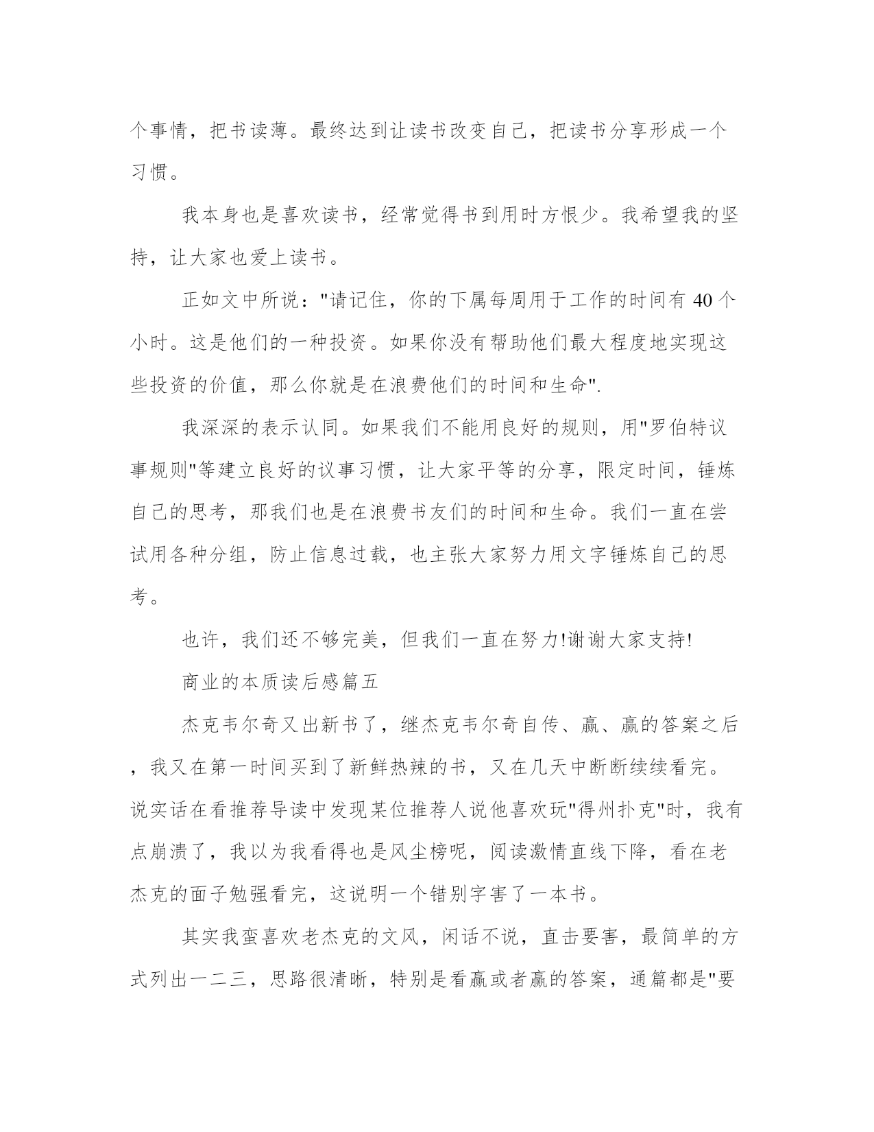 最新商业的本质读后感(大全8篇)在观看完一部作品以后,一定对生活有了新的感悟和看法吧,为此需要好好认真地写读后感。什么样的读后感才能对得起这个作品所表达的含义呢?以下是小编为大家准备的读后感精彩范文,希望对大家有帮助!商业的本质读后感篇一商业的本质是如何去创造价值,价值创造又两个标准:第一个标准是你能开发出市场接受的新产品和服务,也就是别人没有做的产品你做出来了,你创造价值了。第二个标准是价值创造的方法,你不能做出新产品没关系,你生产产品的成本比别人低,这也叫创造价值。“在互联网时代,我们看到过很多企业长期不盈利,有人就讲说你们老讲企业要盈利,这是一种落后的观念。”这种观念本身是违反商业本质的,已经在企业经营的最重要的目标上迷失了方向。那么创造价值和赚钱是什么关系?“很多企业家都问过我这个问题,其实,赚钱未必创造价值,而创造价值总要赚钱。”如果创造价值而未赚到钱,这是短期的事情,从长期来说,创造了价值,要想不赚钱都很难。在传统的行业里,我们看到的都是收益递减,而在互联网技术应用企业中,市场上可以呈现出非常难得的收益递增现象,这对于企业和经济来说,都是渴求的一种效益,即随着企业规模经营的增加,收益不是递减的,而是递增的。原因就在于互联网具备四个效应:梅特卡夫效应、双边市场效应、规模效应和协同效应。这四个效应聚集在一项技术中,使它能够产生一些过去我们看不到的结果。双边市场效应——供给和需求之间的正反馈,不再把需求看成是固定的,而是认为供给可以影响需求,需求反过来又会影响供给,他把这种供给和需求之间的反馈叫做双边市场效应。规模效应——生产的产品越多,服务的客户越多,单位产品、单一客户服务的成本就越低,这叫规模经济效应。协同效应——商品种类多,协同效应虽然也依赖规模,但它源于品种增加所带来的收入,而不是单一产品平均成本的下降。“商业的本质是什么?互联网是否已经改变了商业的本质?”互联网拥有如此强大的影响力,不仅改变了我们的生活工作方式,也改变了企业的管理经营模式,近几年的一种观念是谁要是不触网,谁以后麻烦就大了。以前是工业大规模生产的时代,而现在企业需要具备互联网思维才能生存和发展。于是乎,不少企业开始急急忙忙去拥抱互联网。在这个过程中虽然很多公司成长为世界领先的超大型的科技公司,但是也有很多公司倒在了通往成功的路上。消费互联网自21世纪初至今经历了它的黄金时期,有迹象表明它的巅峰已过,但这并不意味着互联网时代渐近尾声。工业互联网方兴未艾,移动互联网加数字技术齐头并进,机器互联和人机互联繁荣发展,万物互联的供给侧一旦对接已然高度互联网化的需求端,新的生态与商业模式值得期待。工业互联网的价值:1、工业互联网可以使企业加快对市场的反应速度,缩短交货期。2、“数字化+工业互联网”可以实现大规模定制。3、工业互联网能够帮助传统企业,特别是制造型企业向服务业转型。4、工业互联网带来设备和人员效率的提高。5、工业互联网能够形成具有想象空间的生态体系。商业的本质读后感篇二职业规划是一个不断匹配和调整的过程,很多人一辈子都搞不清楚自己擅长什么。发现性格特点,了解自己,挖掘自己非常擅长的事情,指一个场景,自己做的特别棒,可能自己没有发现,但是别人经常称赞自己。静静的回想过往做过的事情,或者请教别人,自己身上有什么优点。我给人的感觉是非常真诚)。喜欢的事情不断缩小范围,找到共性。例如是喜欢交流还是思考。了解行业规则,然后匹配。确立职业目标之后,要及时扮演这个角色,及时去碰去撞。人生最重要的两个时刻:你出生的那一天和你找到自己生命意义的时候。领导团队:激发团队战斗力,真实和信任,不断的追求真实和信任。公司团队是什么样就是什么样,在真实情况之上建立目标,不要过于乐观。例如海贼模式,对自己负责,成为领导者之前,自己的成功来自于自己的成长。成为领导之后,自己的成功来自于帮助他人的成长。公司的业绩需要持续的增长,为公司注入新鲜的血液,进行换血。每个人都是有价值的,但是公司没有时间去匹配,公司只负责用人,教育是上帝的事情,即使给员工高额的赔偿金也是可以得。新鲜血液带来新的想法,逼迫原来的团队不断的成长,集中资源,全力以赴的投入,不要低估对手。创新:每个员工都要有优化自己手上工作的意识。对人才的重视程度,好公司就是好人才聚集的公司。薪酬:和优秀人员谈感情就是耍流氓,就是谈钱。协同力:使命,行动,结果。使命和员工:尼尔森改使命,目标远大,鼓舞人心,切合实际。行为:拥有开放的思维,有整合数据的热情(保安,小区,扫码枪)。结果:奖励促进使命的行为。没有落实机制的保障没有人听得进去。解雇和公司使命的不一样的人,发两次大的奖金和目标相关。不能留的人:无所事事,胆小懦弱,陈词滥调。ceo需要不断向员工解释为什么要这么