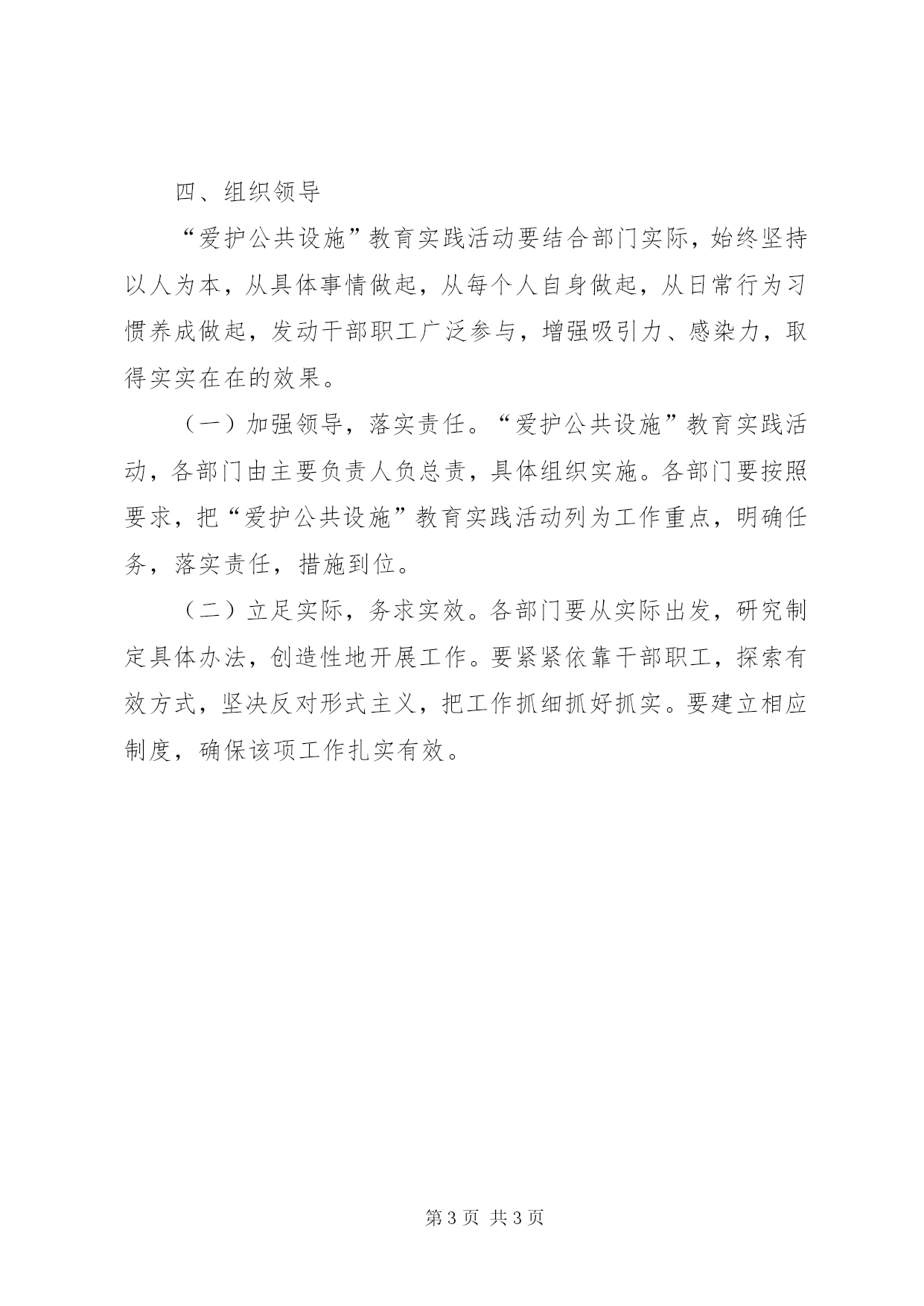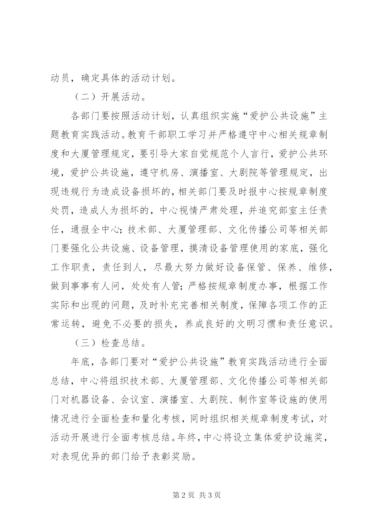 第PAGE\*Arabic\*MERGEFORMAT3页共NUMPAGES\*MERGEFORMAT3页县区爱护公共设施教育活动意见为进一步加强公共设施管理,提高干部职工爱护公共设施的文明素养和主人翁意识,经研究,决定在全中心开展“爱护公共设施活动”。现提出如下实施意见:一、活动意义近年来,我中心高度重视精神文明建设,干部群众思想道德素质和科学文化素质不断提高,人们的精神面貌和文明程度明显改善,有力地推动了广电事业的健康发展。但是,面对发展变化的新形势,面对人才队伍的不断扩大,公共设施和设备的不断增多,也对广大干部职工提出了新的更高的要求。因此,中心干部职工要叫响“建设实力幸福广电人人有责,实力幸福广电人人共享”的口号,树立爱护就是节约的理念,充分认识“爱护公共设施”活动的重要性,增强责任感和使命感,为建设和谐广电大家园作出积极贡献。二、目标任务要以建设和谐广电家园为核心,以加强管理,提升素质为目的,杜绝对公共设施不珍惜、不爱护、损坏机器设备等现象,大力营造文明、节约的工作环境和氛围。三、活动实施(一)安排部署。各部门要根据中心活动意见,召开专题会议安排部署,宣传动员,确定具体的活动计划。(二)开展活动。各部门要按照活动计划,认真组织实施“爱护公共设施”主题教育实践活动。教育干部职工学习并严格遵守中心相关规章制度和大厦管理规定,要引导大家自觉规范个人言行,爱护公共环境,爱护公共设施,遵守机房、演播室、大剧院等管理规定,出现违规行为造成设备损坏的,相关部门要及时报中心按规章制度处罚,造成人为损坏的,中心视情严肃处理,并追究部室主任责任,通报全中心;技术部、大厦管理部、文化传播公司等相关部门要强化公共设施、设备管理,摸清设备管理使用的家底,强化工作职责,责任到人,尽最大努力做好设备保管、保养、维修,做到事事有人问,处处有人管;严格按规章制度办事,根据工作实际和出现的问题,及时补充完善相关制度,保障各项工作的正常运转,避免不必要的损失,养成良好的文明习惯和责任意识。(三)检查总结。年底,各部门要对“爱护公共设施”教育实践活动进行全面总结,中心将组织技术部、大厦管理部、文化传播公司等相关部门对机器设备、会议室、演播室、大剧院、制作室等设施的使用情况进行全面检查和量化考核,同时组织相关规章制度考试,对活动开展进行全面考核总结。年终,中心将设立集体爱护设施奖,对表现优异的部门给予表彰奖励。四、组织领导“爱护公共设施”教育实践活动要结合部门实际,始终坚持以人为本,从具体事情做起,从每个人自身做起,从日常行为习惯养成做起,发动干部职工广泛参与,增强吸引力、感染力,取得实实在在的效果。(一)加强领导,落实责任。“爱护公共设施”教育实践活动,各部门由主要负责人负总责,具体组织实施。各部门要按照要求,把“爱护公共设施”教育实践活动列为工作重点,明确任务,落实责任,措施到位。(二)立足实际,务求实效。各部门要从实际出发,研究制定具体办法,创造性地开展工作。要紧紧依靠干部职工,探索有效方式,坚决反对形式主义,把工作抓细抓好抓实。要建立相应制度,确保该项工作扎实有效。